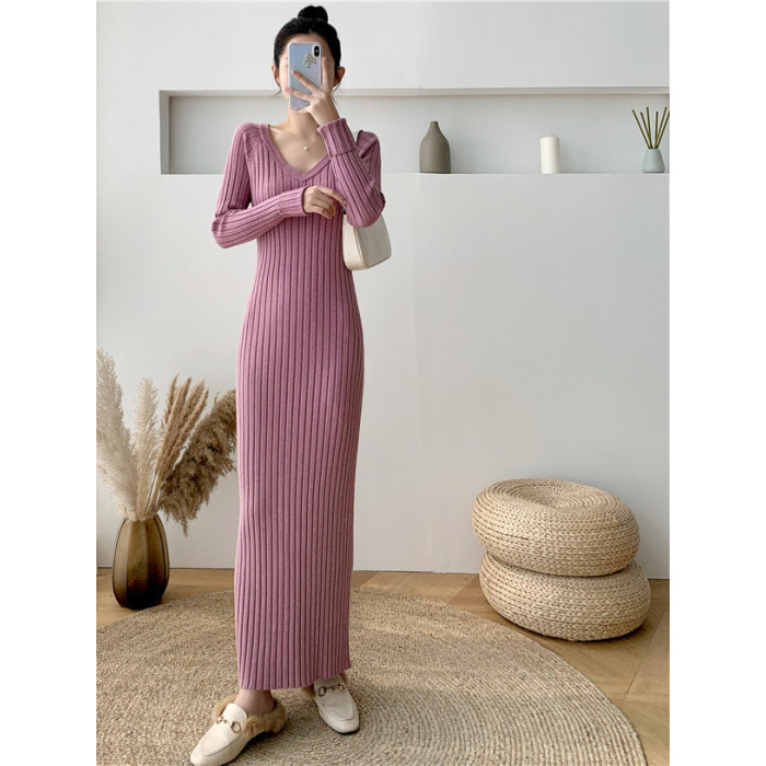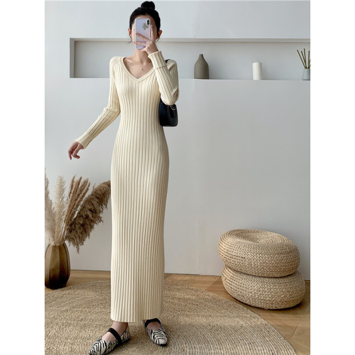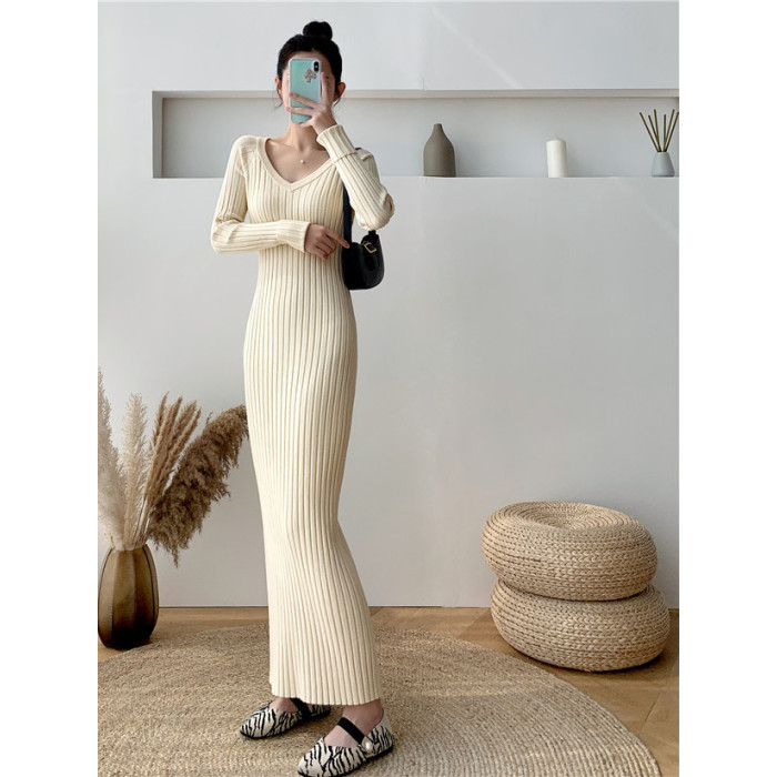 超長款V領針織連衣裙女 秋冬修身包臀打底衫內搭針織毛衣過膝長裙