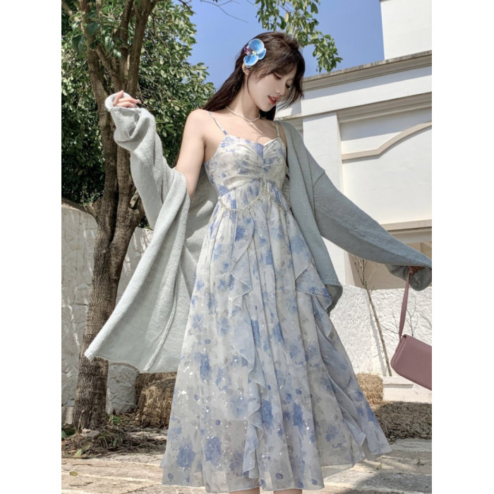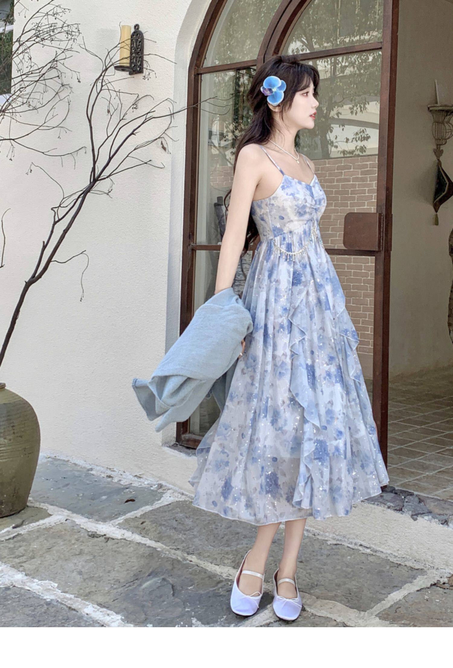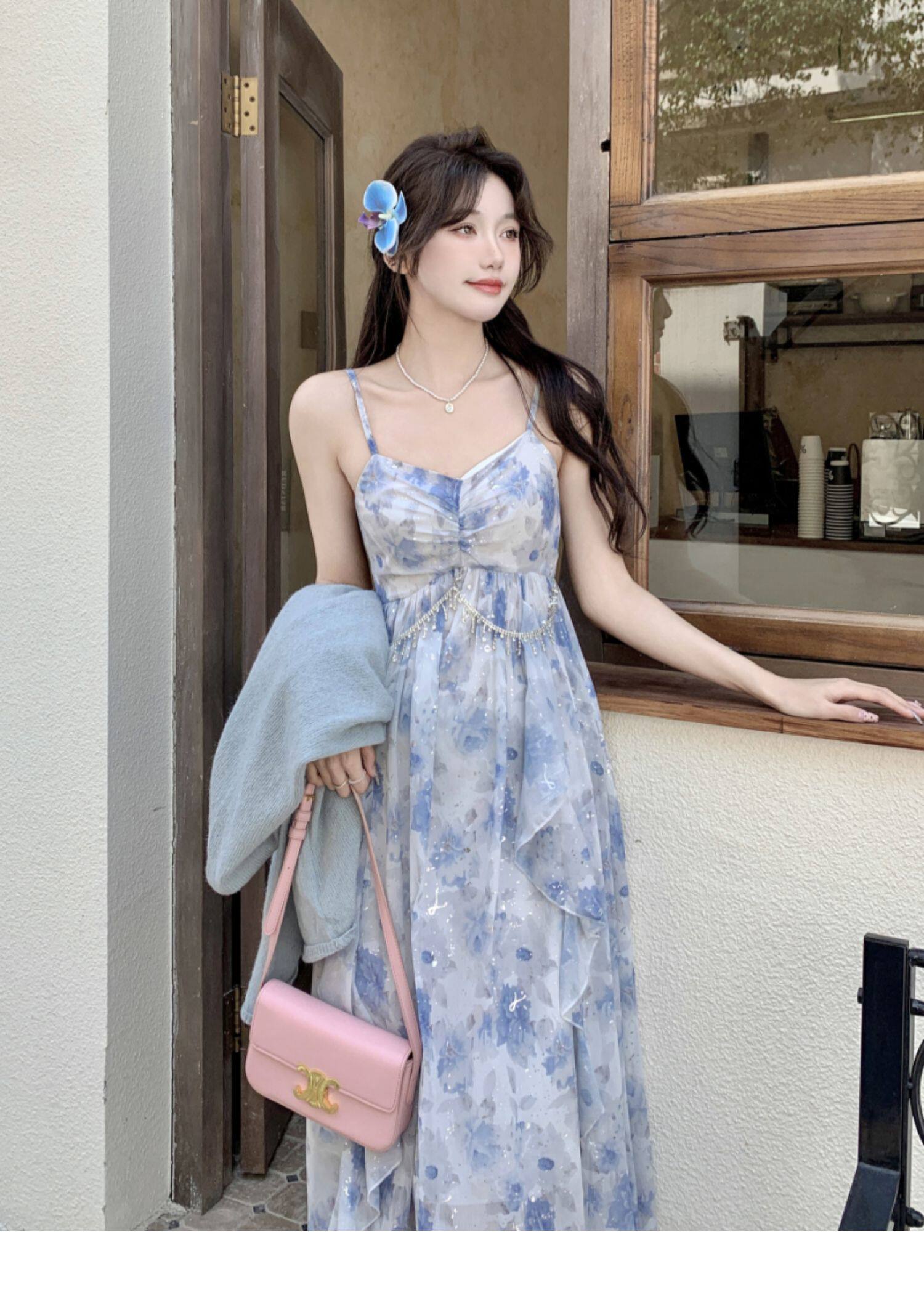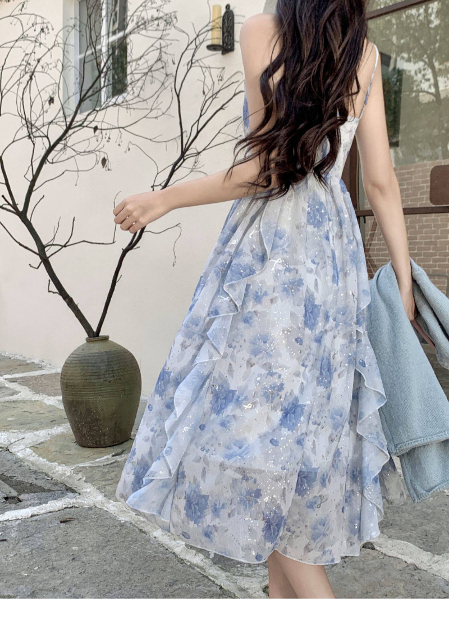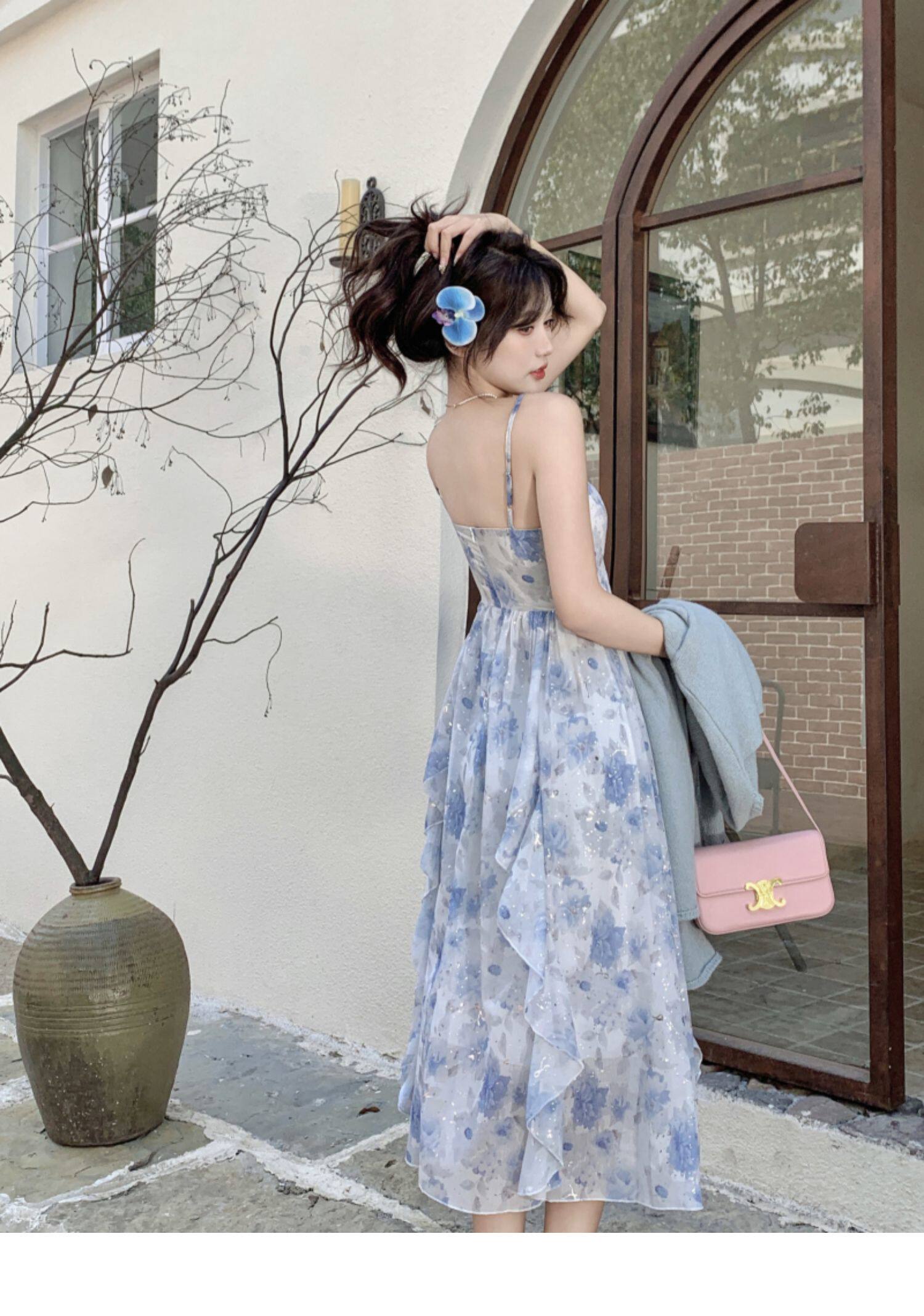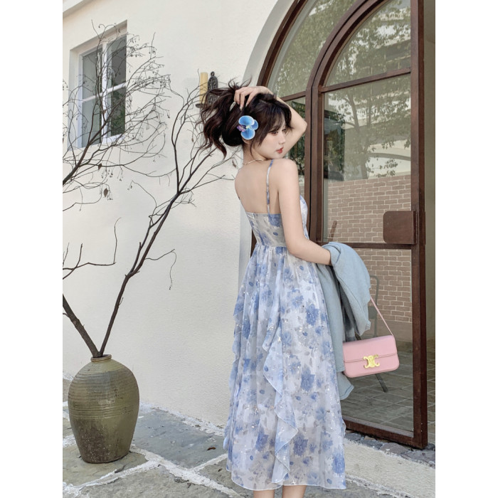 大碼胖mm法式甜美溫柔風高腰顯瘦荷葉邊暈染閃片印花吊帶連衣裙女