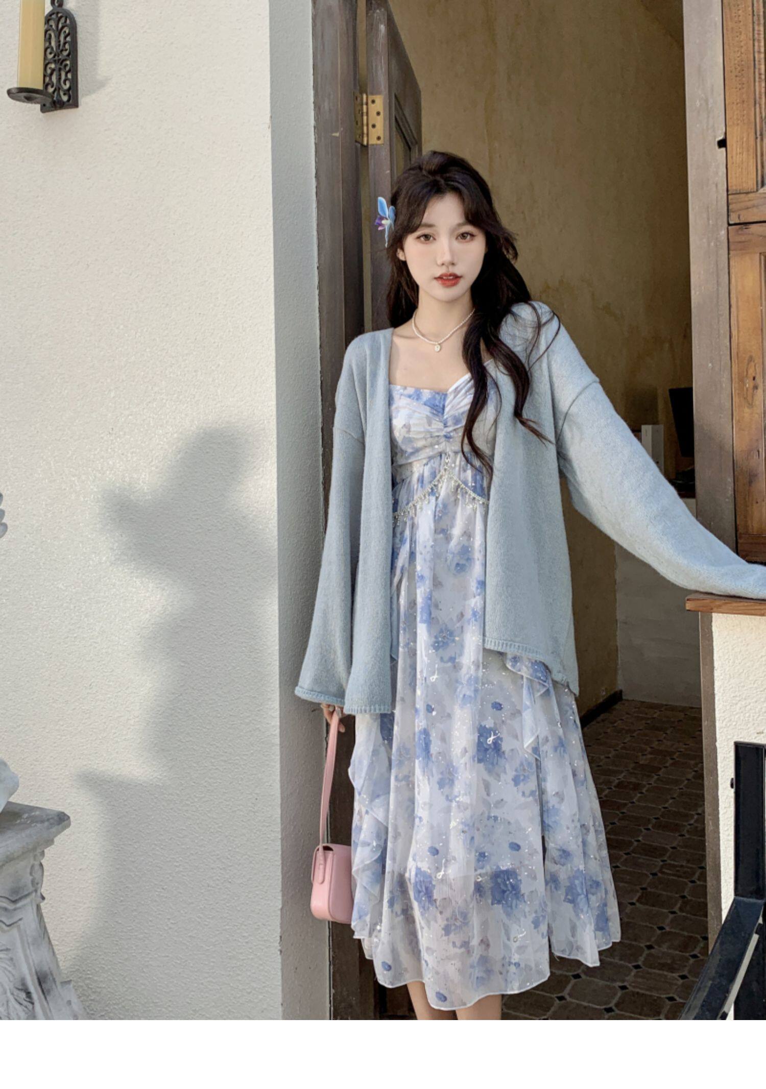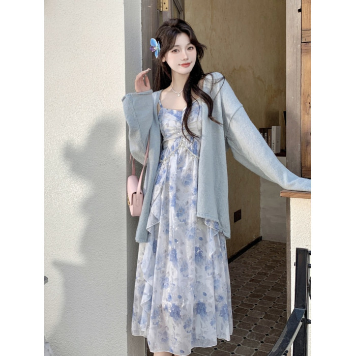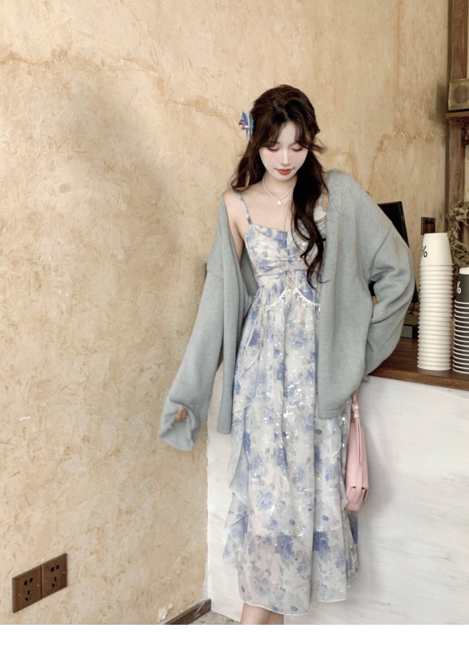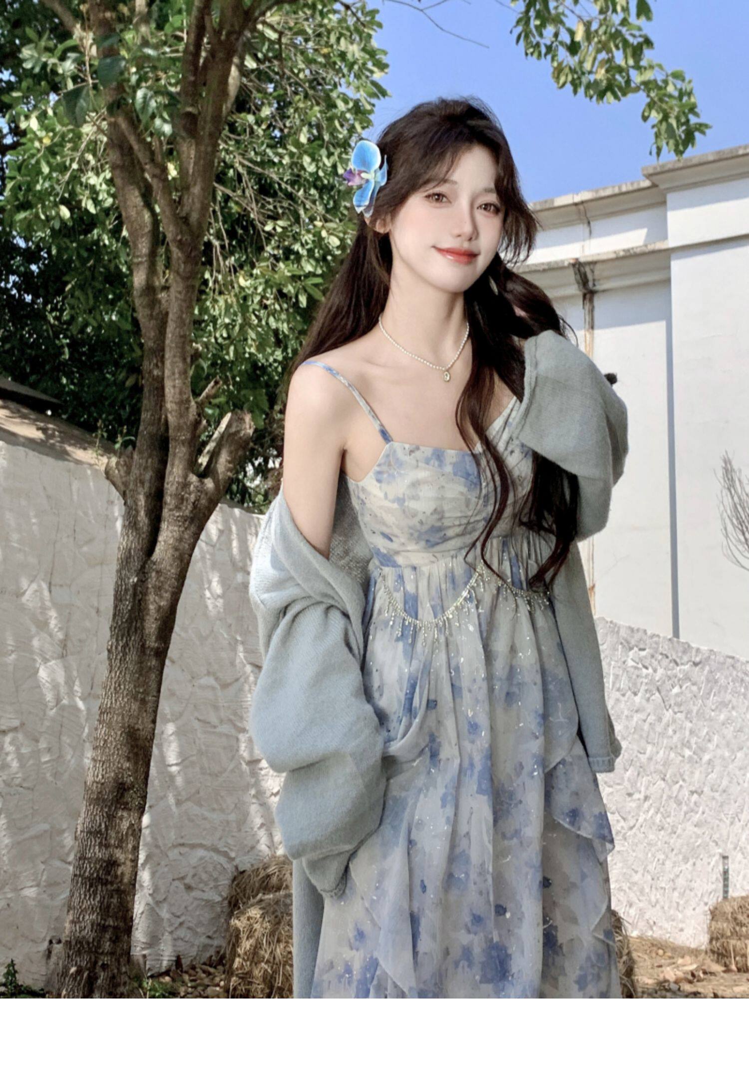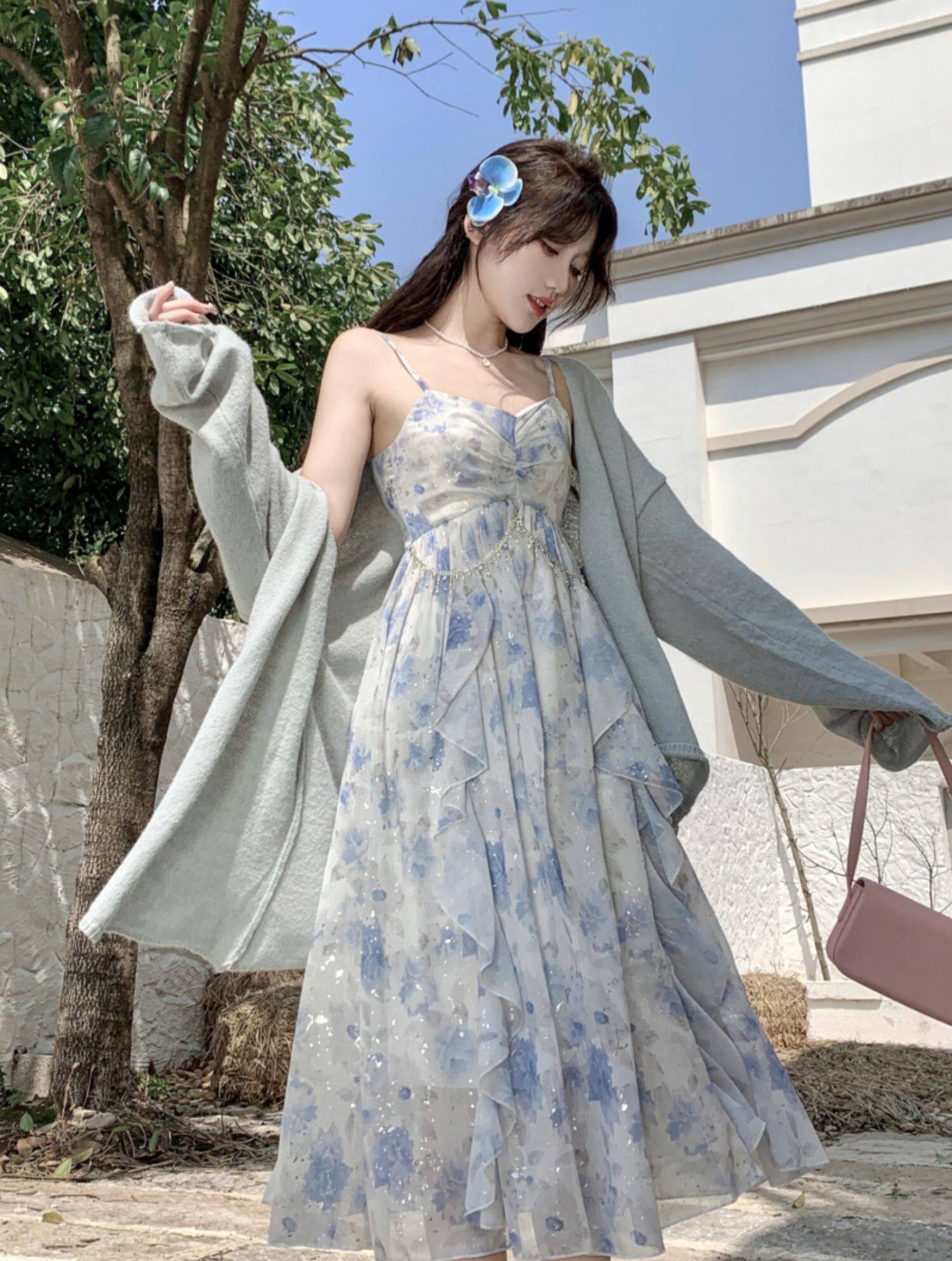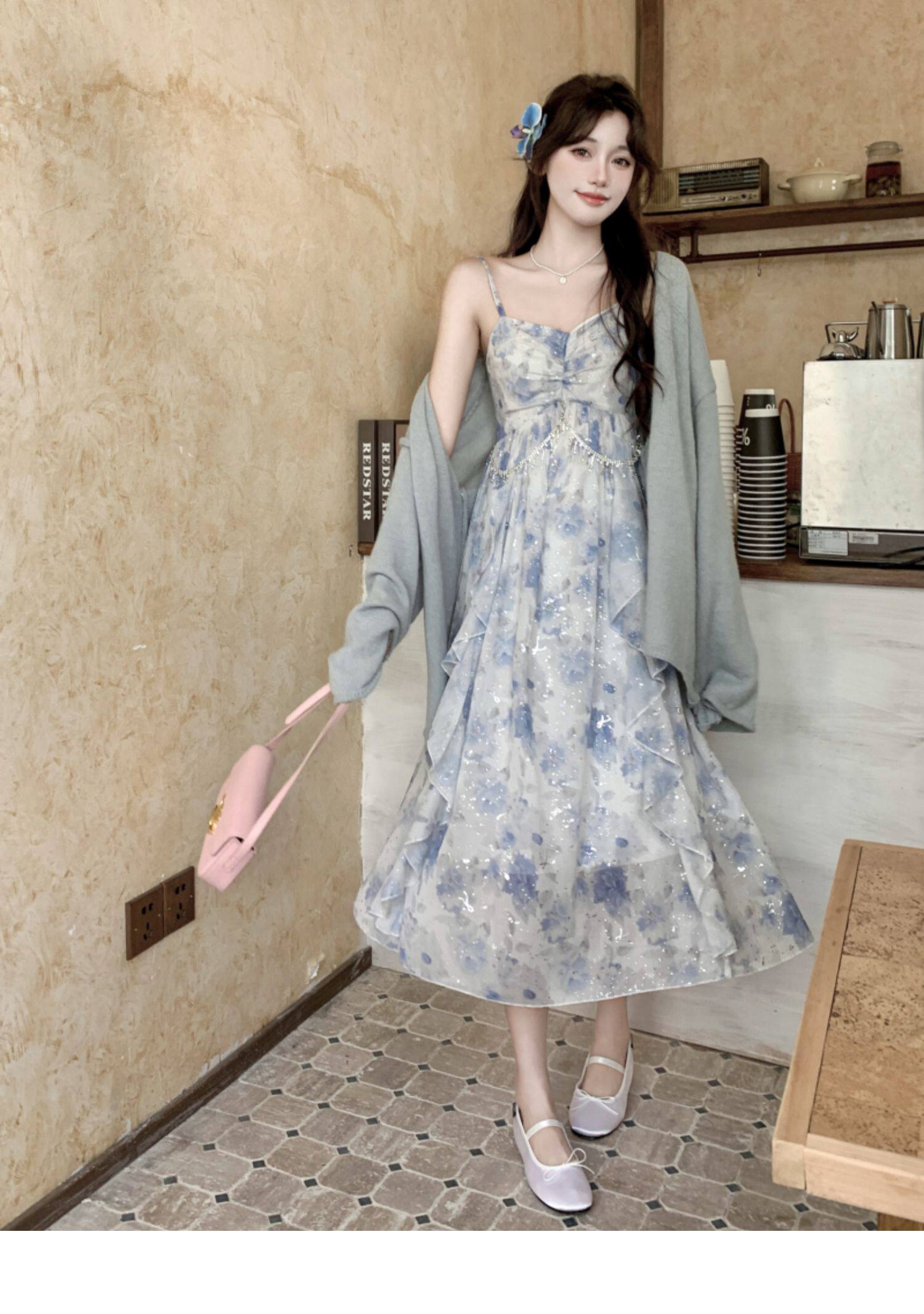 大碼胖mm法式甜美溫柔風高腰顯瘦荷葉邊暈染閃片印花吊帶連衣裙女