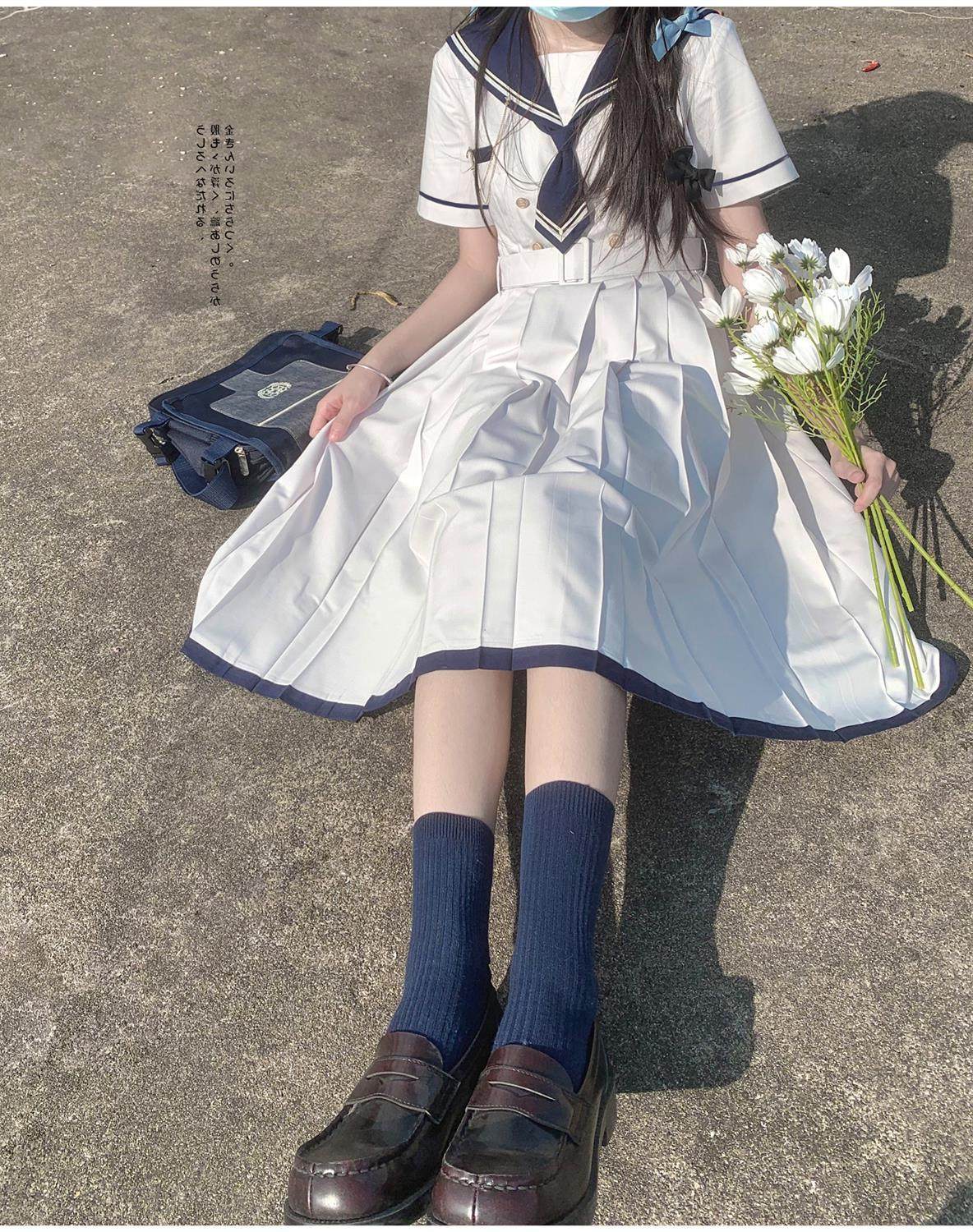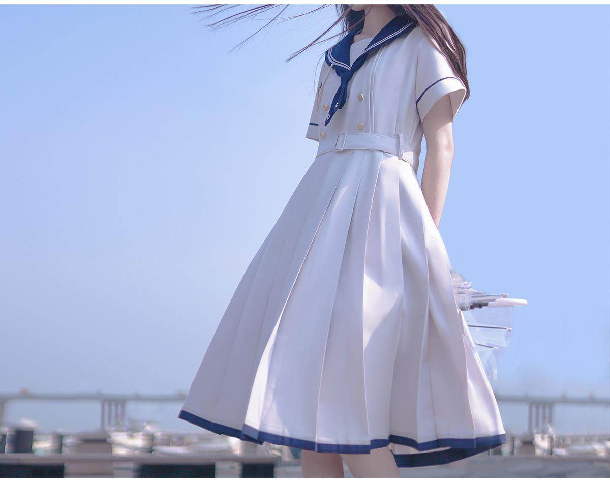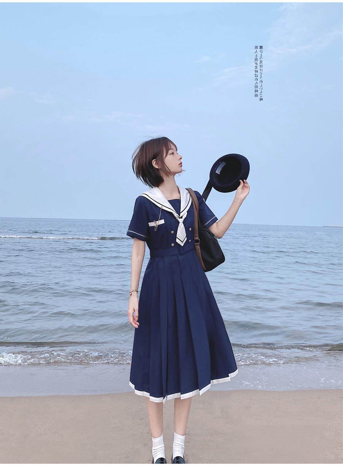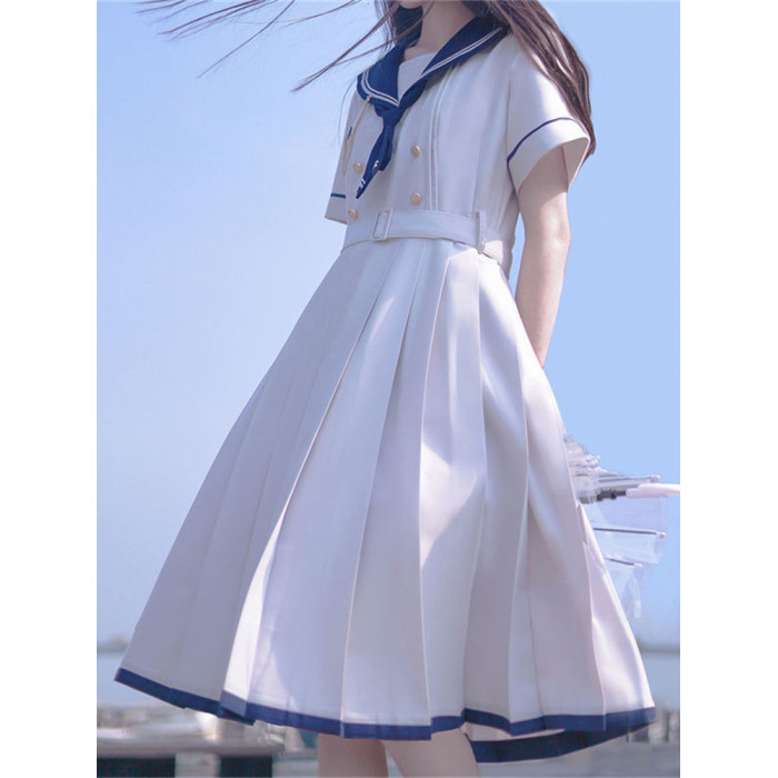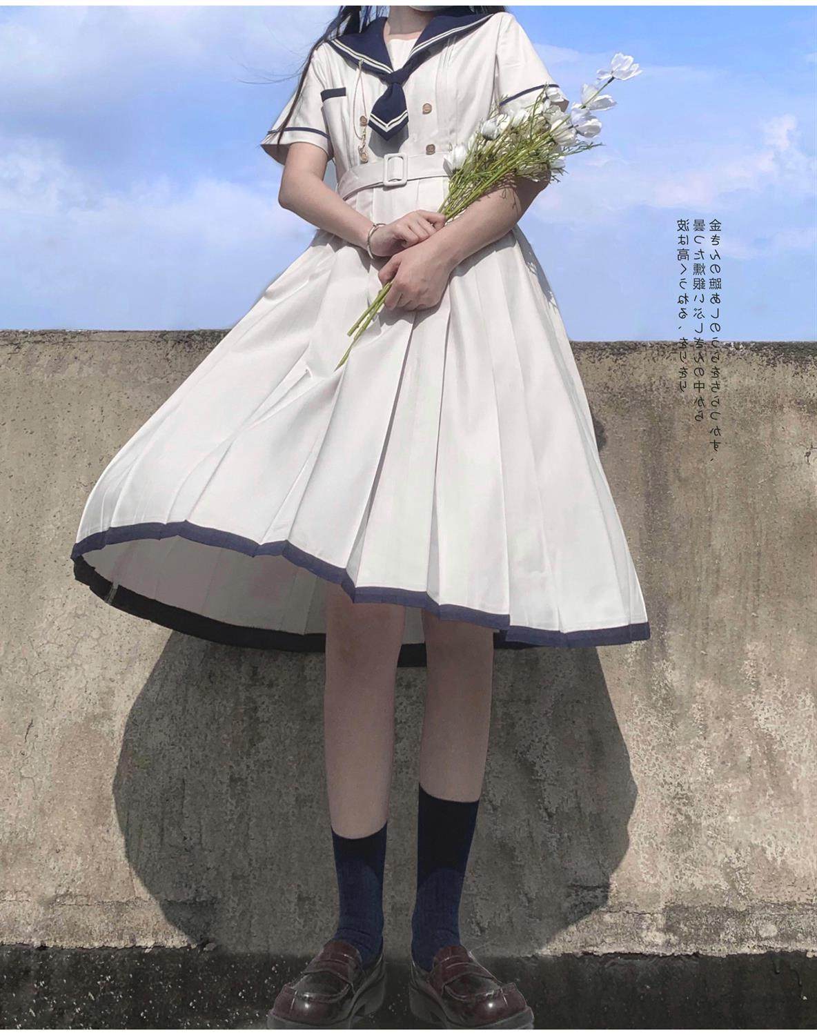 2024夏季新款日系JK水手服海軍領連衣裙學生收腰中長款百褶a字裙
