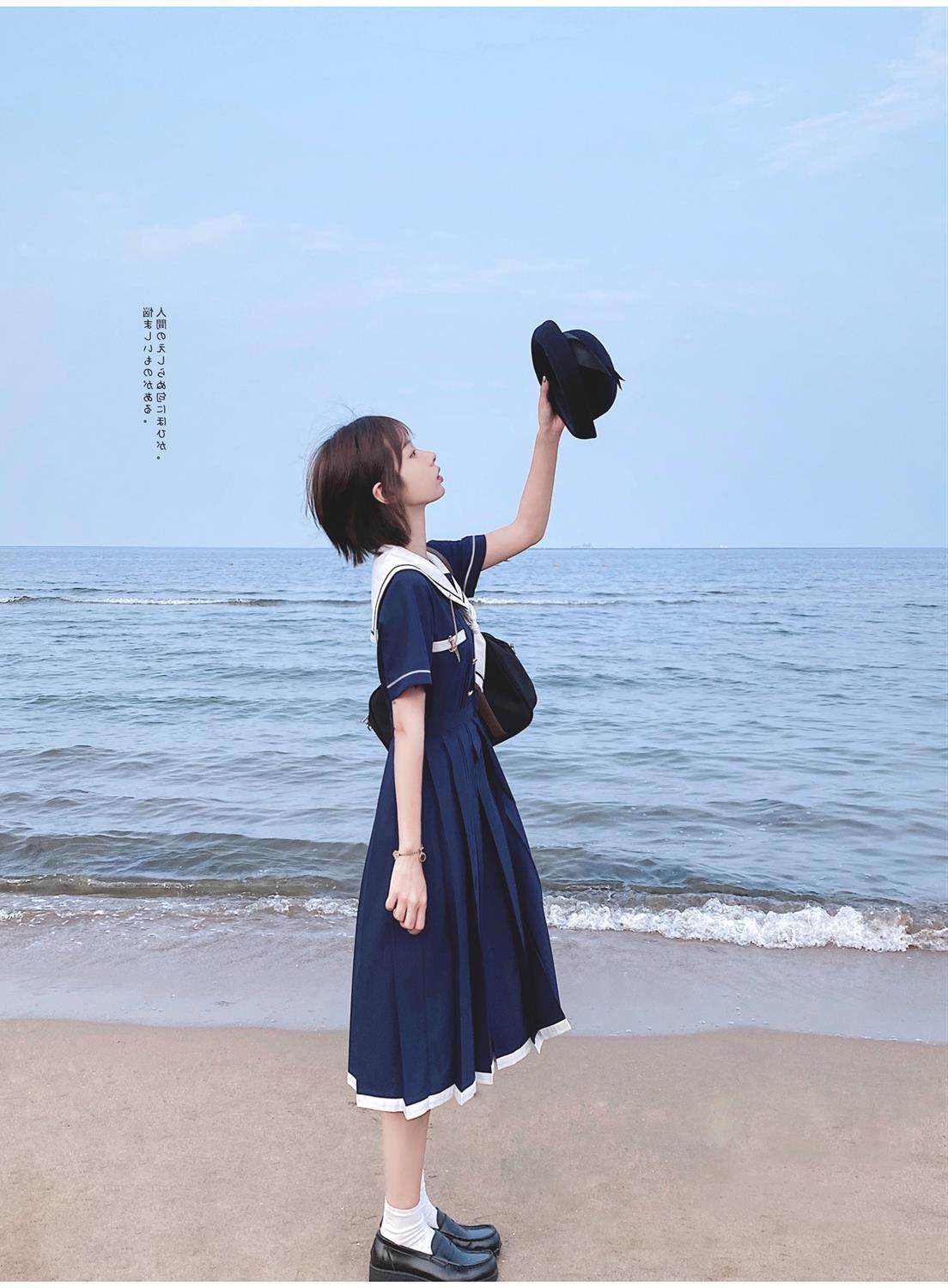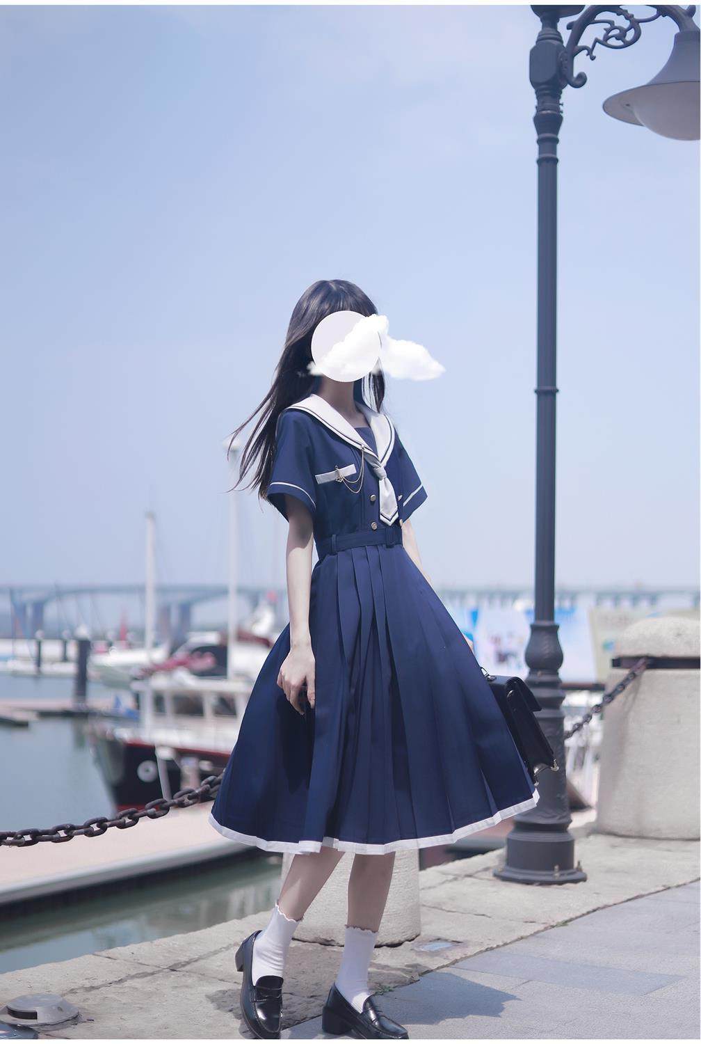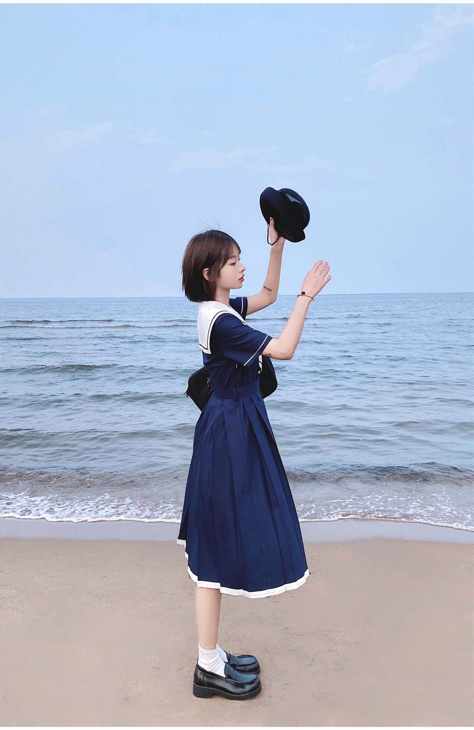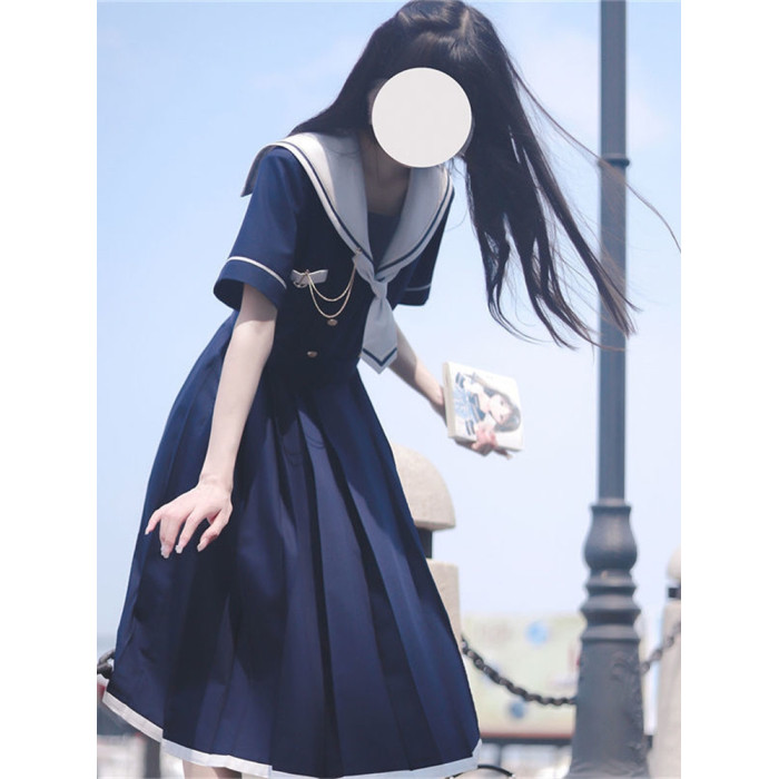 2024夏季新款日系JK水手服海軍領連衣裙學生收腰中長款百褶a字裙
