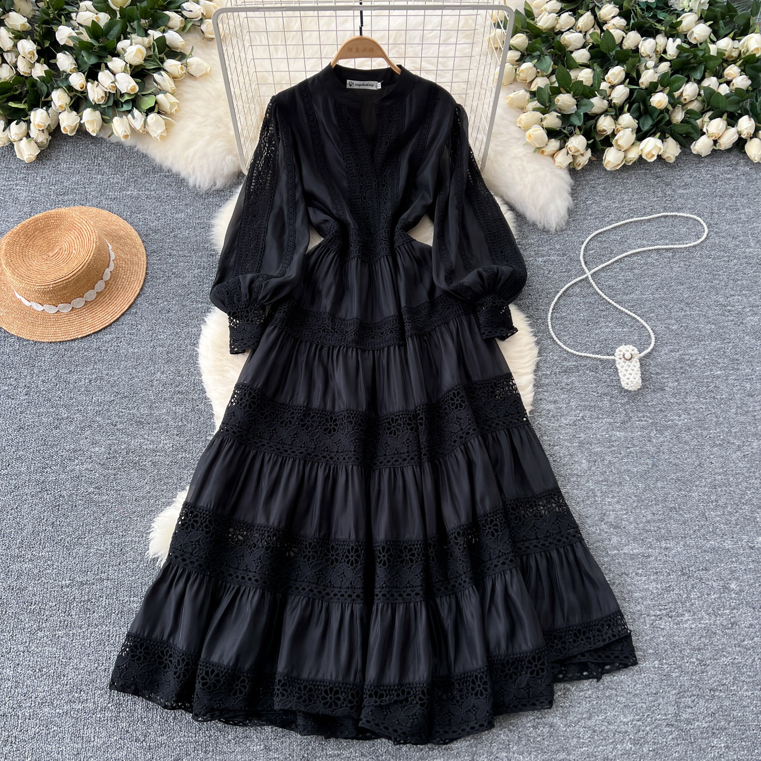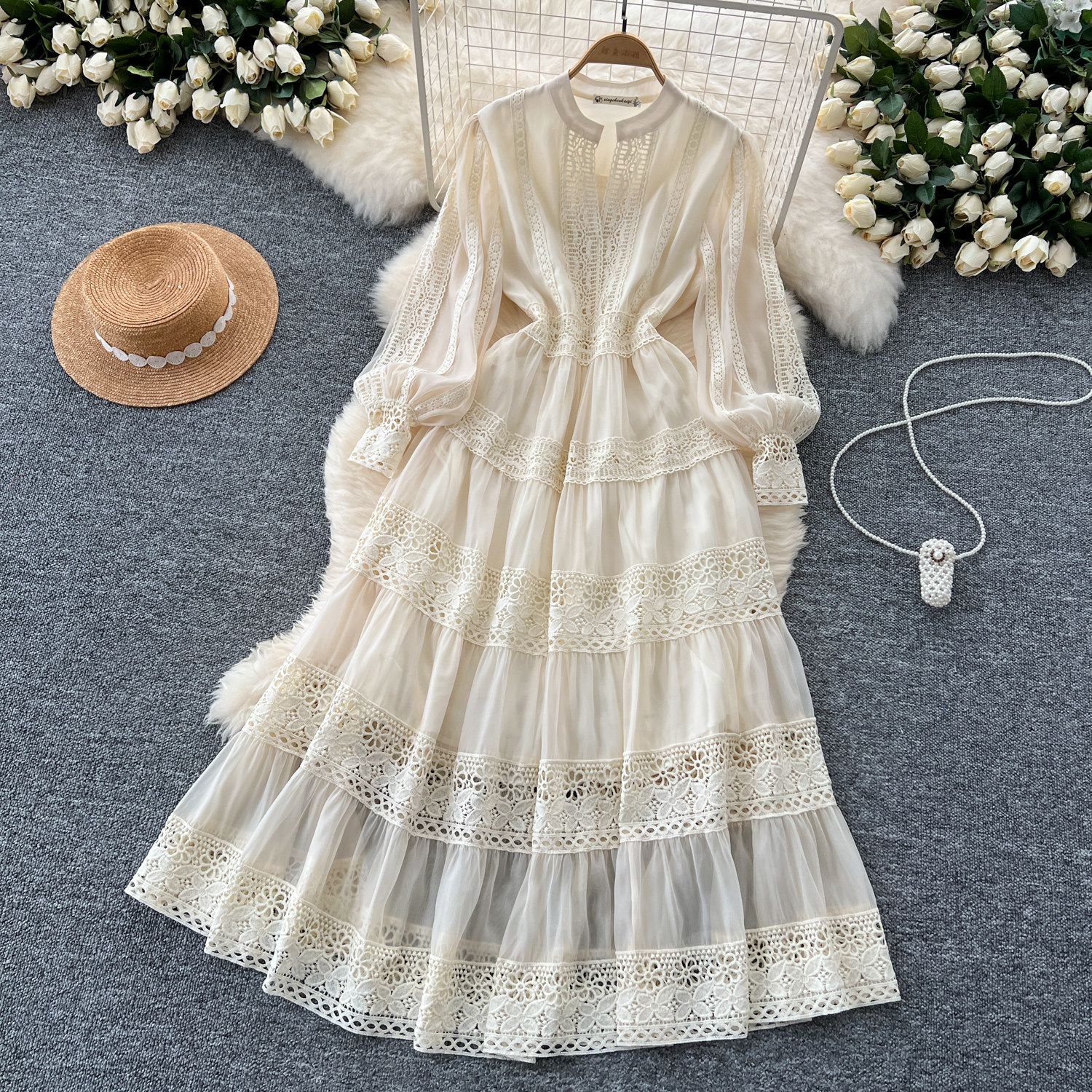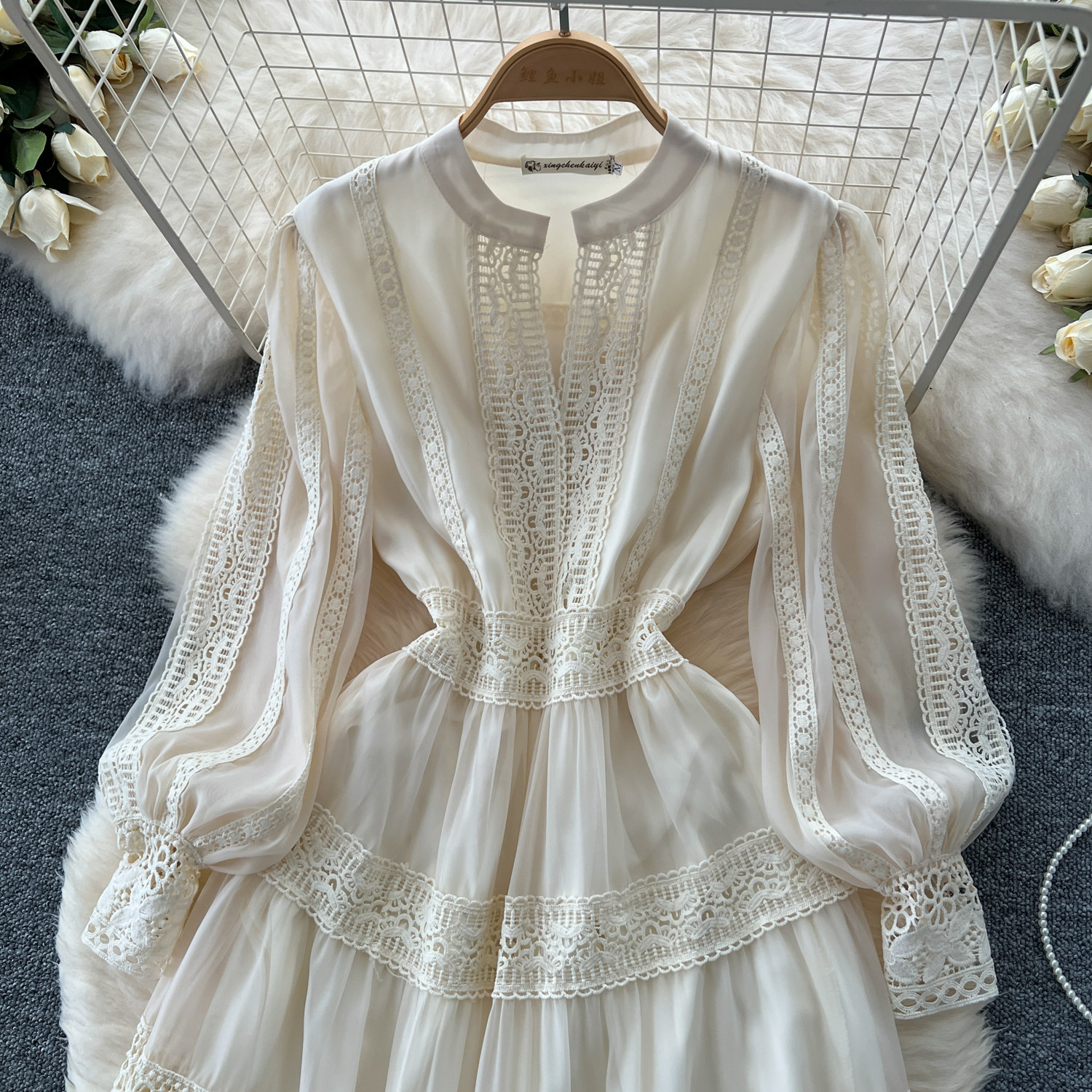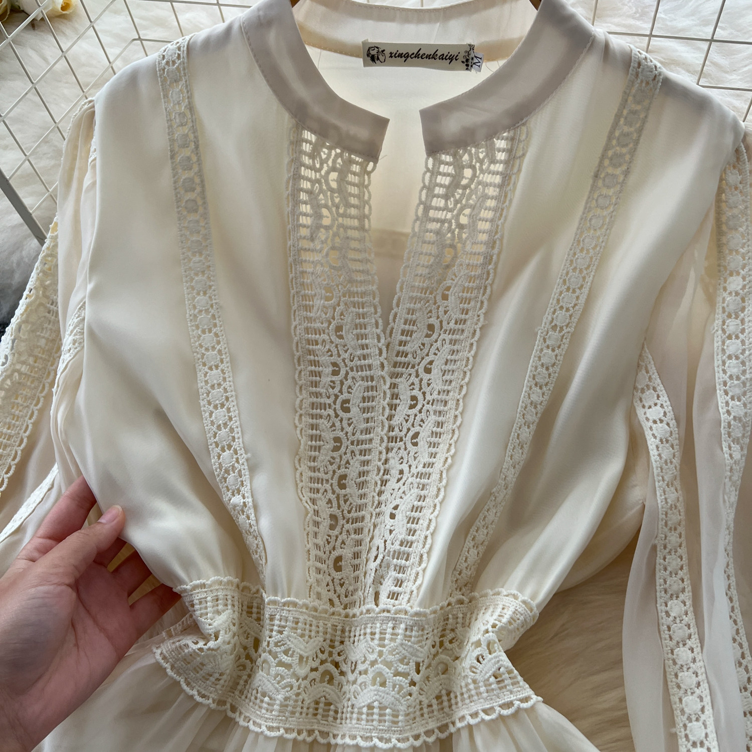法式復古小衆蕾絲拼接燈籠袖連衣裙女收腰顯瘦氣質過膝優雅長裙子