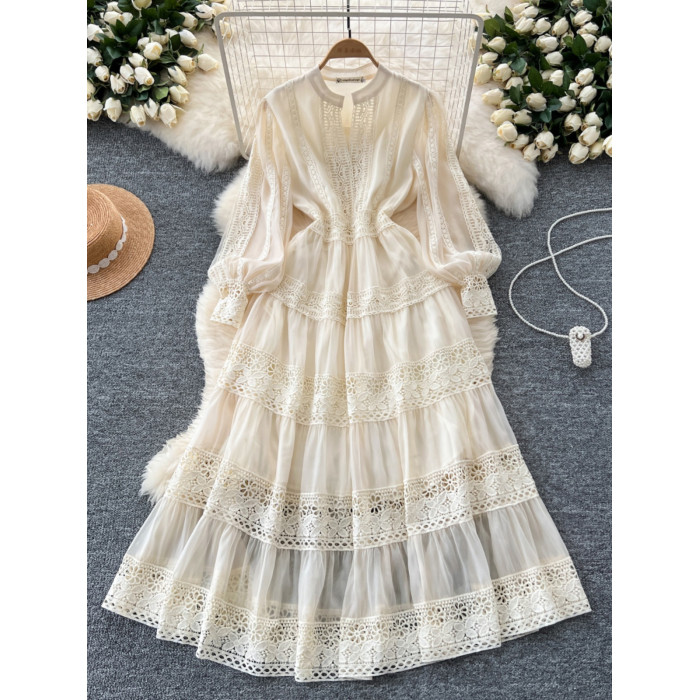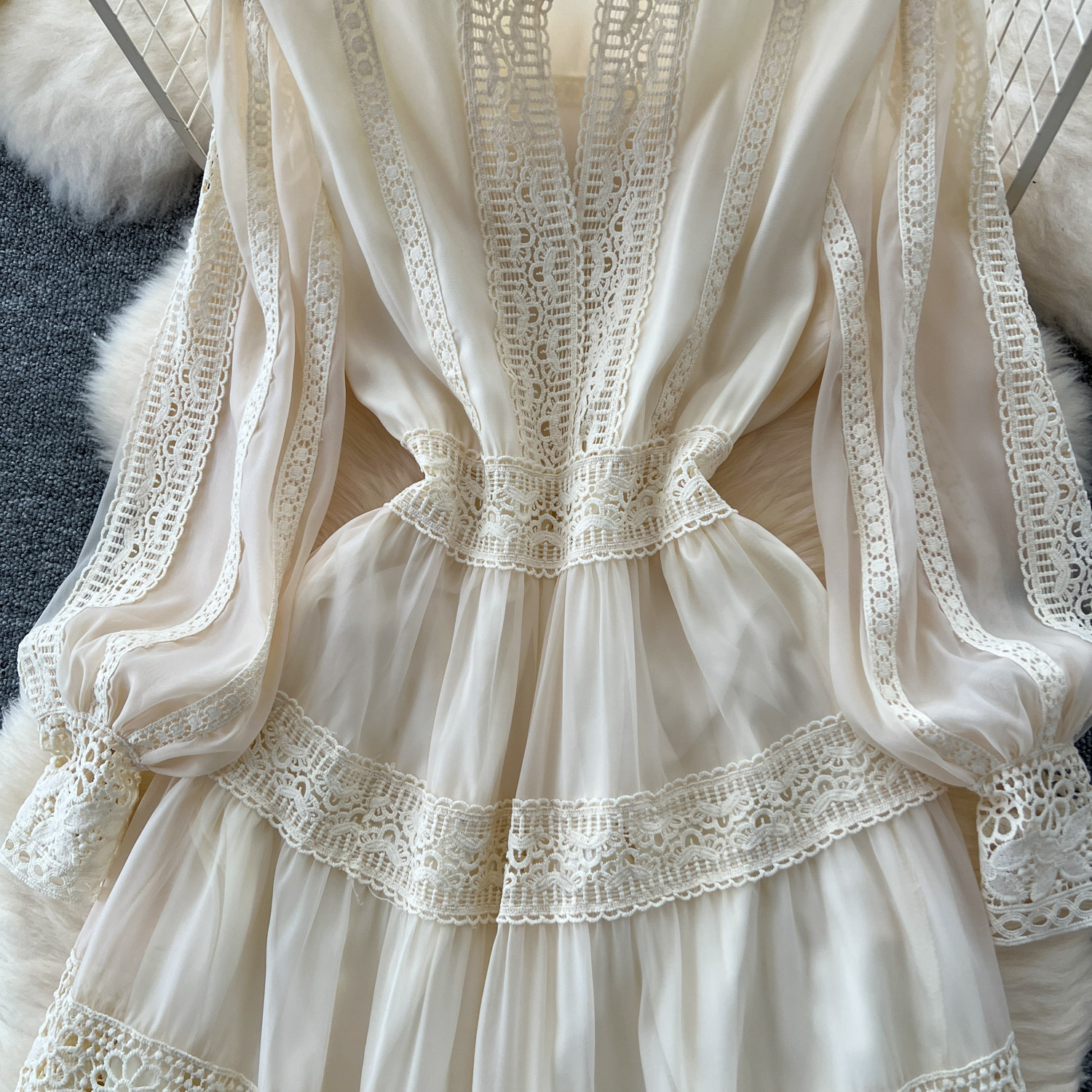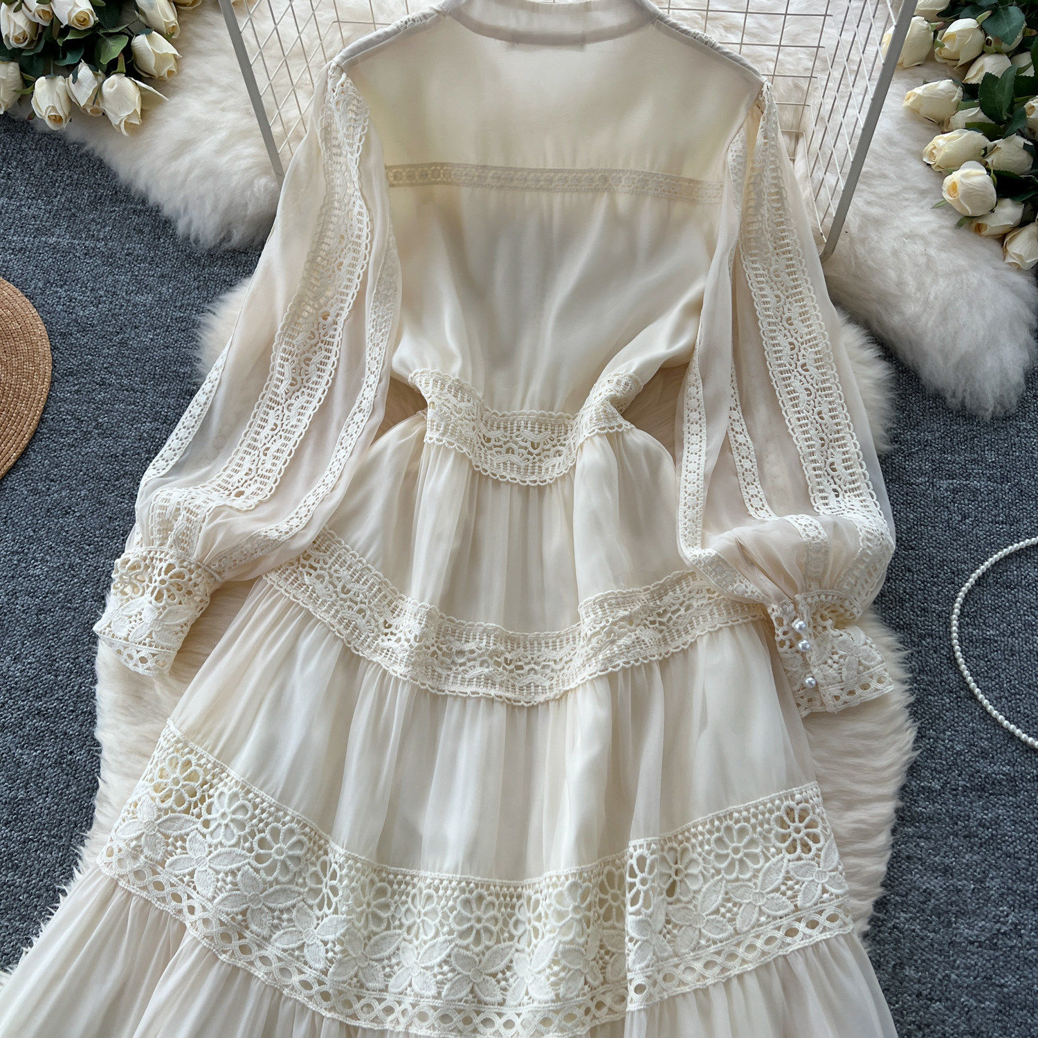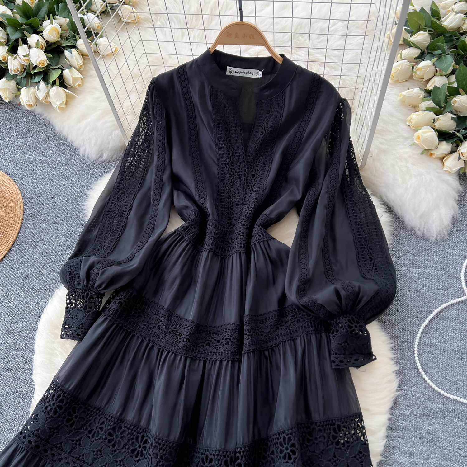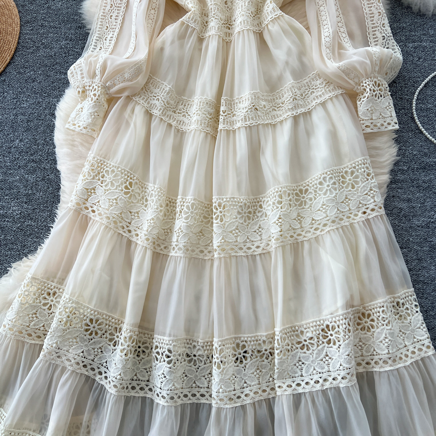 法式復古小衆蕾絲拼接燈籠袖連衣裙女收腰顯瘦氣質過膝優雅長裙子