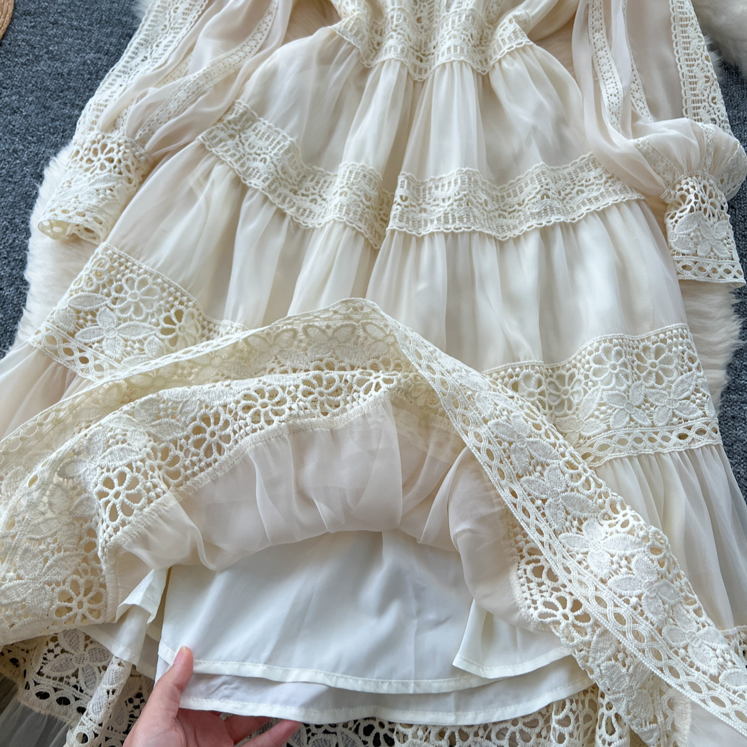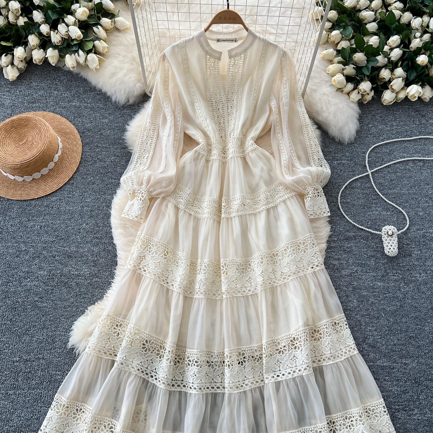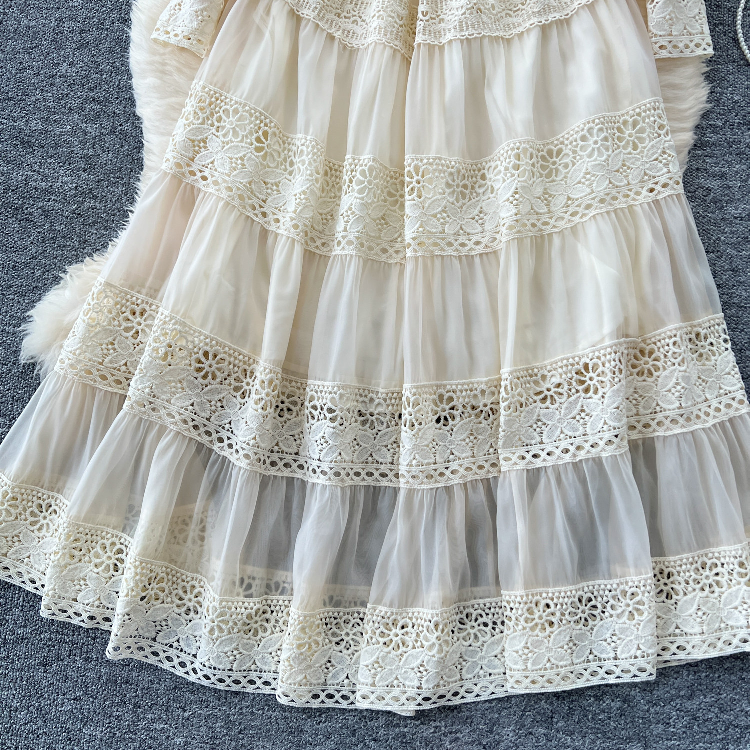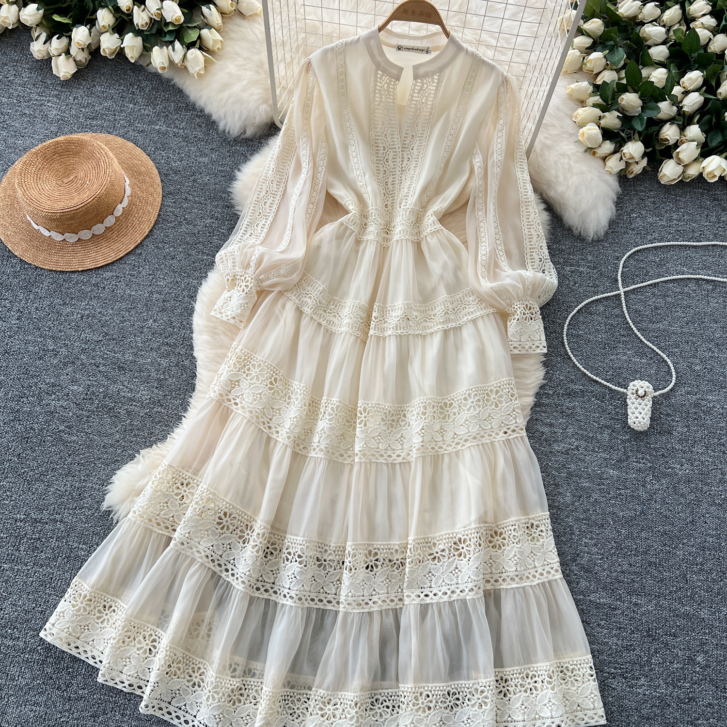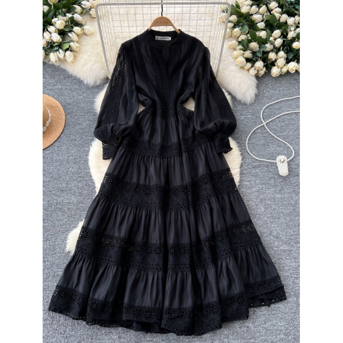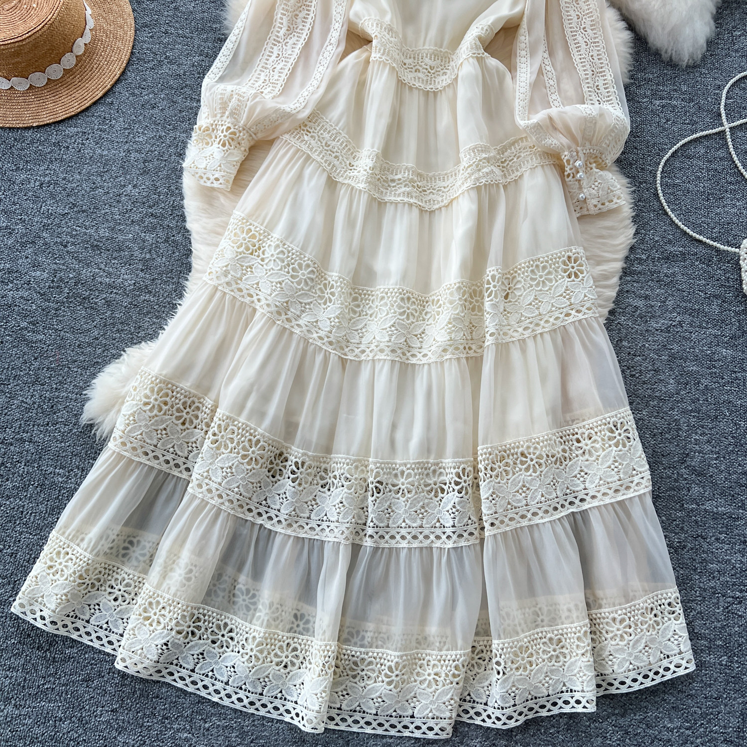法式復古小衆蕾絲拼接燈籠袖連衣裙女收腰顯瘦氣質過膝優雅長裙子
