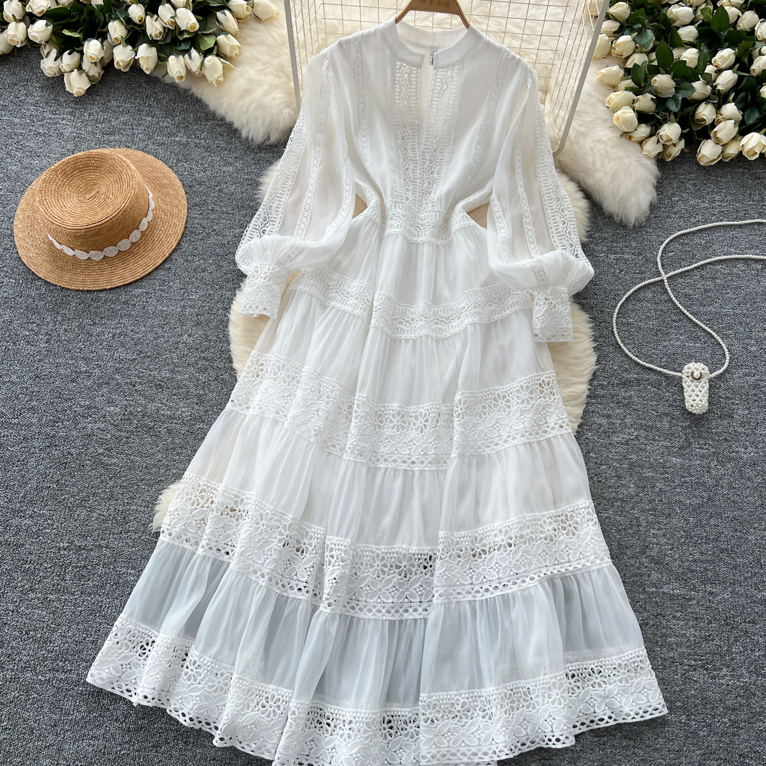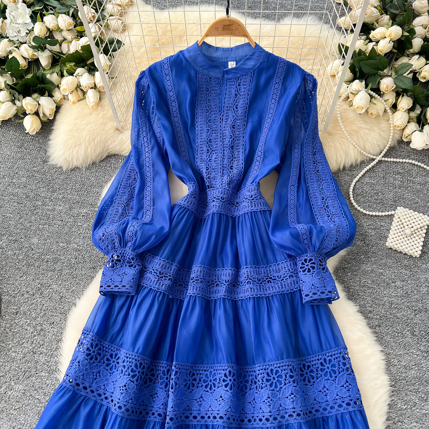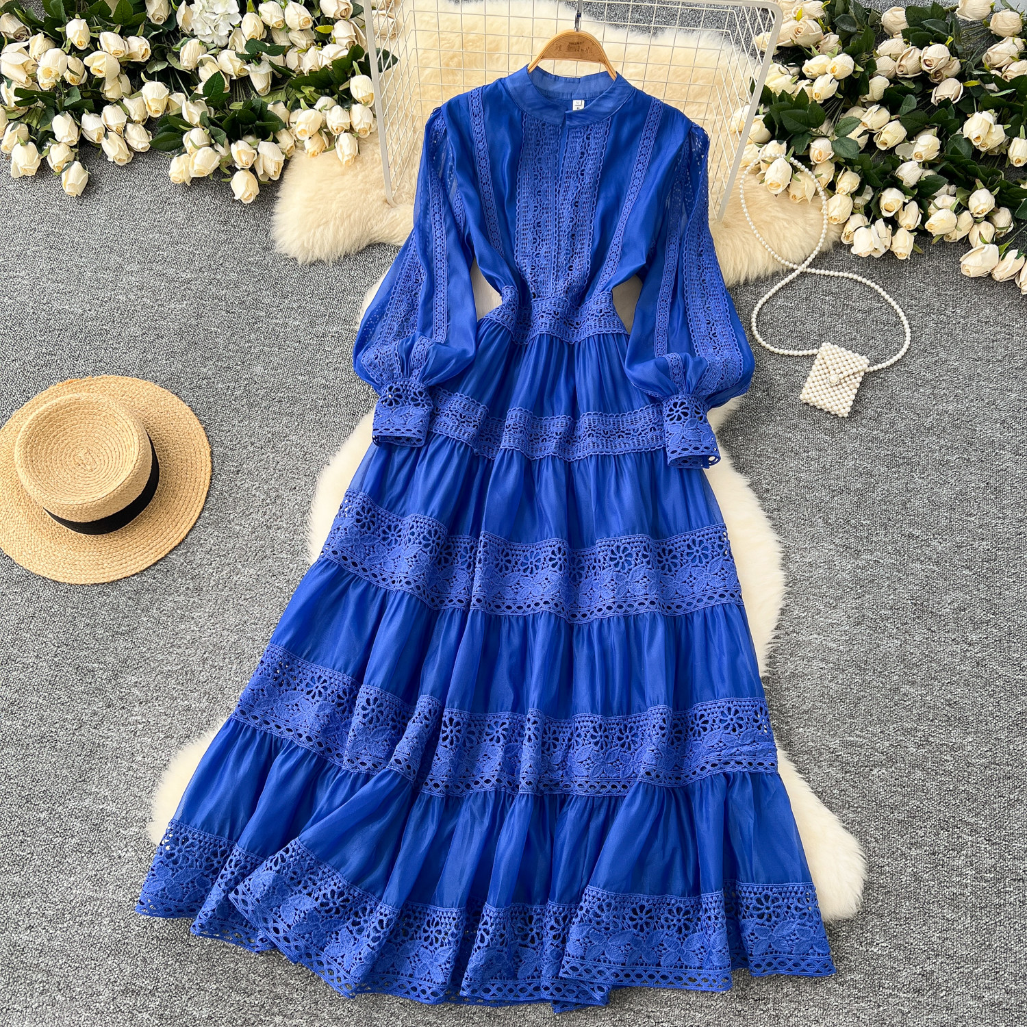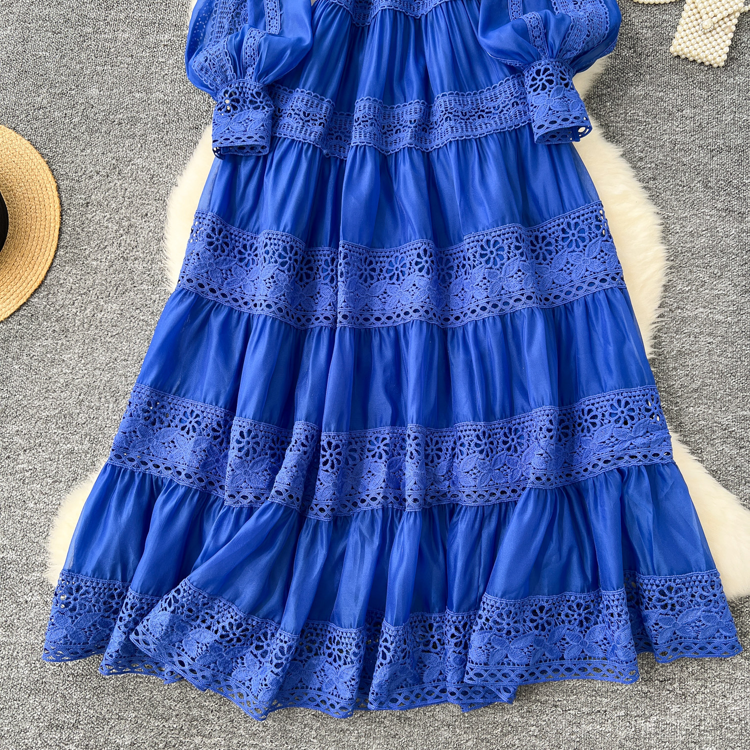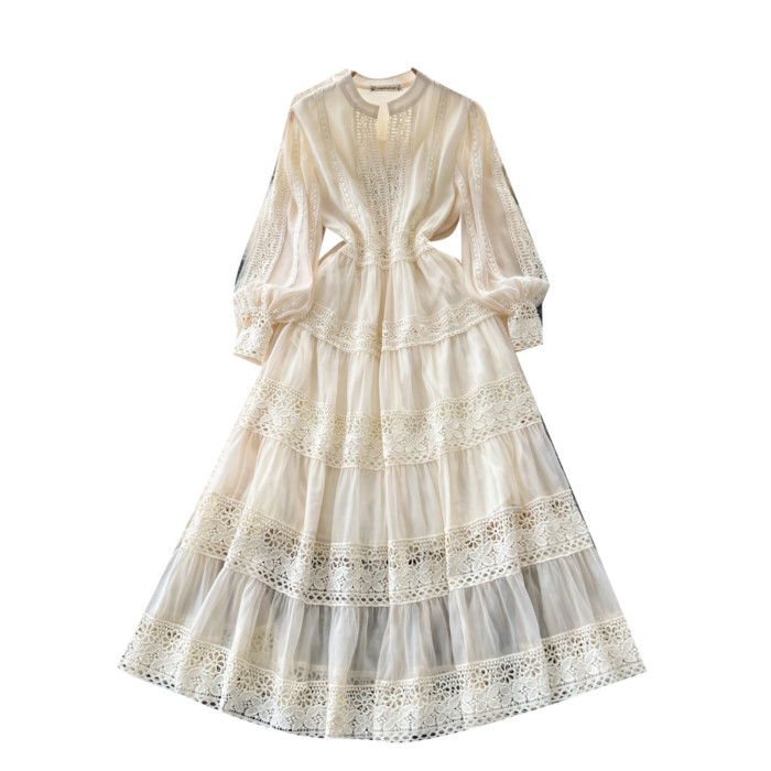 法式復古小衆蕾絲拼接燈籠袖連衣裙女收腰顯瘦氣質過膝優雅長裙子