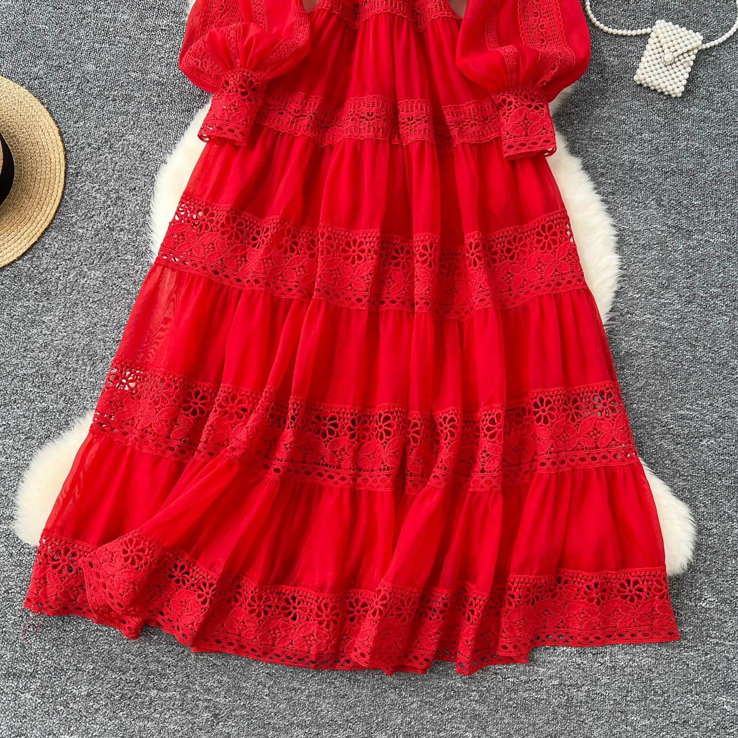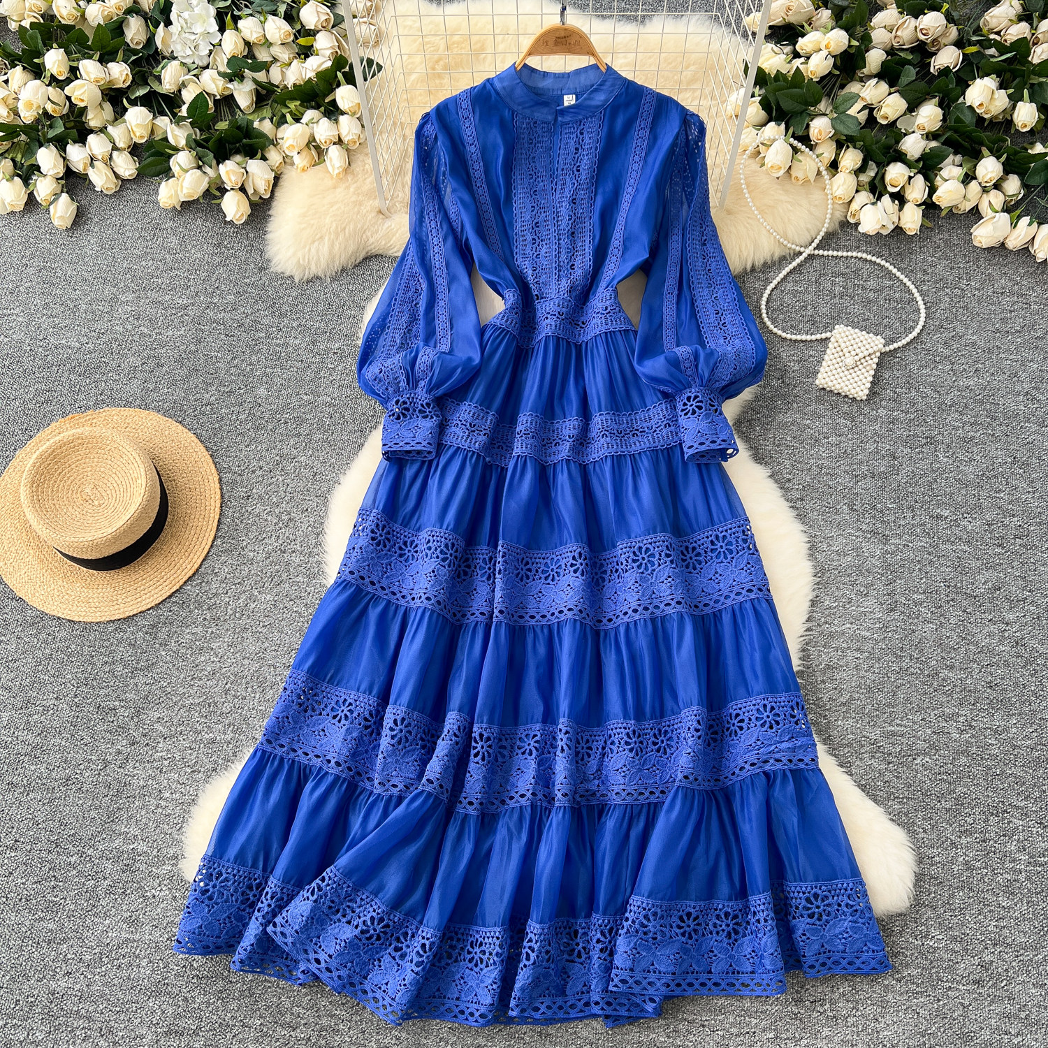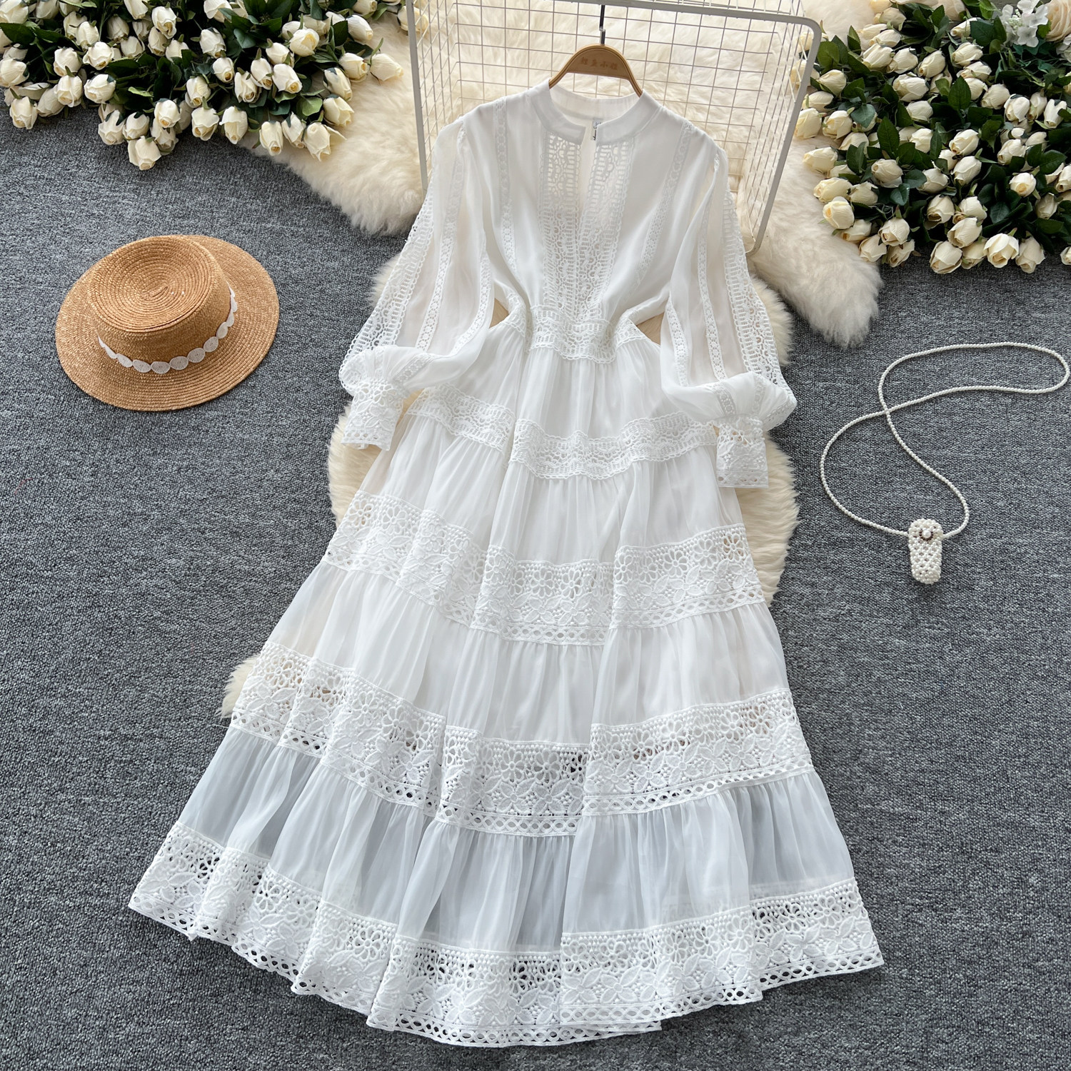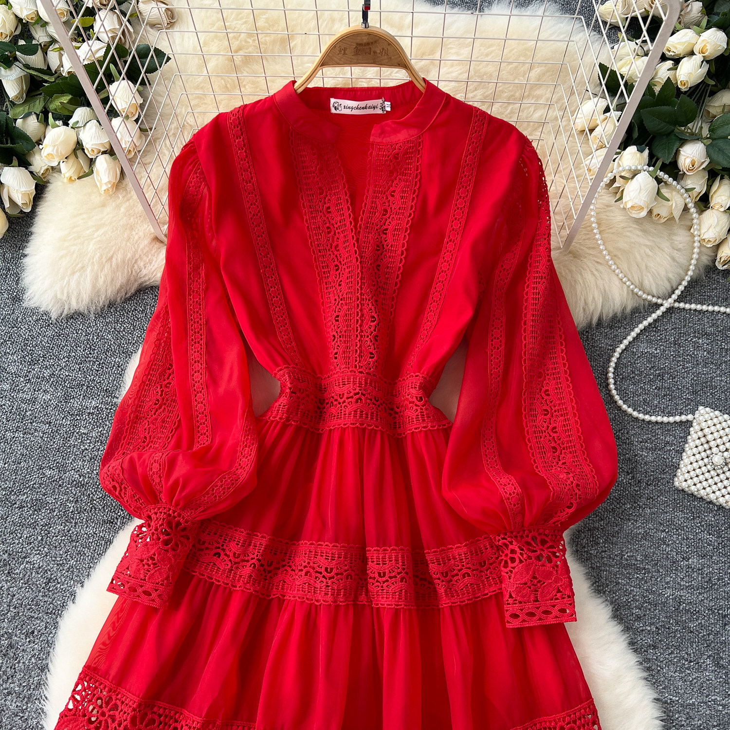 法式復古小衆蕾絲拼接燈籠袖連衣裙女收腰顯瘦氣質過膝優雅長裙子