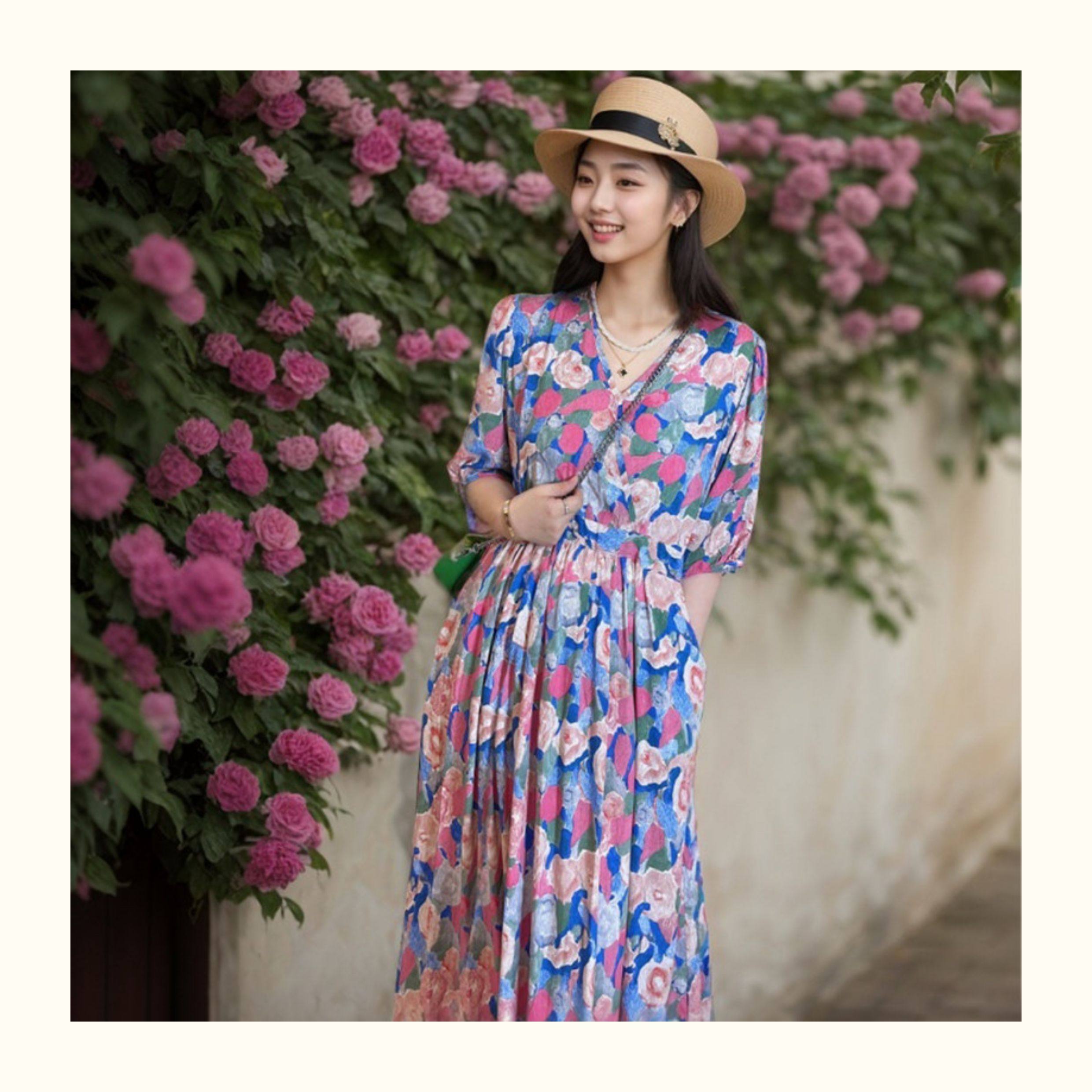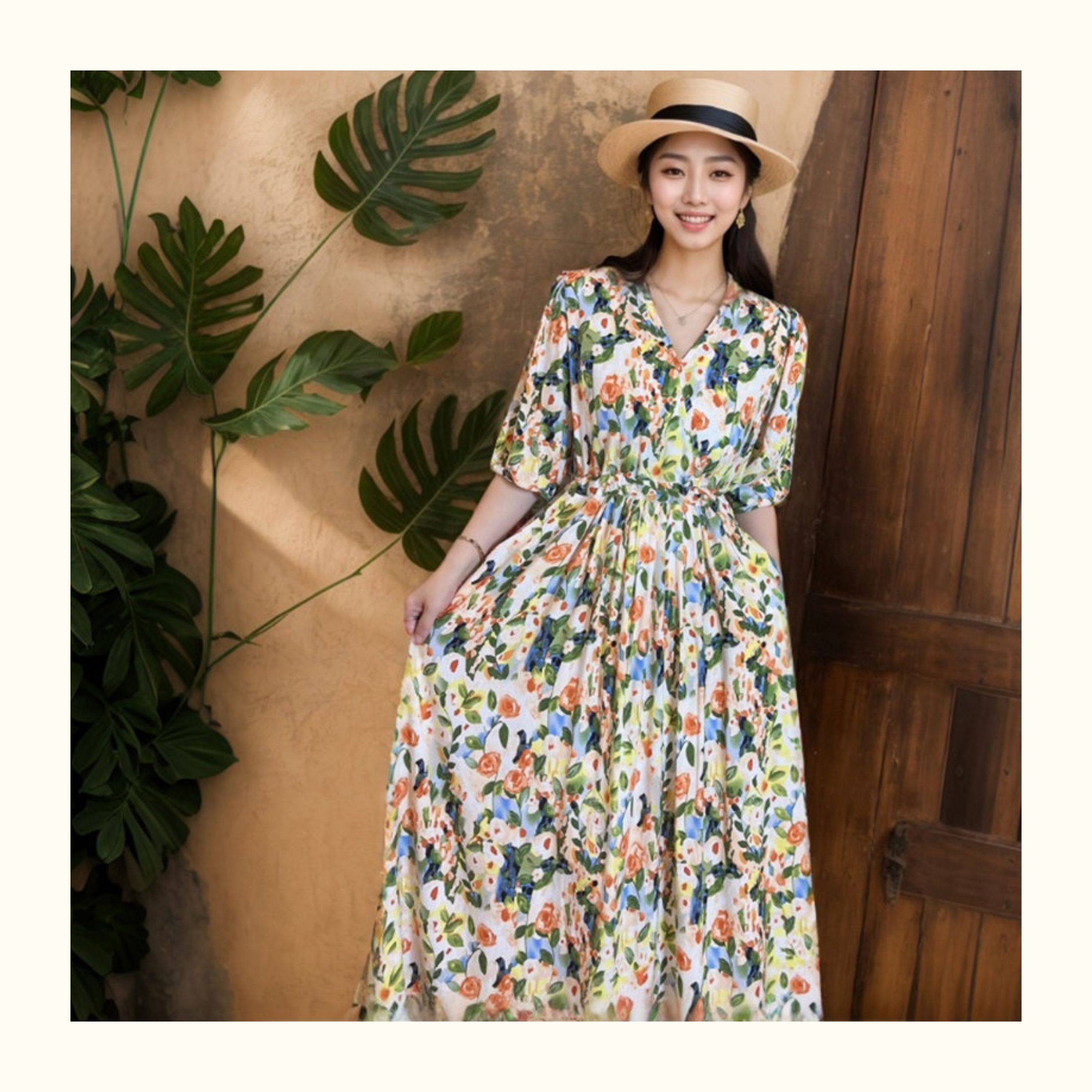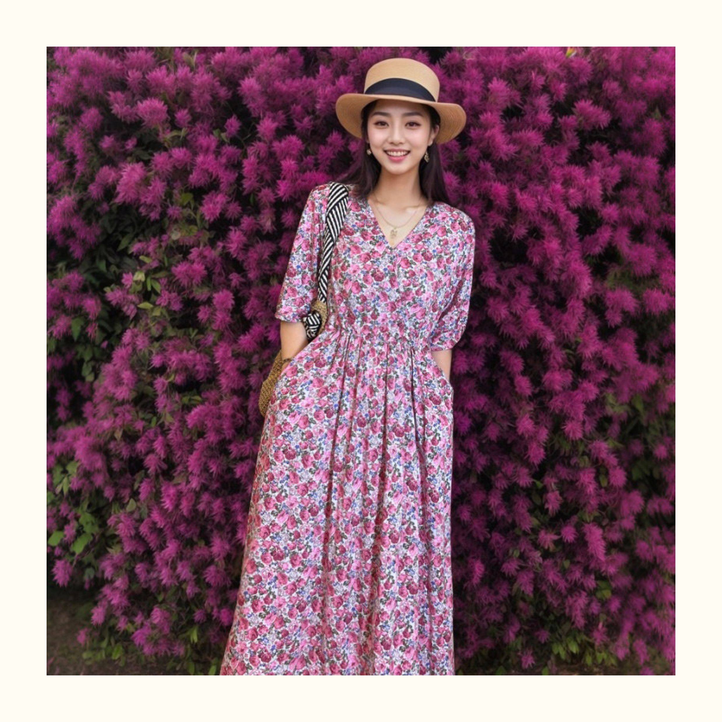棉綢連衣裙碎花印花人造棉夏裝女裝修身顯瘦中長款口袋寬鬆微胖裙
