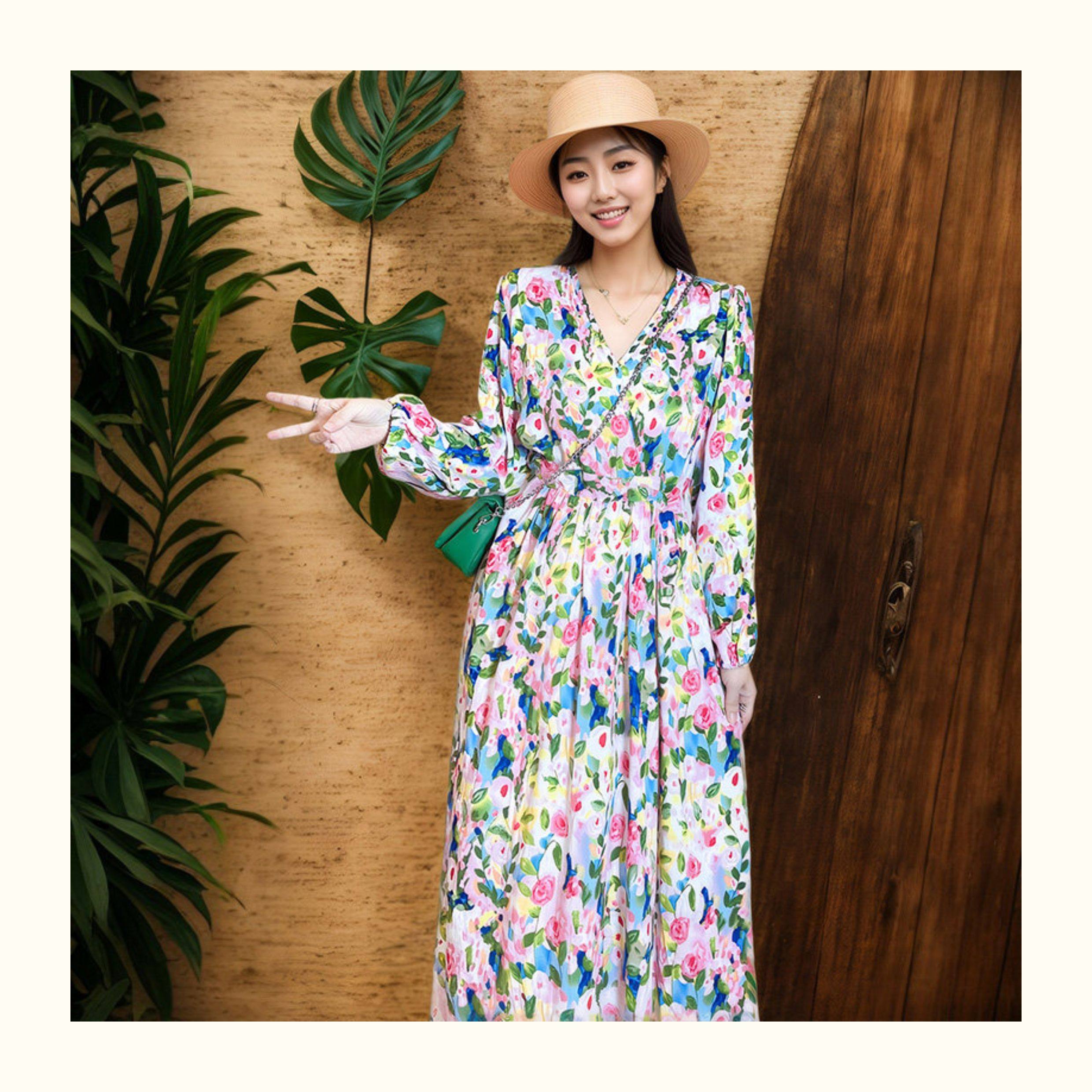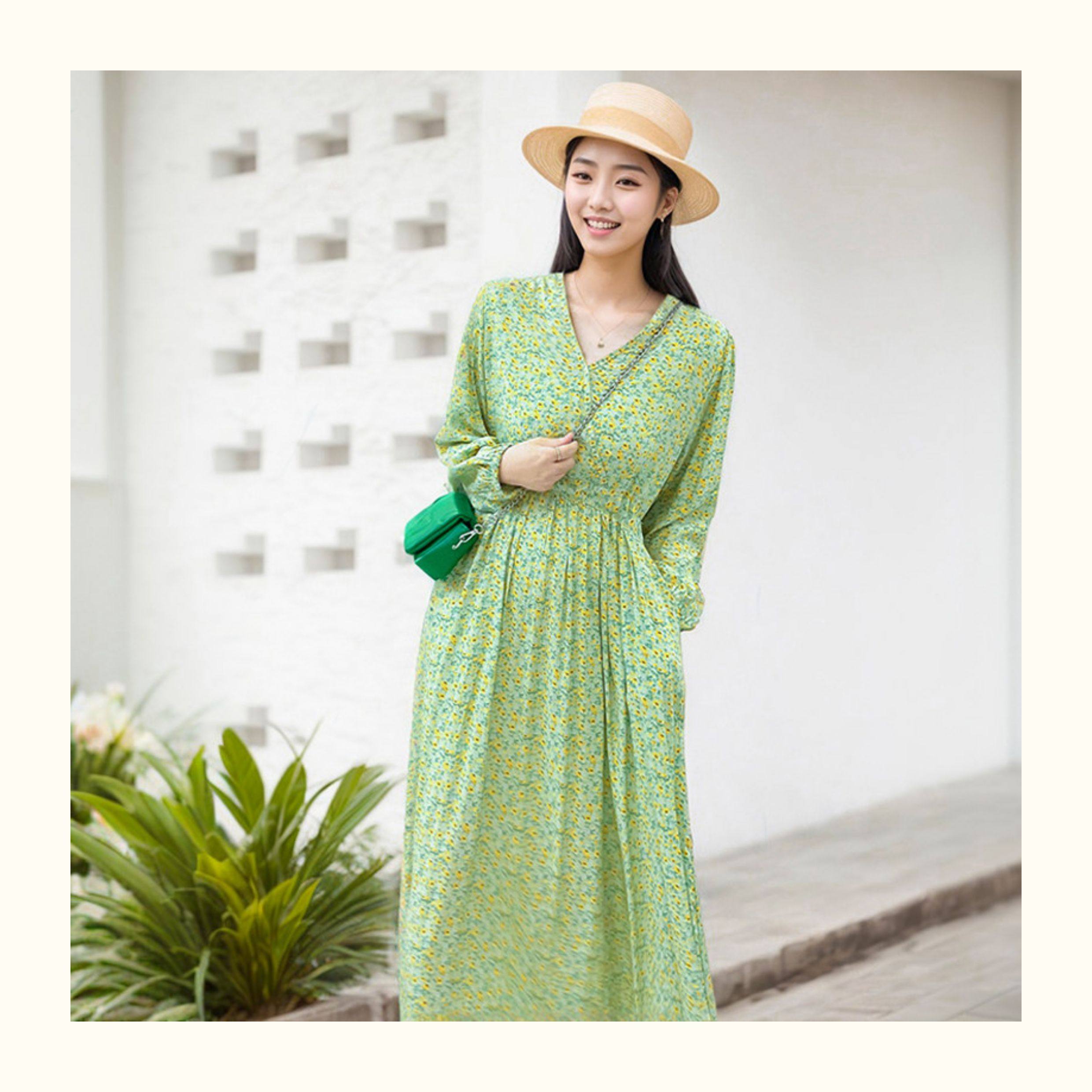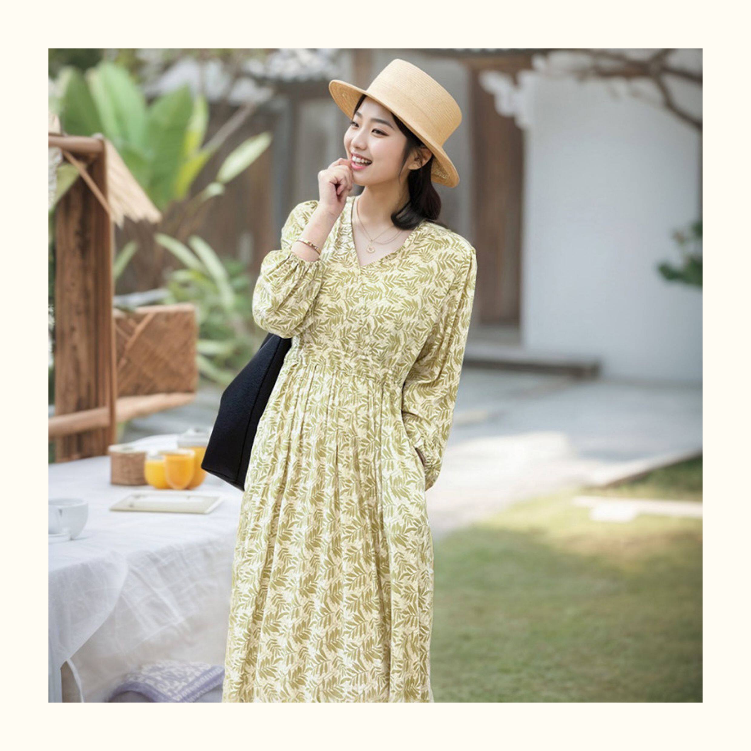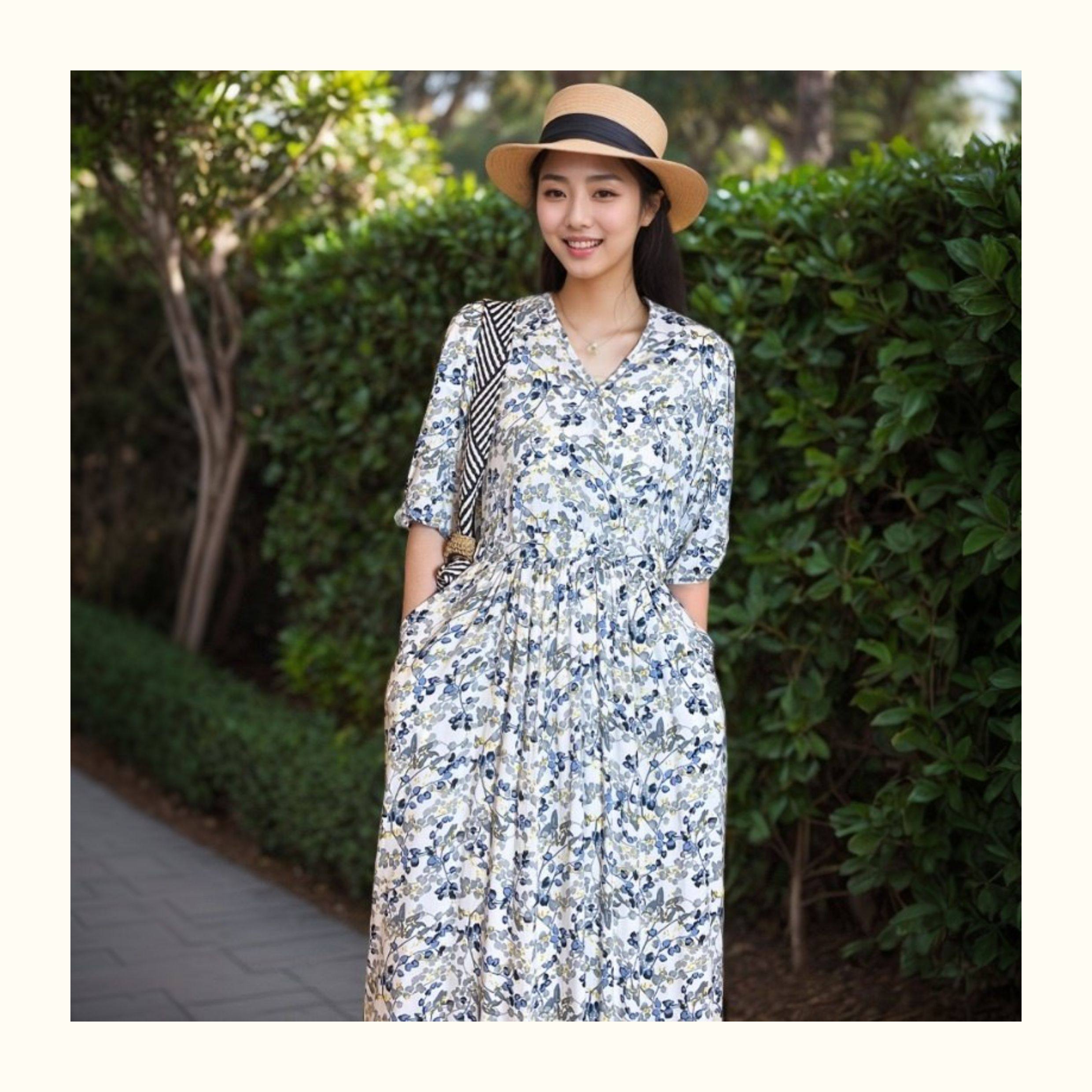 棉綢連衣裙碎花印花人造棉夏裝女裝修身顯瘦中長款口袋寬鬆微胖裙