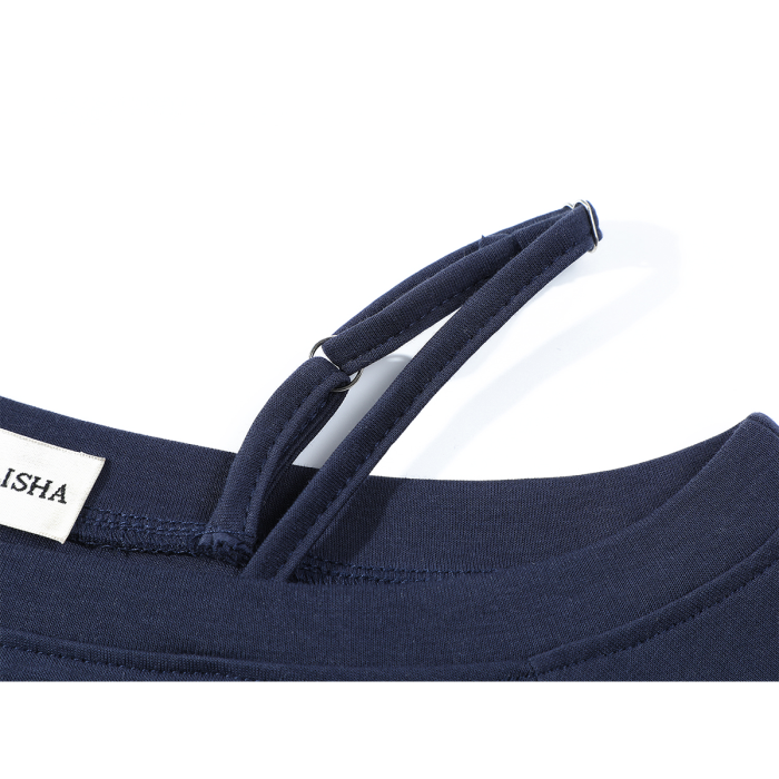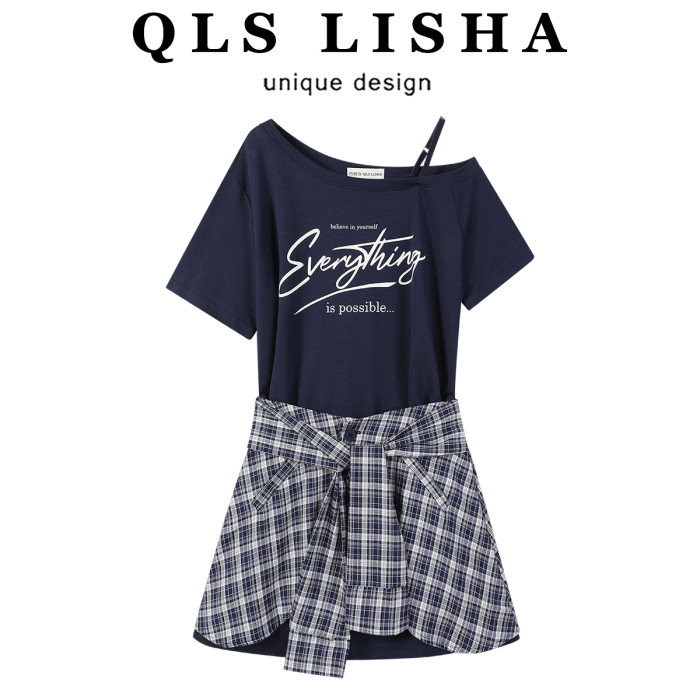 巧麗莎獨特超好看裙子兩件套美式斜肩吊帶拼接連衣裙女裝夏季套裝
