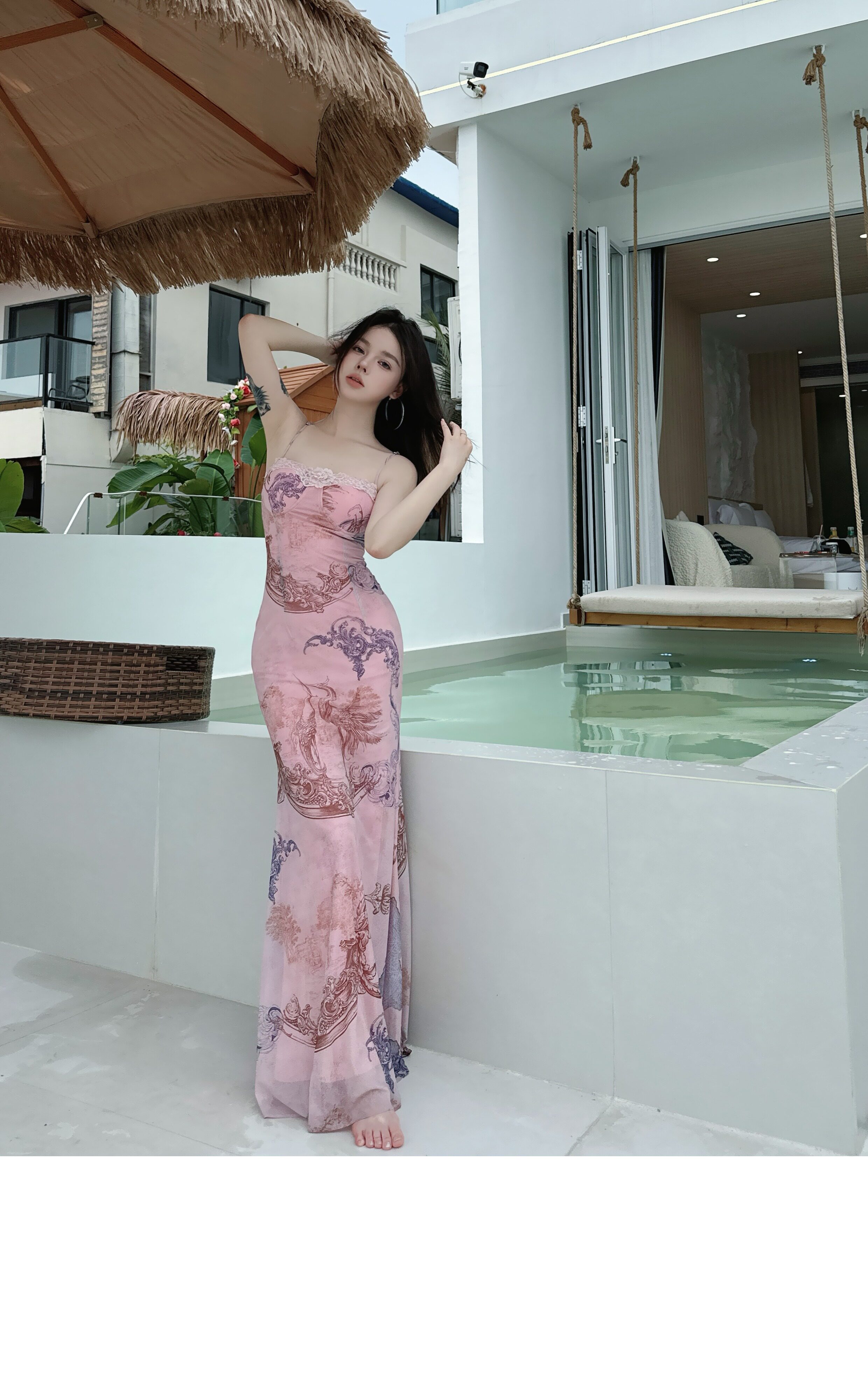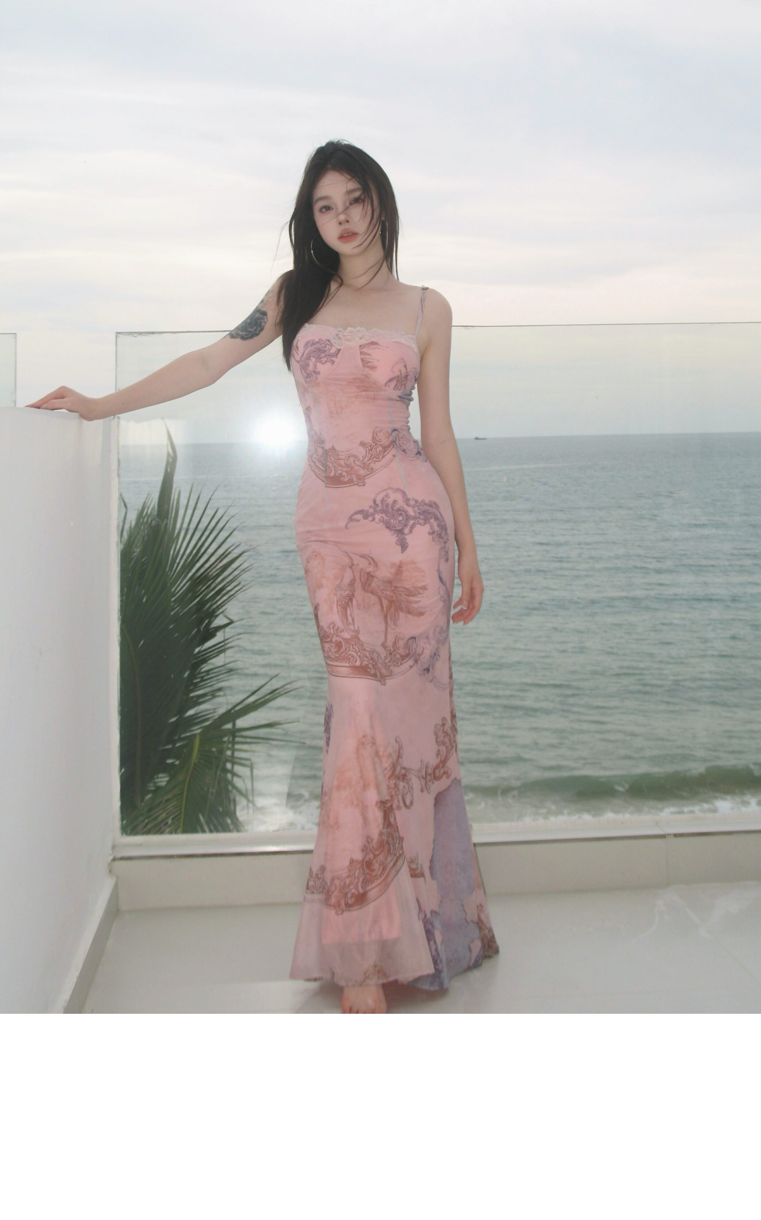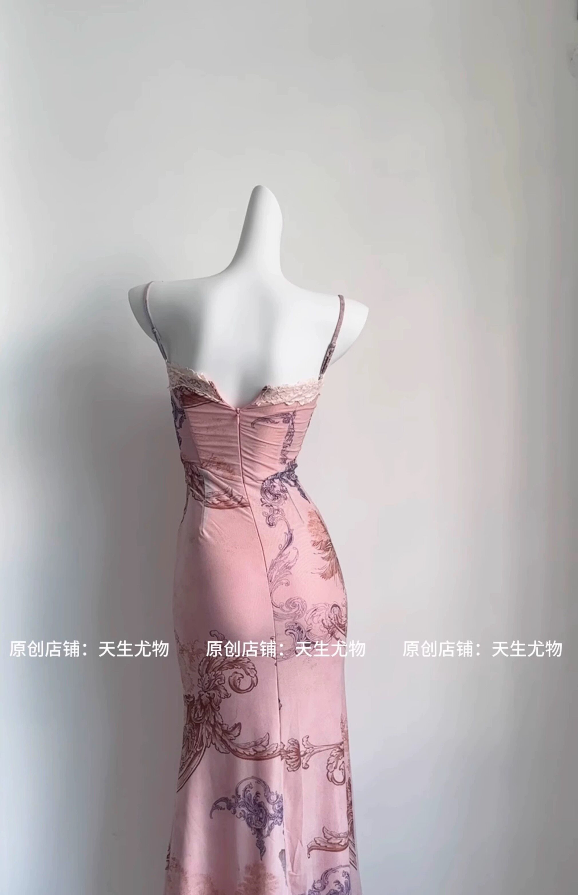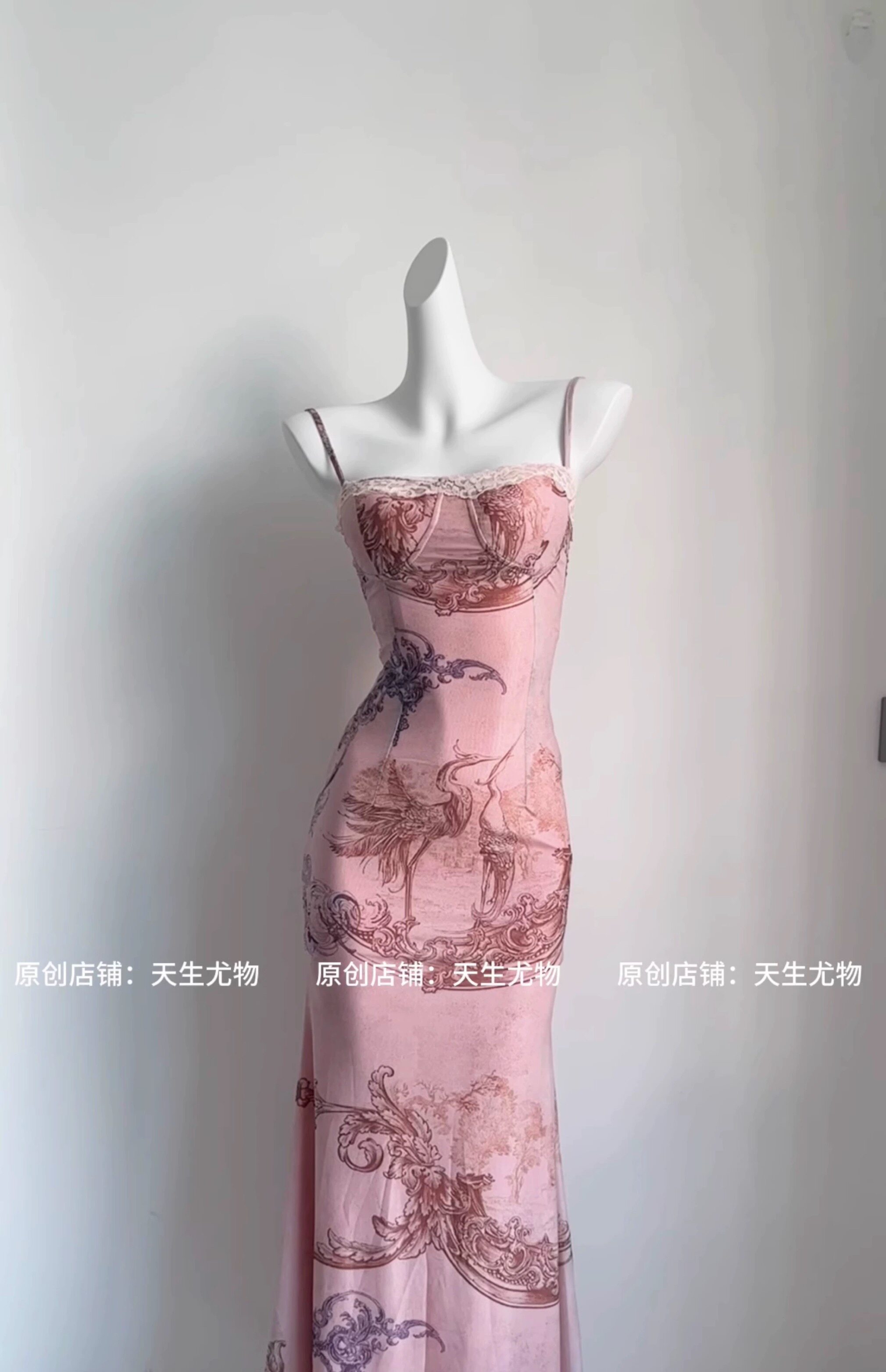 氣質性感仙鶴印花吊帶連衣裙女帶胸墊修身顯瘦包臀魚尾碎花長裙