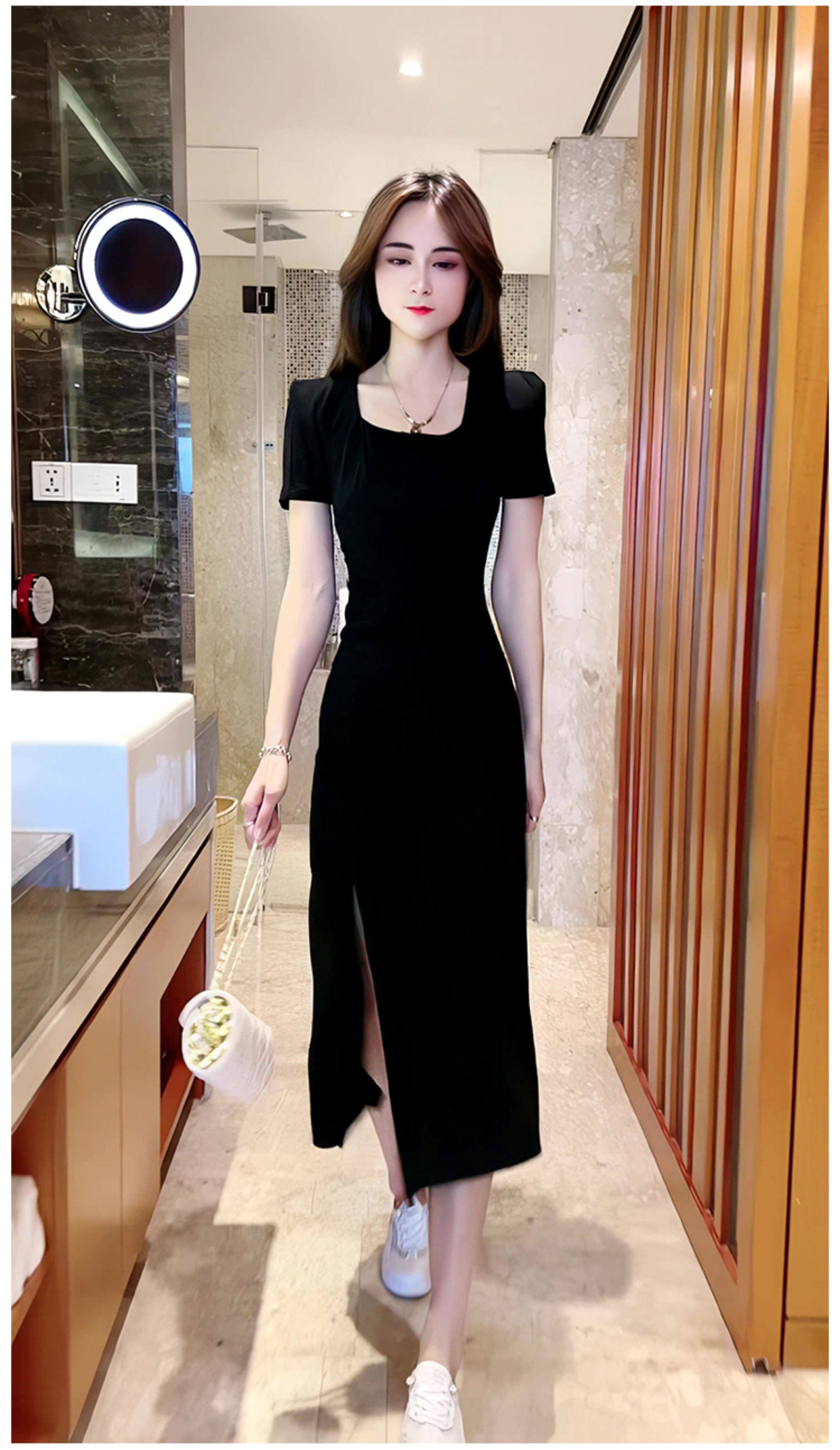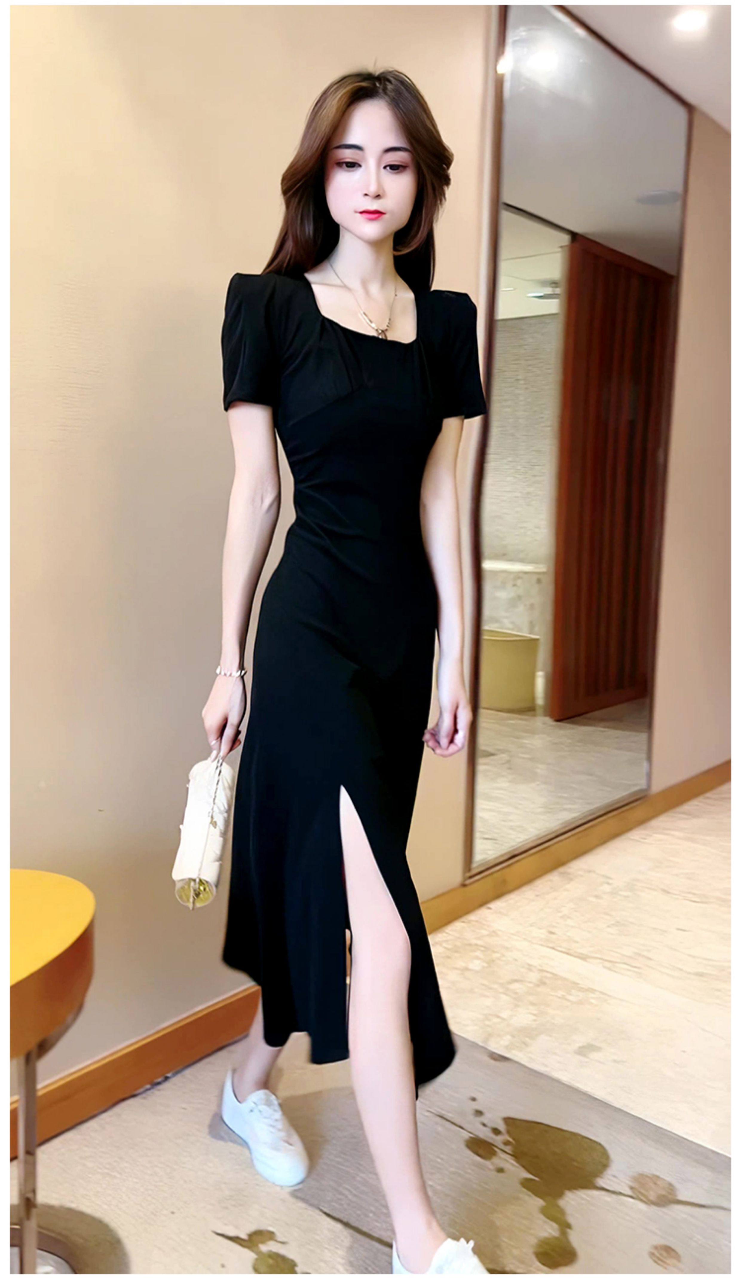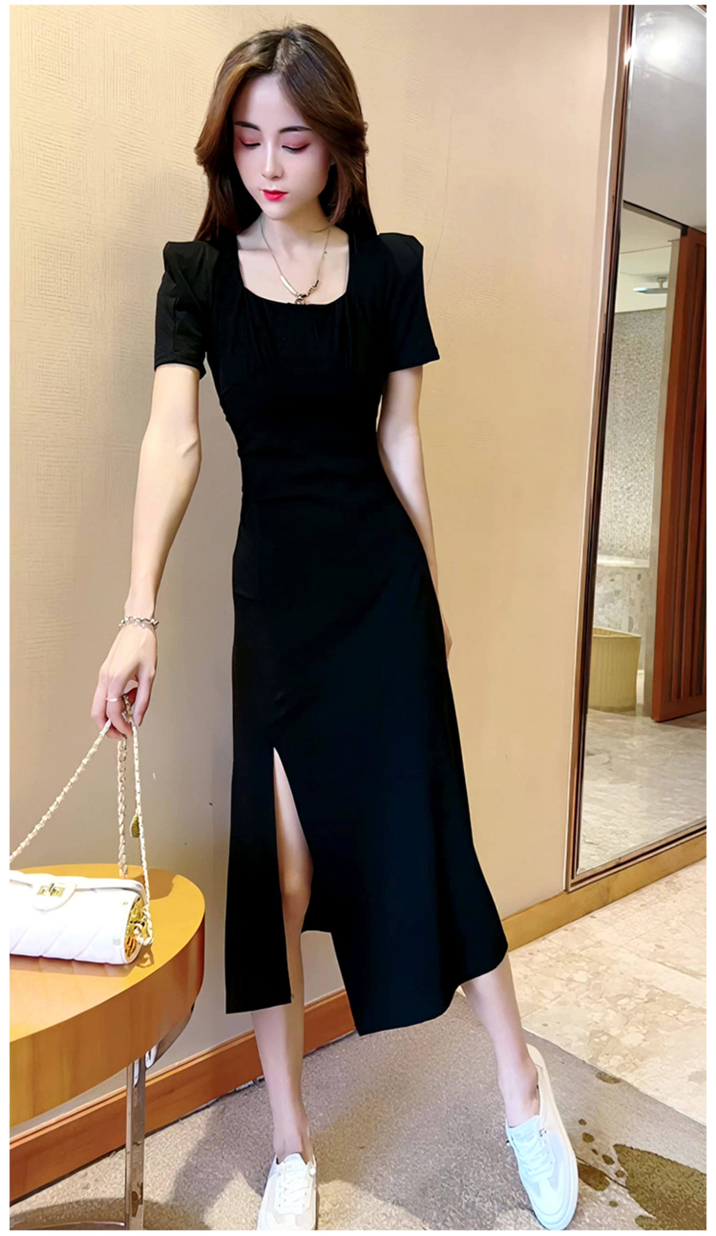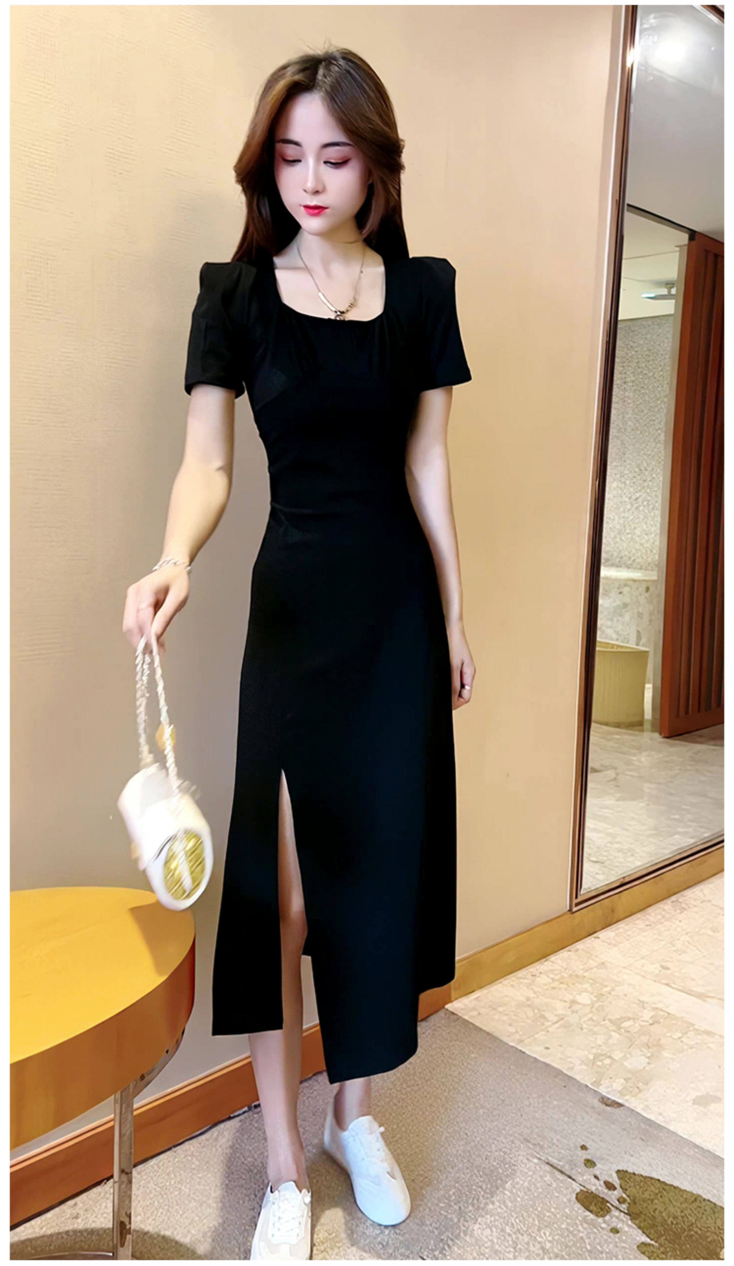 2026夏新款黑色連衣裙女收腰顯瘦氣質赫本風泡泡袖法式開叉長裙潮