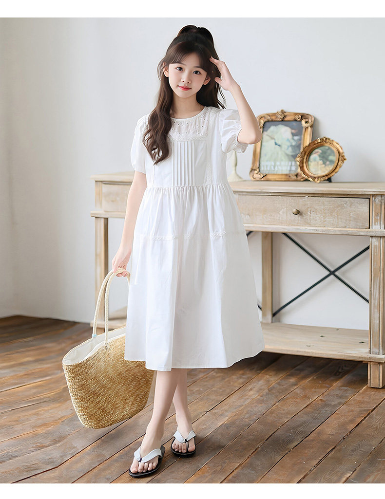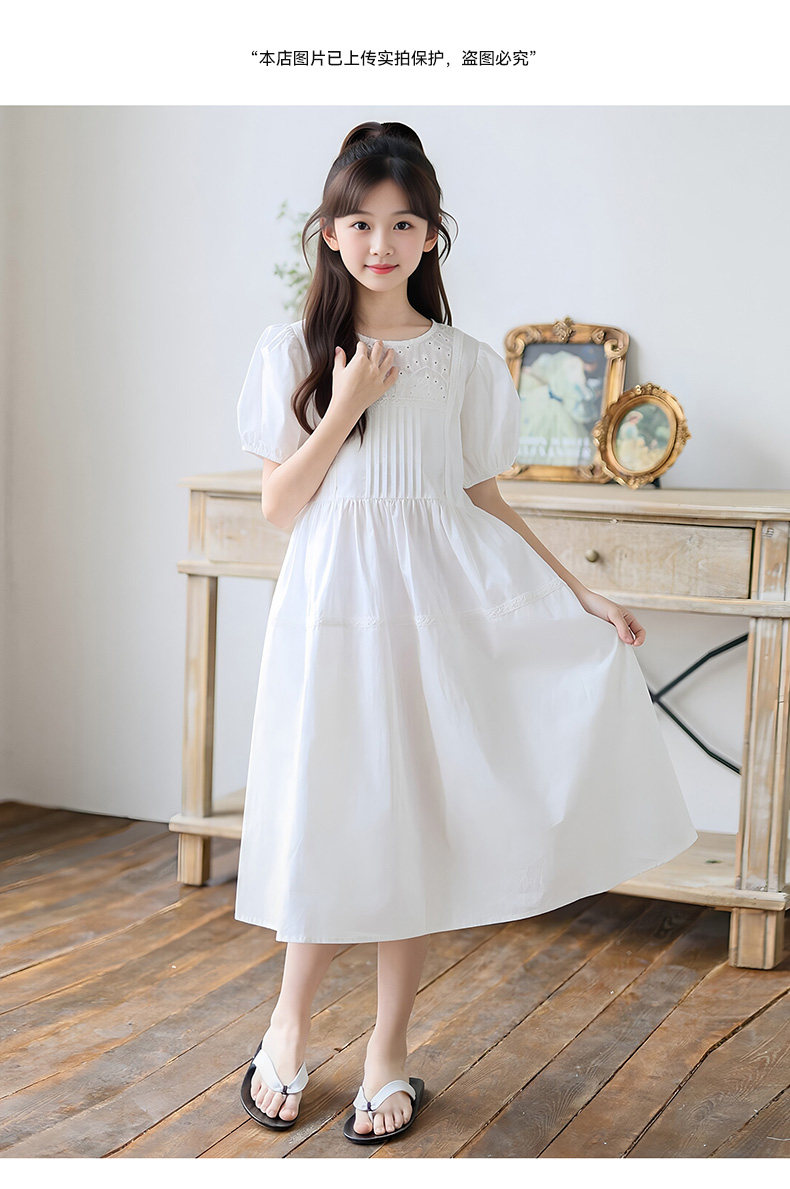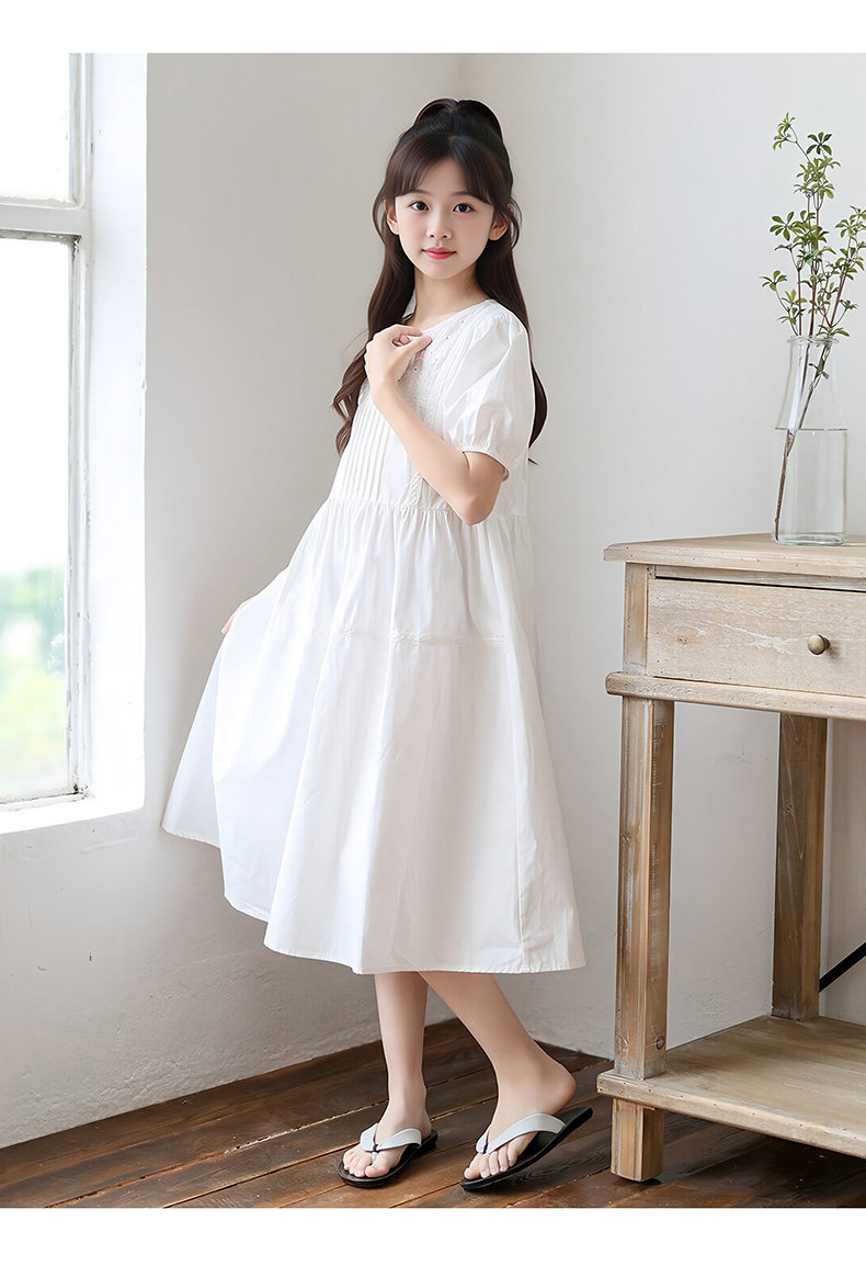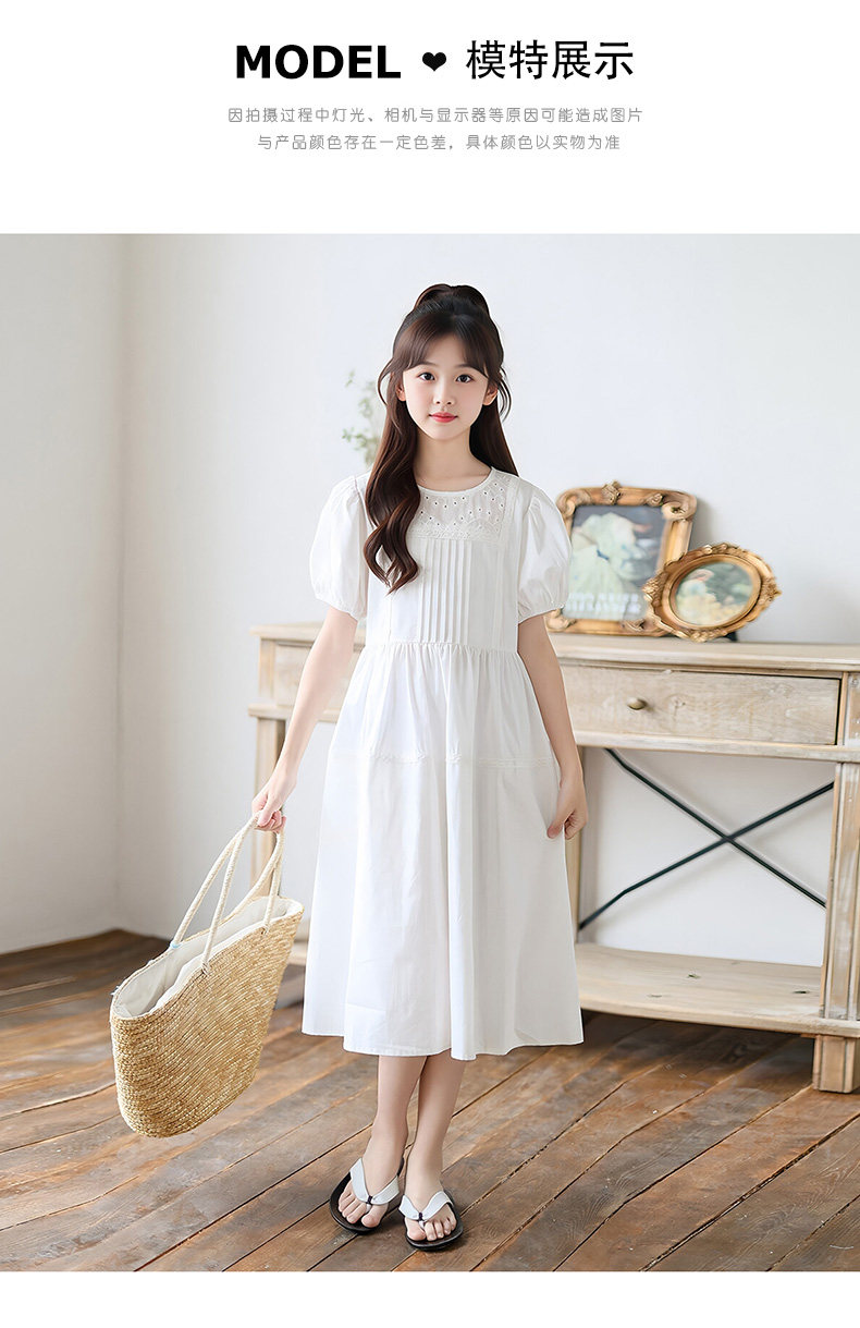 女童白色純棉連衣裙夏季大童女孩甜美風長裙子中大童泡泡袖公主裙