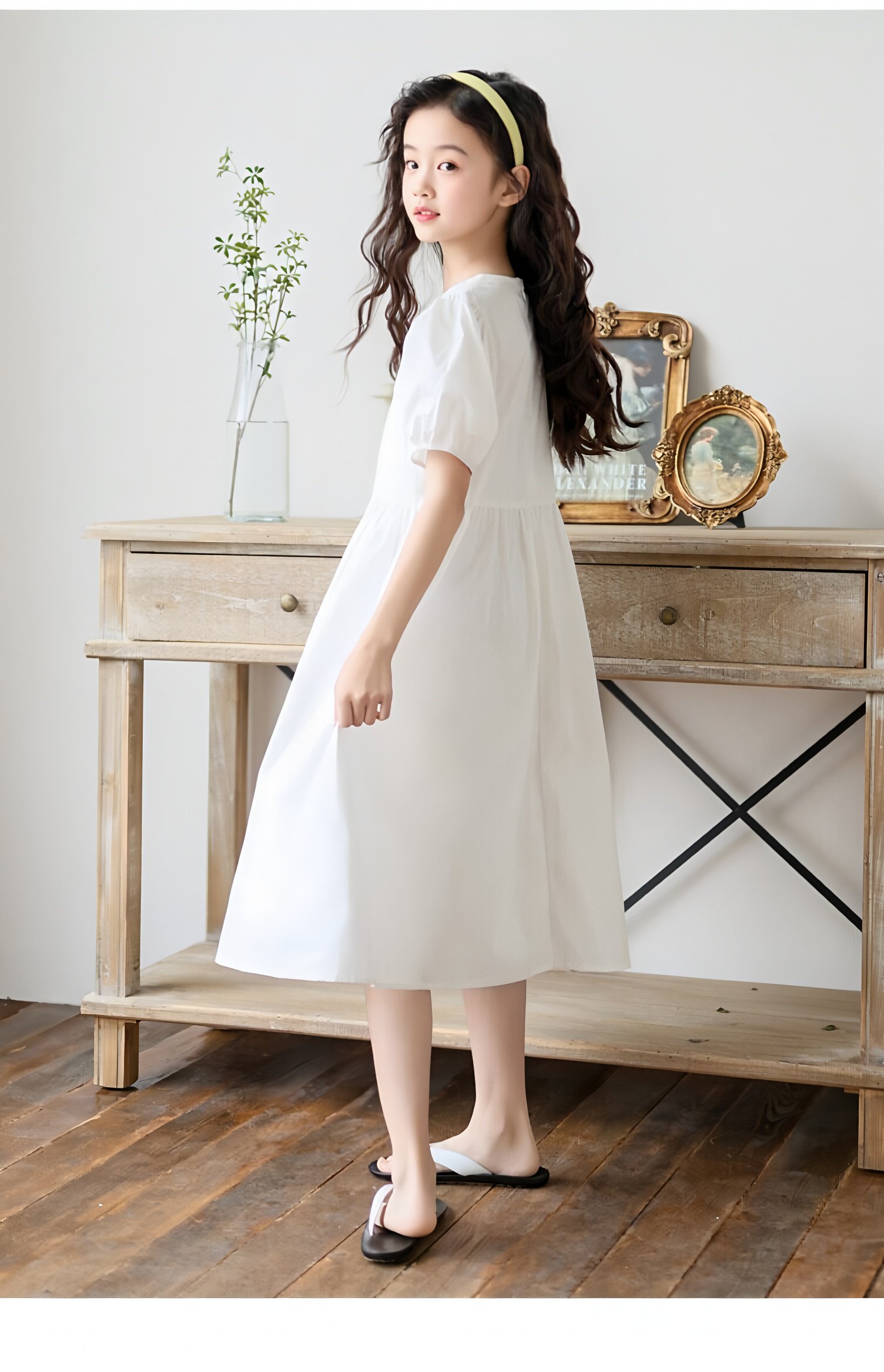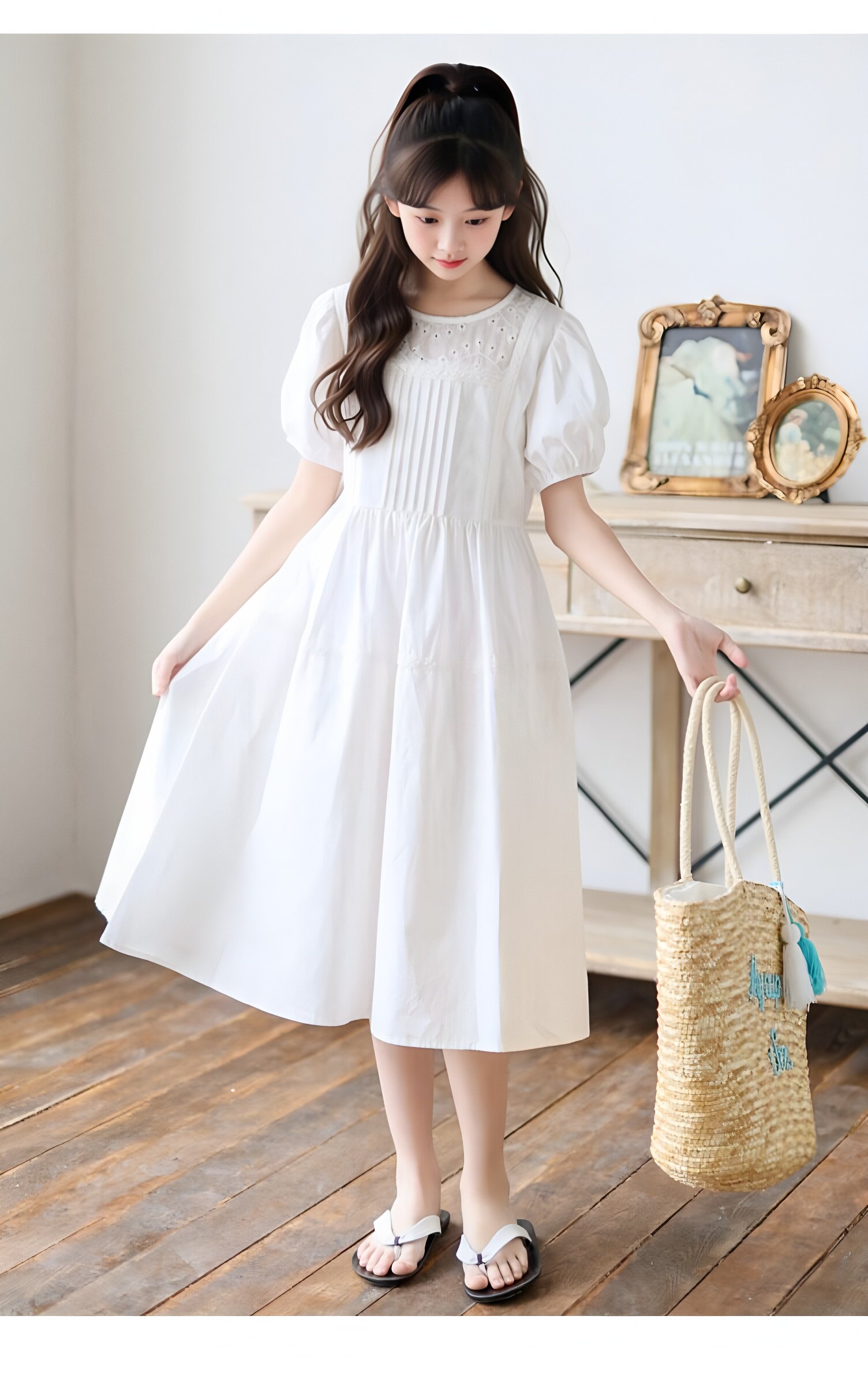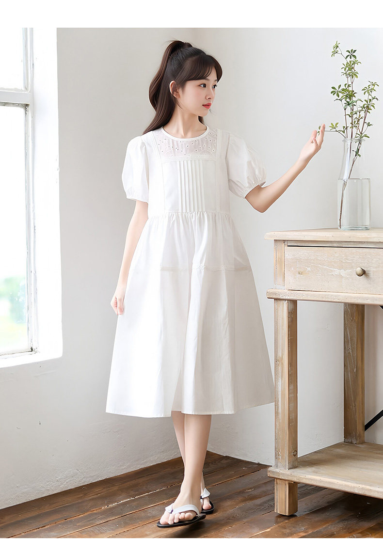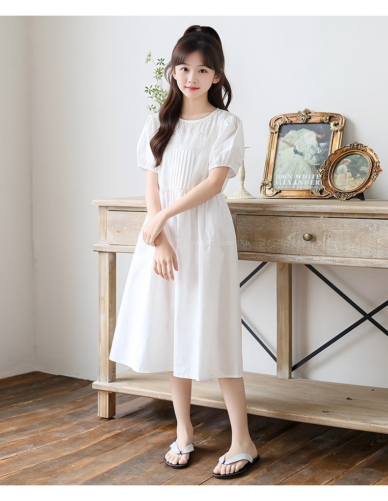 女童白色純棉連衣裙夏季大童女孩甜美風長裙子中大童泡泡袖公主裙