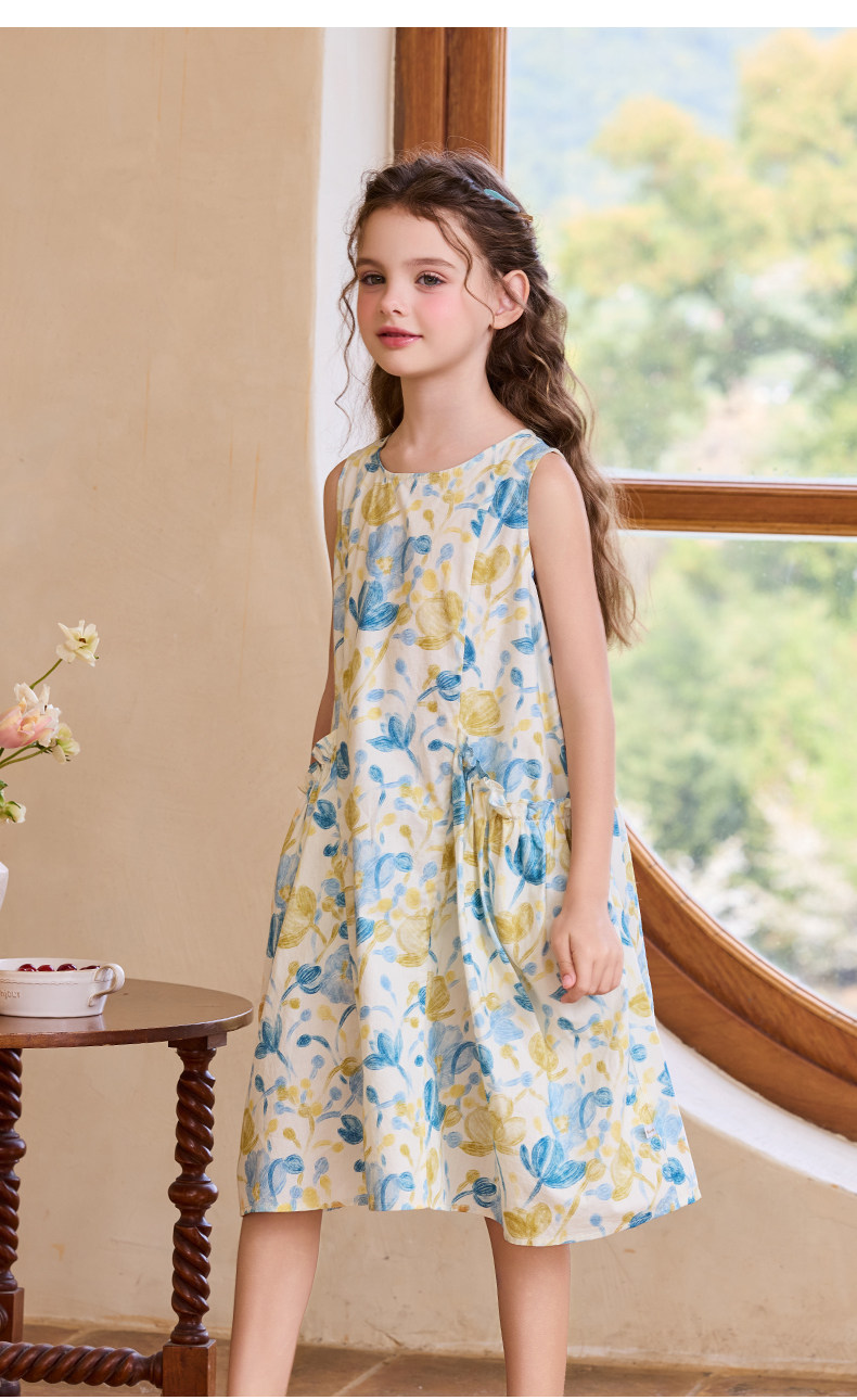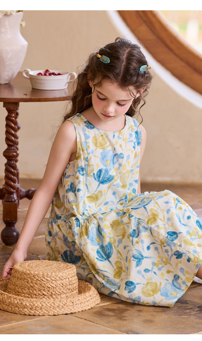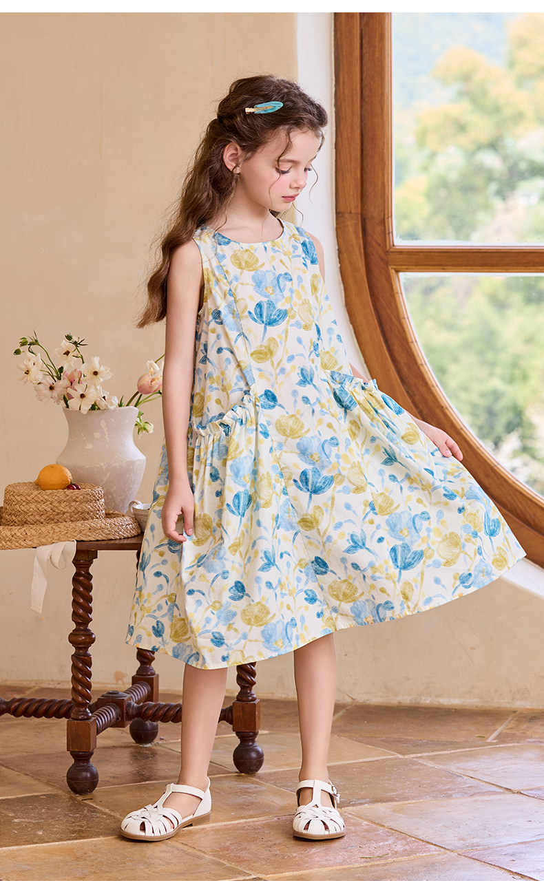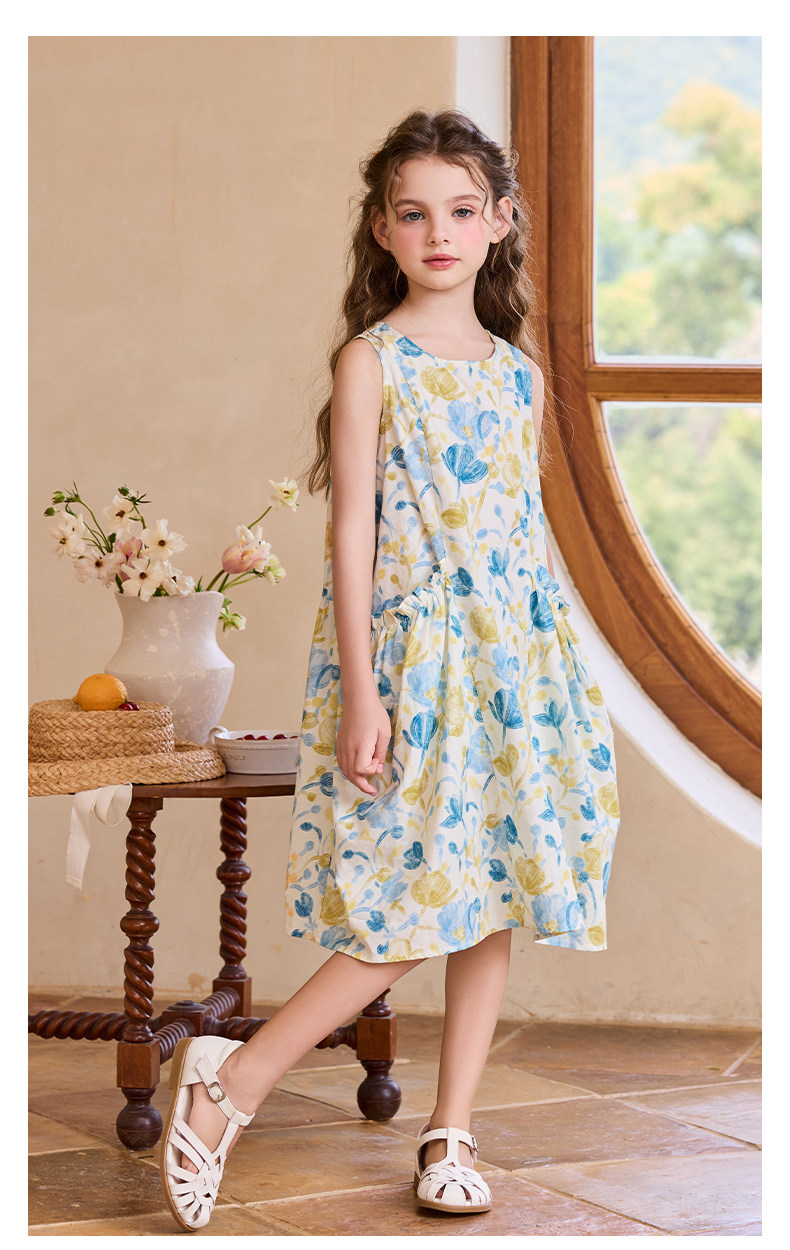 Little Naive女童純棉連衣裙夏季新款印花背心裙兒童口袋碎花裙