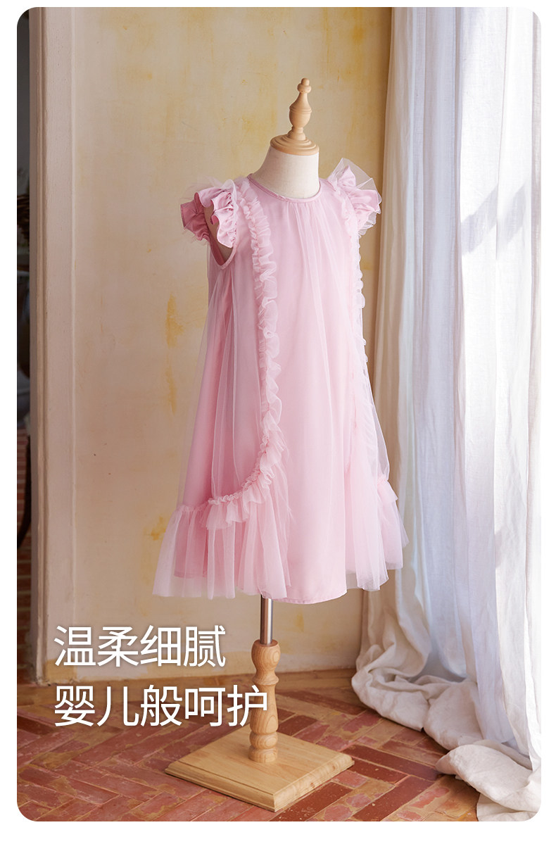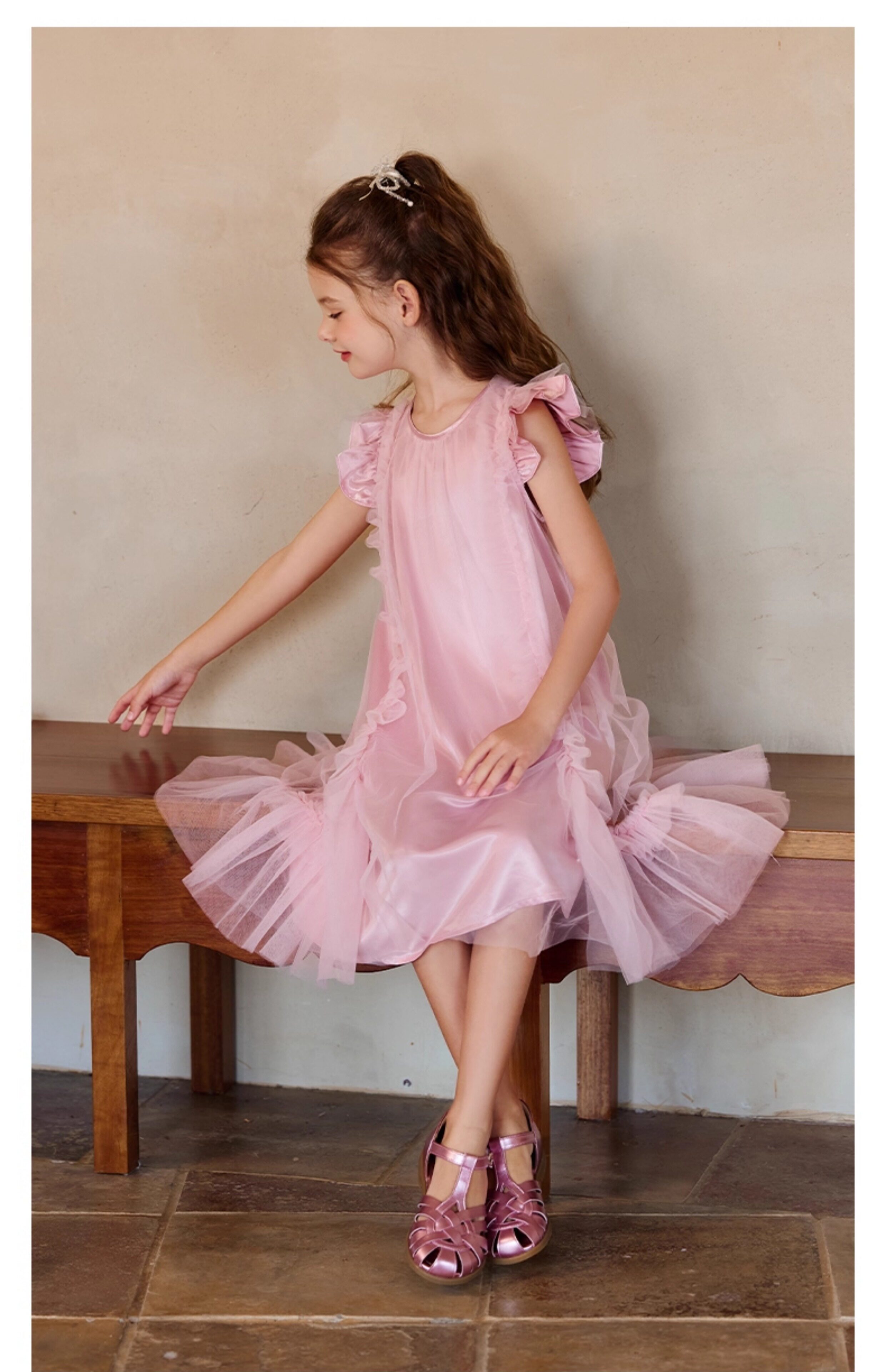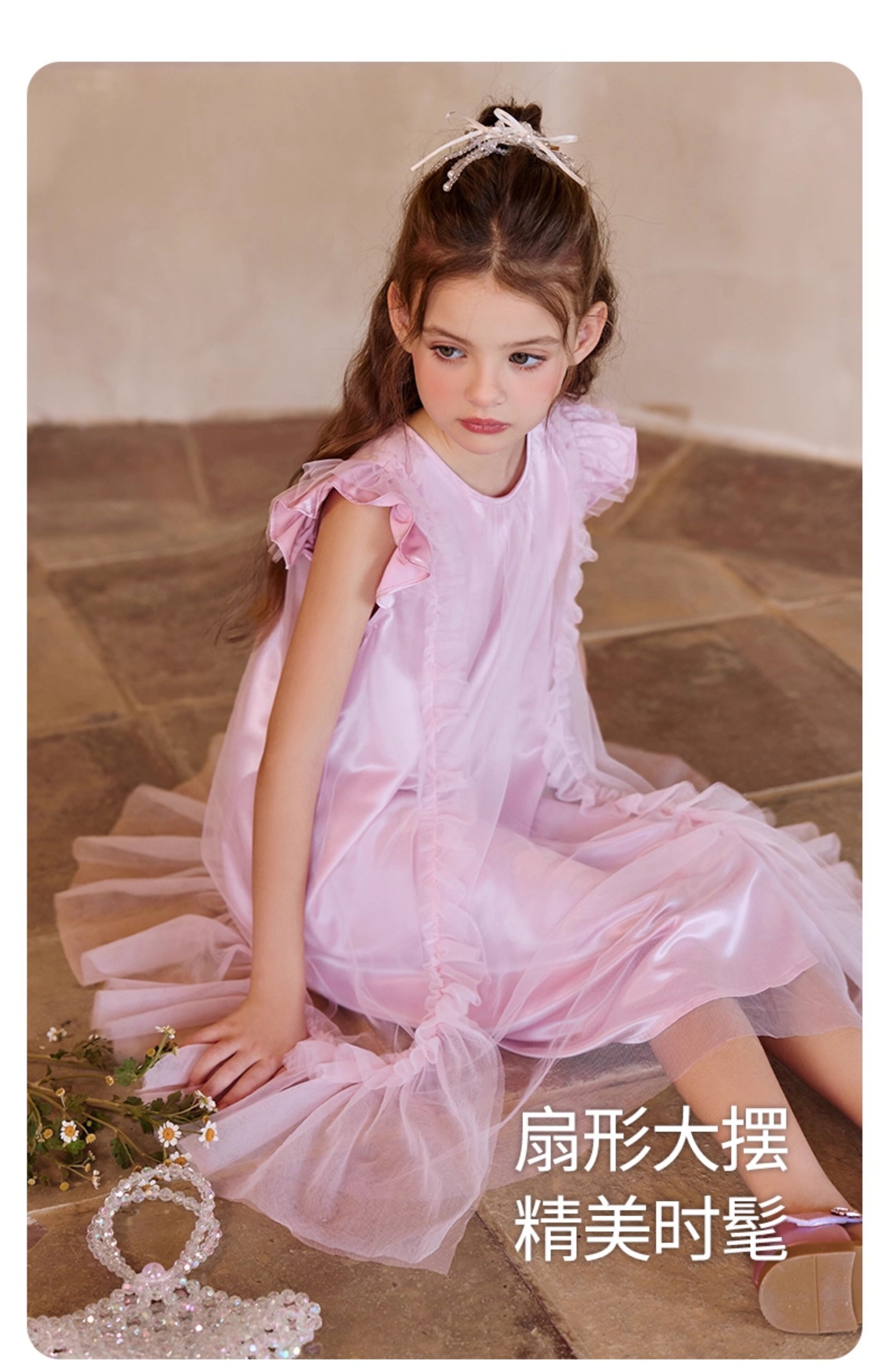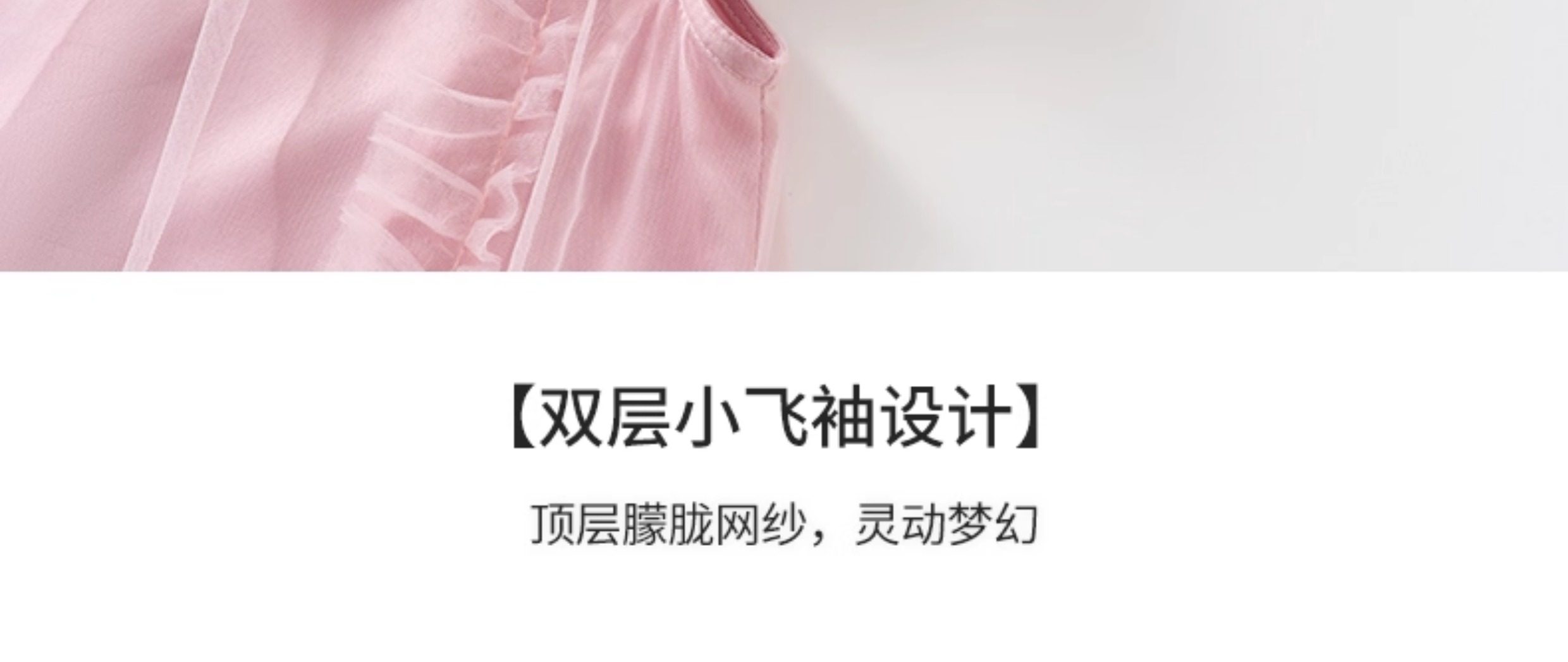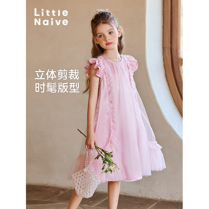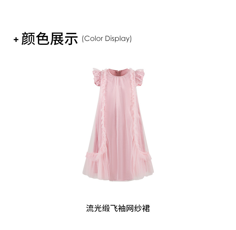 Little Naive兒童連衣裙夏季新款流光緞飛袖網紗裙女童甜美蛋糕裙