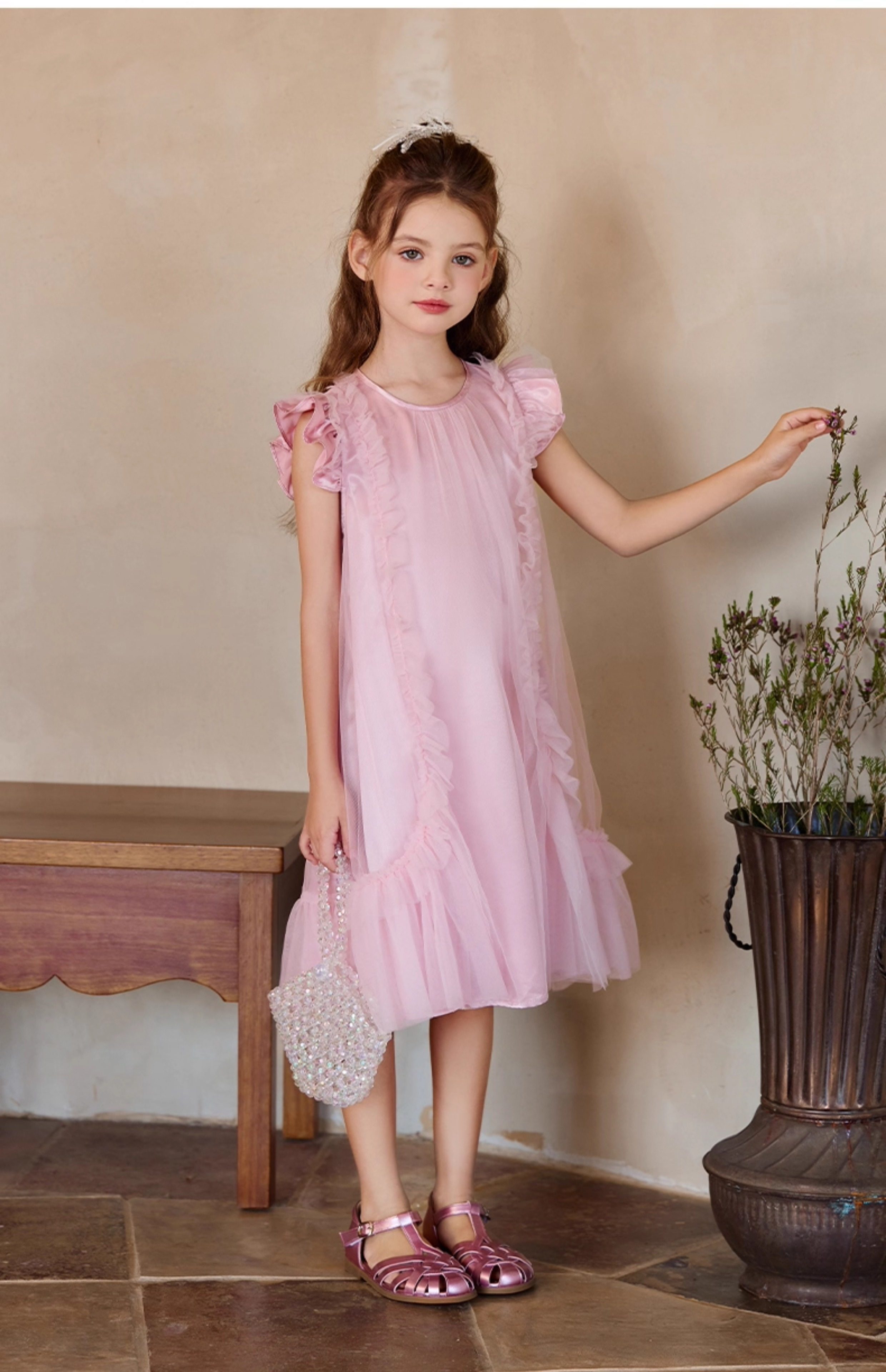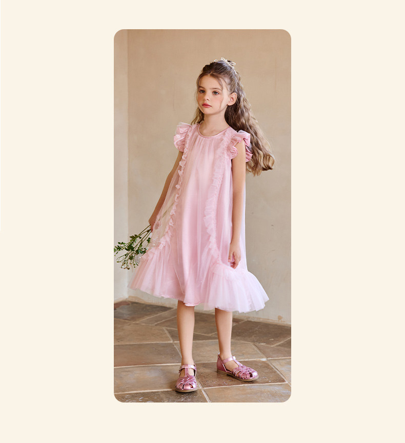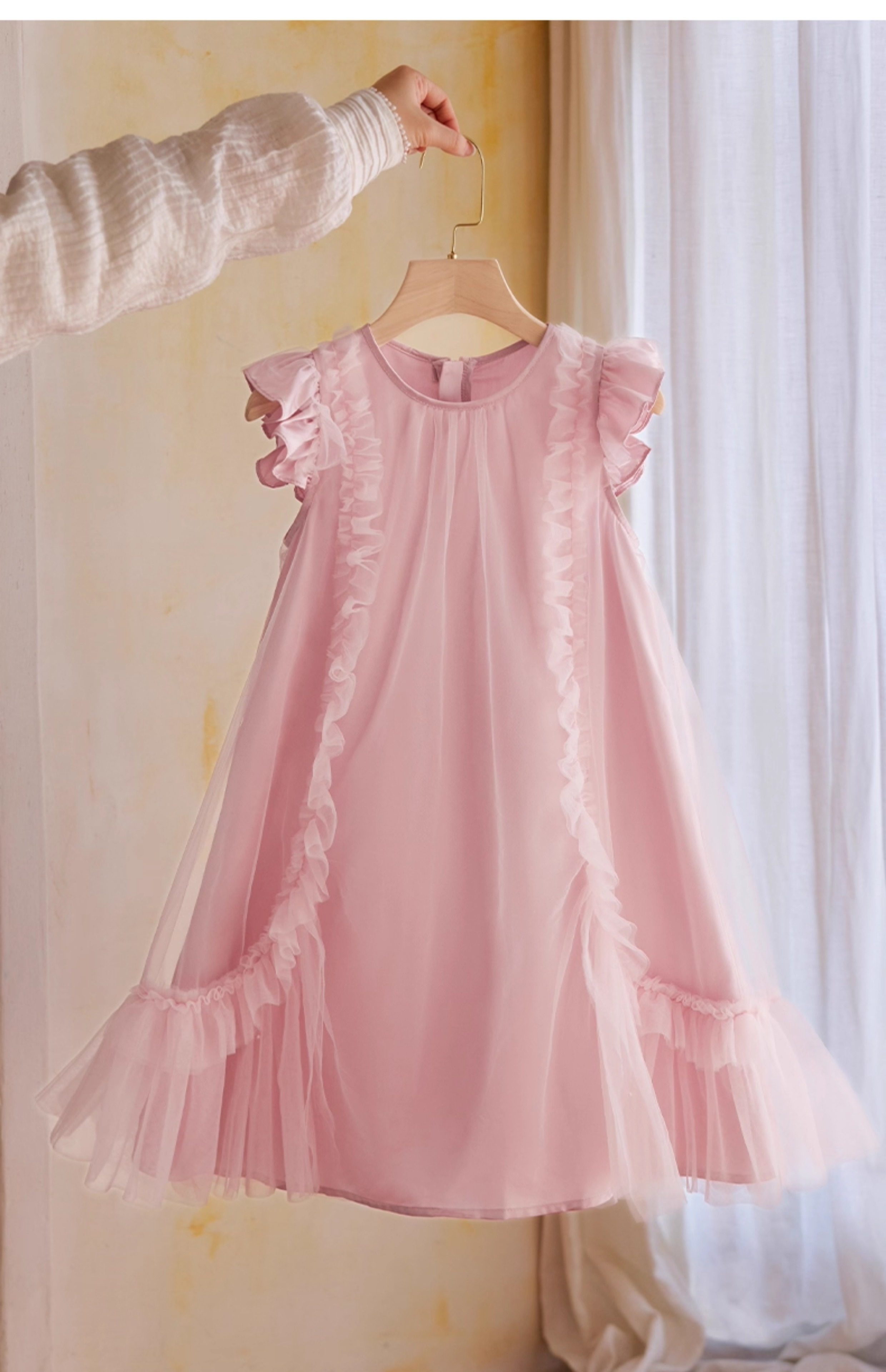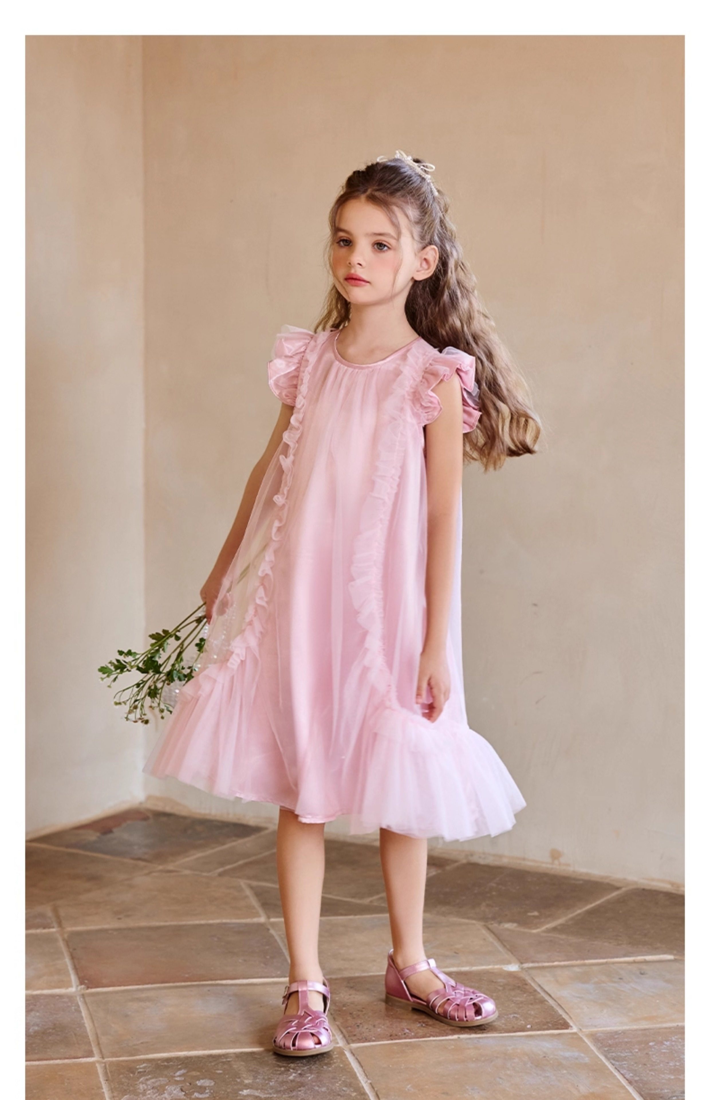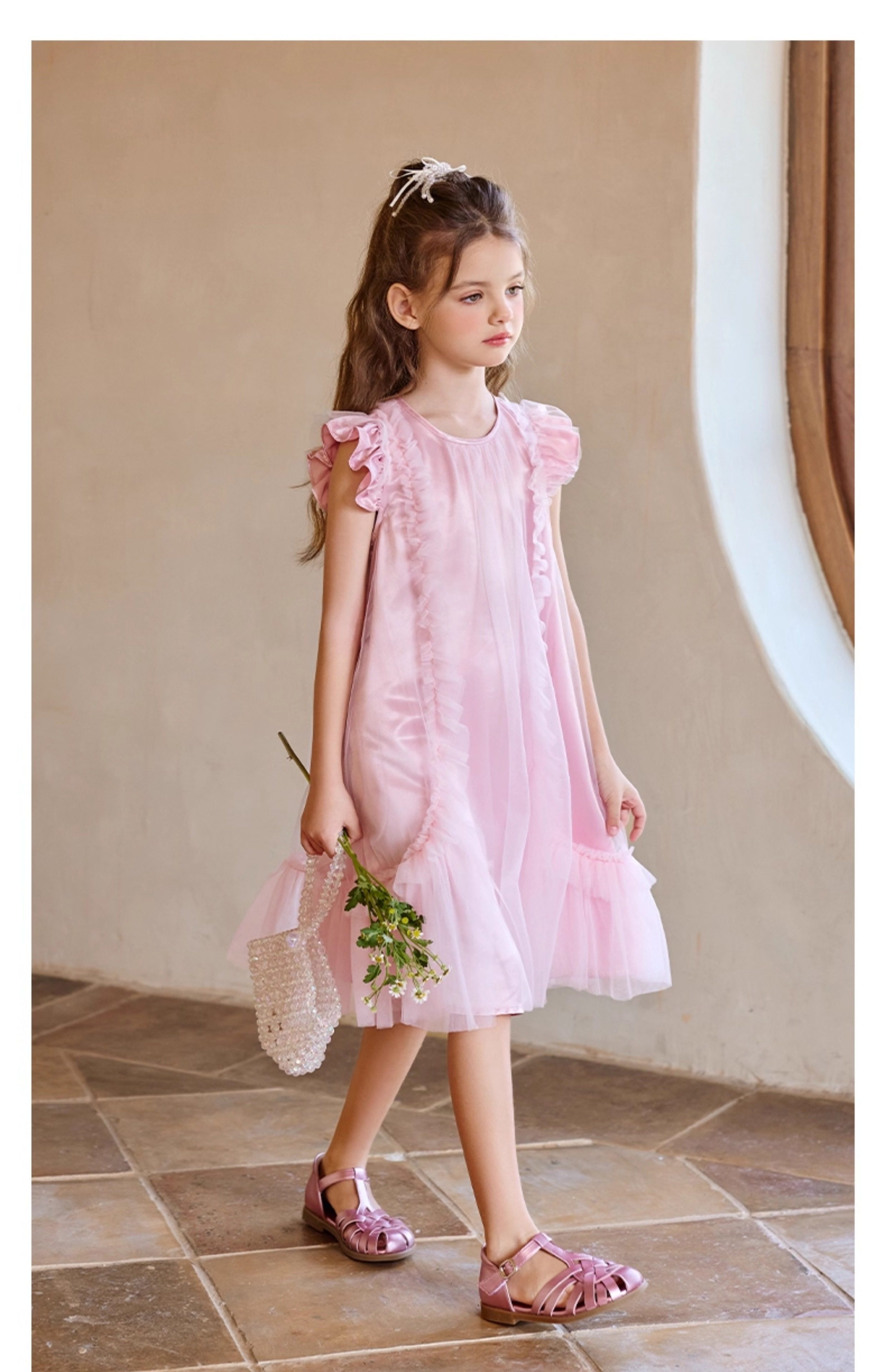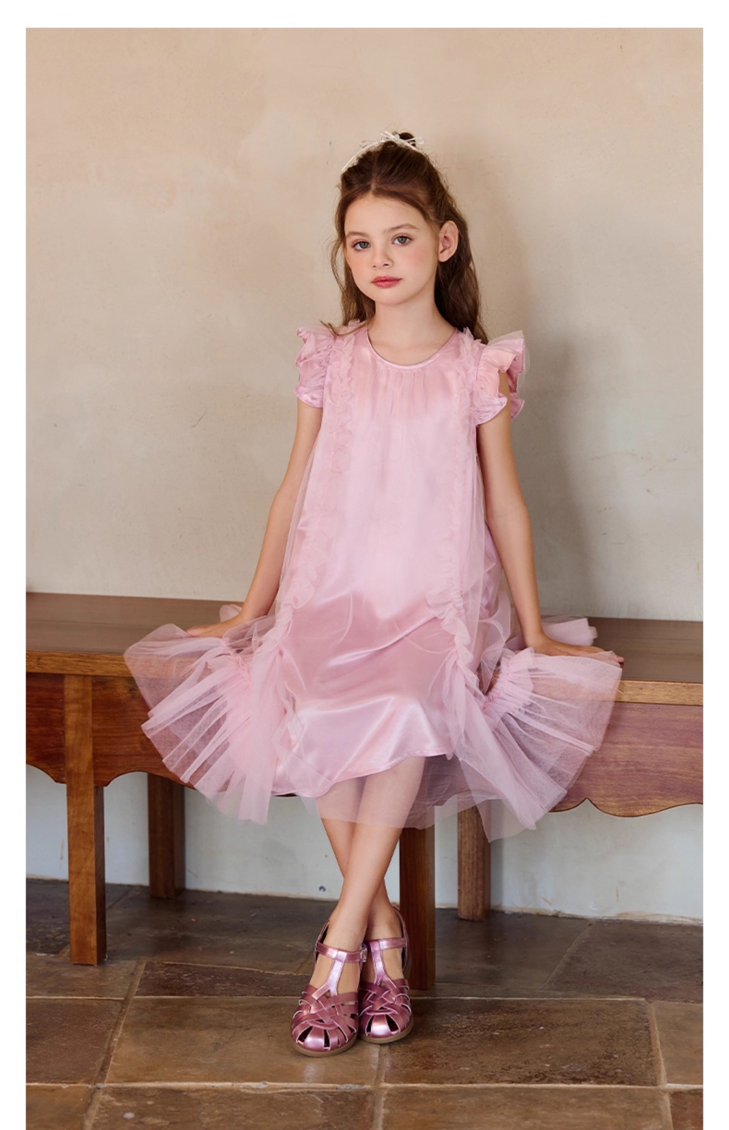 Little Naive兒童連衣裙夏季新款流光緞飛袖網紗裙女童甜美蛋糕裙
