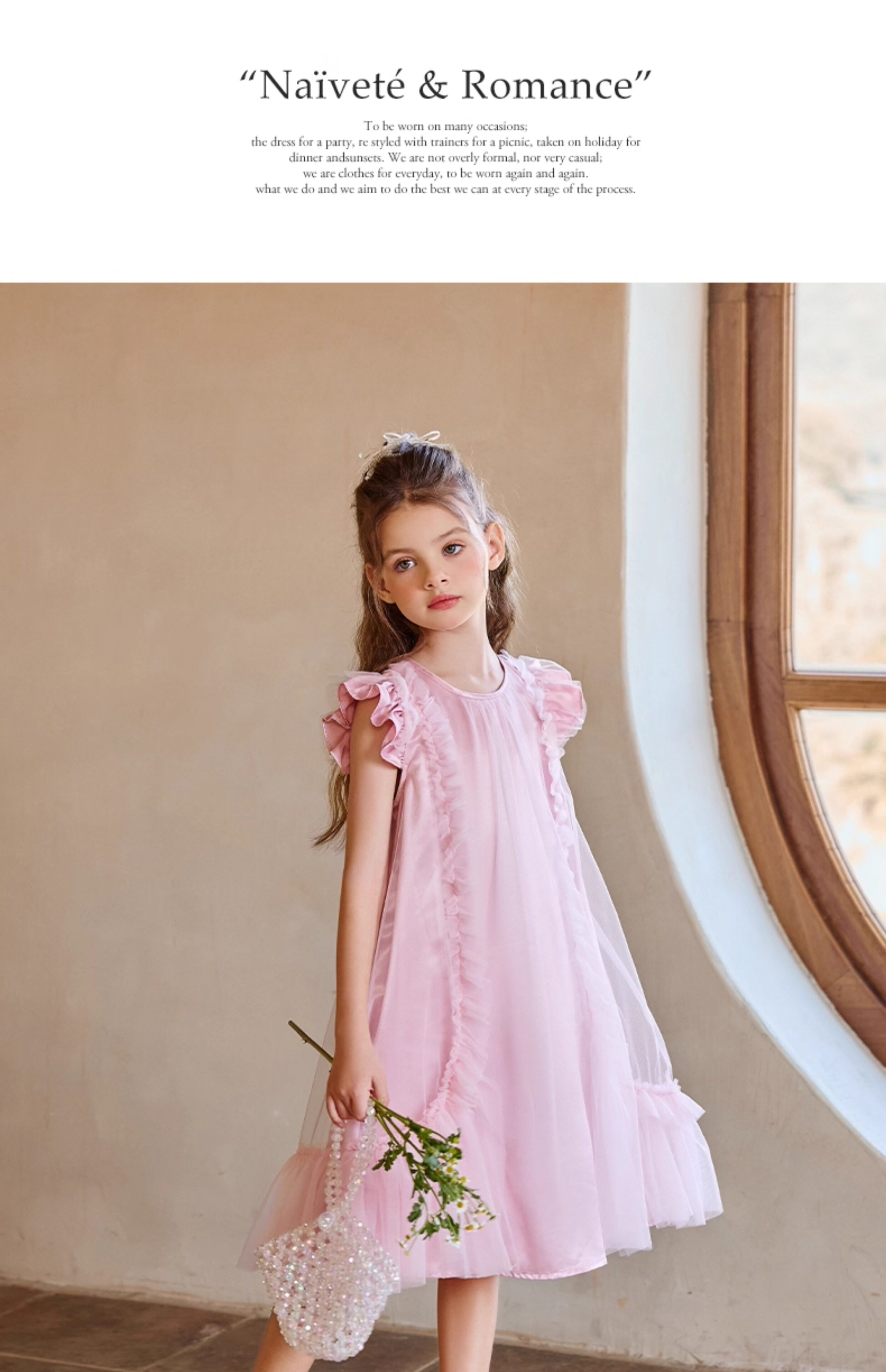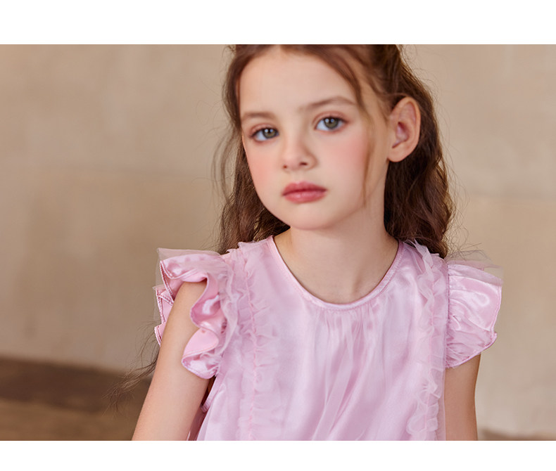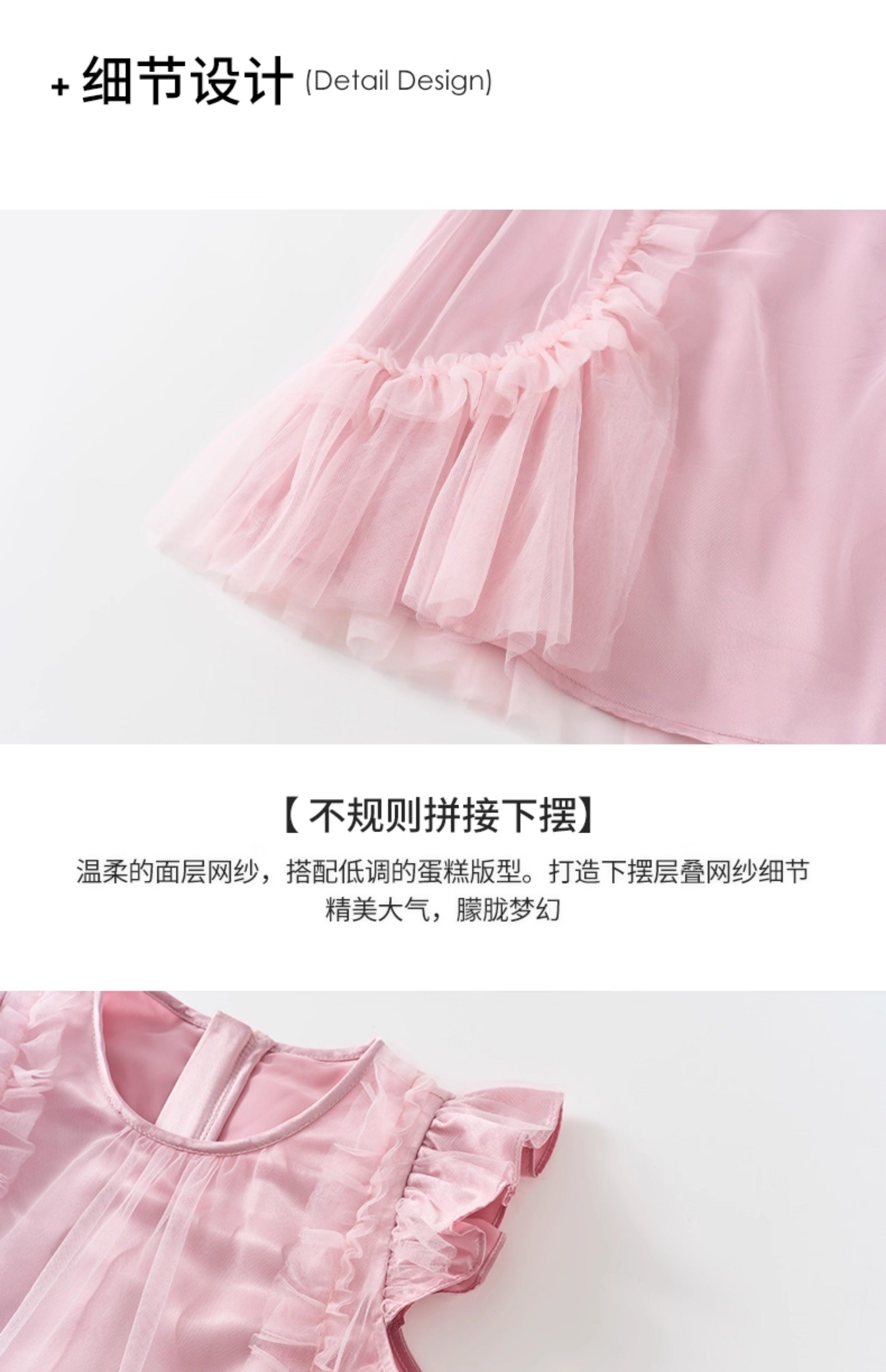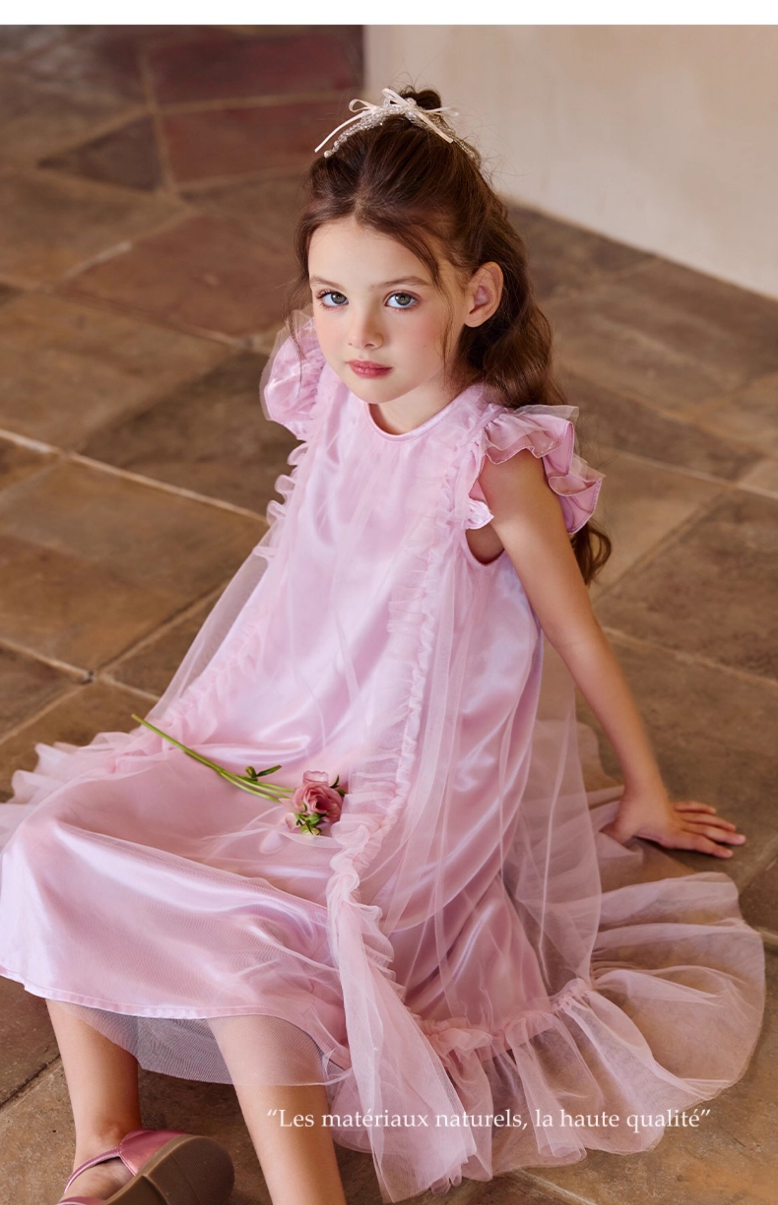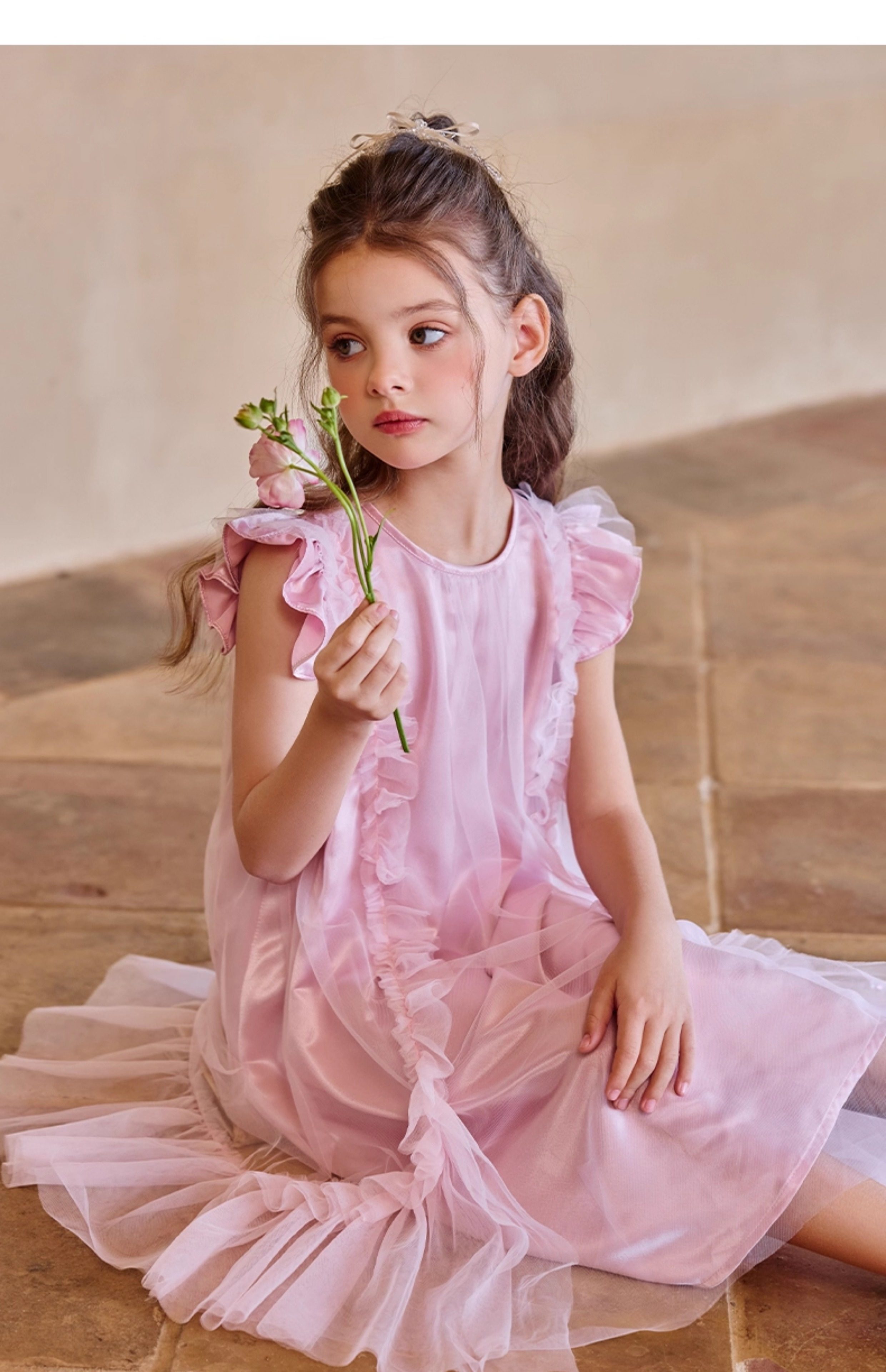 Little Naive兒童連衣裙夏季新款流光緞飛袖網紗裙女童甜美蛋糕裙