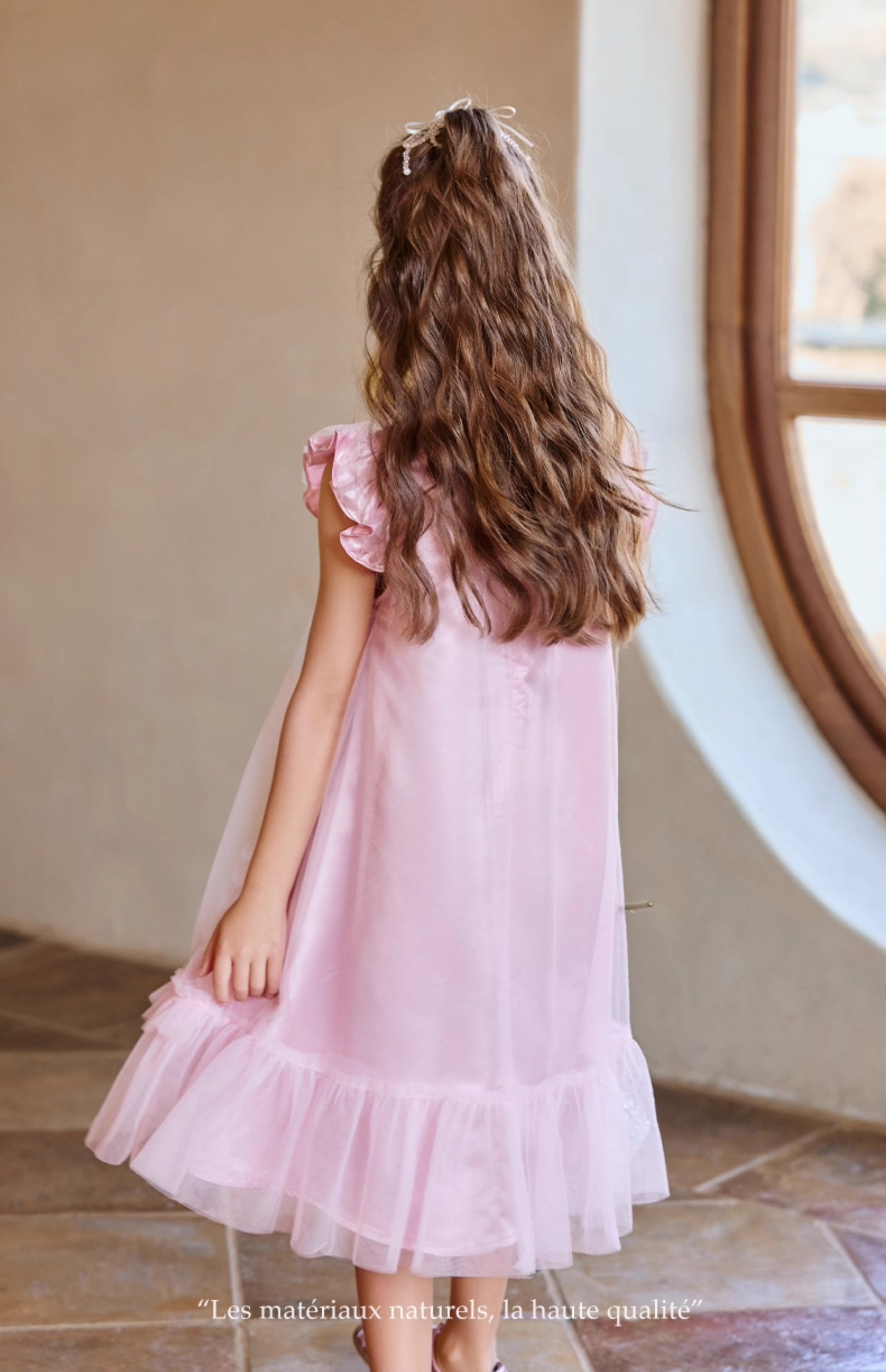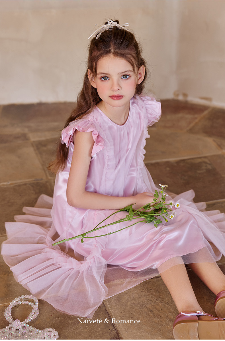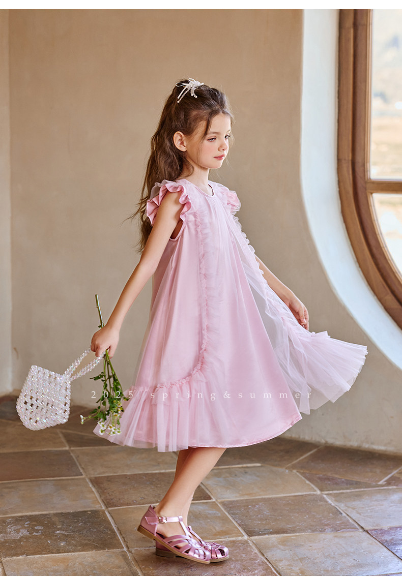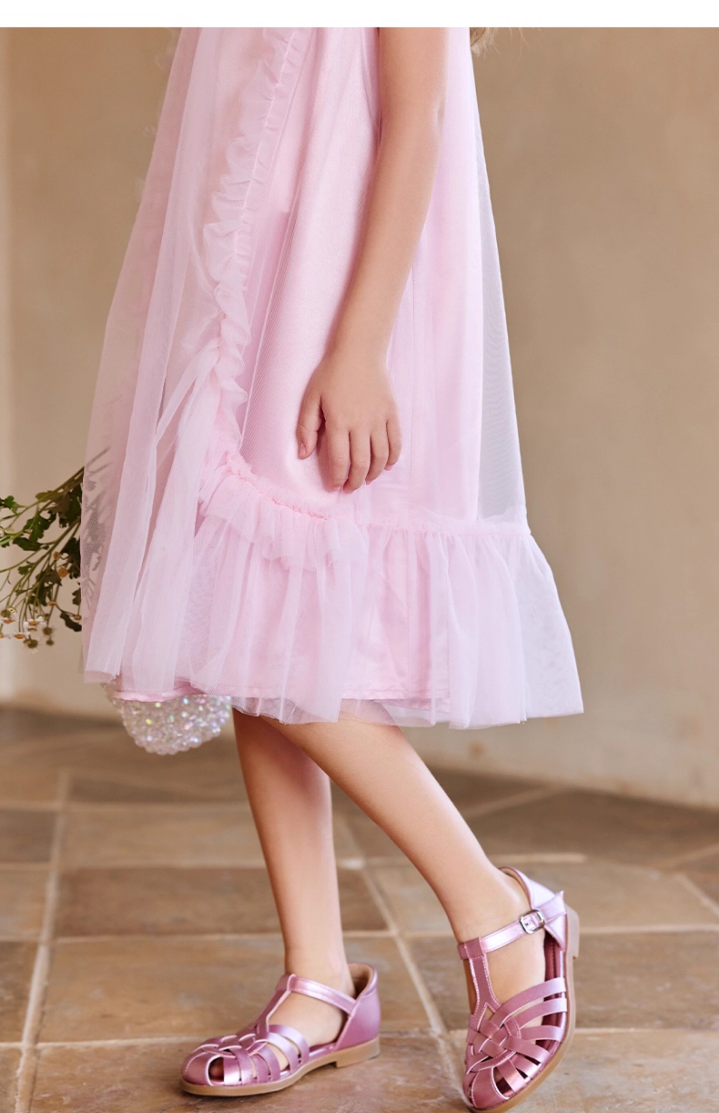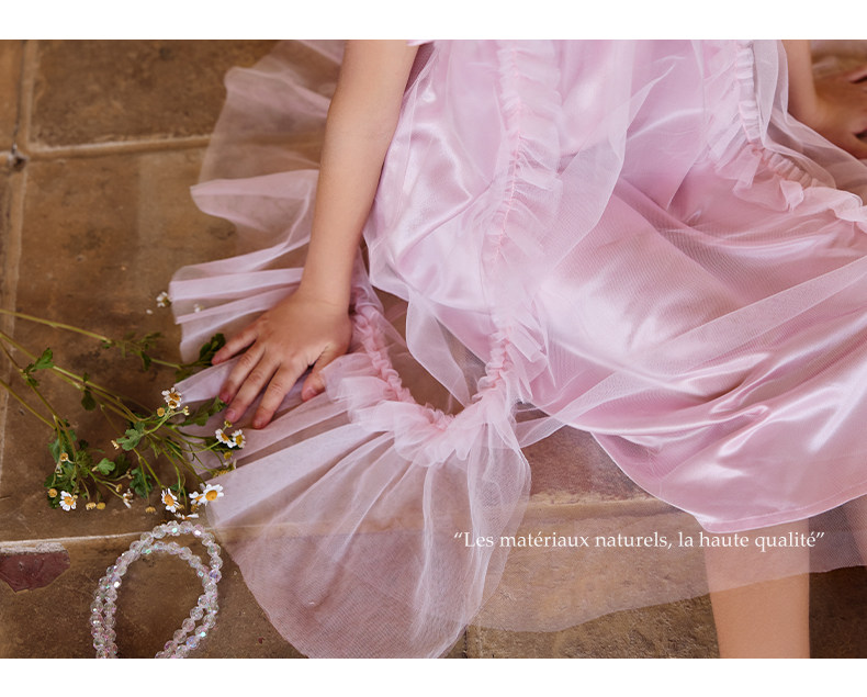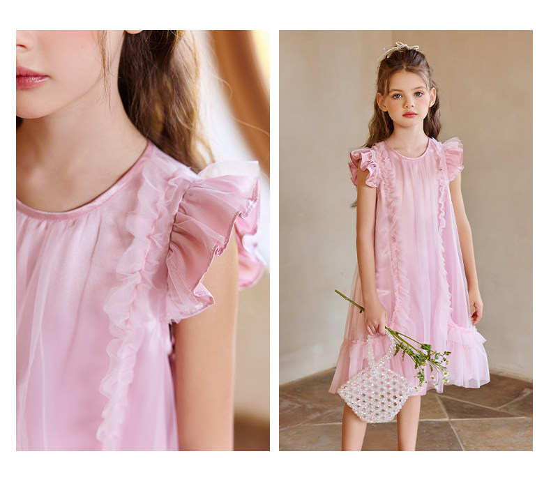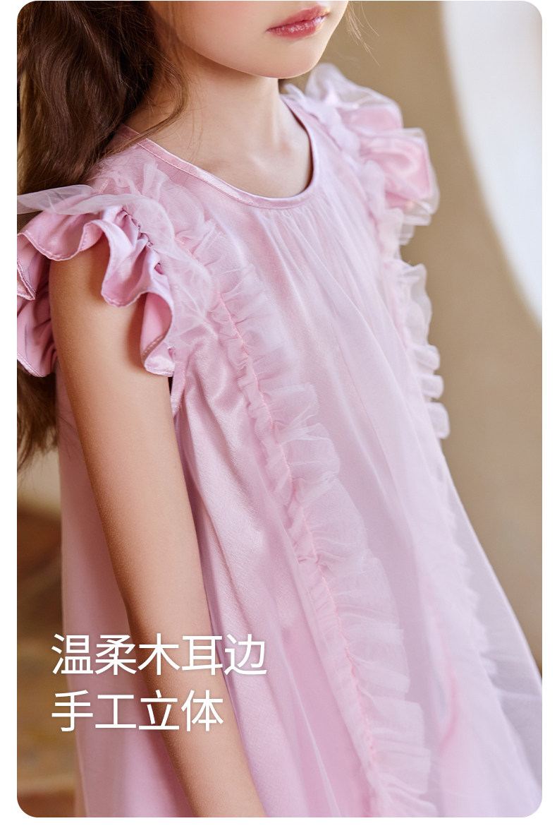 Little Naive兒童連衣裙夏季新款流光緞飛袖網紗裙女童甜美蛋糕裙