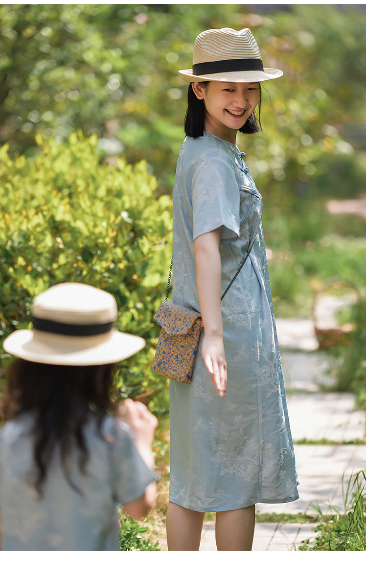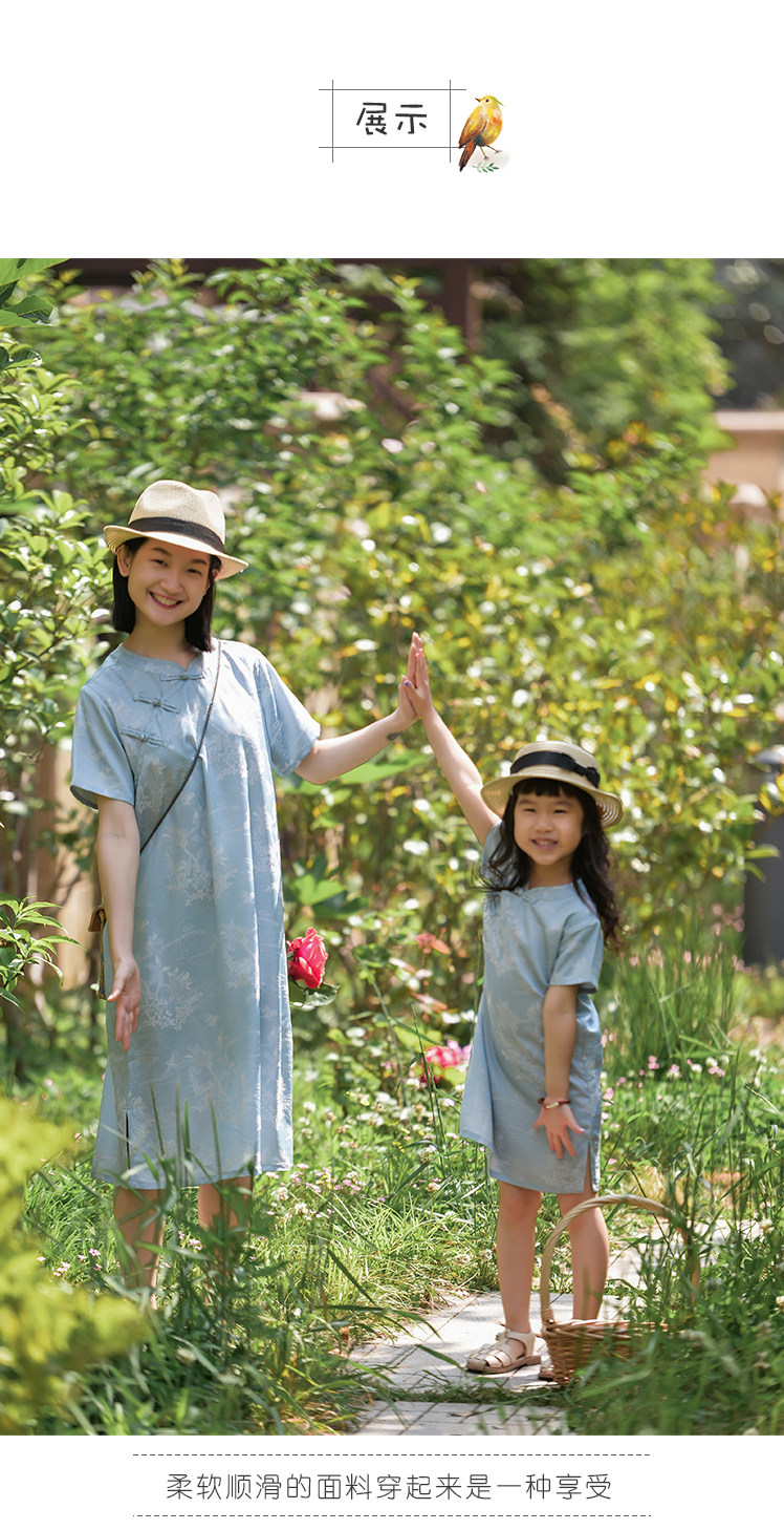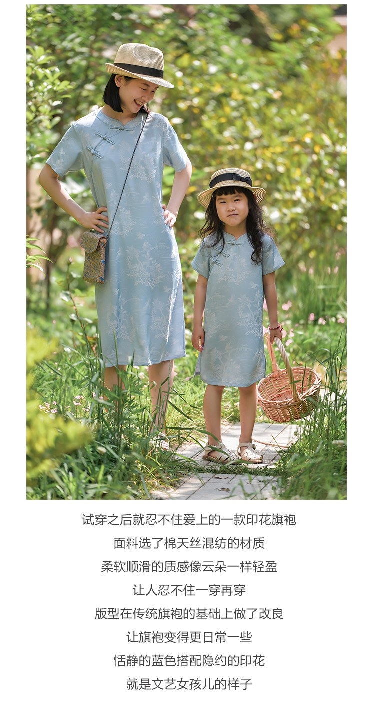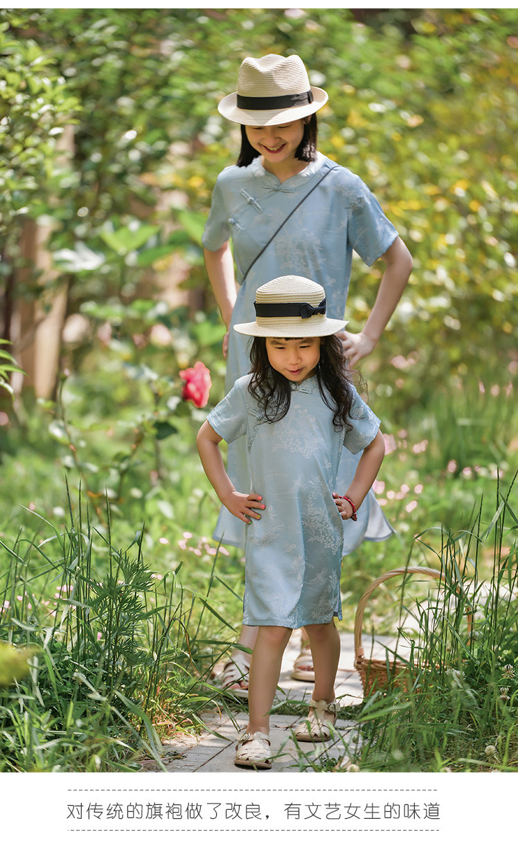 小樂往親子裝107課 夏柔軟天絲新中式女童清新文藝母女旗袍連衣裙