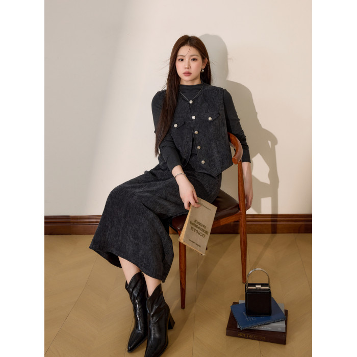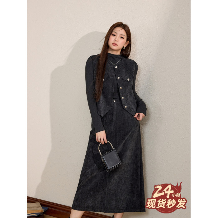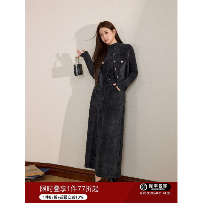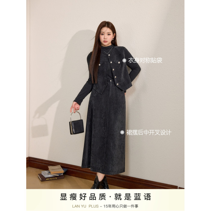 藍語大碼女裝胖mm高級馬甲修身顯瘦打底衫秋季遮肚子半身裙三件套