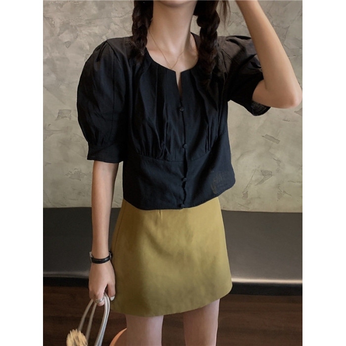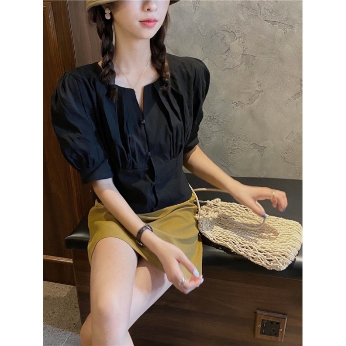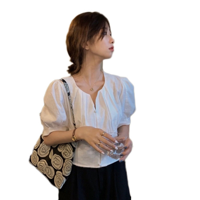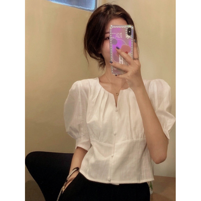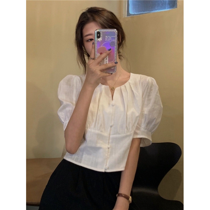 女裝夏裝韓版泡泡短袖上衣女夏高級感收腰短款露鎖骨v領白色襯衫