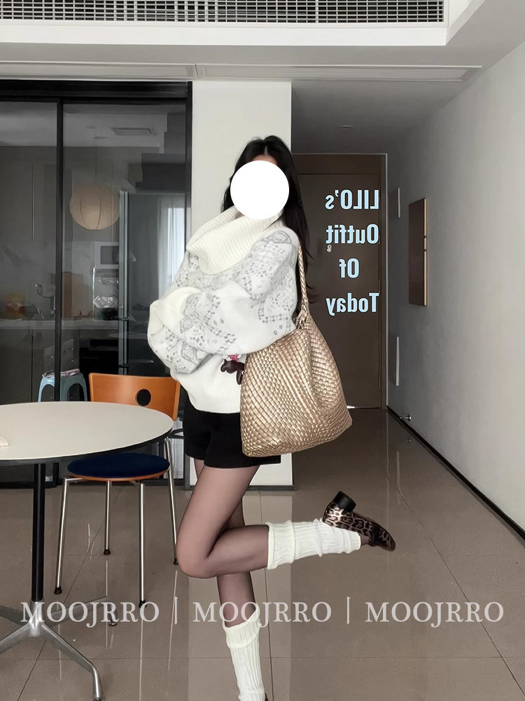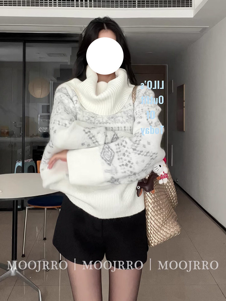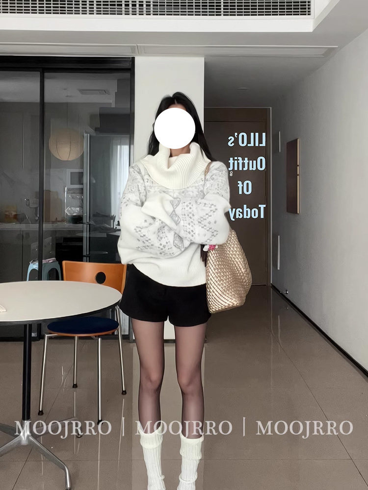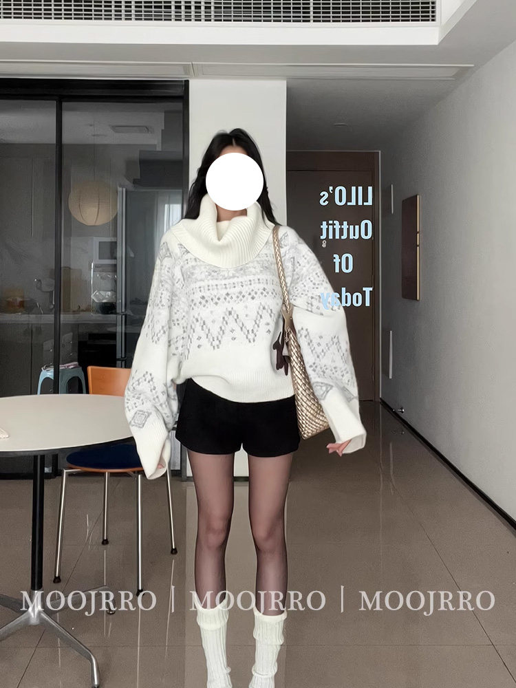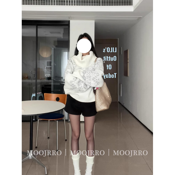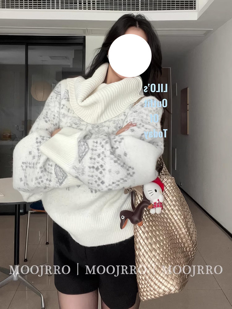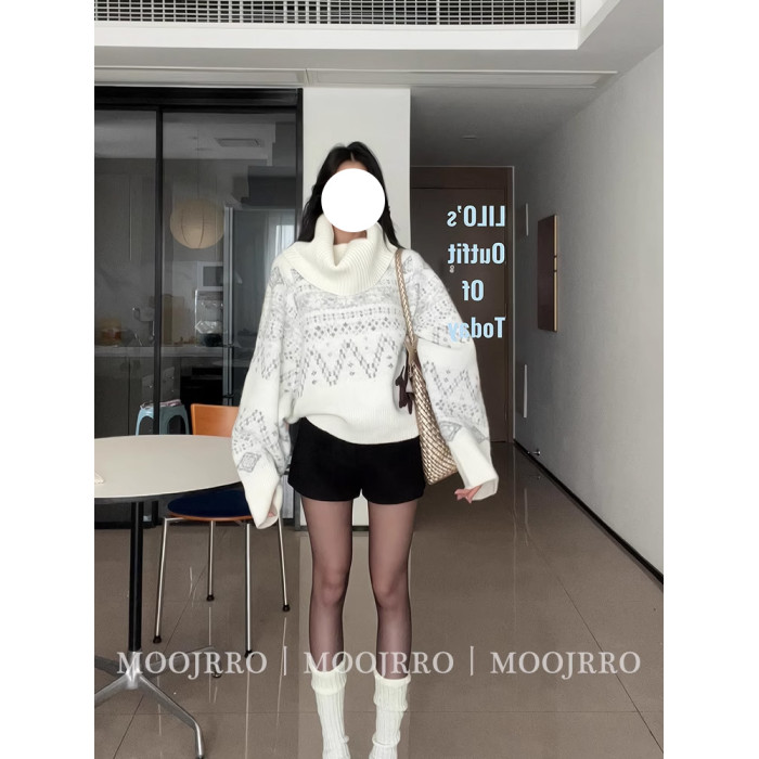 費爾島白色高領堆堆領毛衣女早秋季寬松慵懶風加厚內搭套頭針織衫