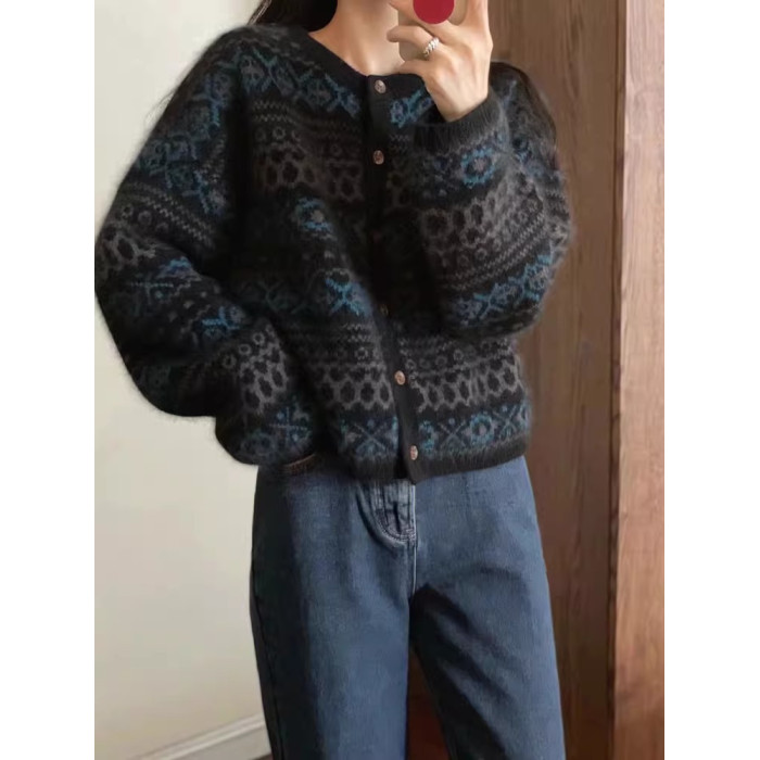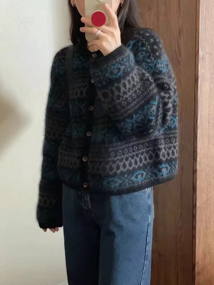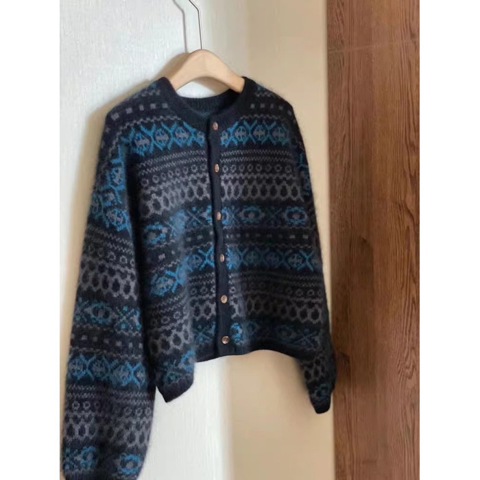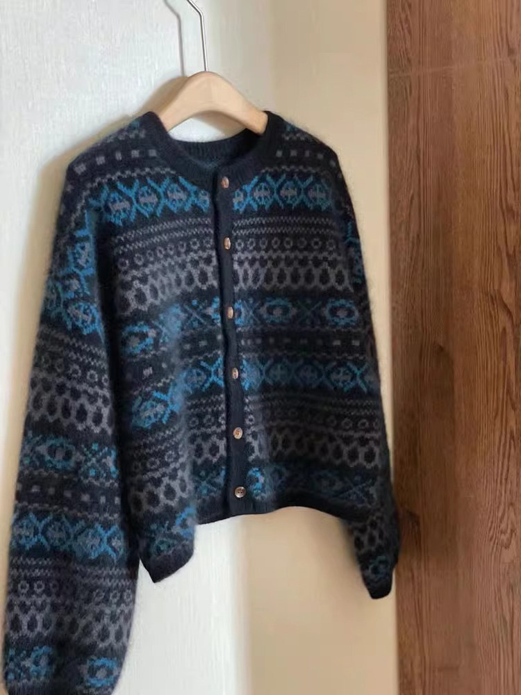 復古提花費爾島毛衣外套女秋冬設計感針織開衫小個子寬松短款上衣