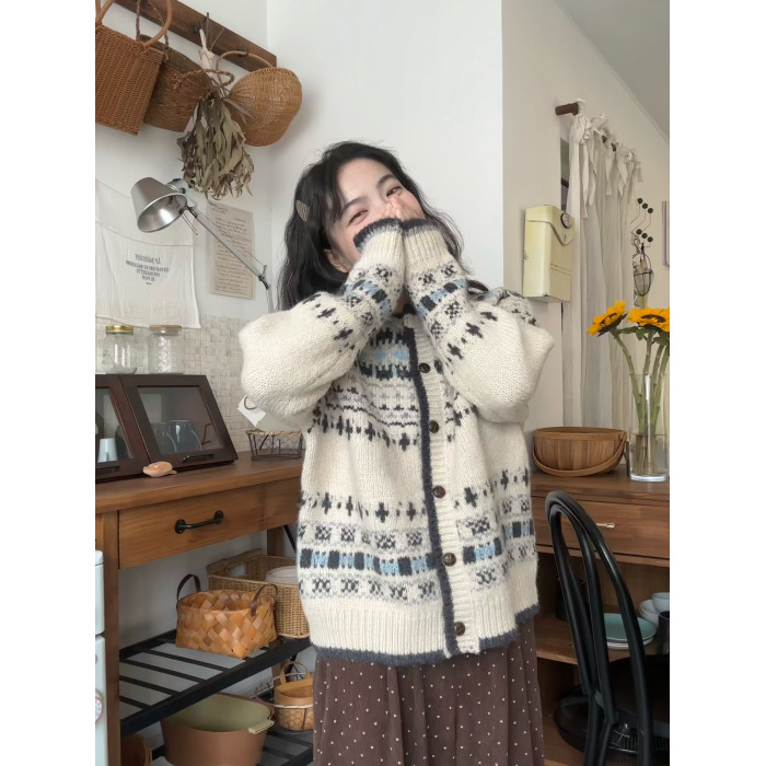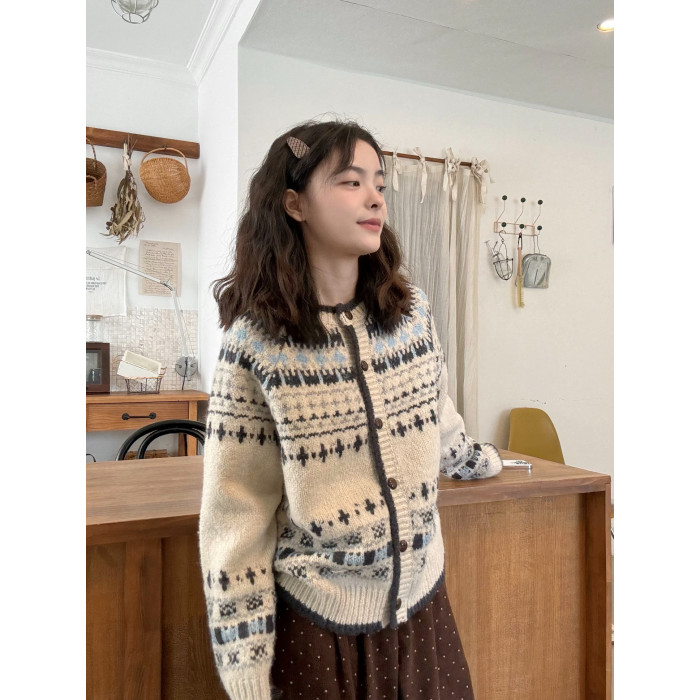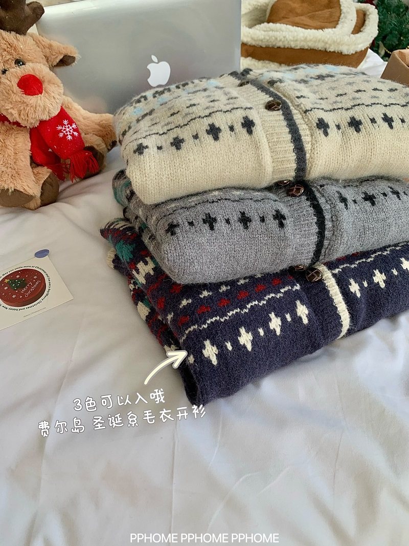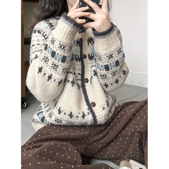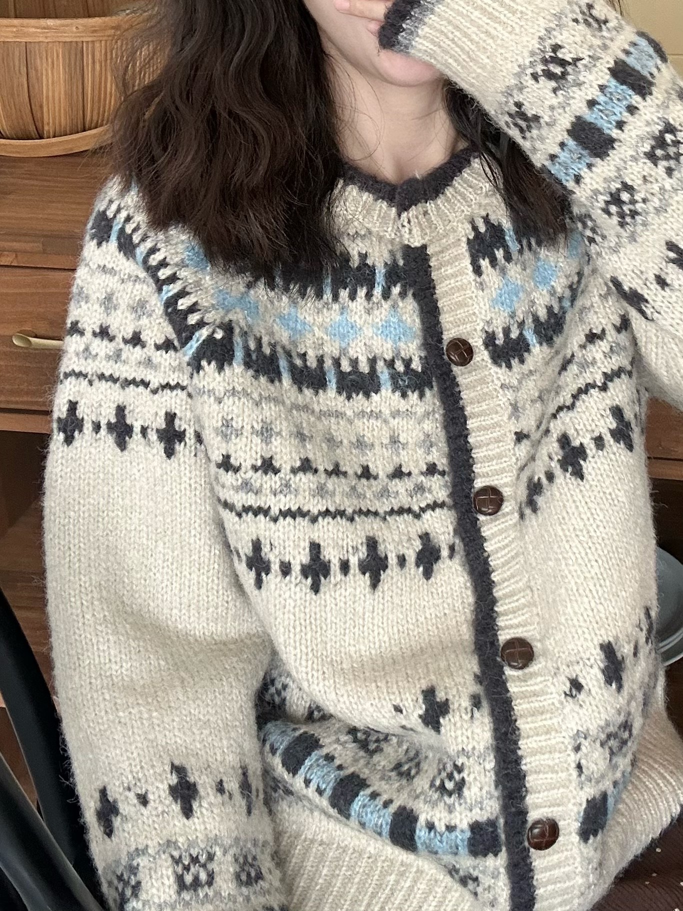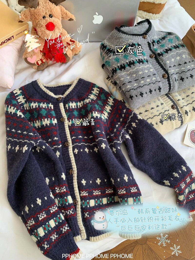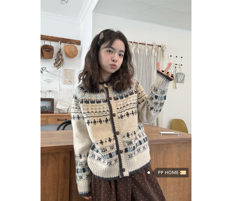 PPHOME復古提花圓領針織開衫女秋冬加厚單排釦寬松費爾島毛衣外套