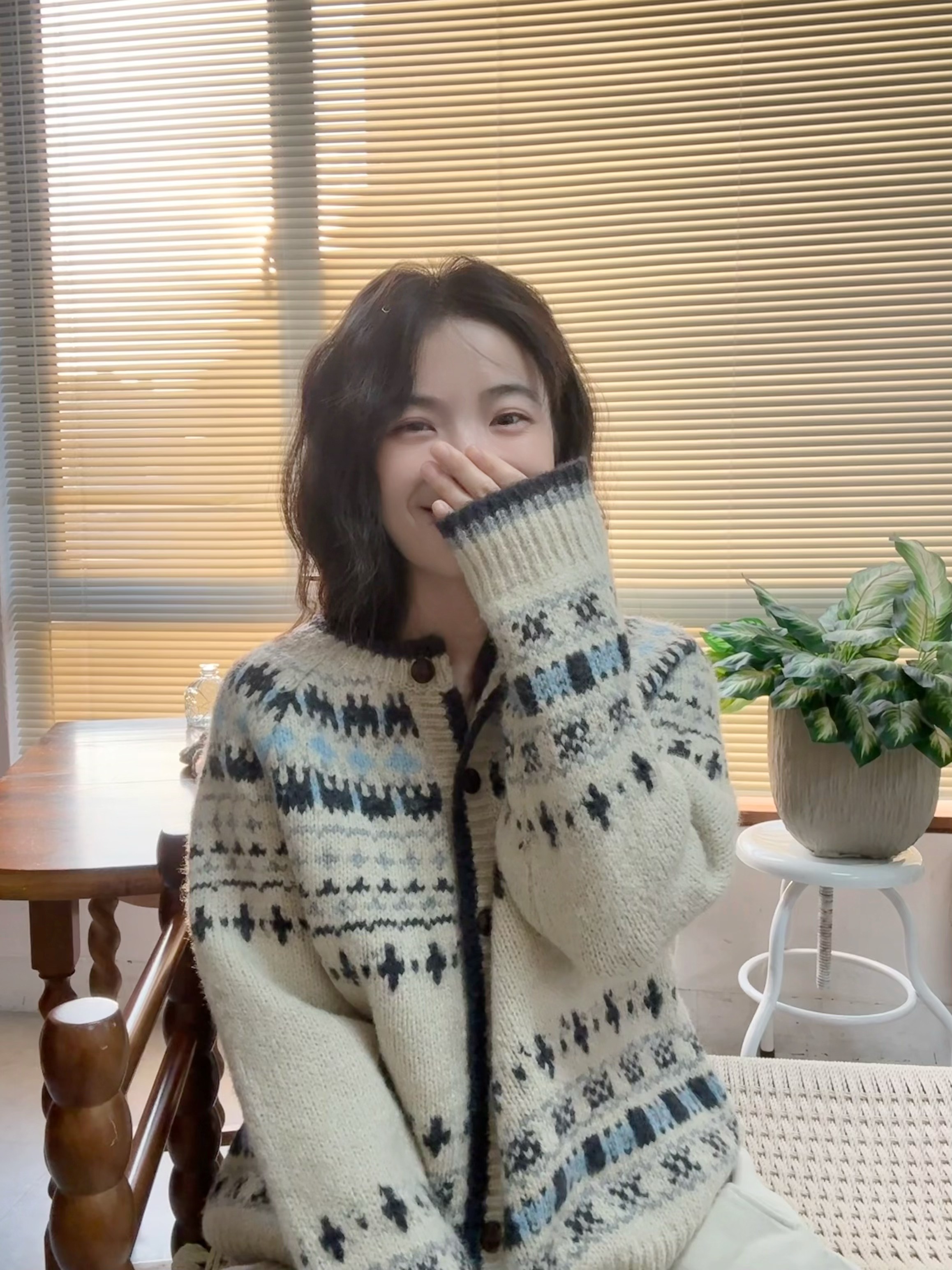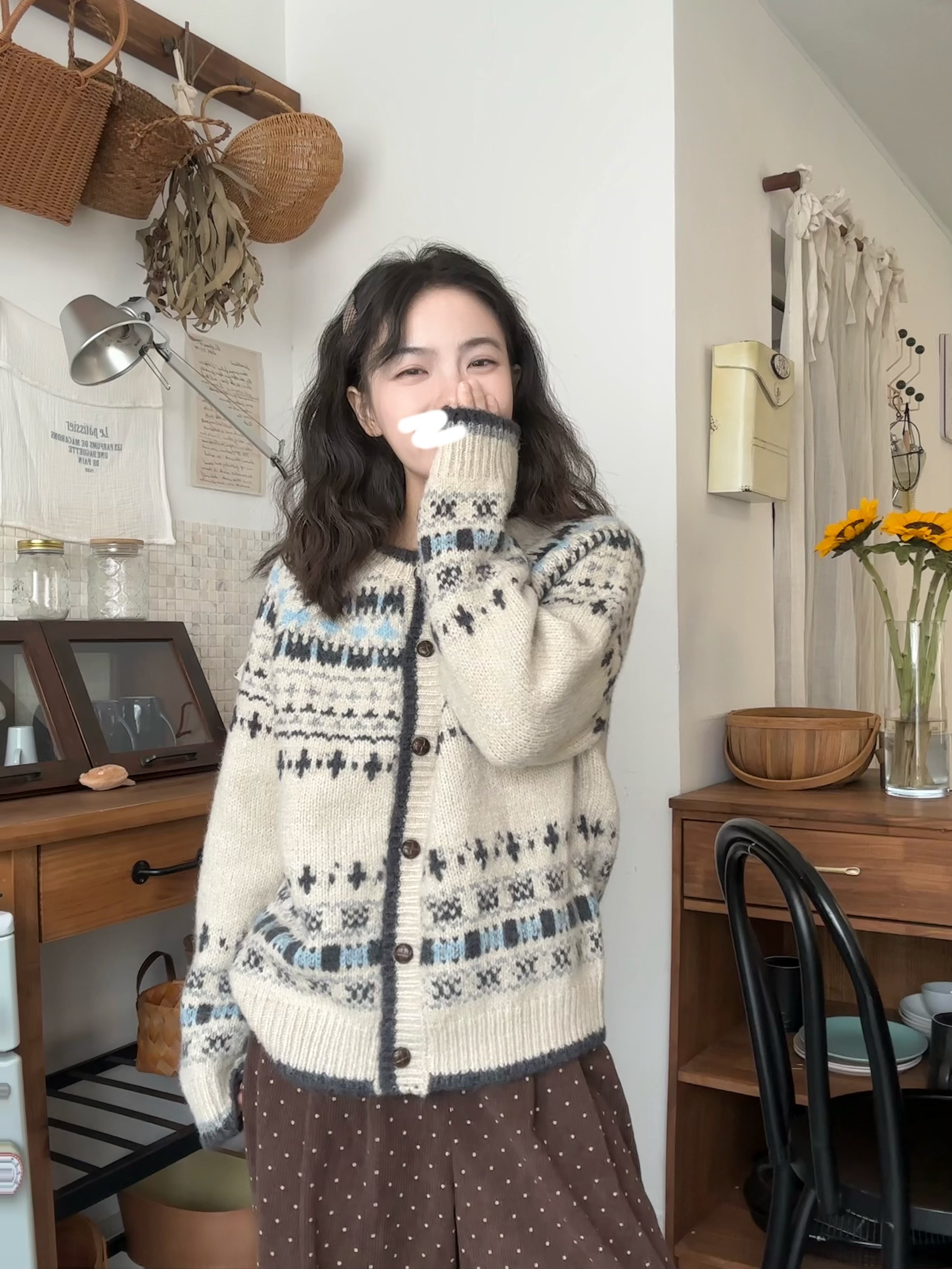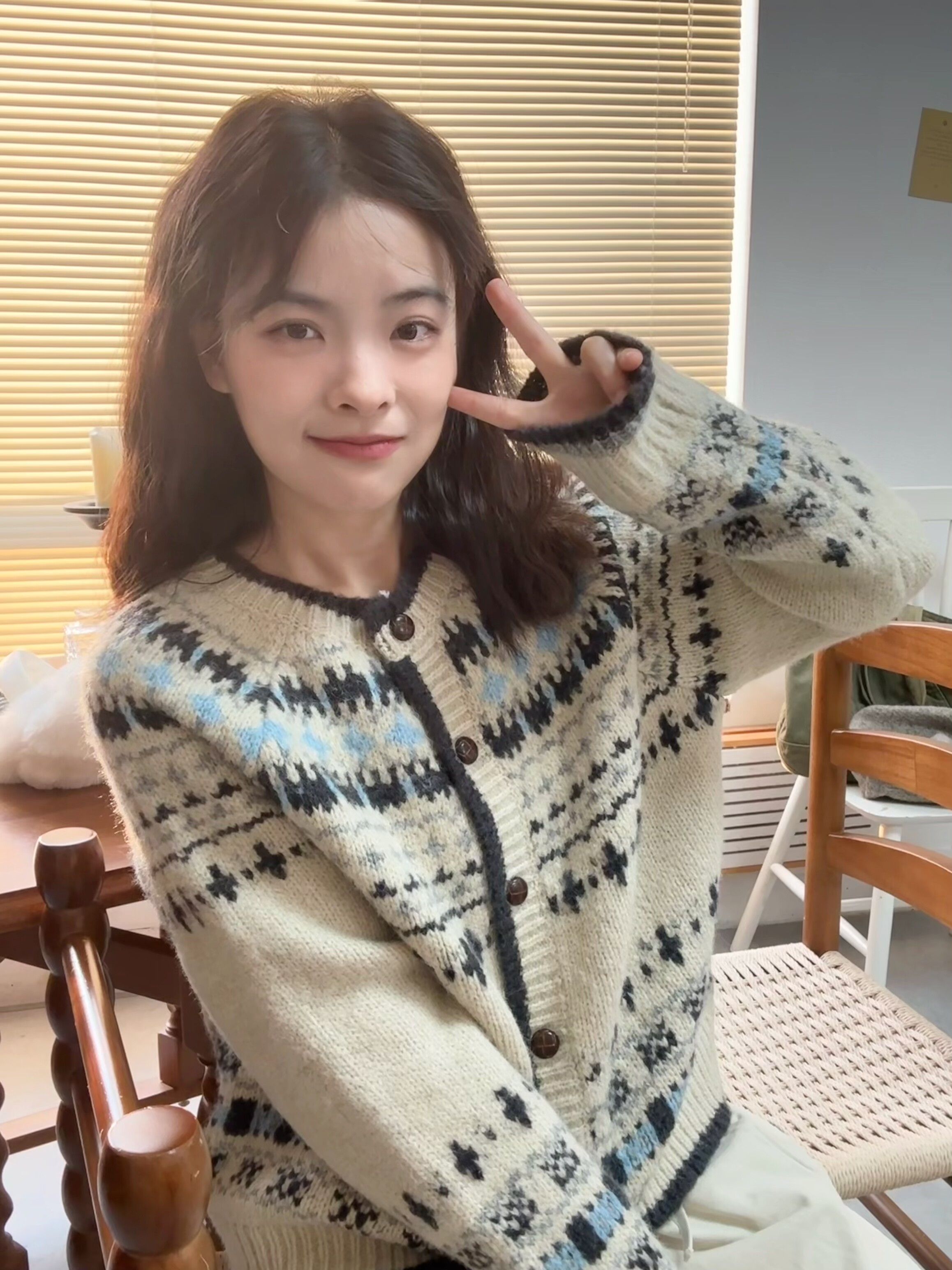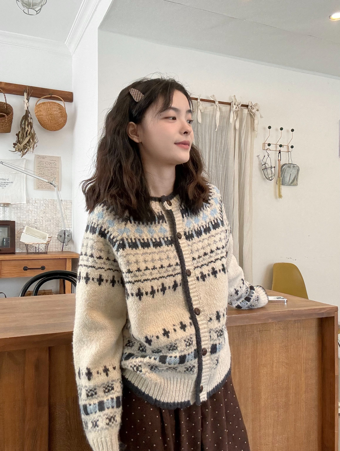 PPHOME復古提花圓領針織開衫女秋冬加厚單排釦寬松費爾島毛衣外套