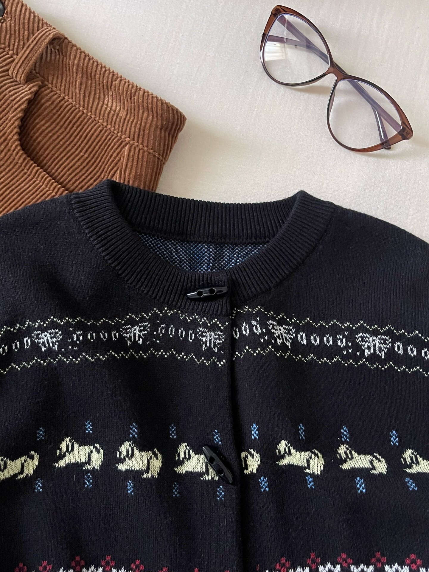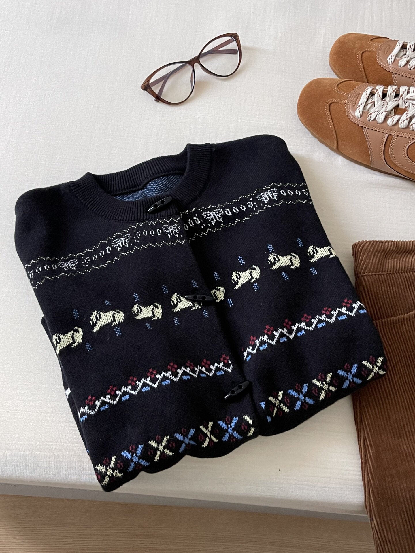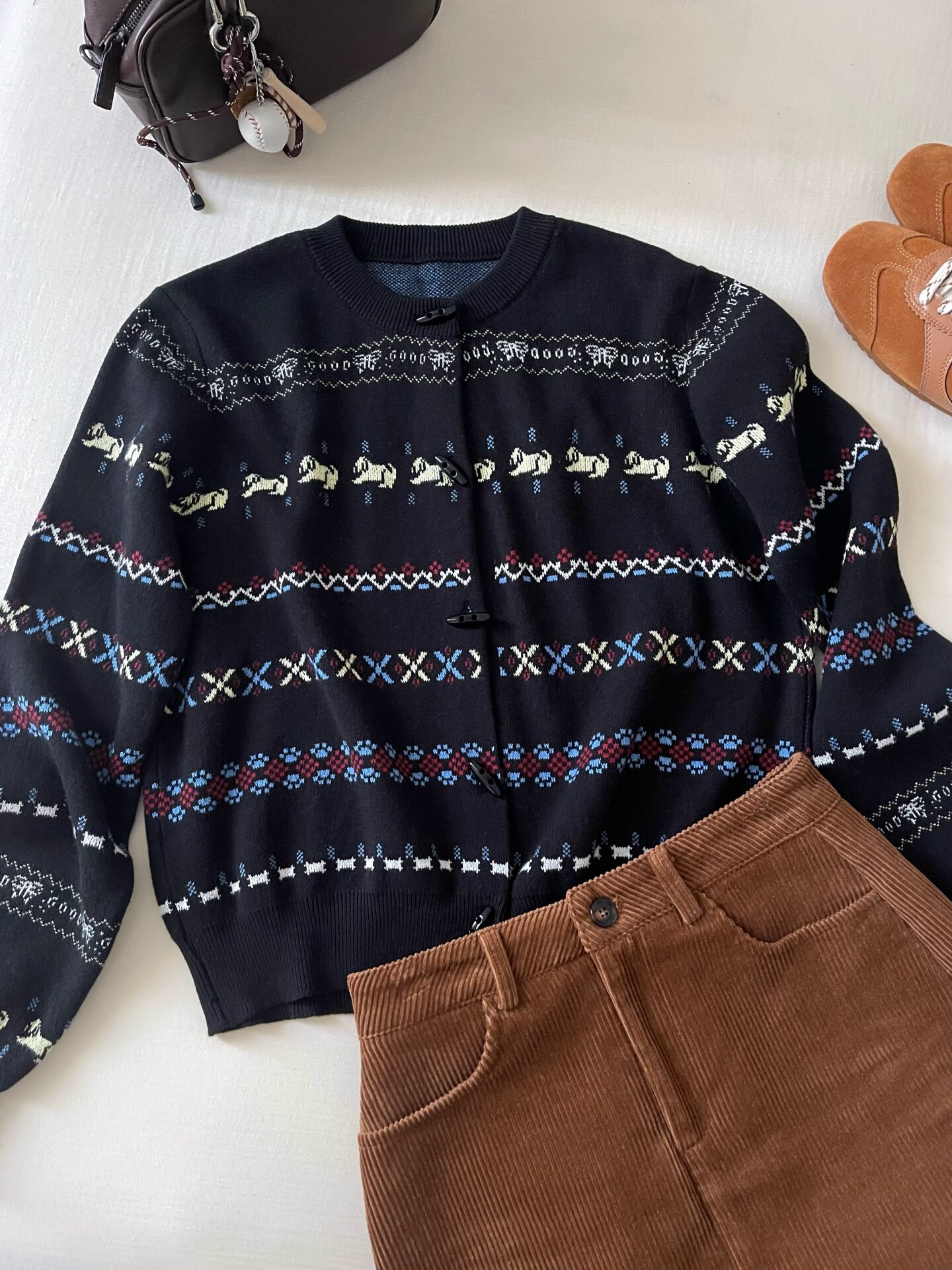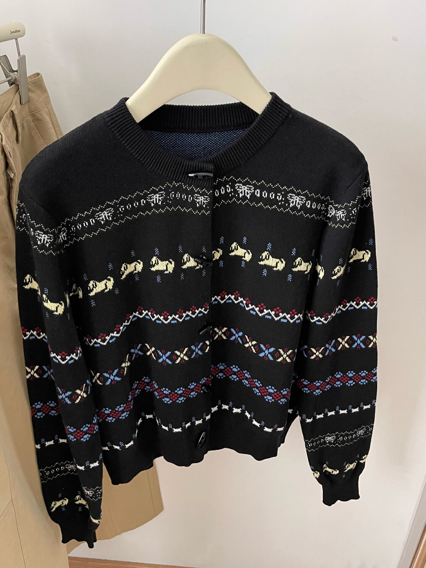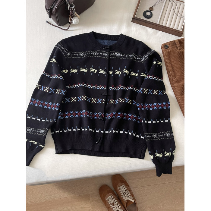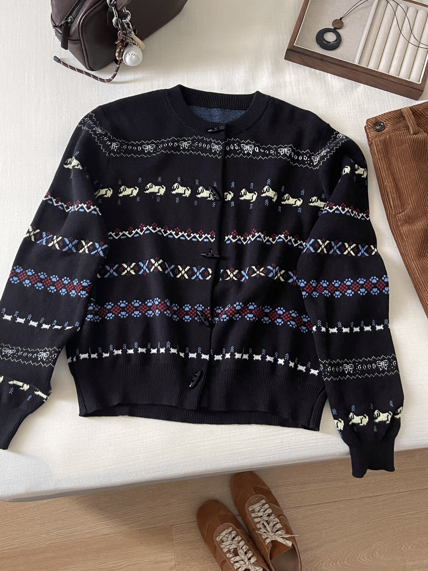 古著感~北歐復古可愛蝴蝶小狗提花費爾島毛衣外套牛角釦針織開衫