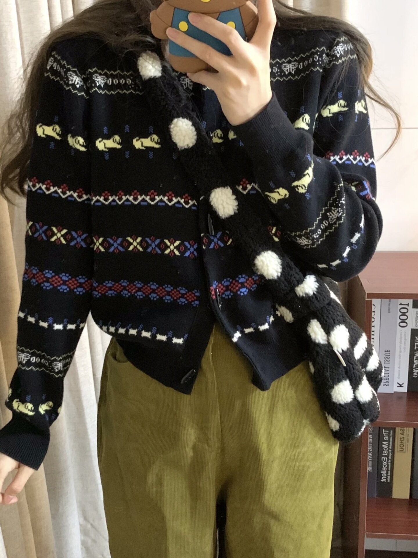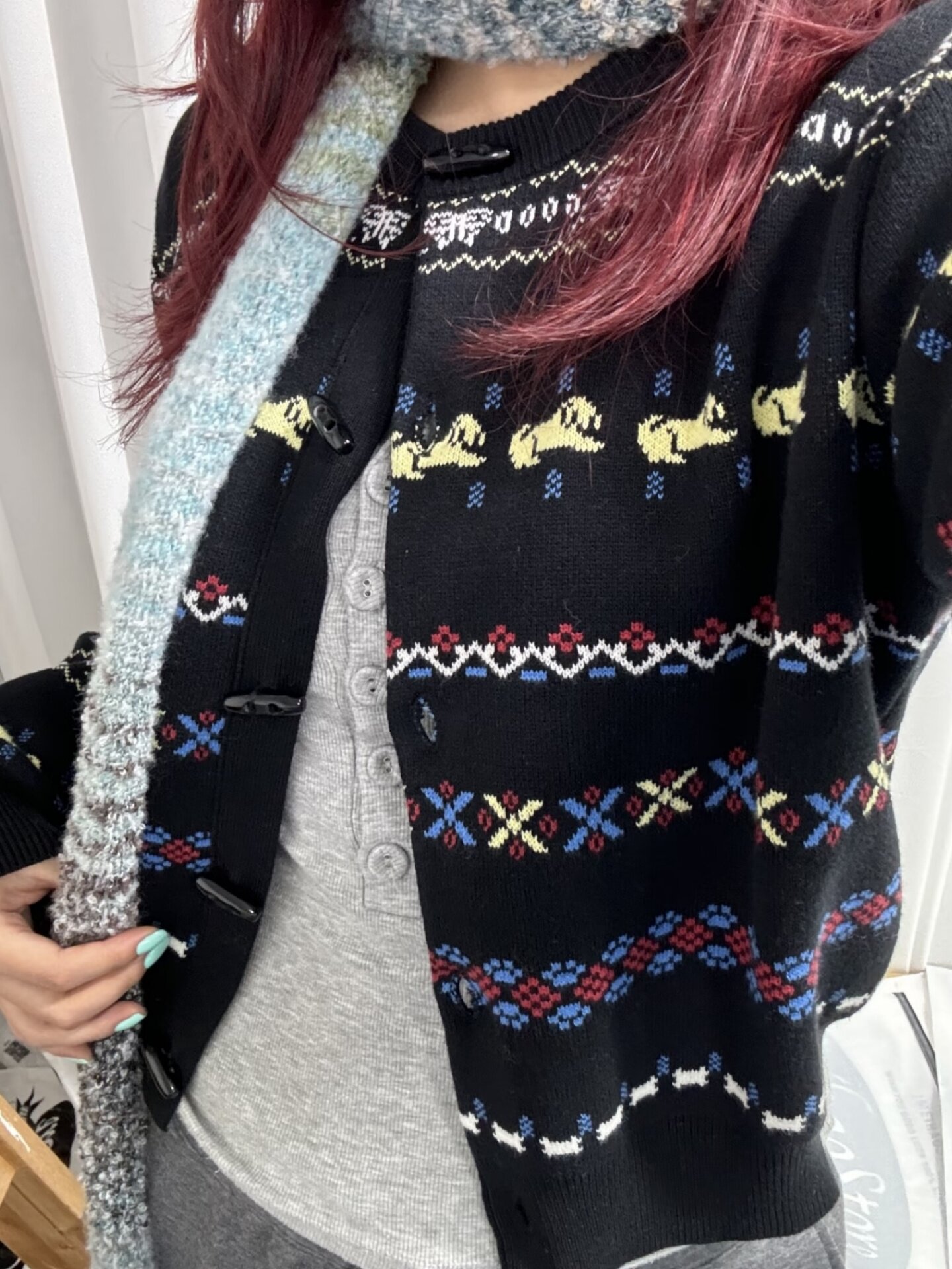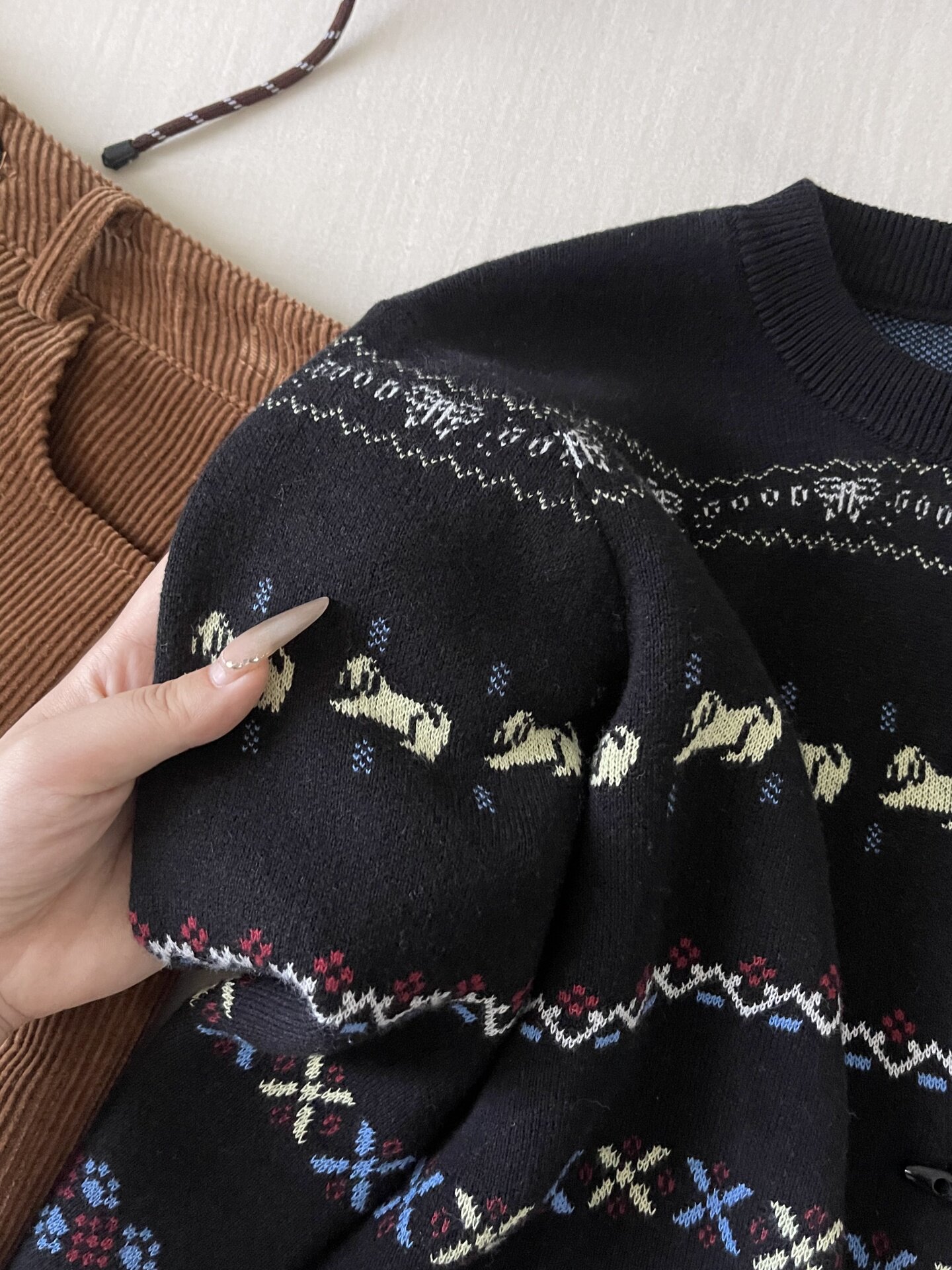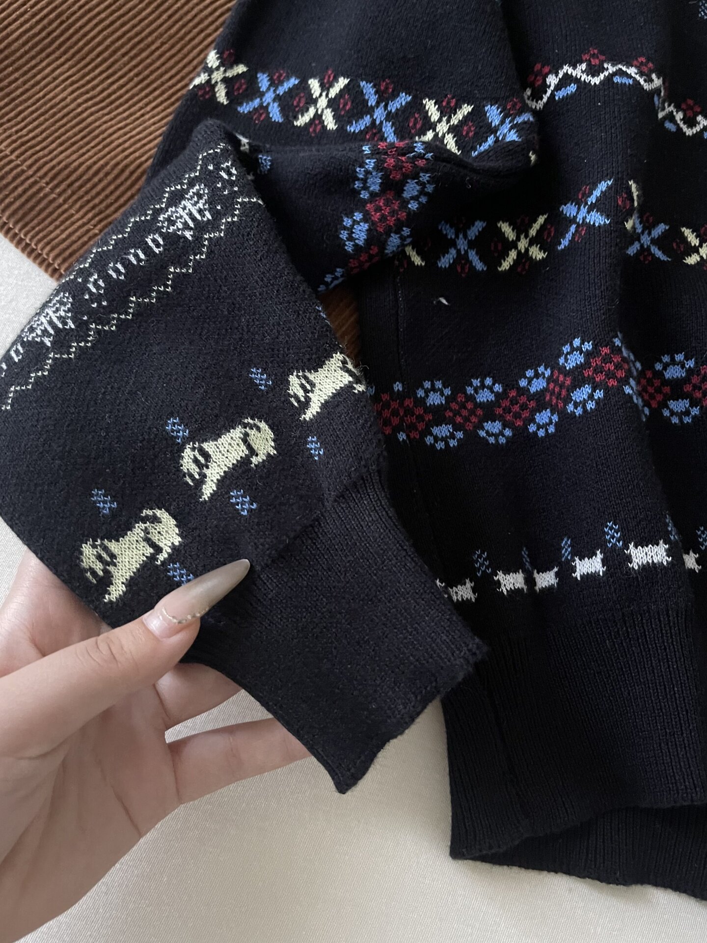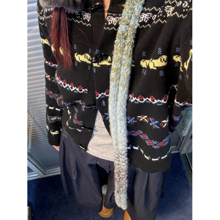 古著感~北歐復古可愛蝴蝶小狗提花費爾島毛衣外套牛角釦針織開衫