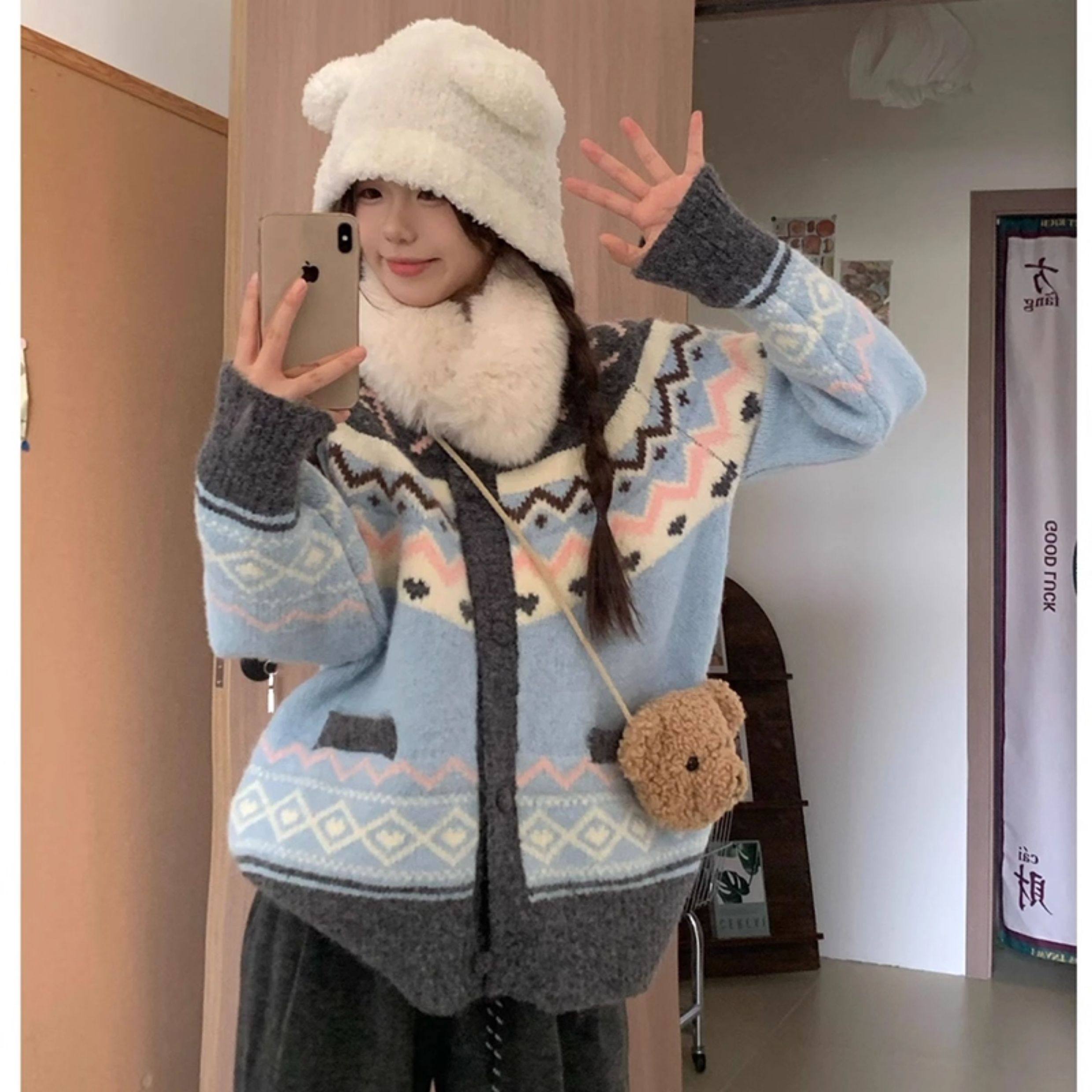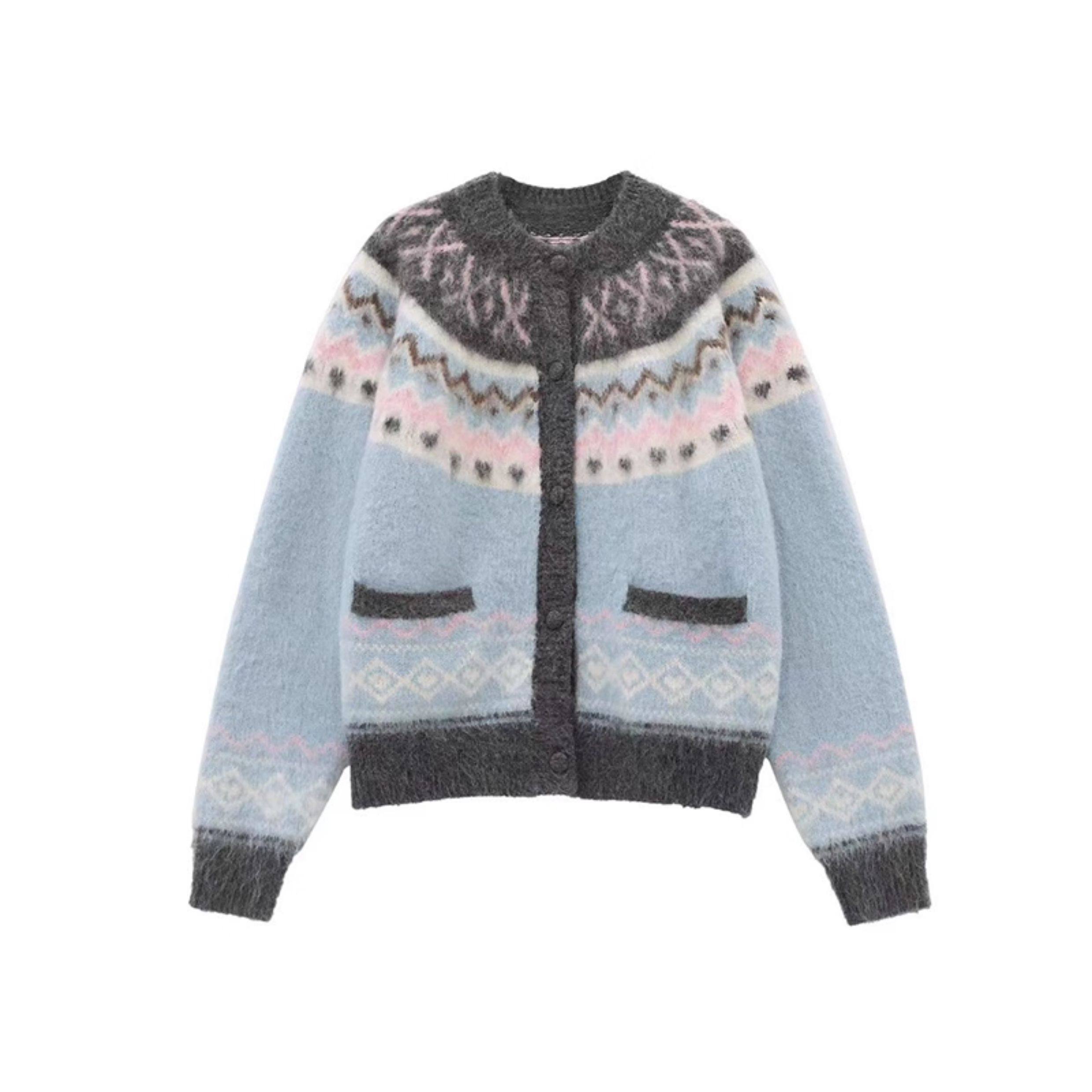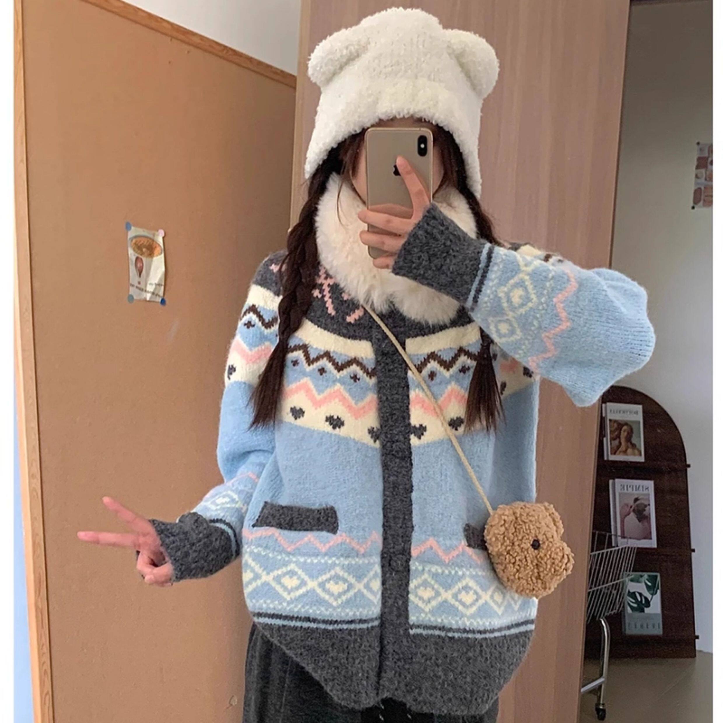 復古北歐風費爾島毛衣開衫女秋冬季加厚慵懶風小個子針織外套上衣