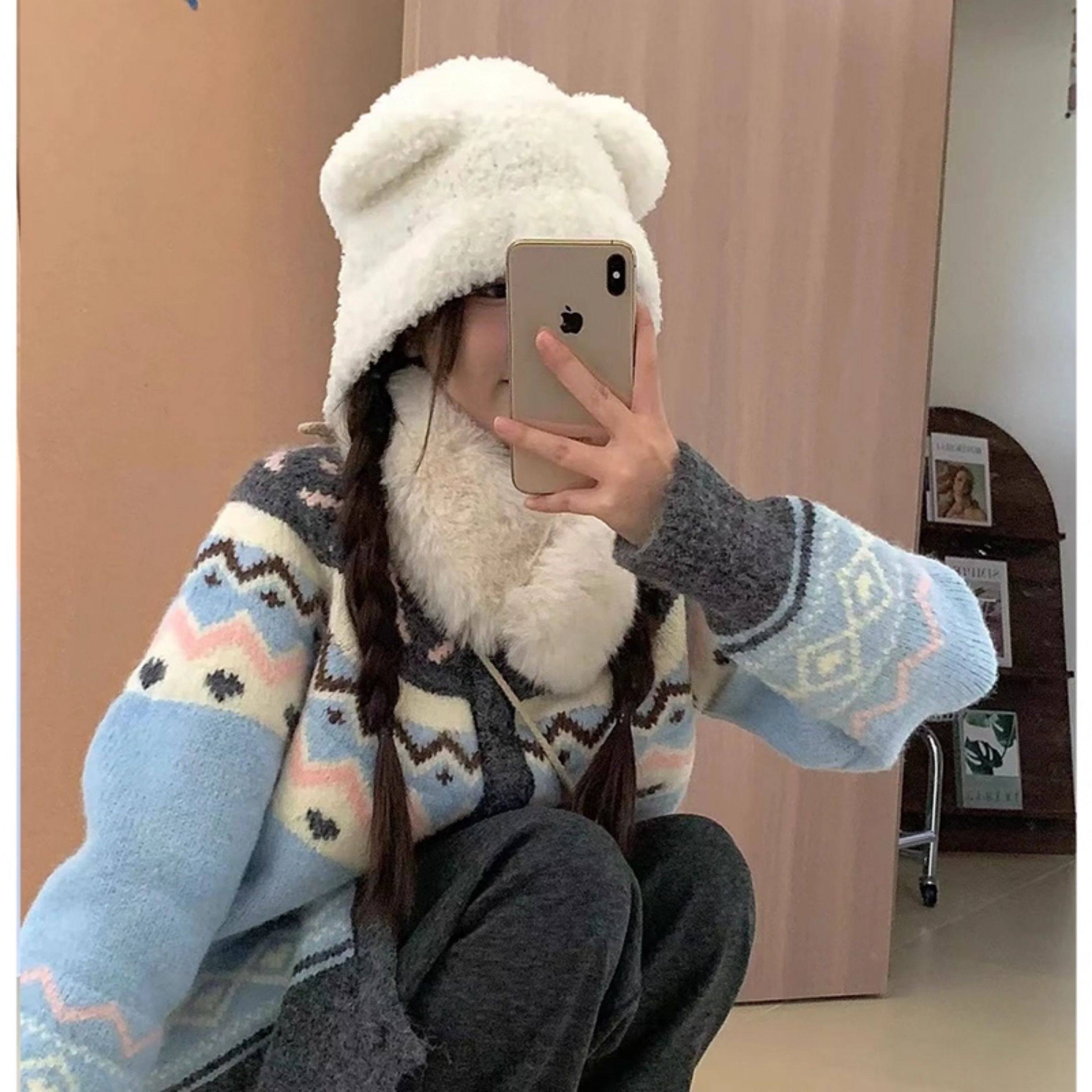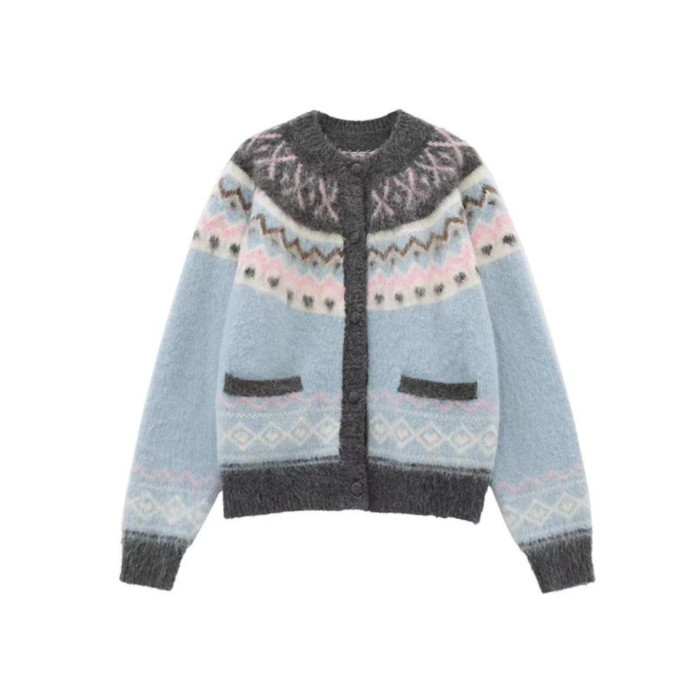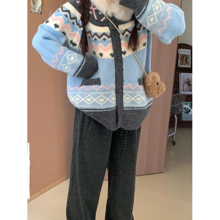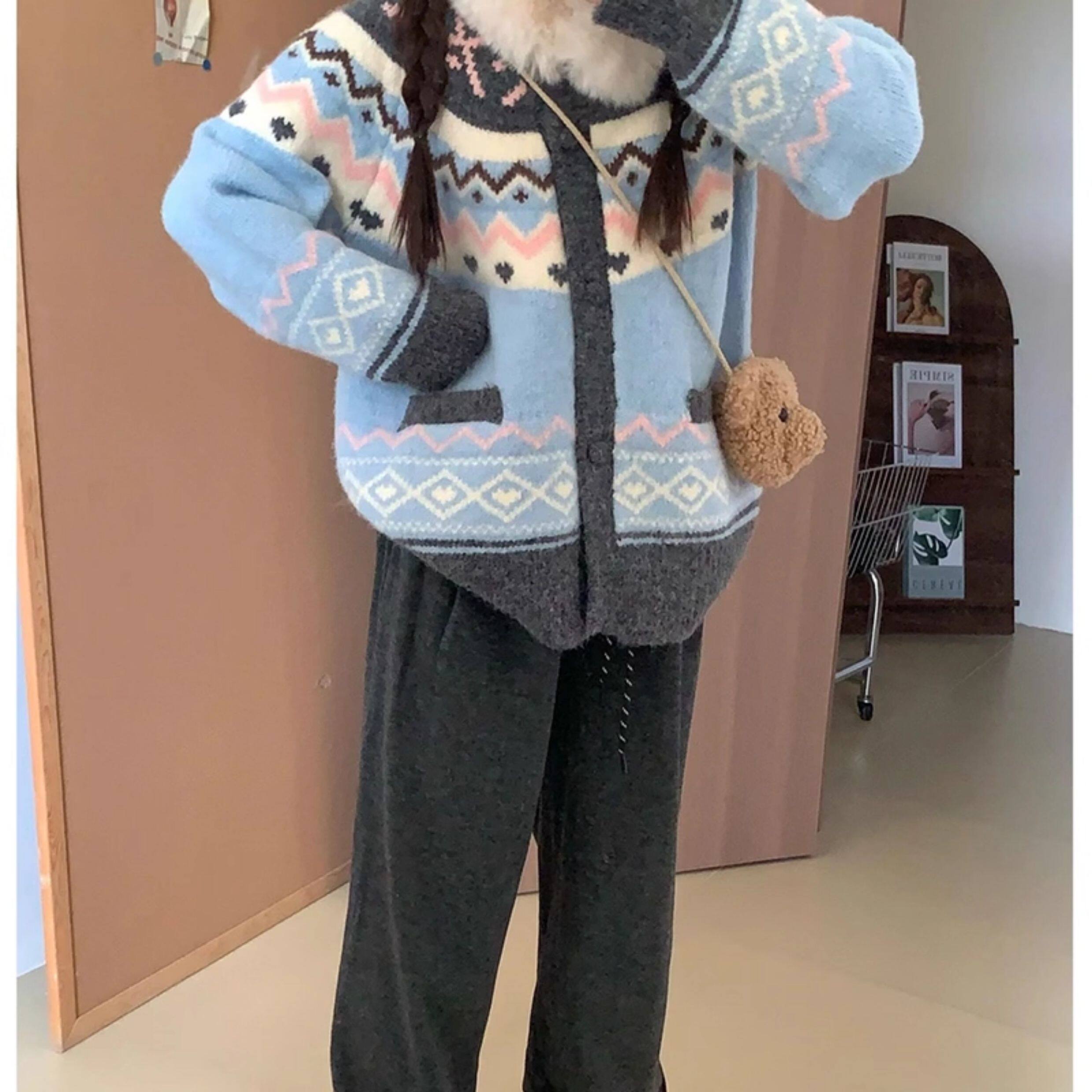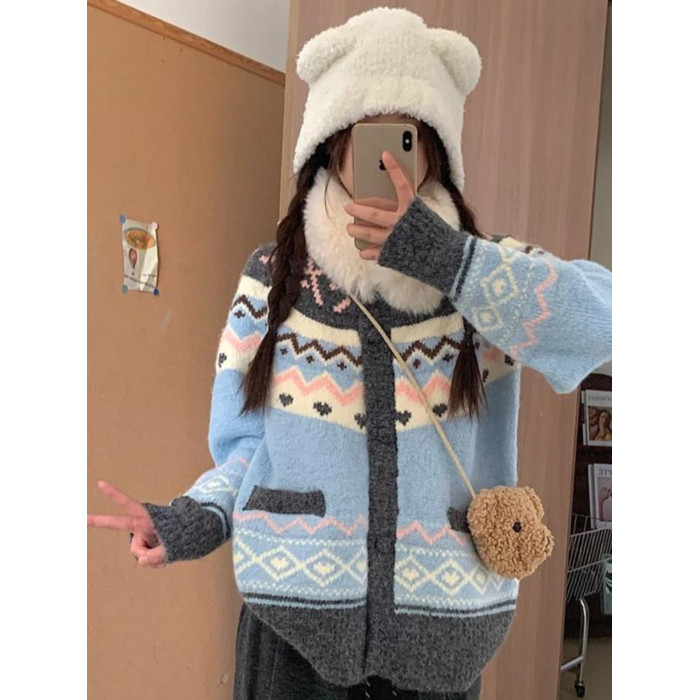 復古北歐風費爾島毛衣開衫女秋冬季加厚慵懶風小個子針織外套上衣