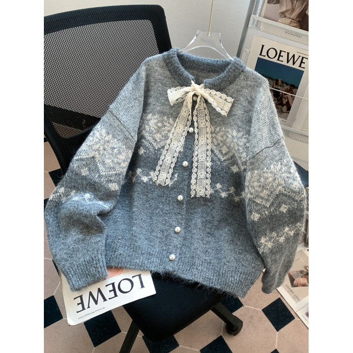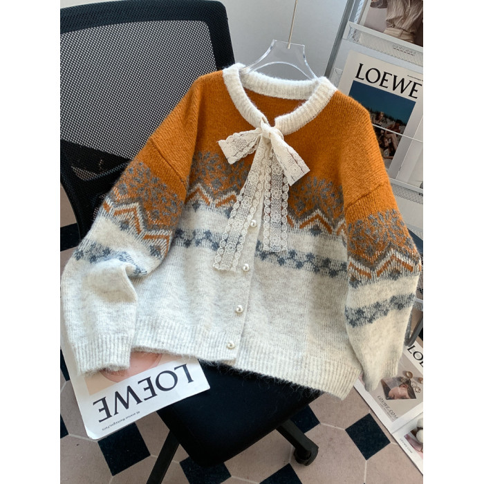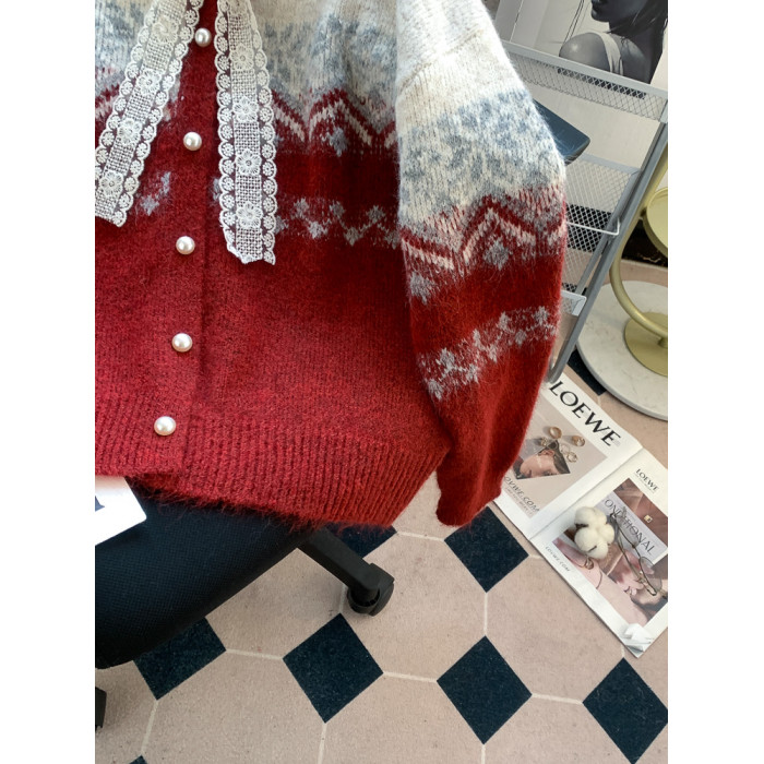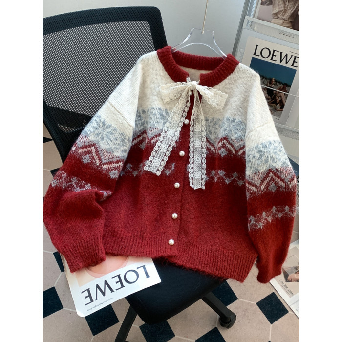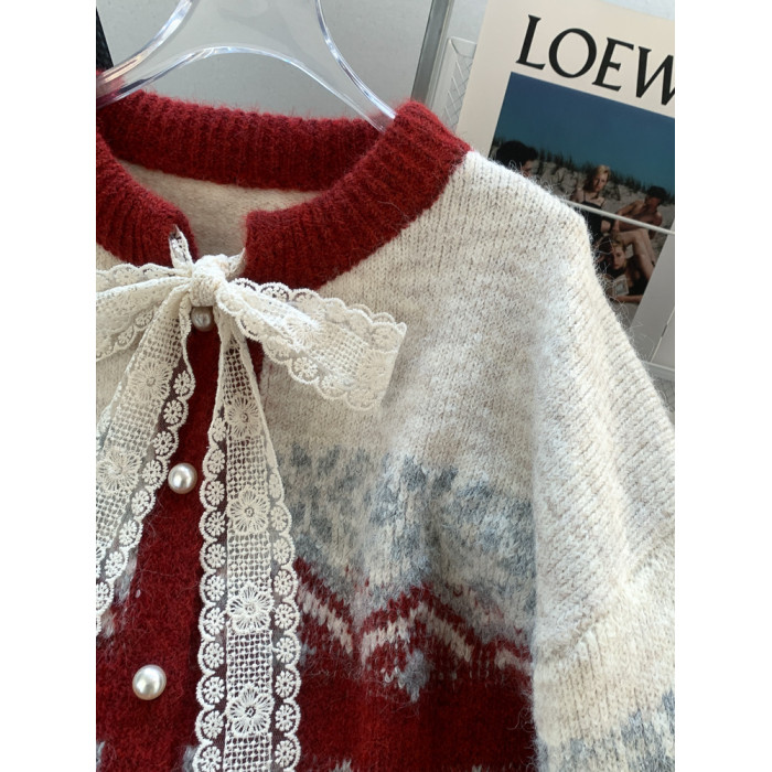 費爾島紅色聖誕新年氛圍感穿搭毛衣外套女蝴蝶結針織開衫過年衣服