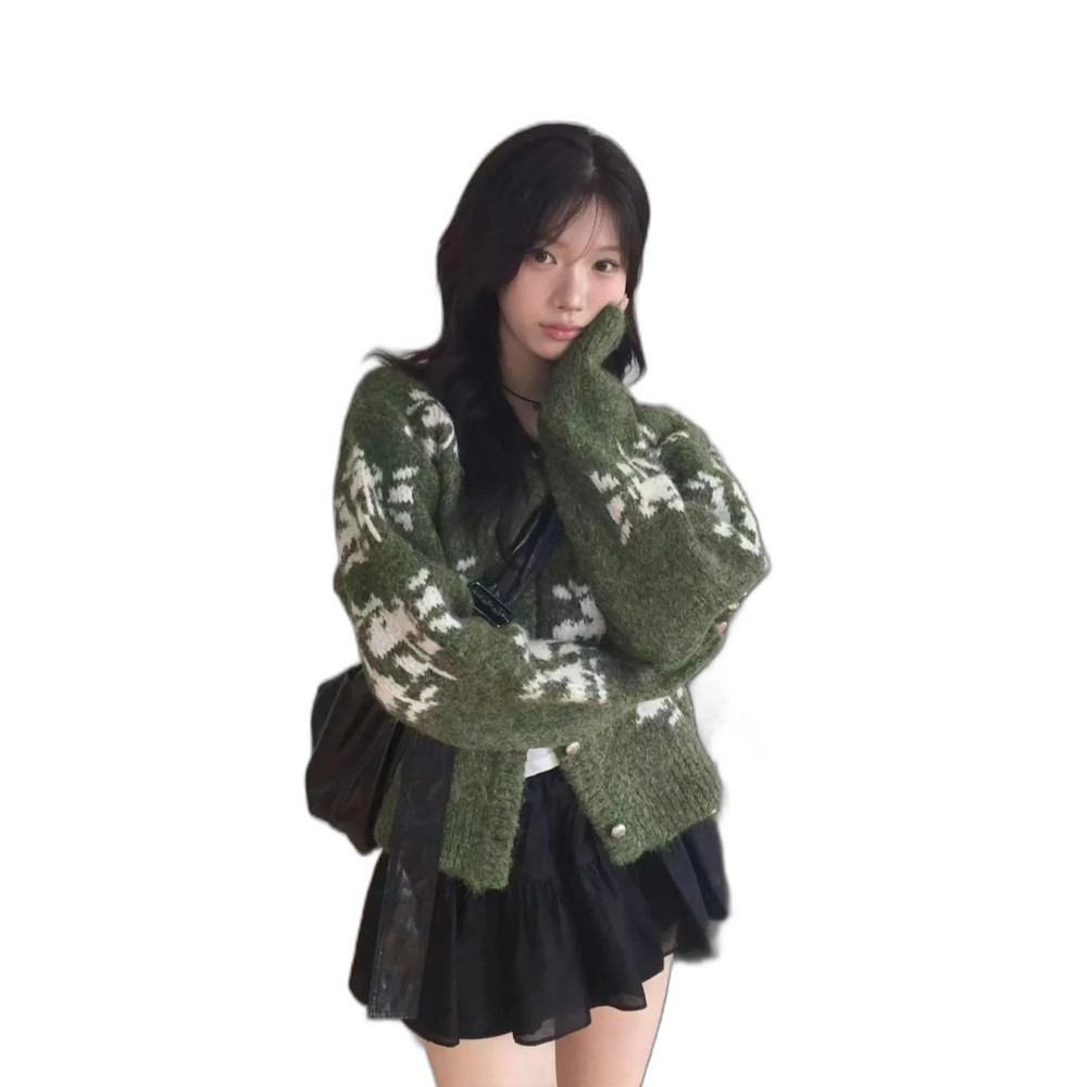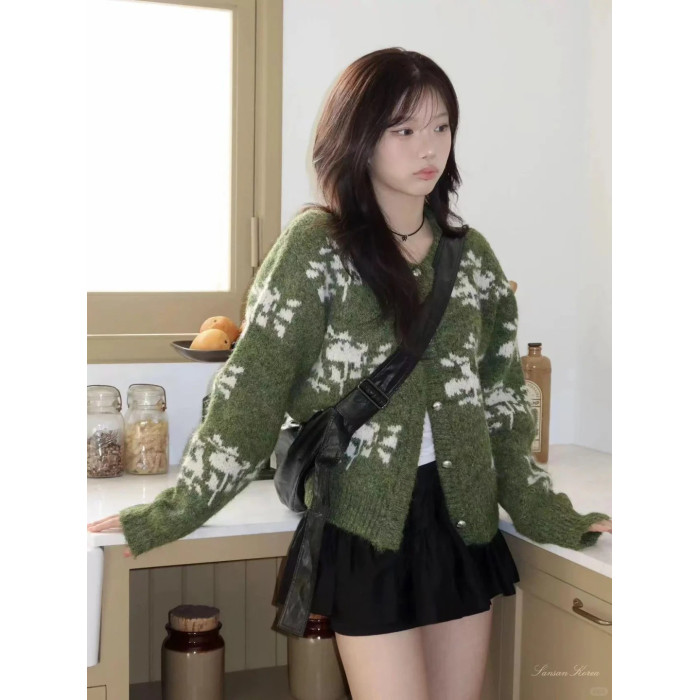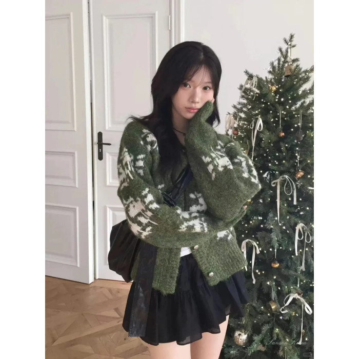 韓系減齡費爾島提花雪花羊毛綠色毛衣外套女秋冬聖誕重工針織開衫