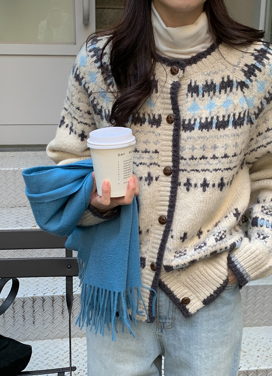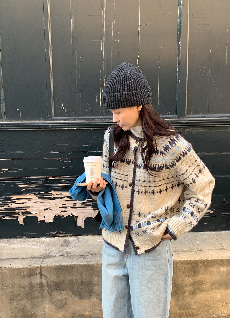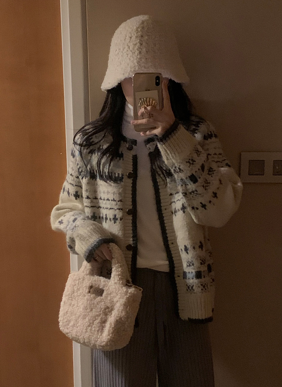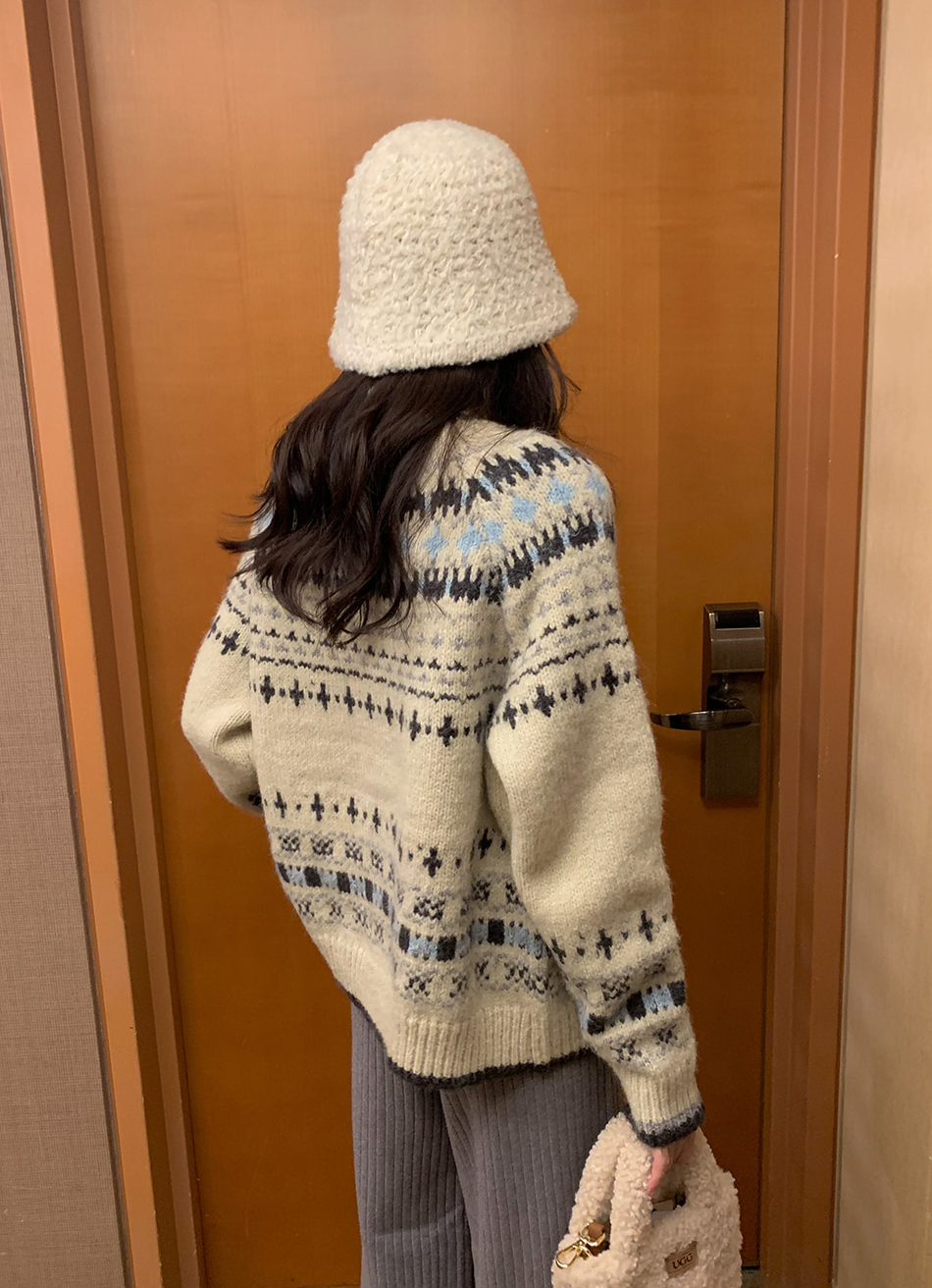 高級感復古提花圓領針織開衫女秋冬加厚單排釦寬松費爾島毛衣外套