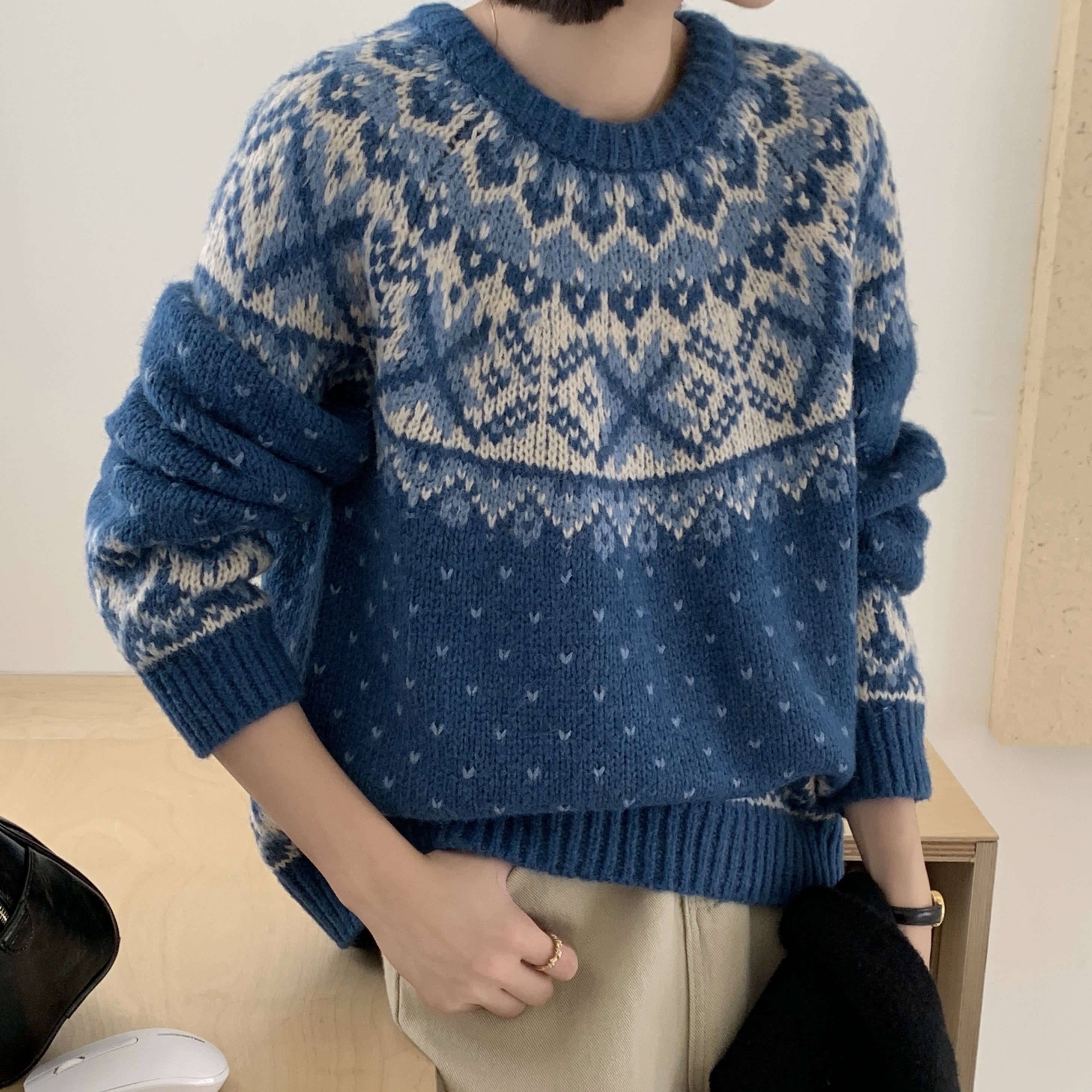 冰島藍色!費爾島提花超顯白復古著毛衣寬松外穿聖誕撞色慵懶上衣