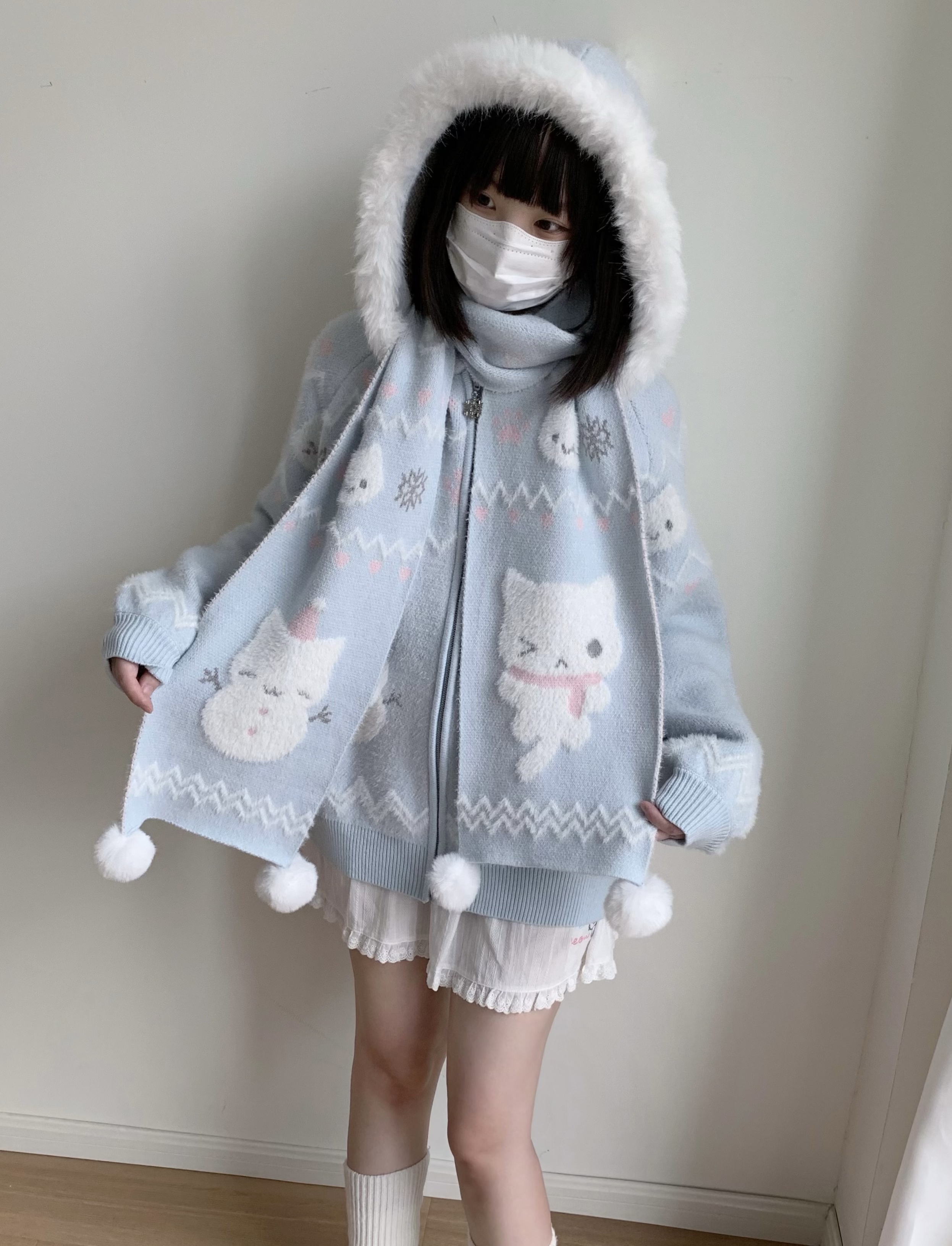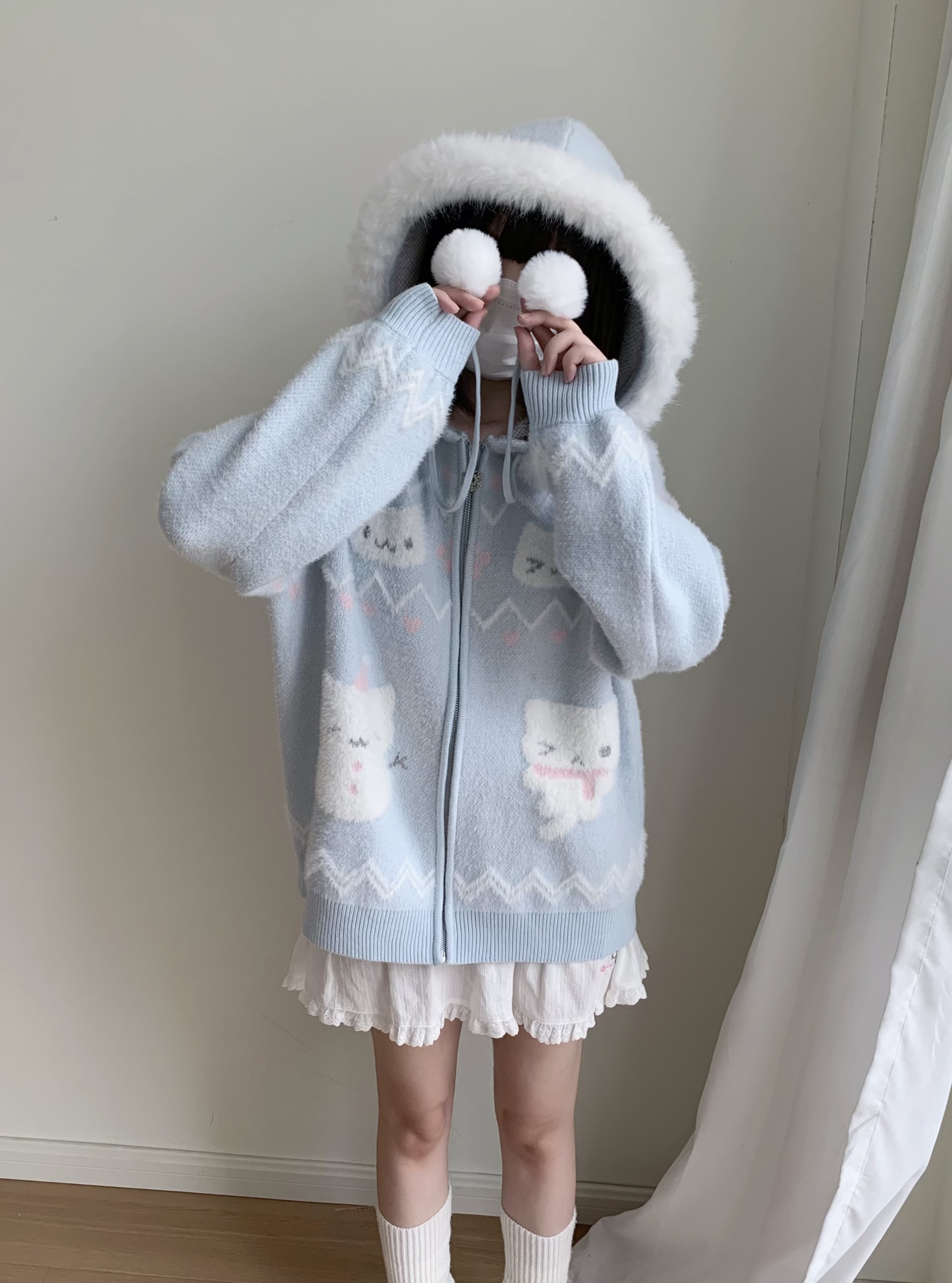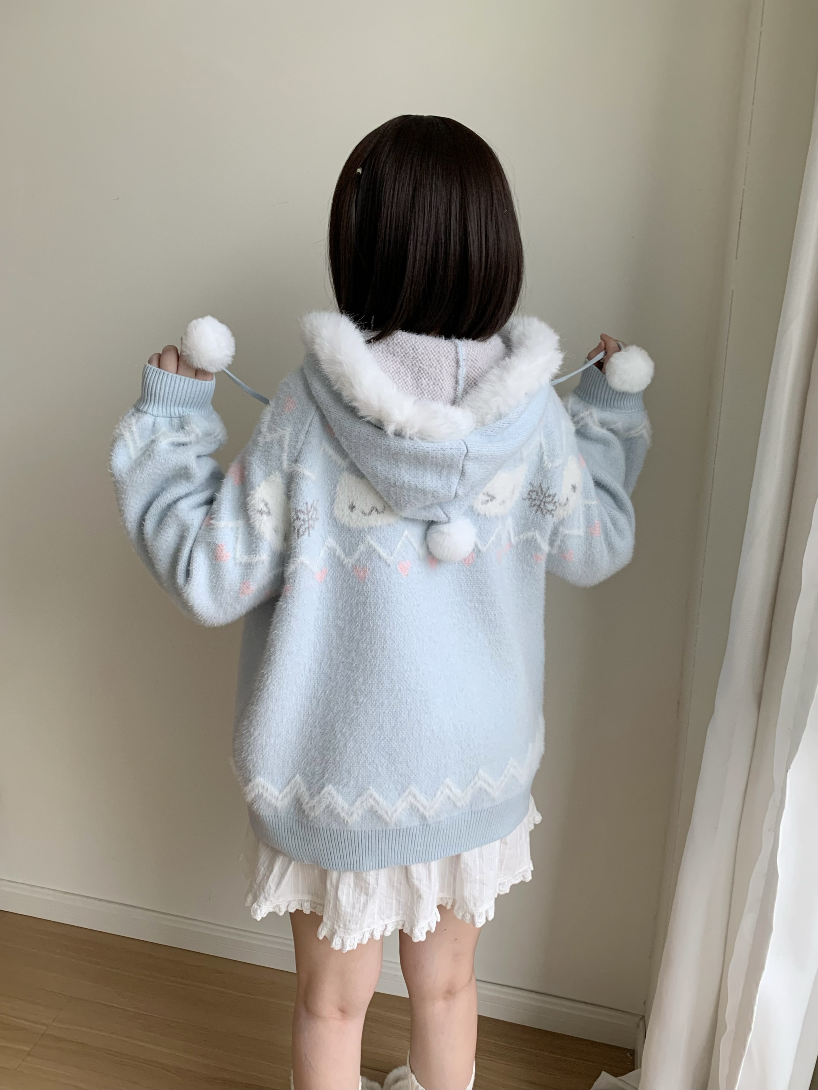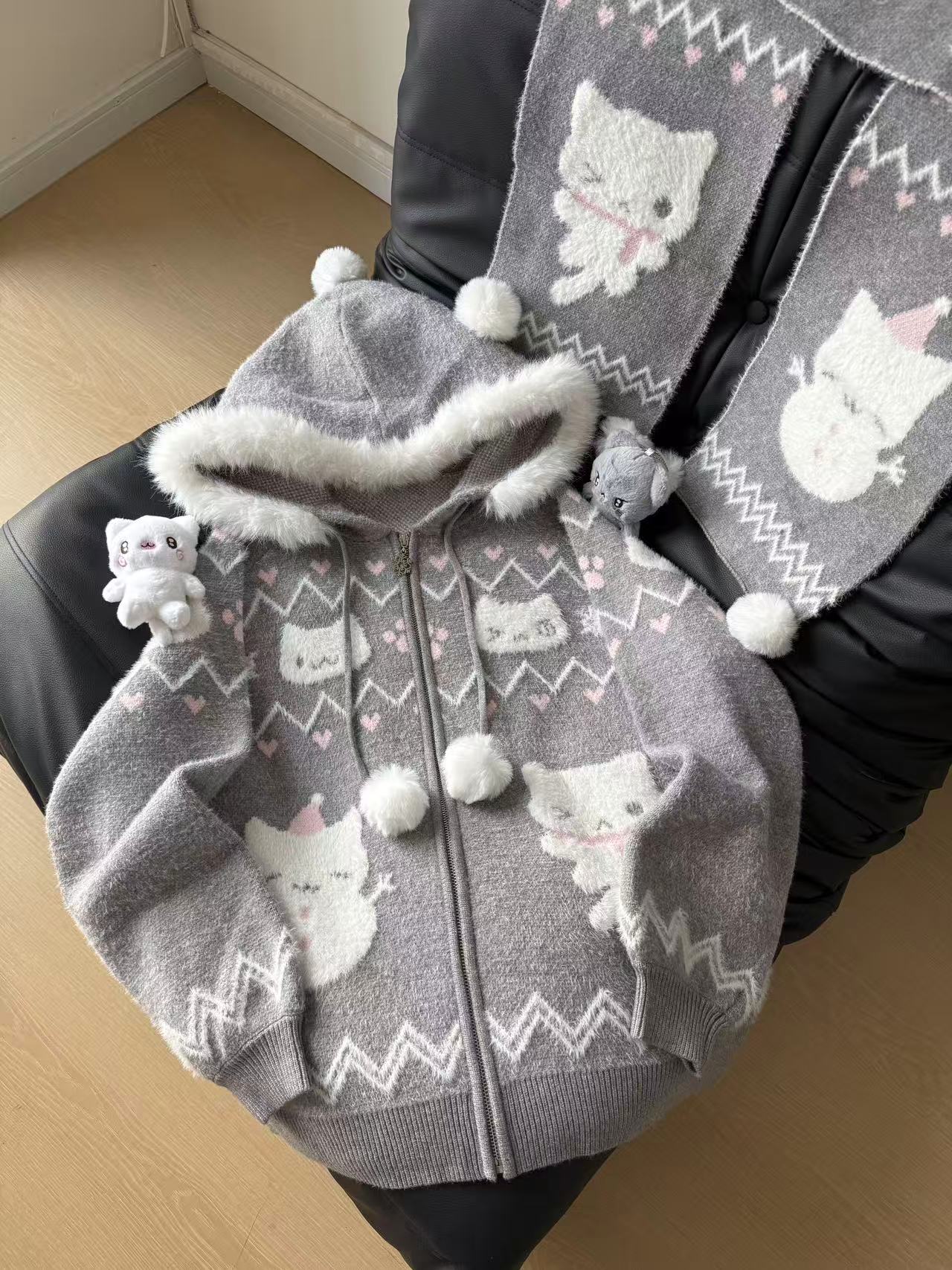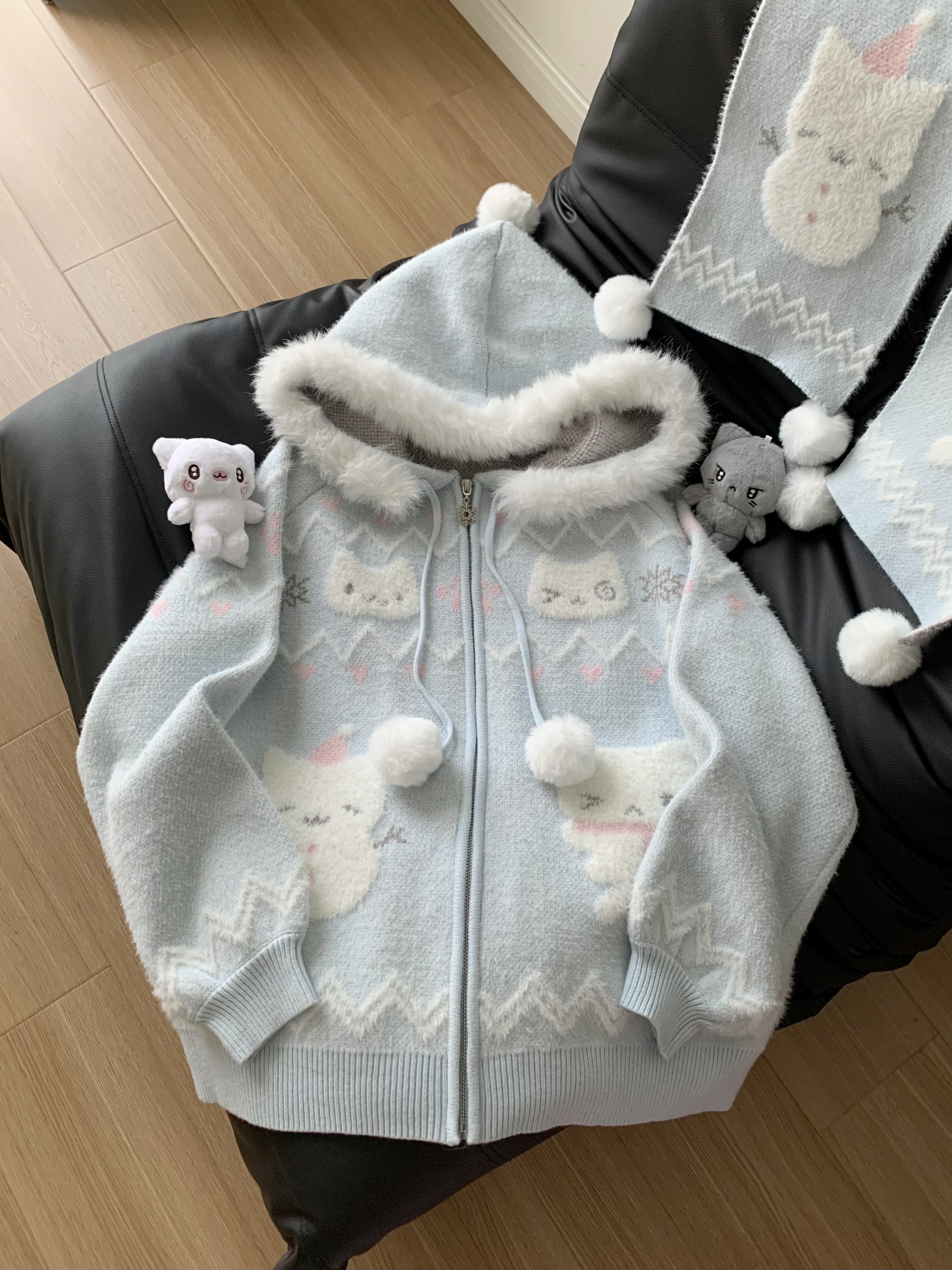 小貓吃不飽原創雪人貓奶藍費爾島仿貂毛秋冬開衫連帽外套開衫毛衣