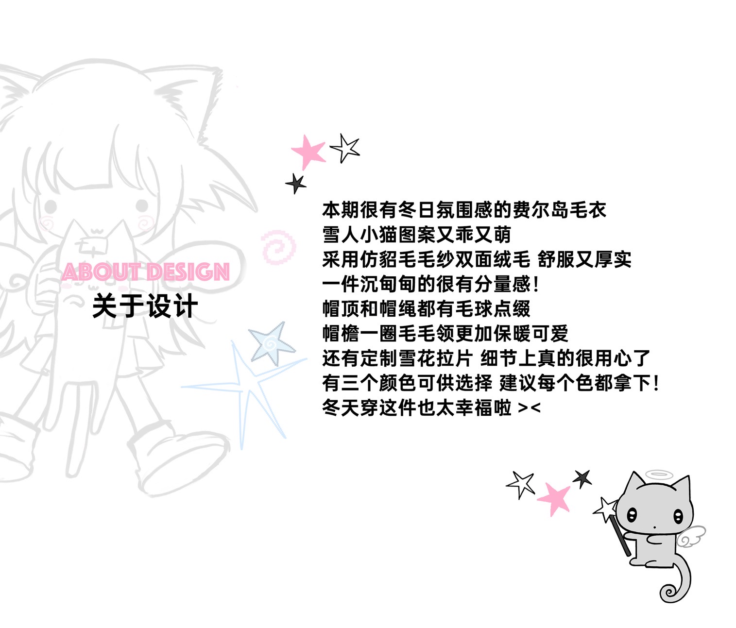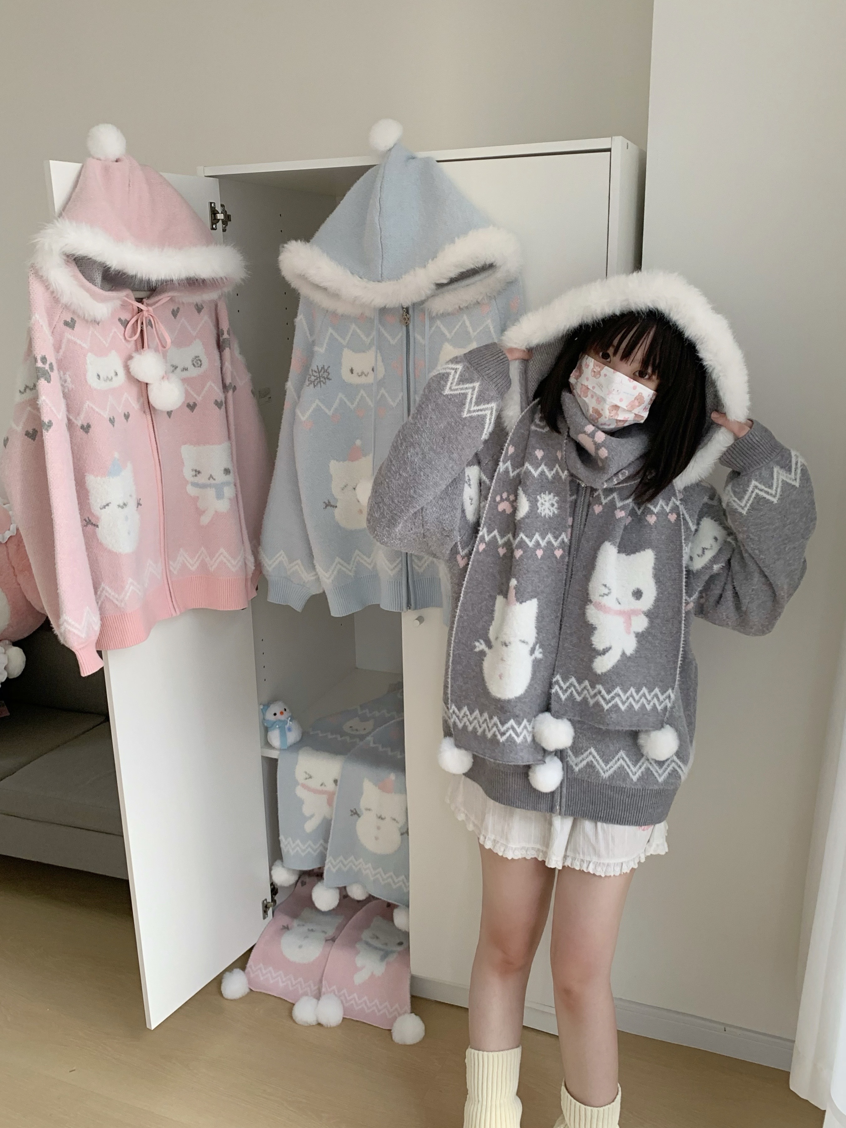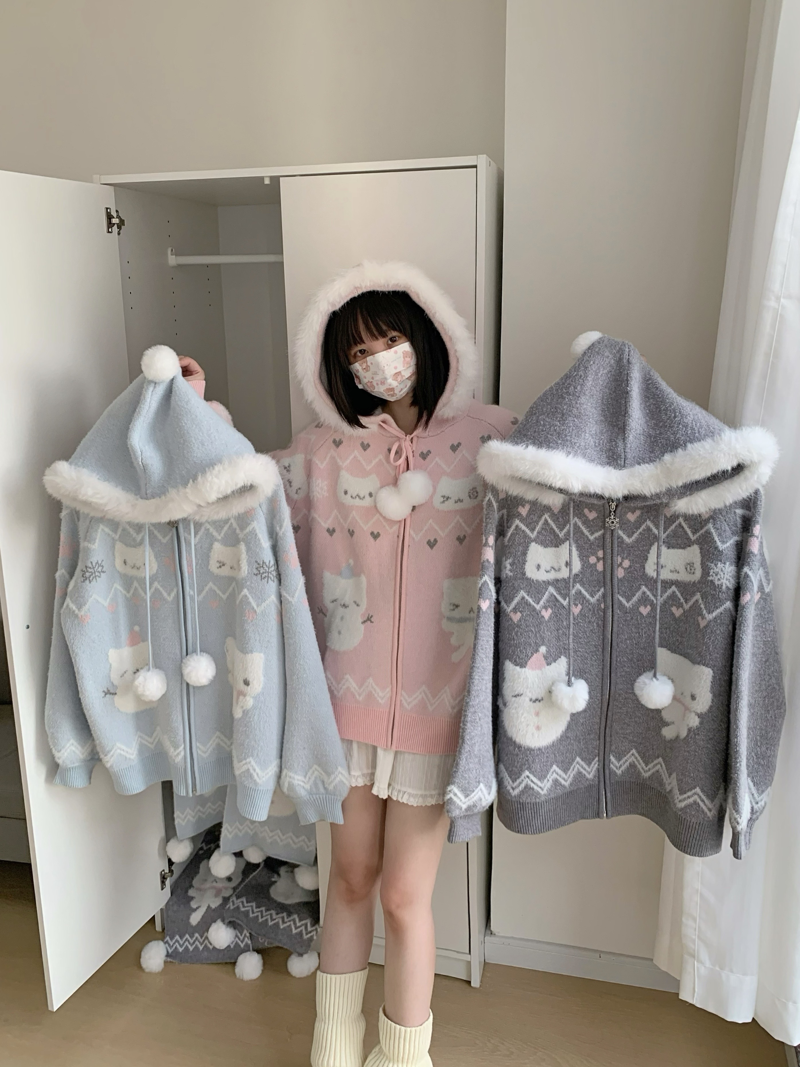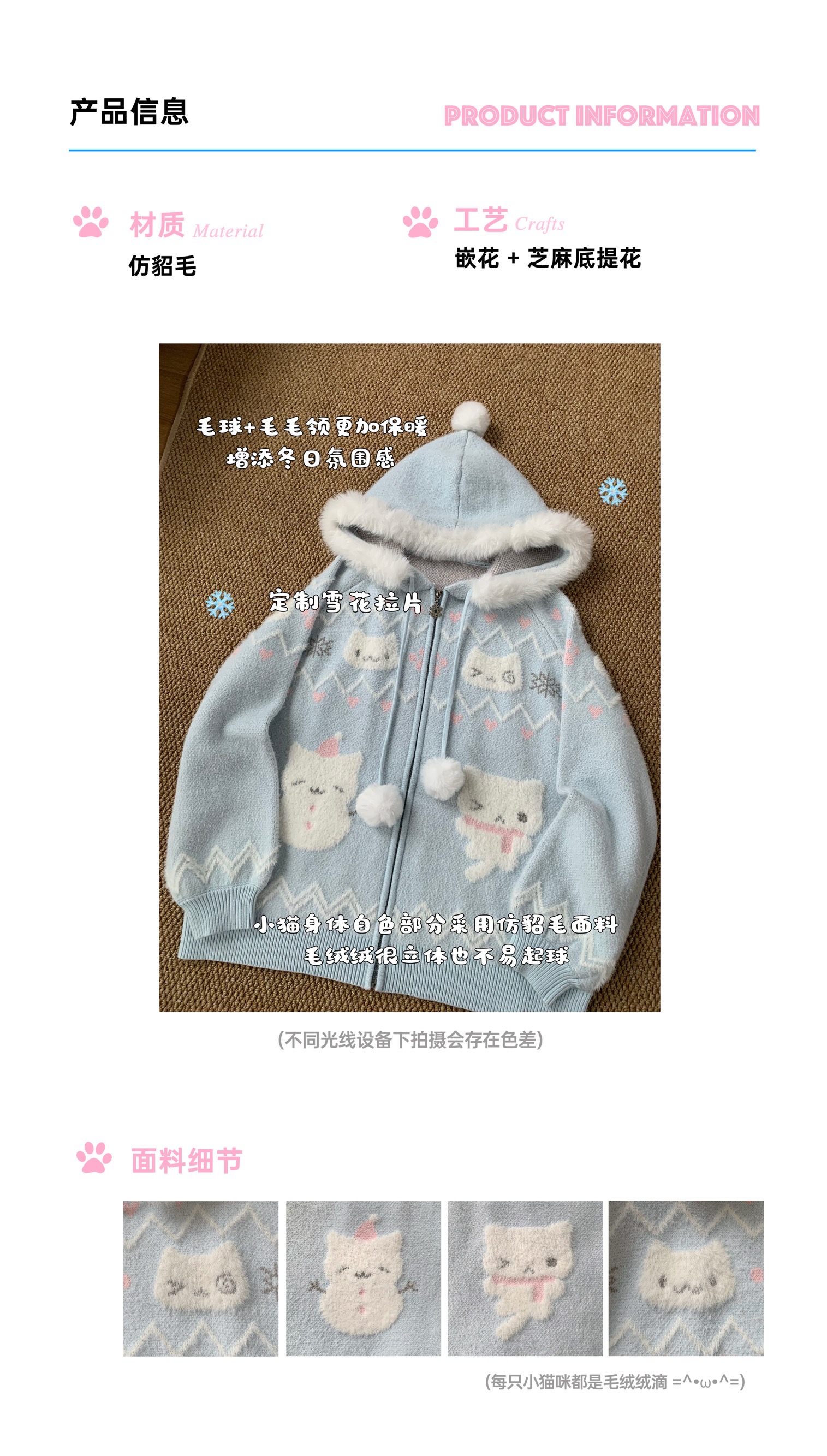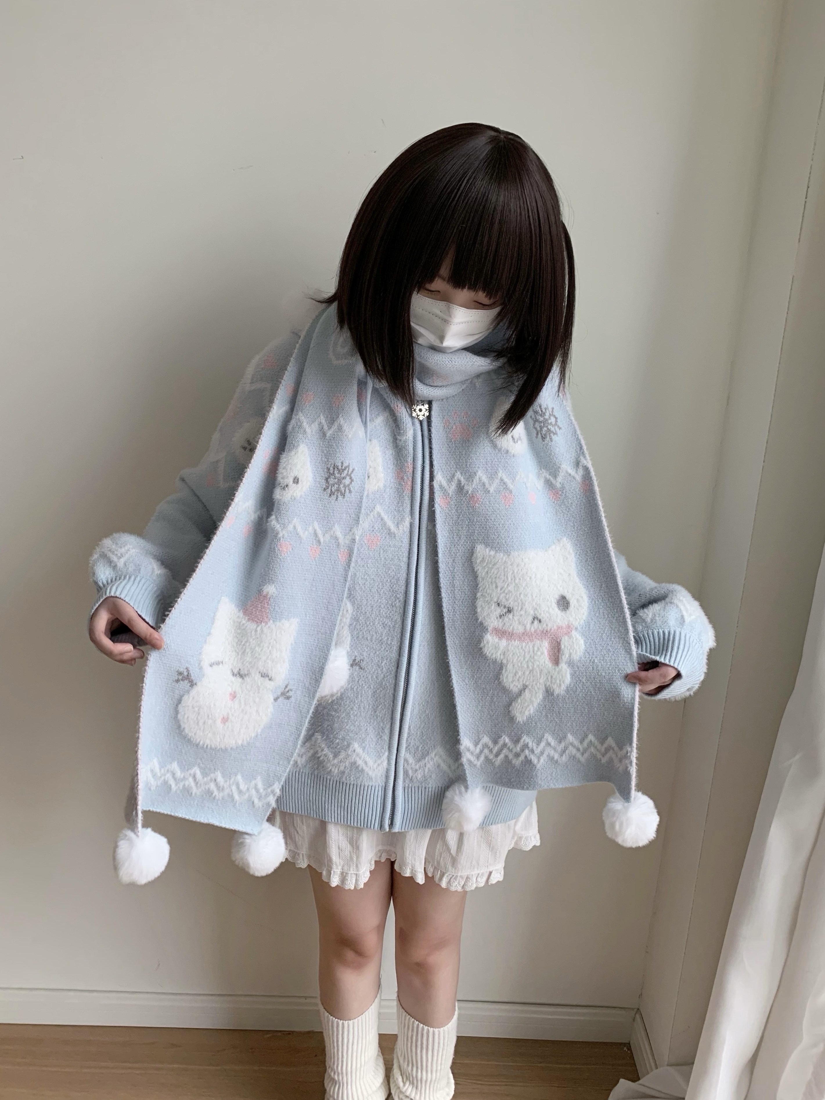 小貓吃不飽原創雪人貓奶藍費爾島仿貂毛秋冬開衫連帽外套開衫毛衣