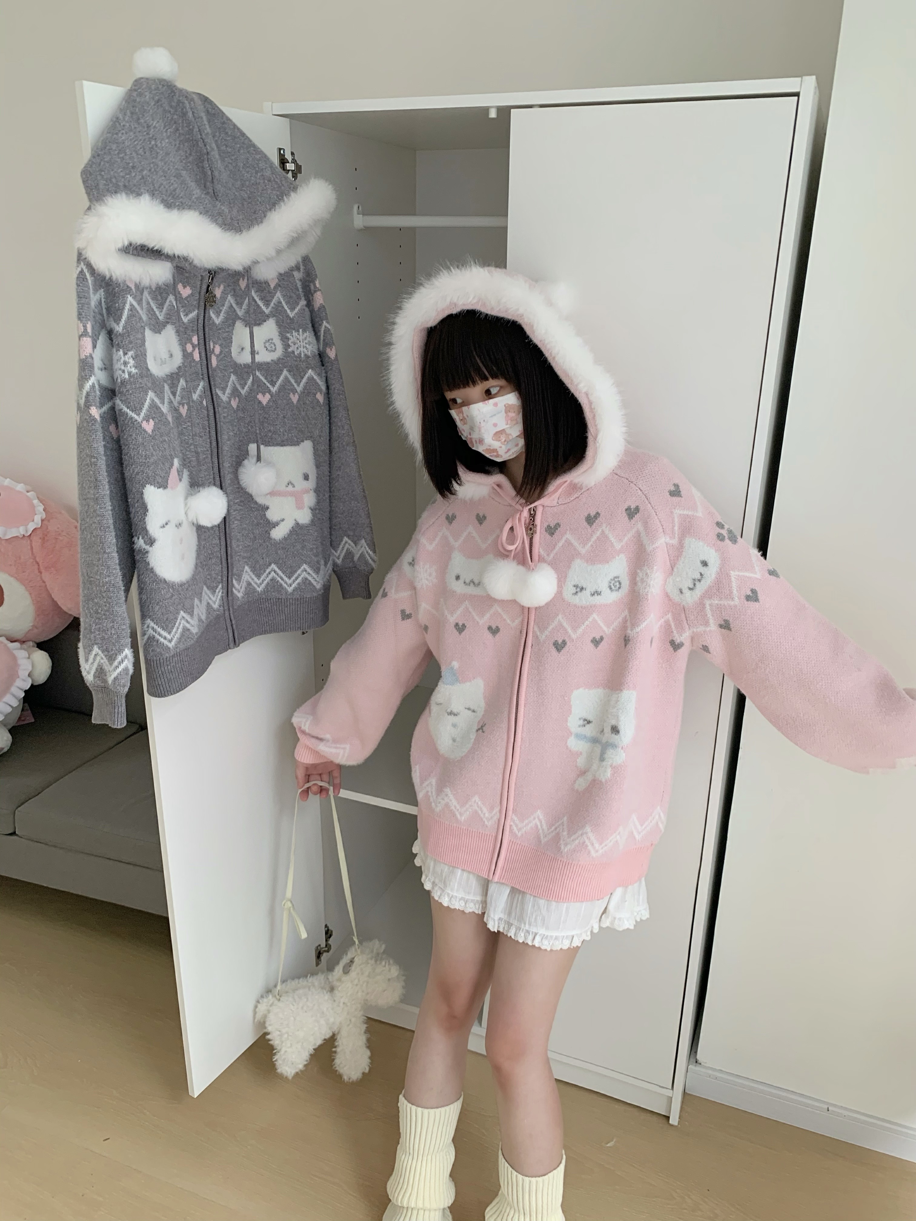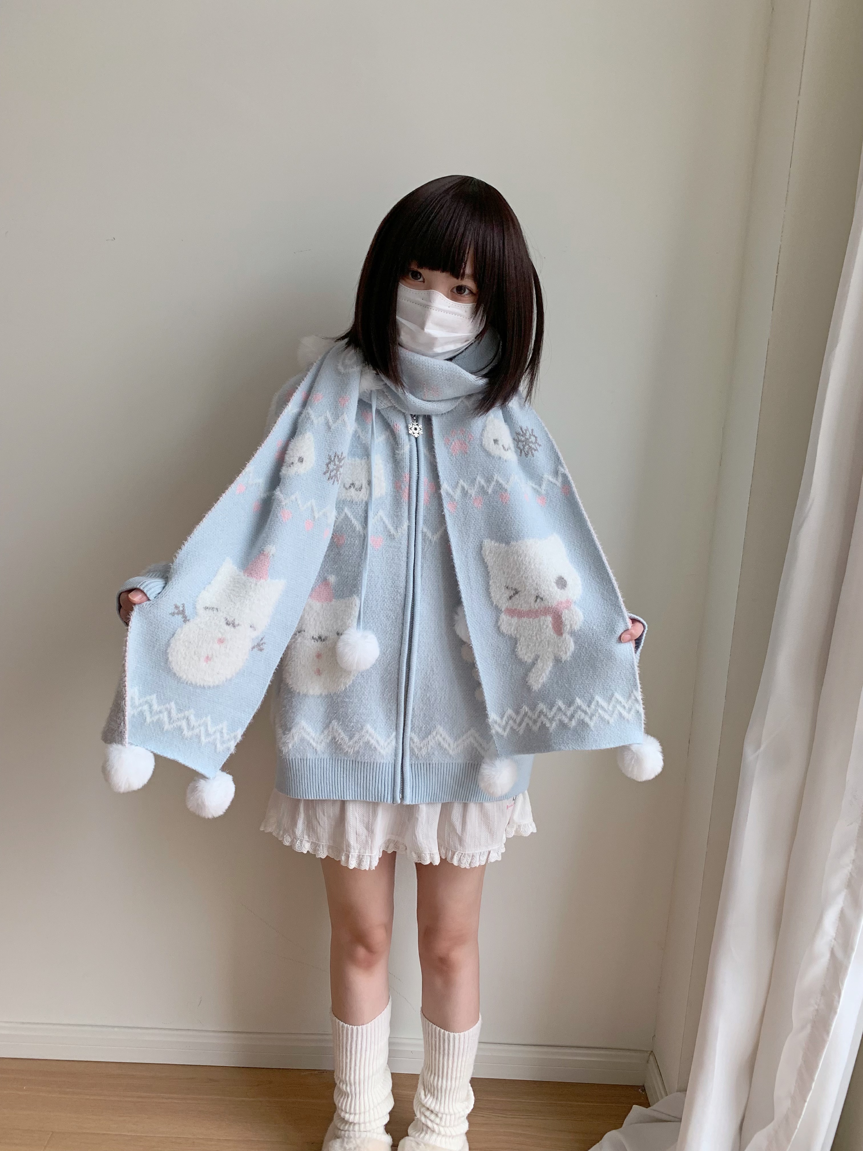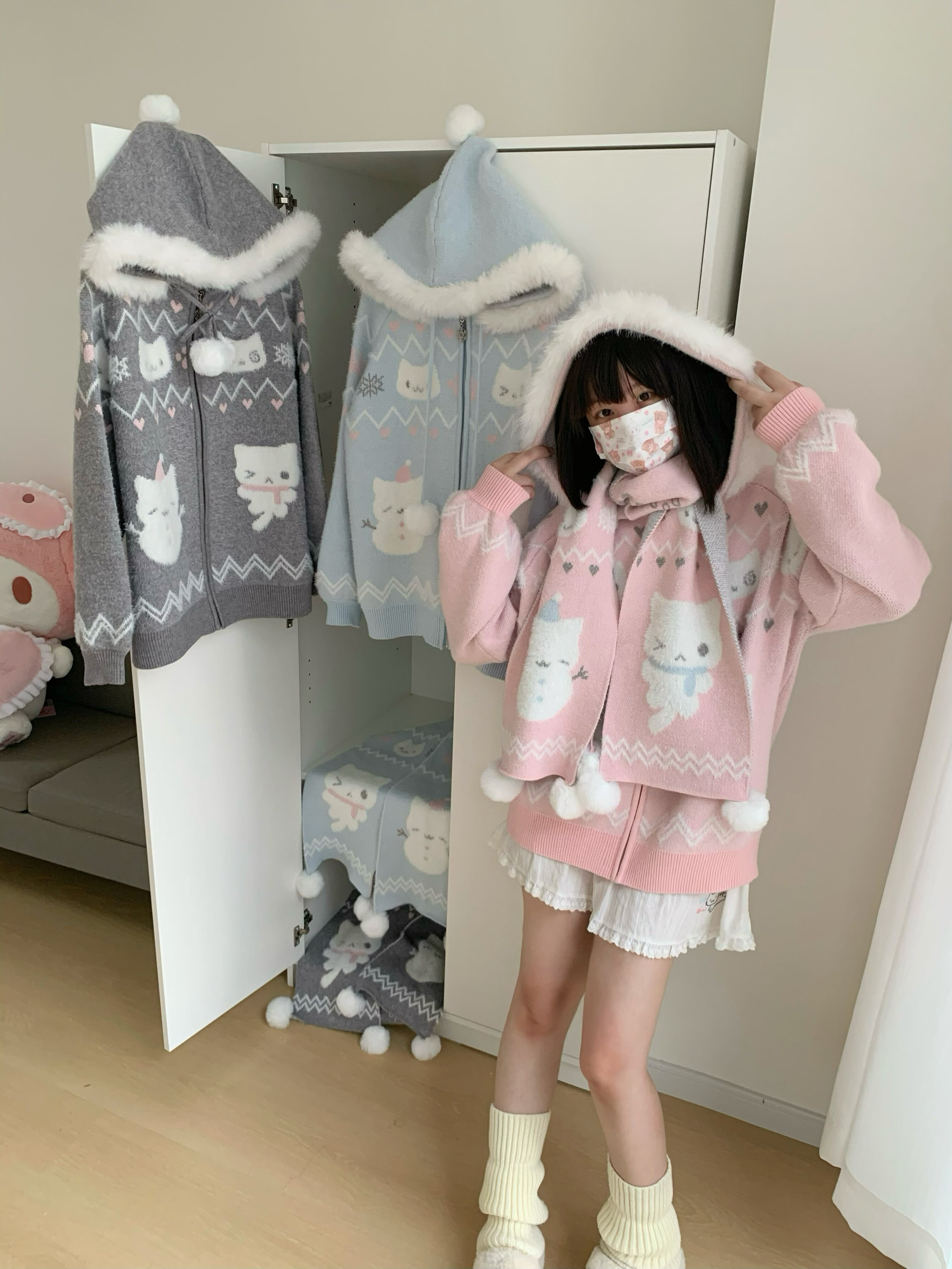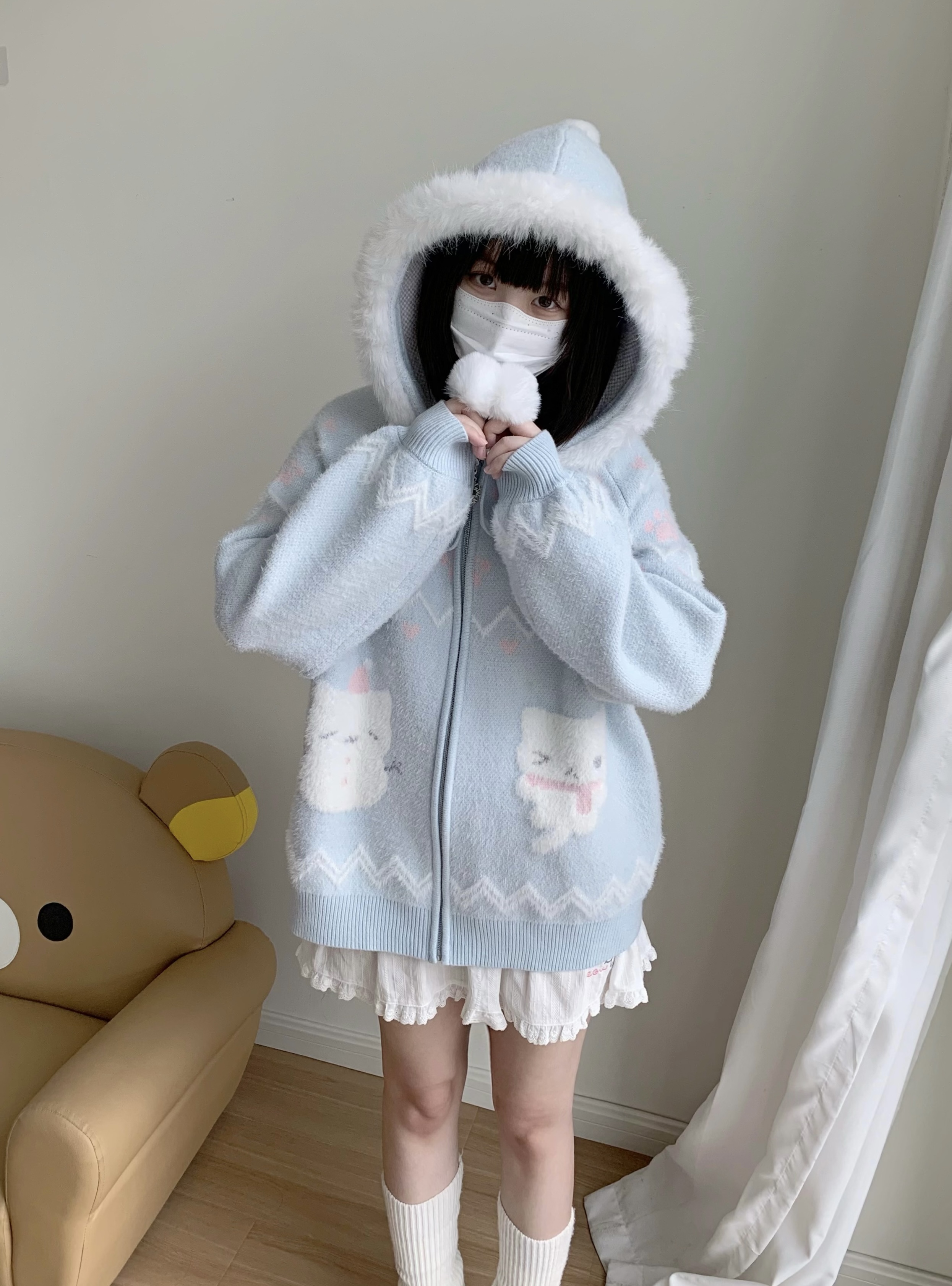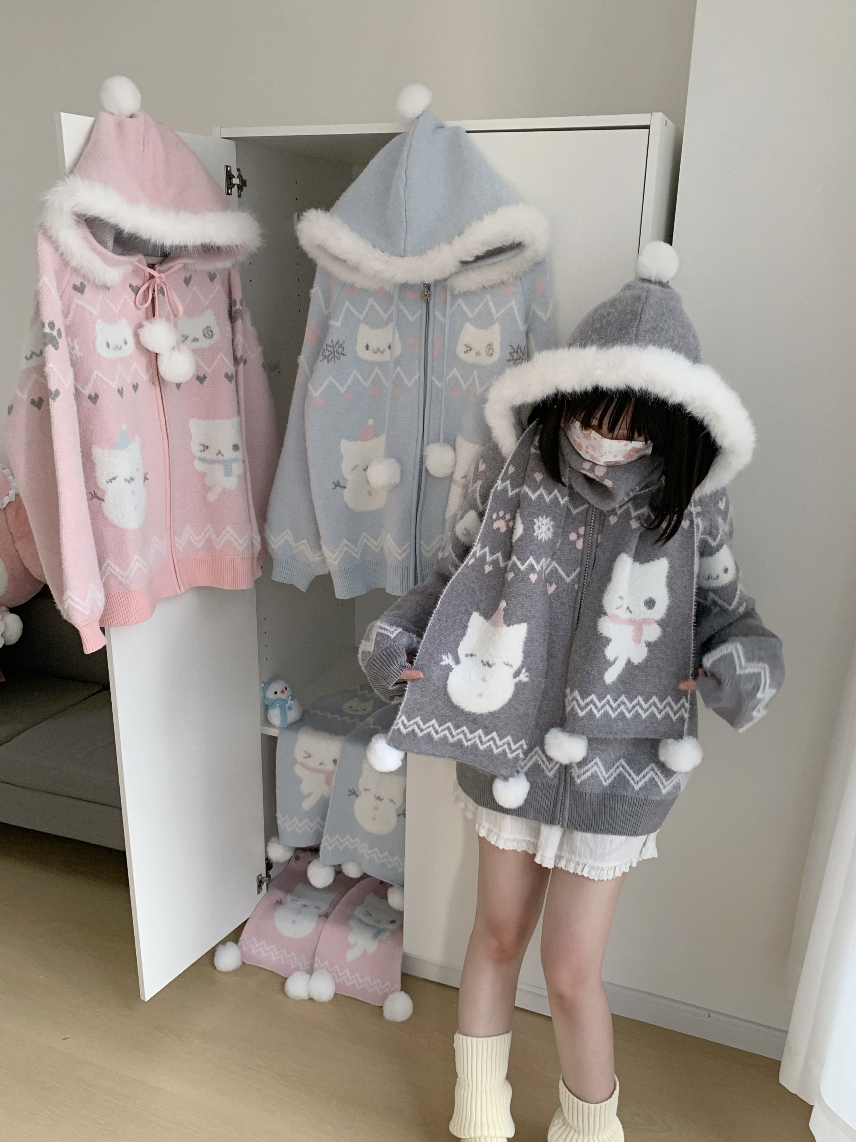 小貓吃不飽原創雪人貓奶藍費爾島仿貂毛秋冬開衫連帽外套開衫毛衣
