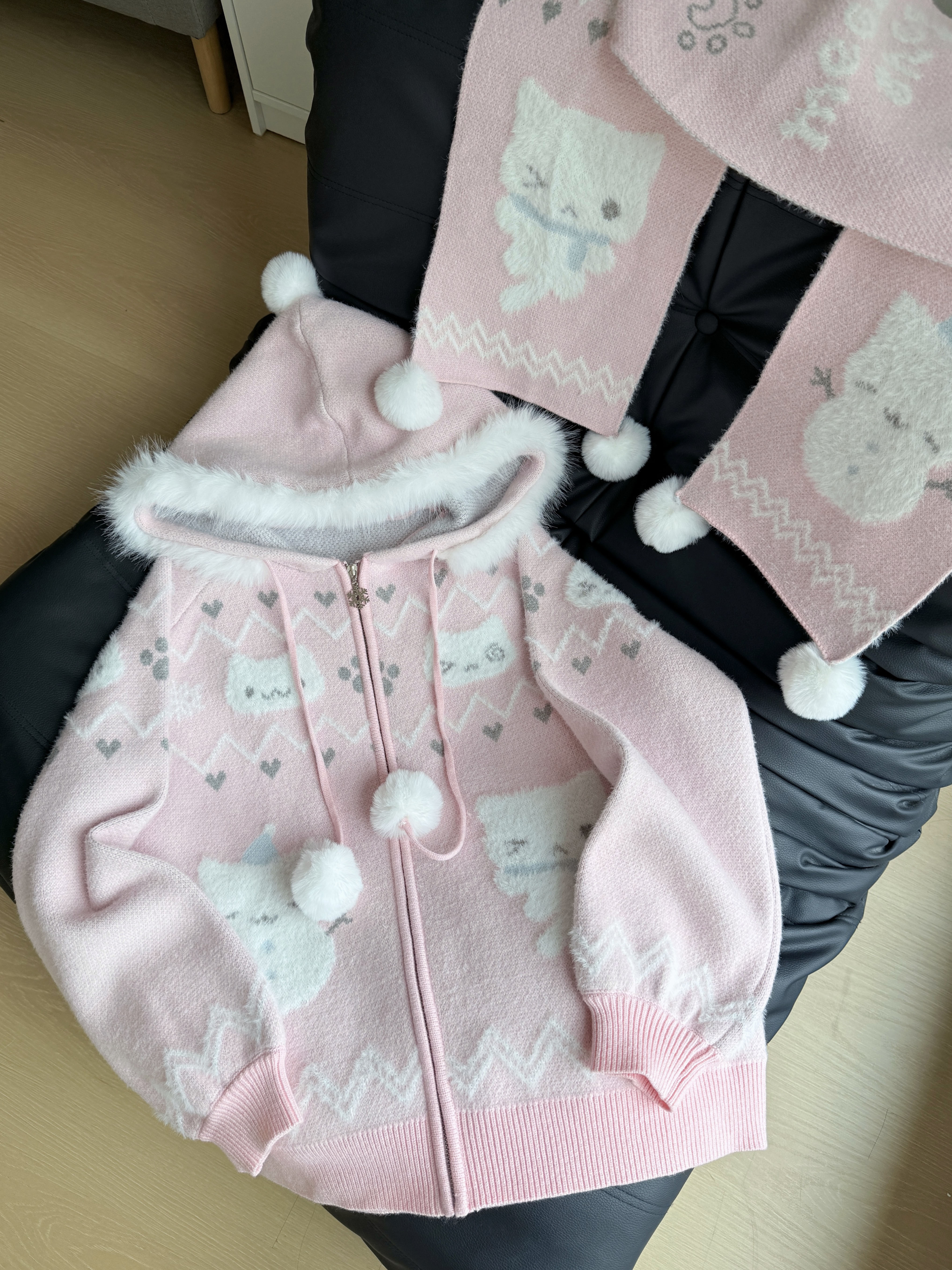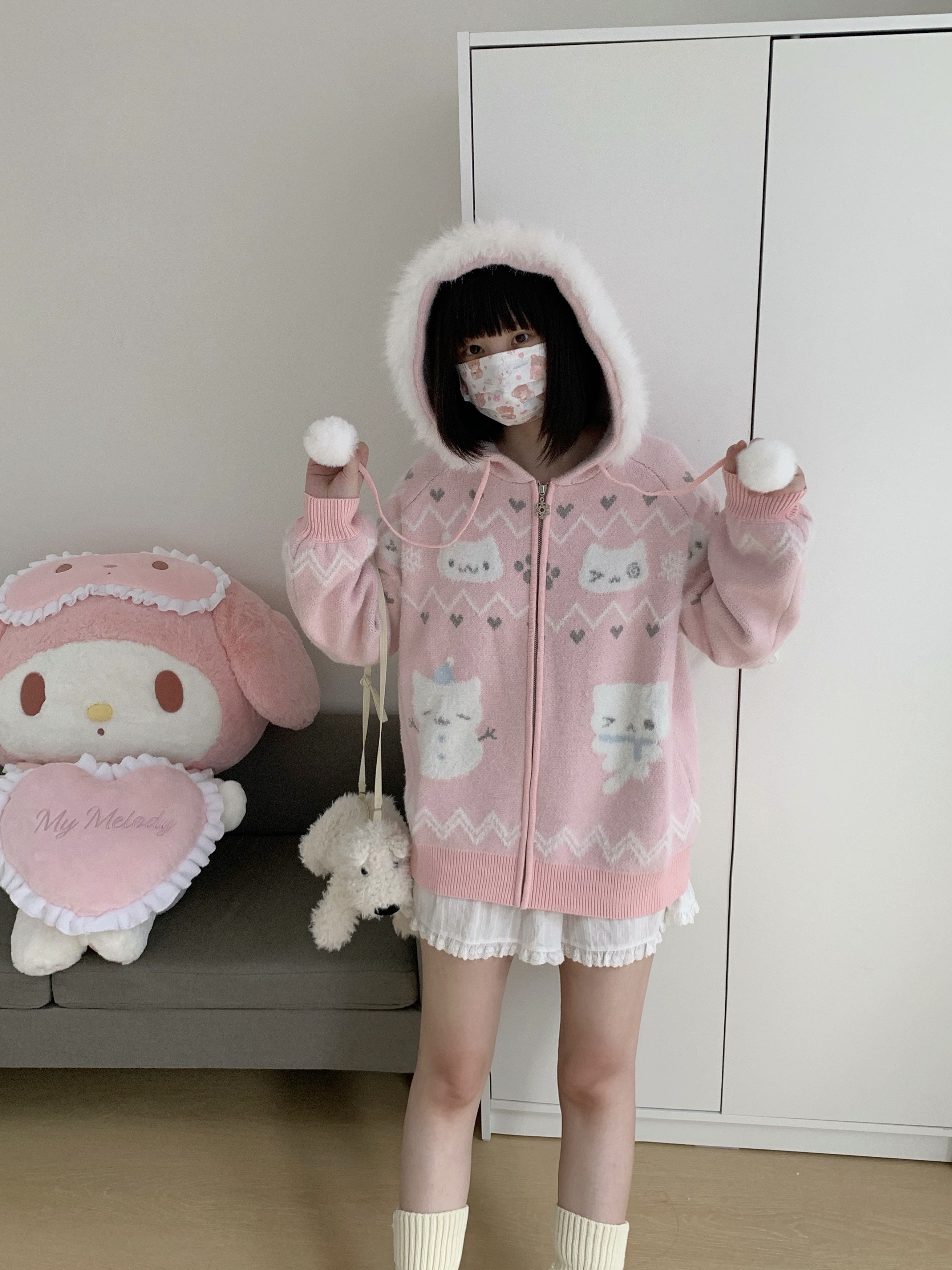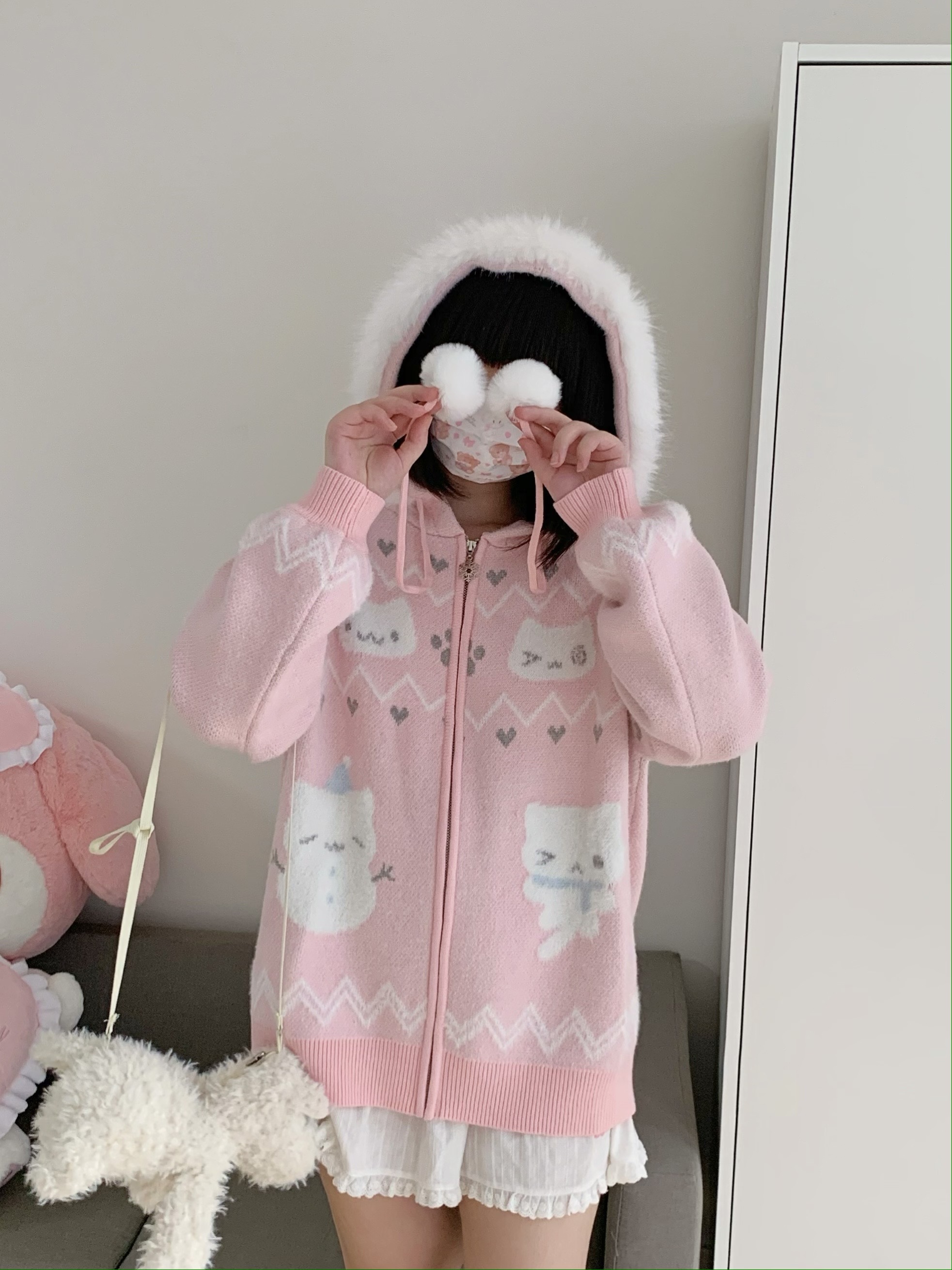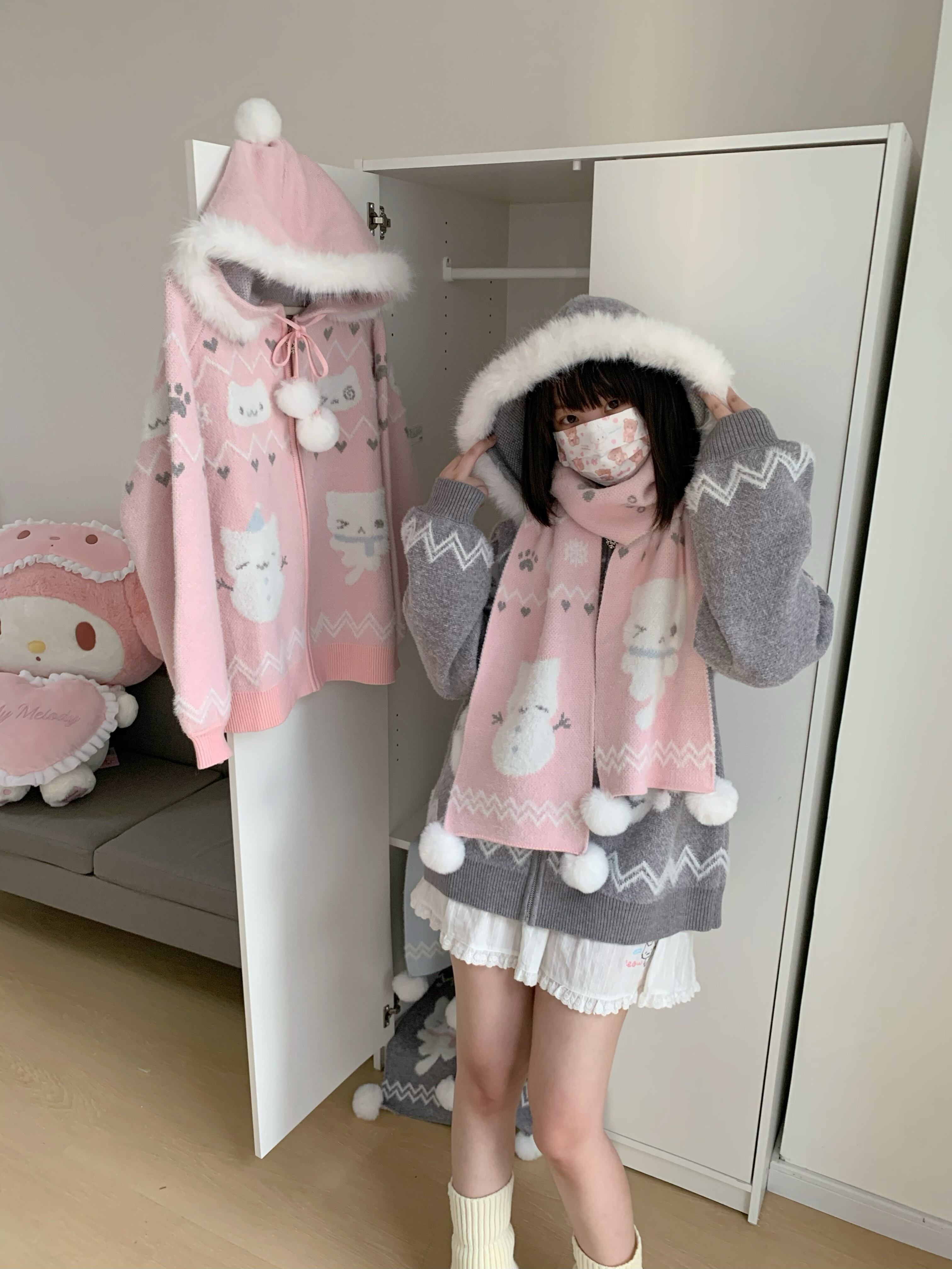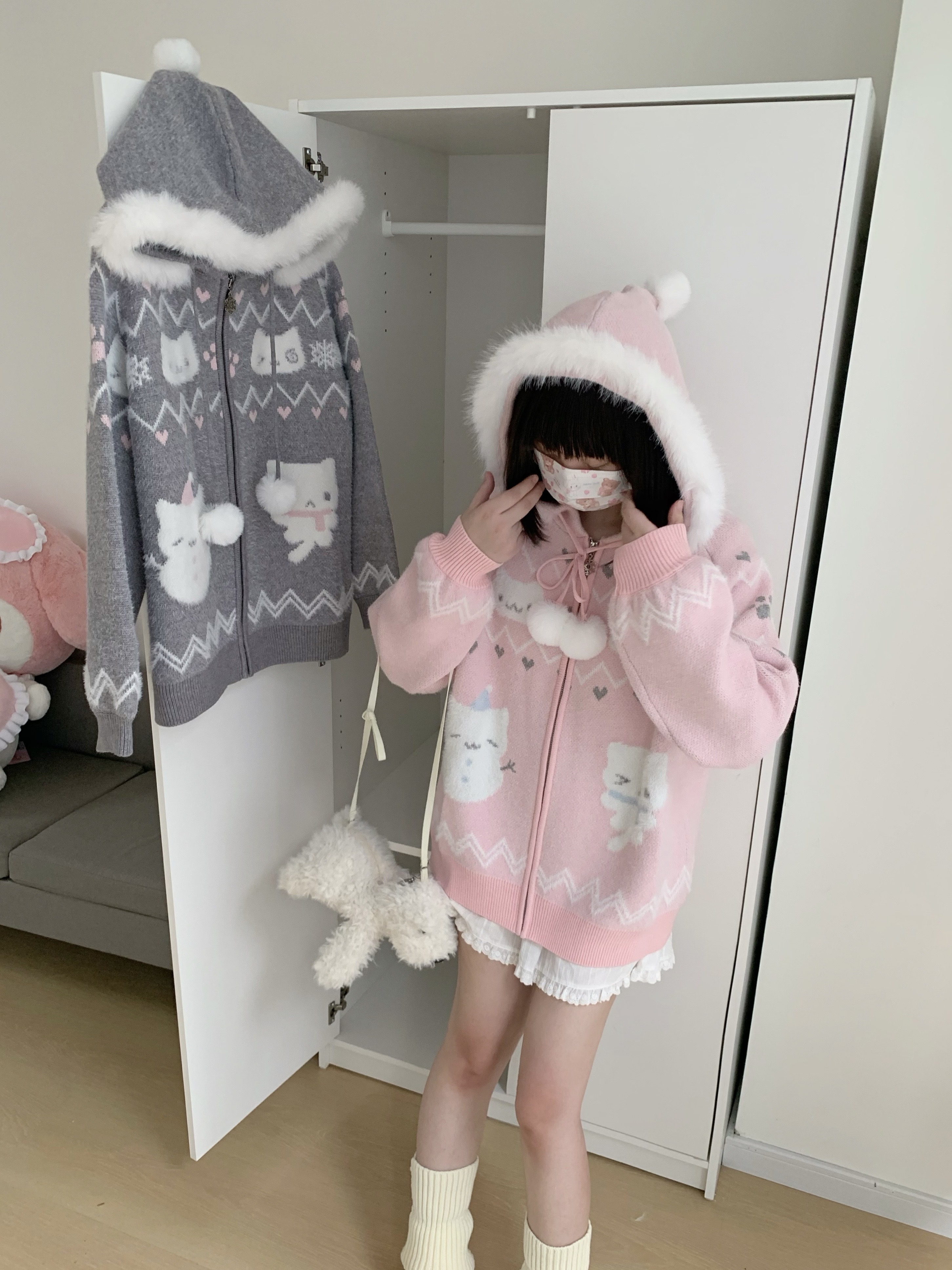 小貓吃不飽原創雪人貓奶藍費爾島仿貂毛秋冬開衫連帽外套開衫毛衣