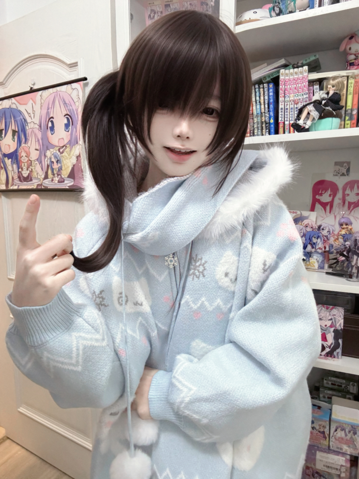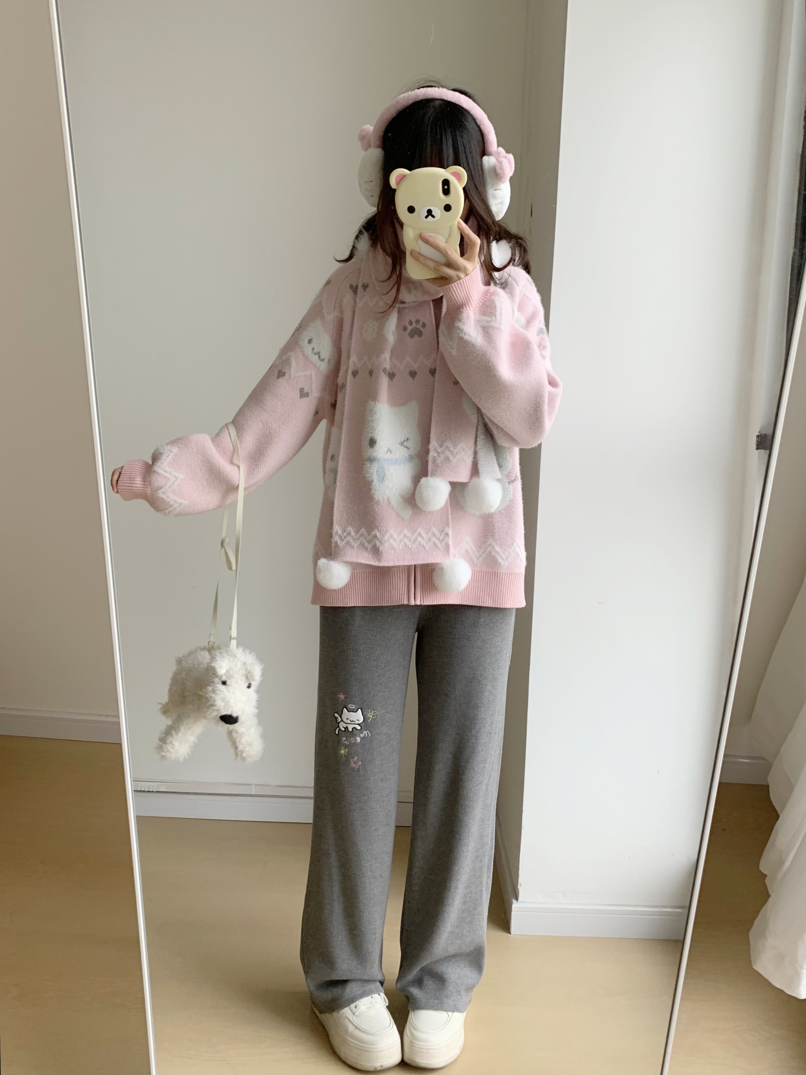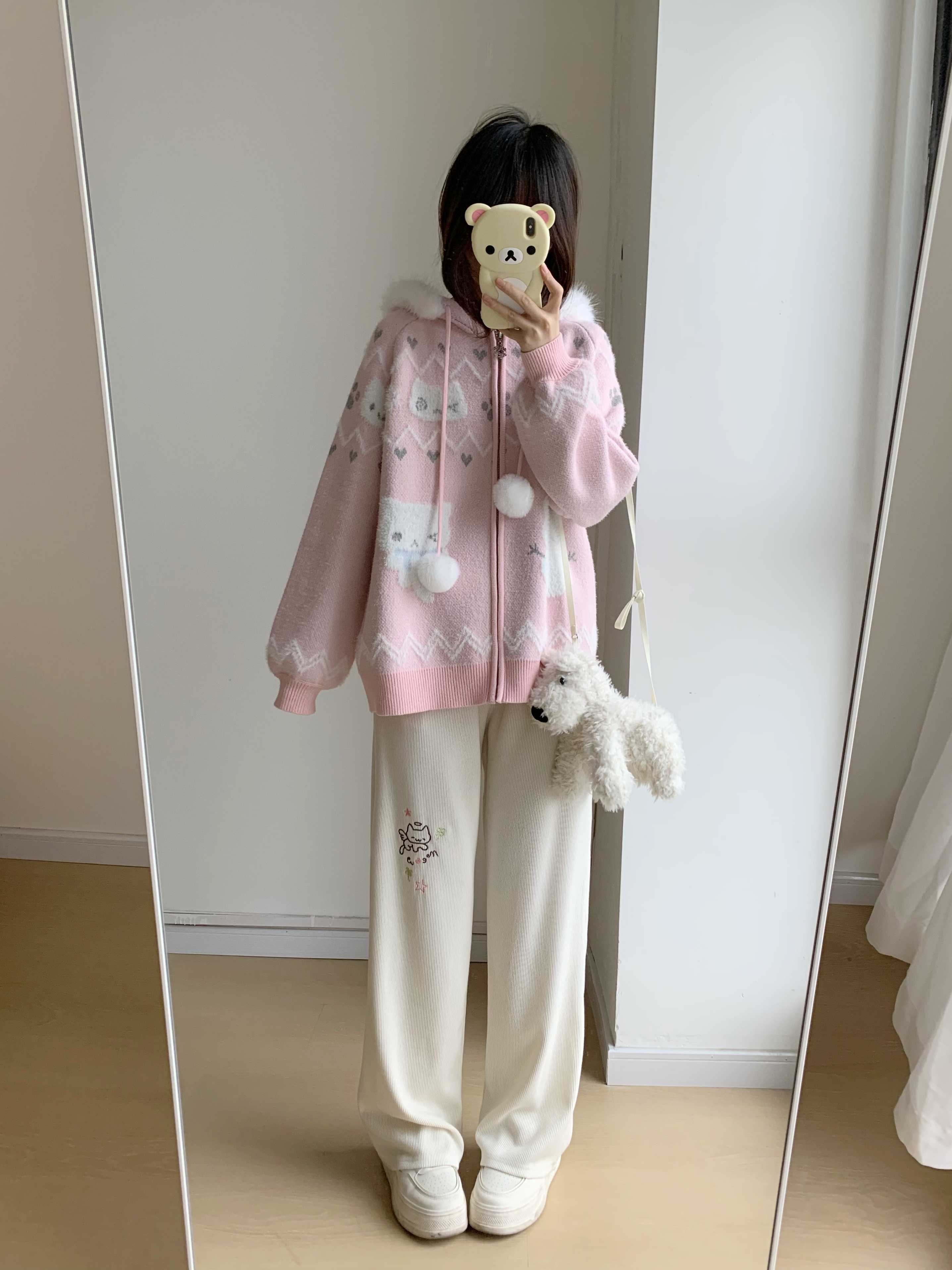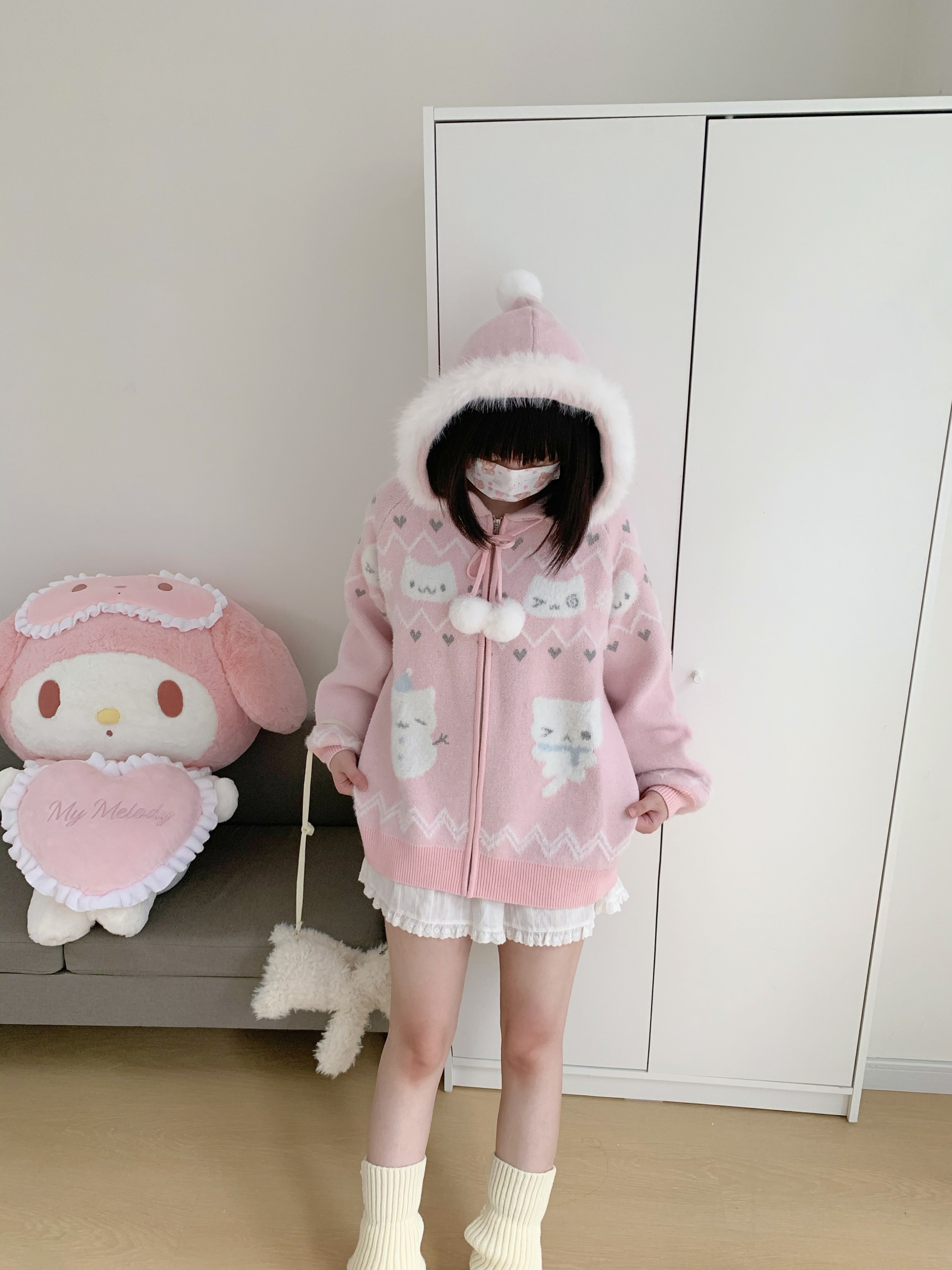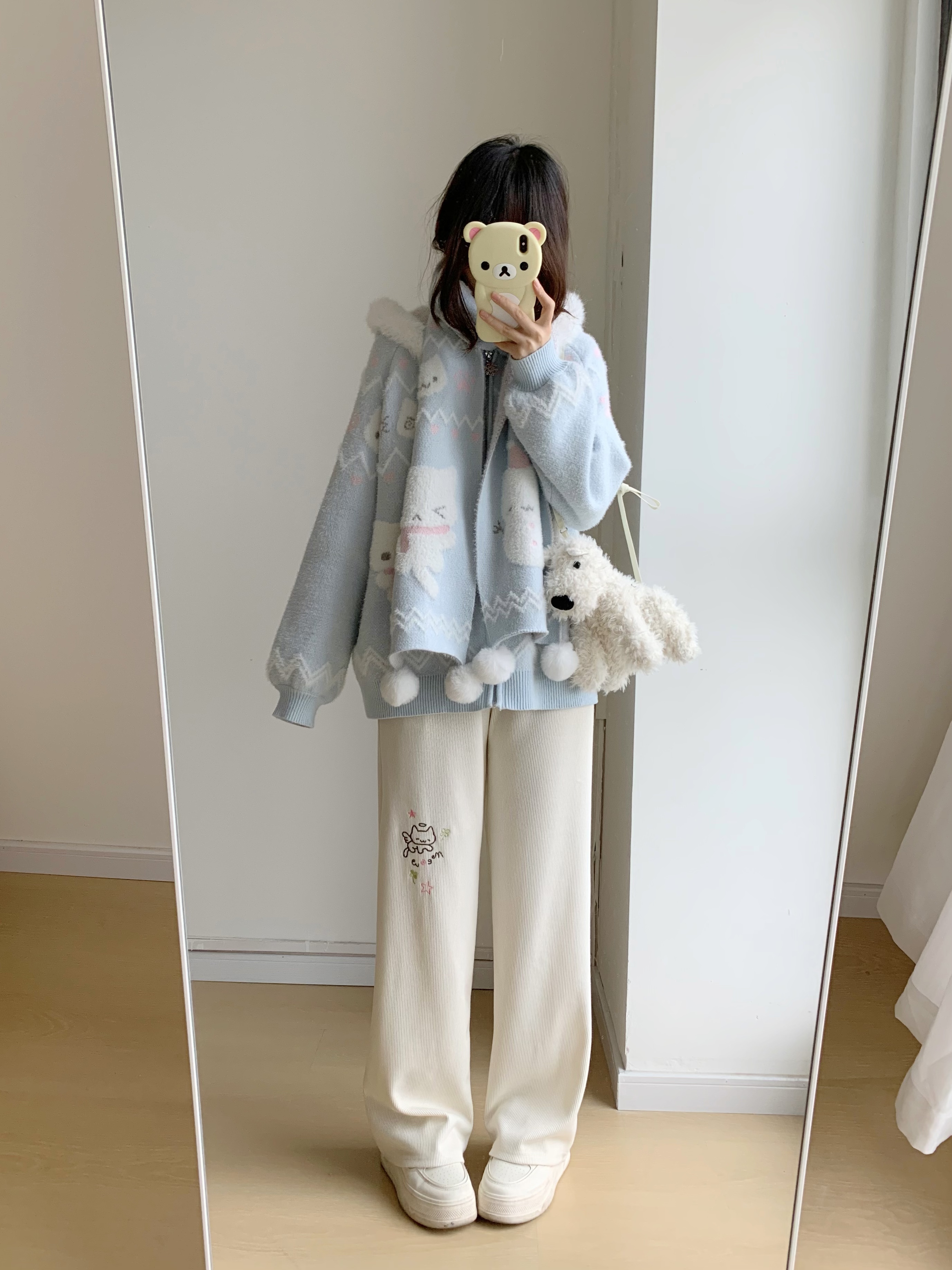 小貓吃不飽原創雪人貓奶藍費爾島仿貂毛秋冬開衫連帽外套開衫毛衣