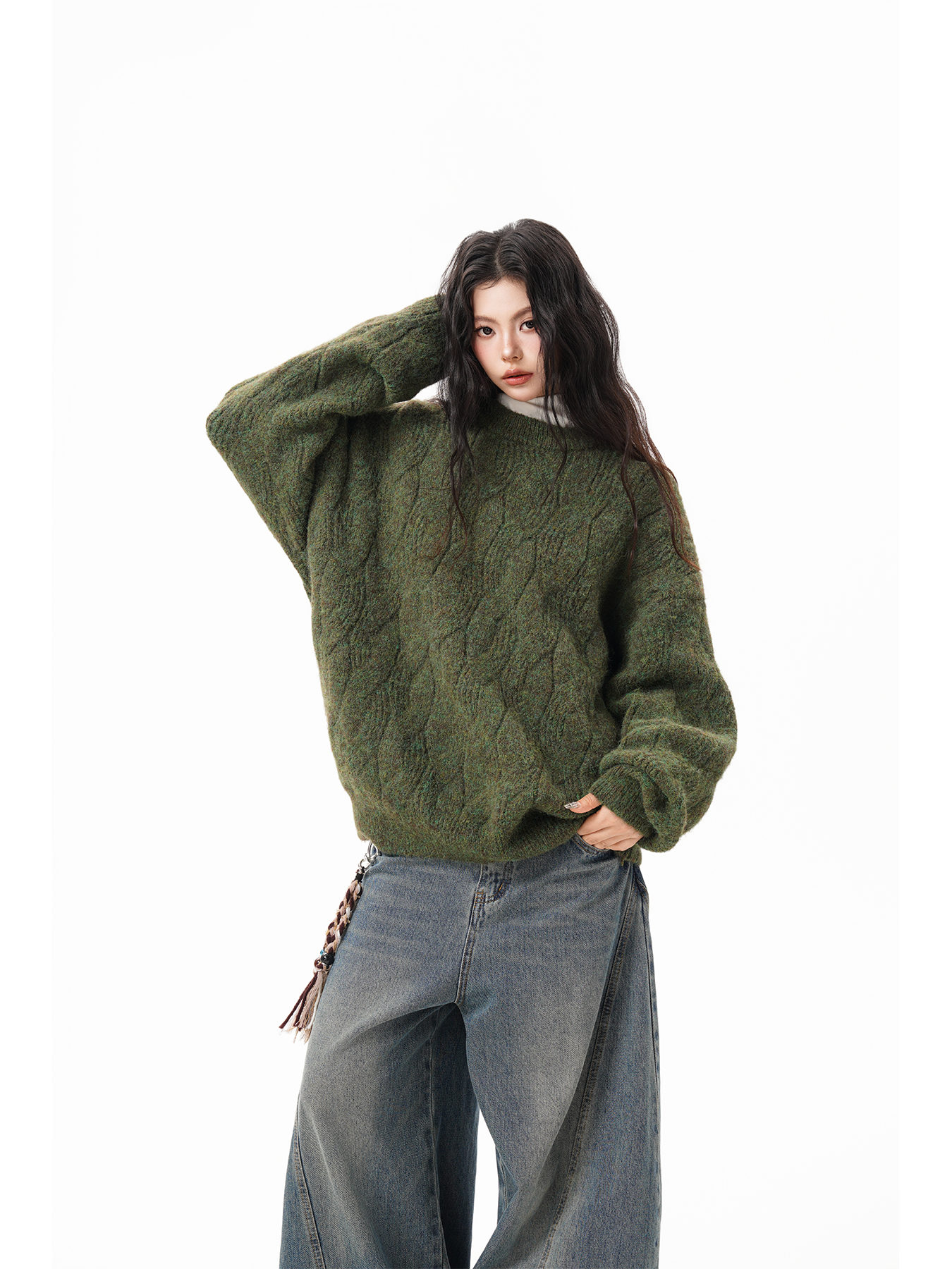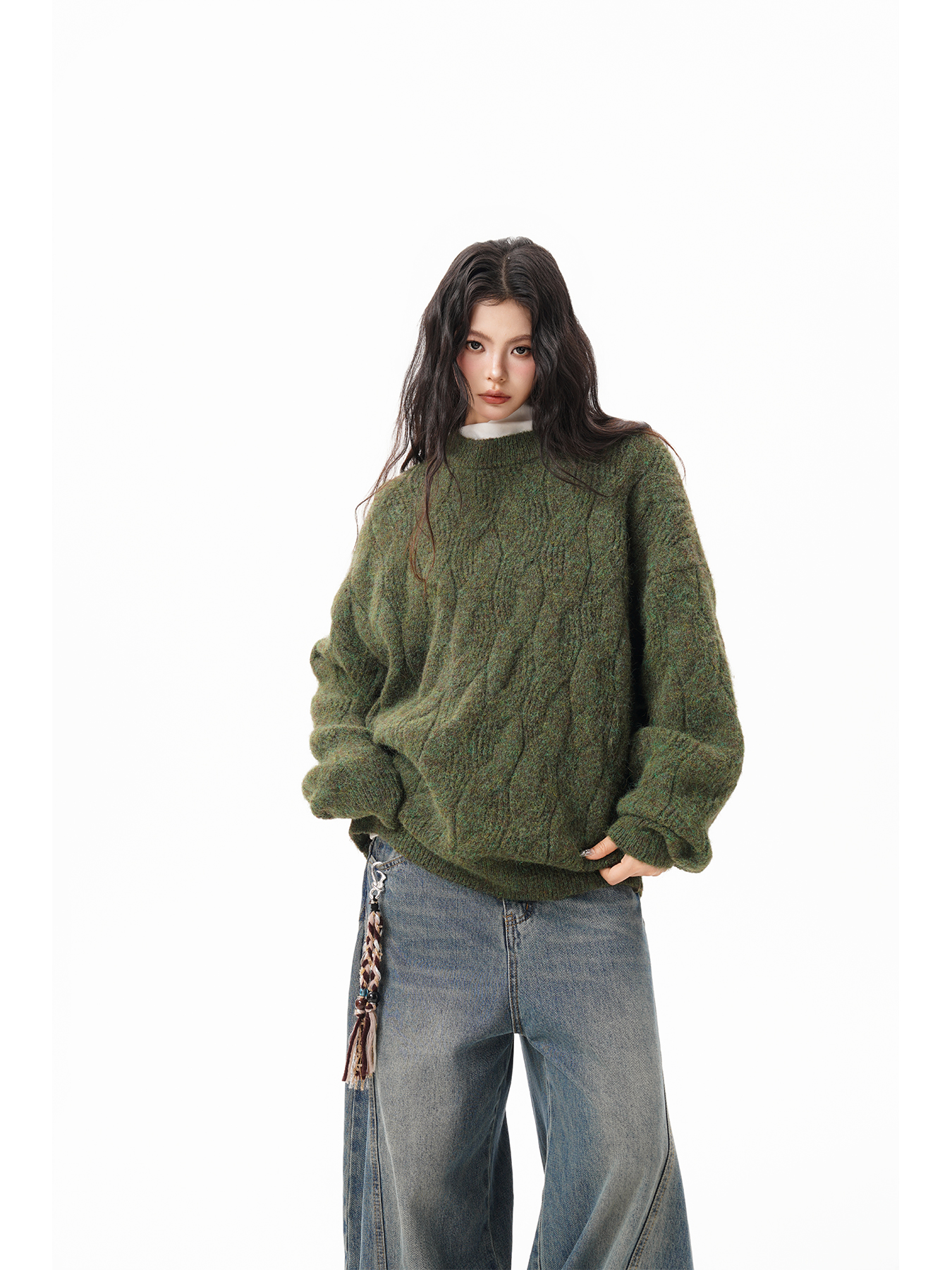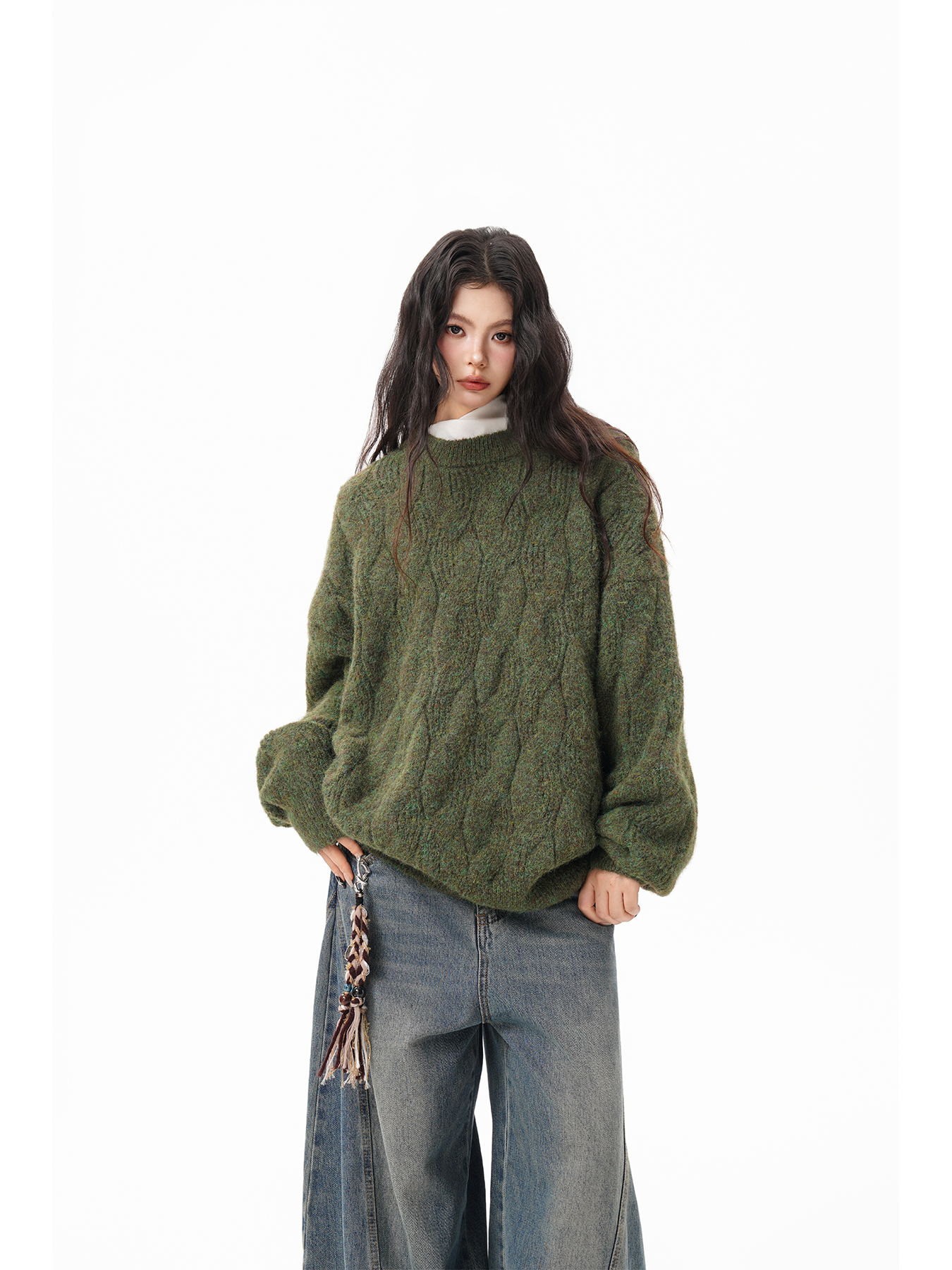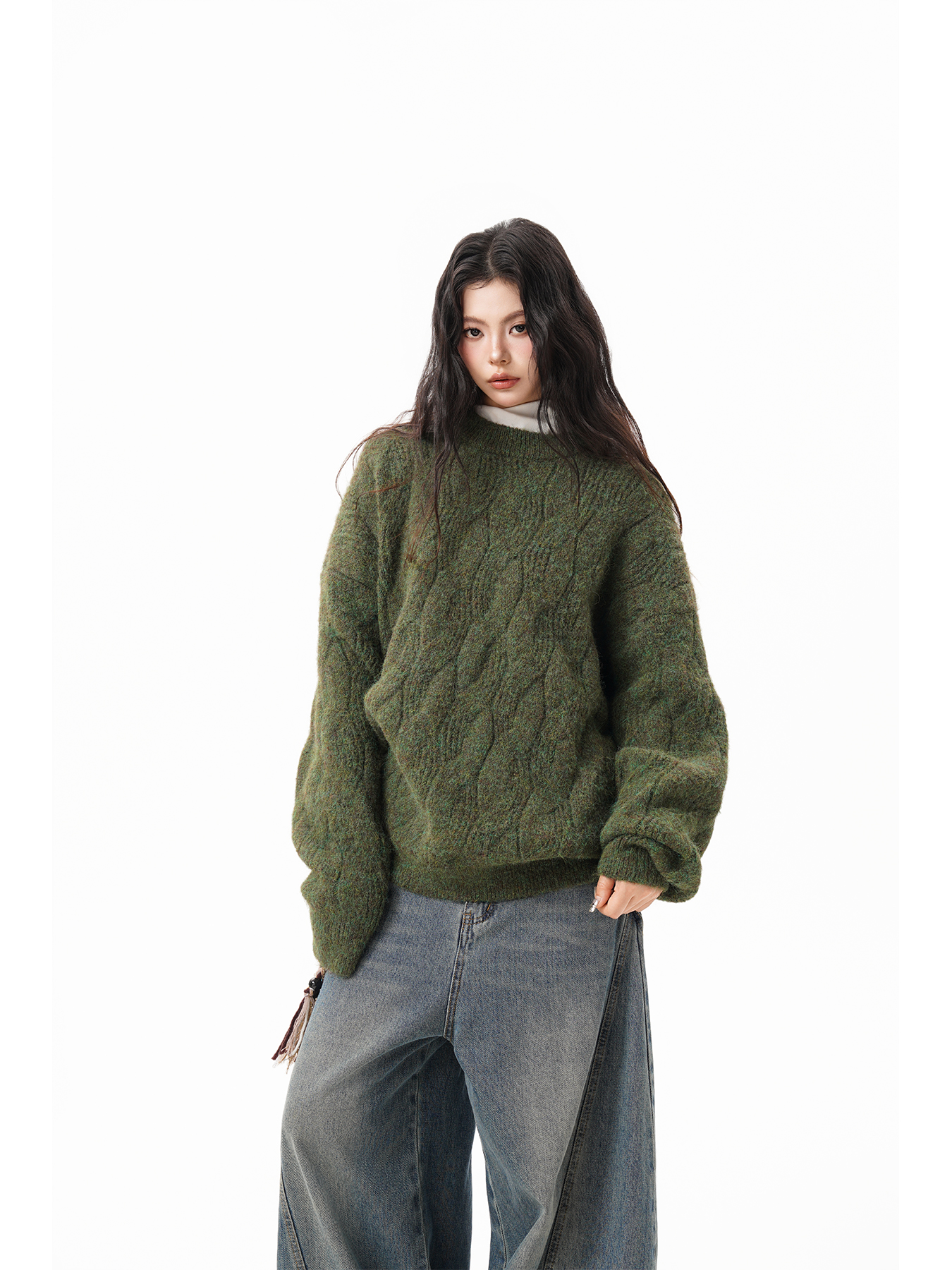 美式仙蹤綠麻花紋圓領毛衣女男秋季復古寬松休閒百搭針織上衣情侶
