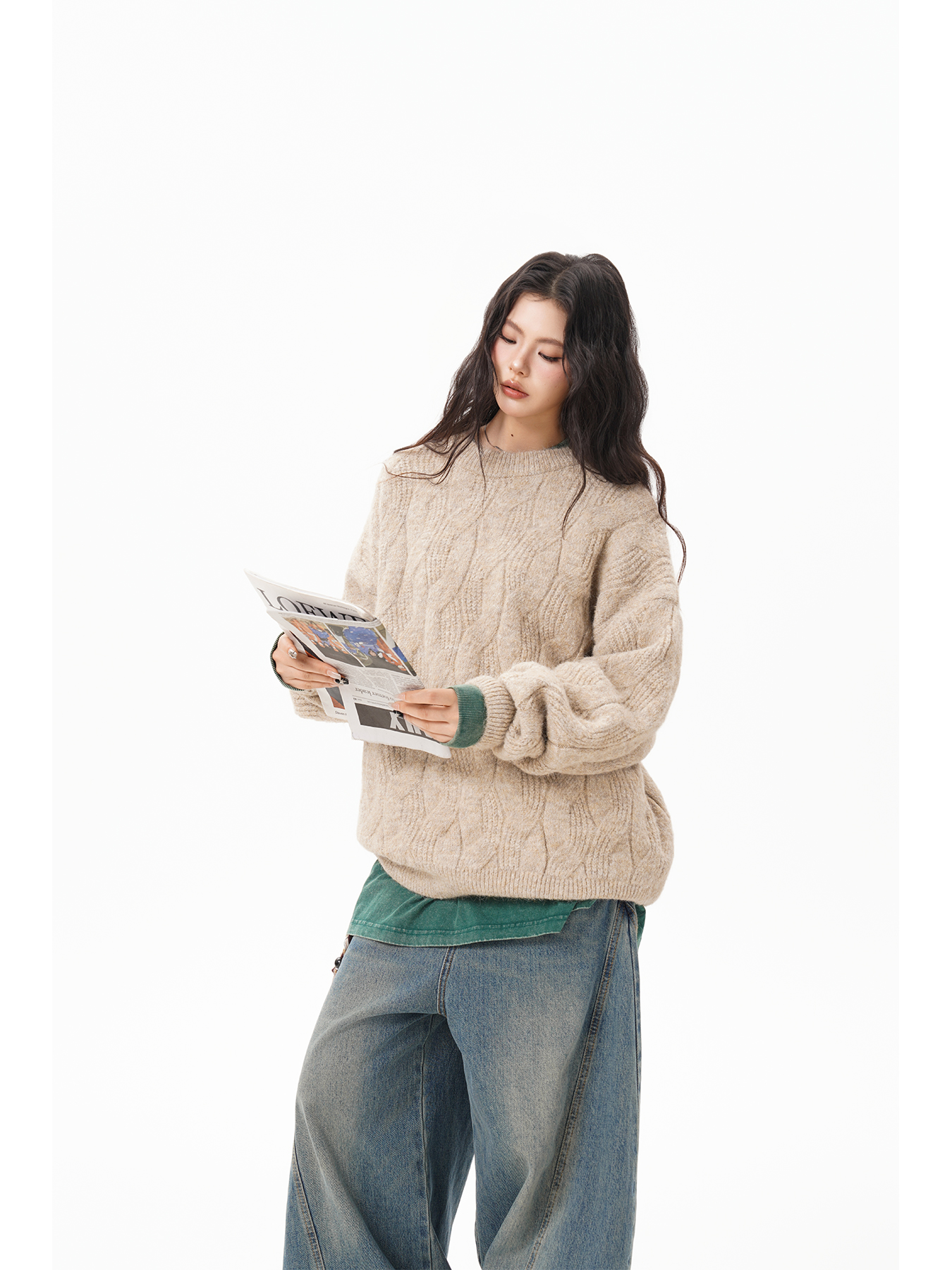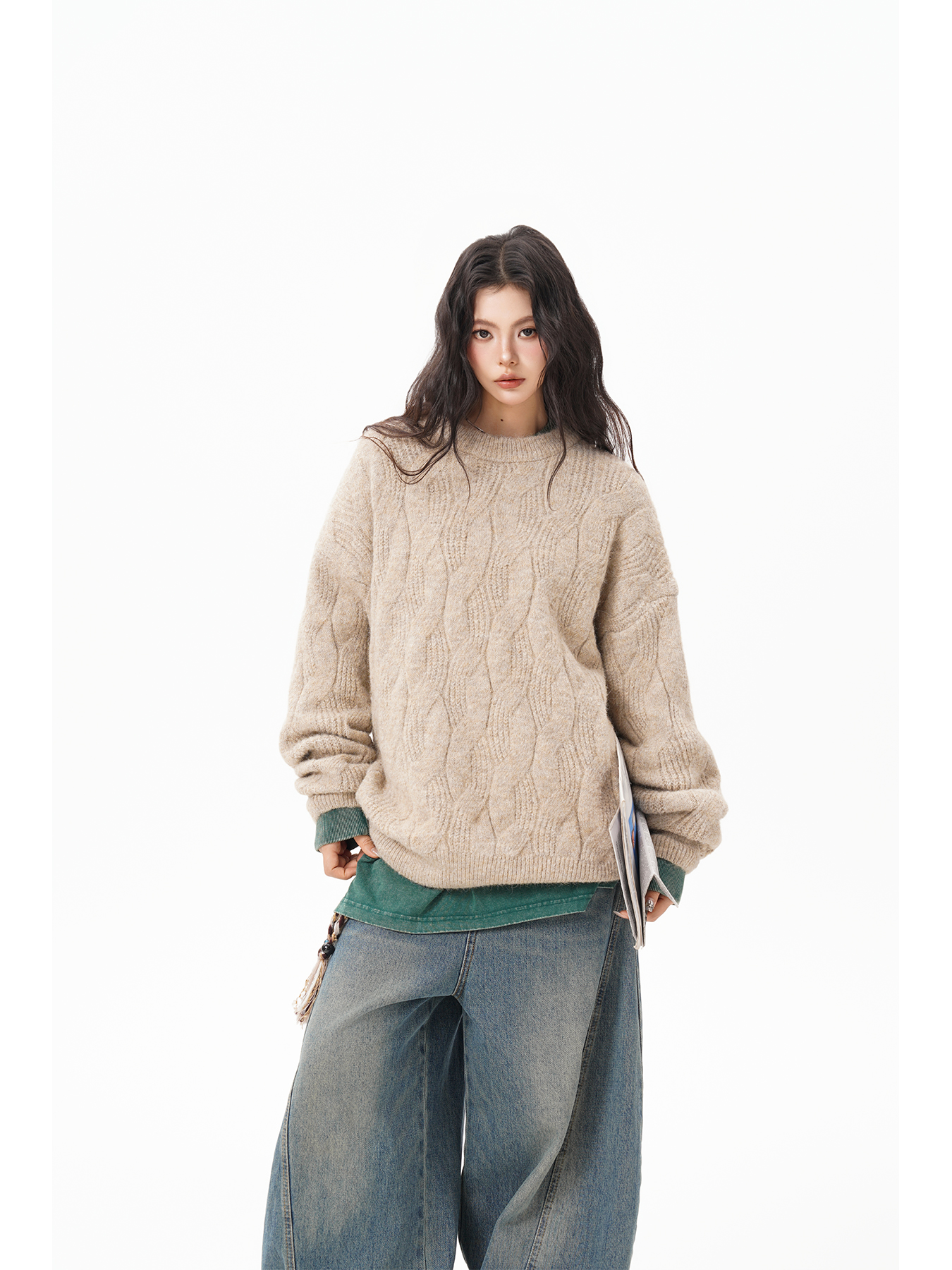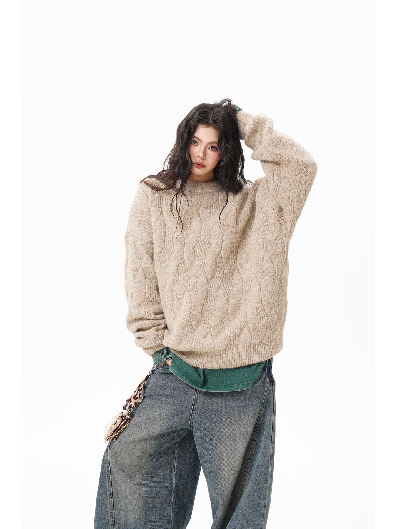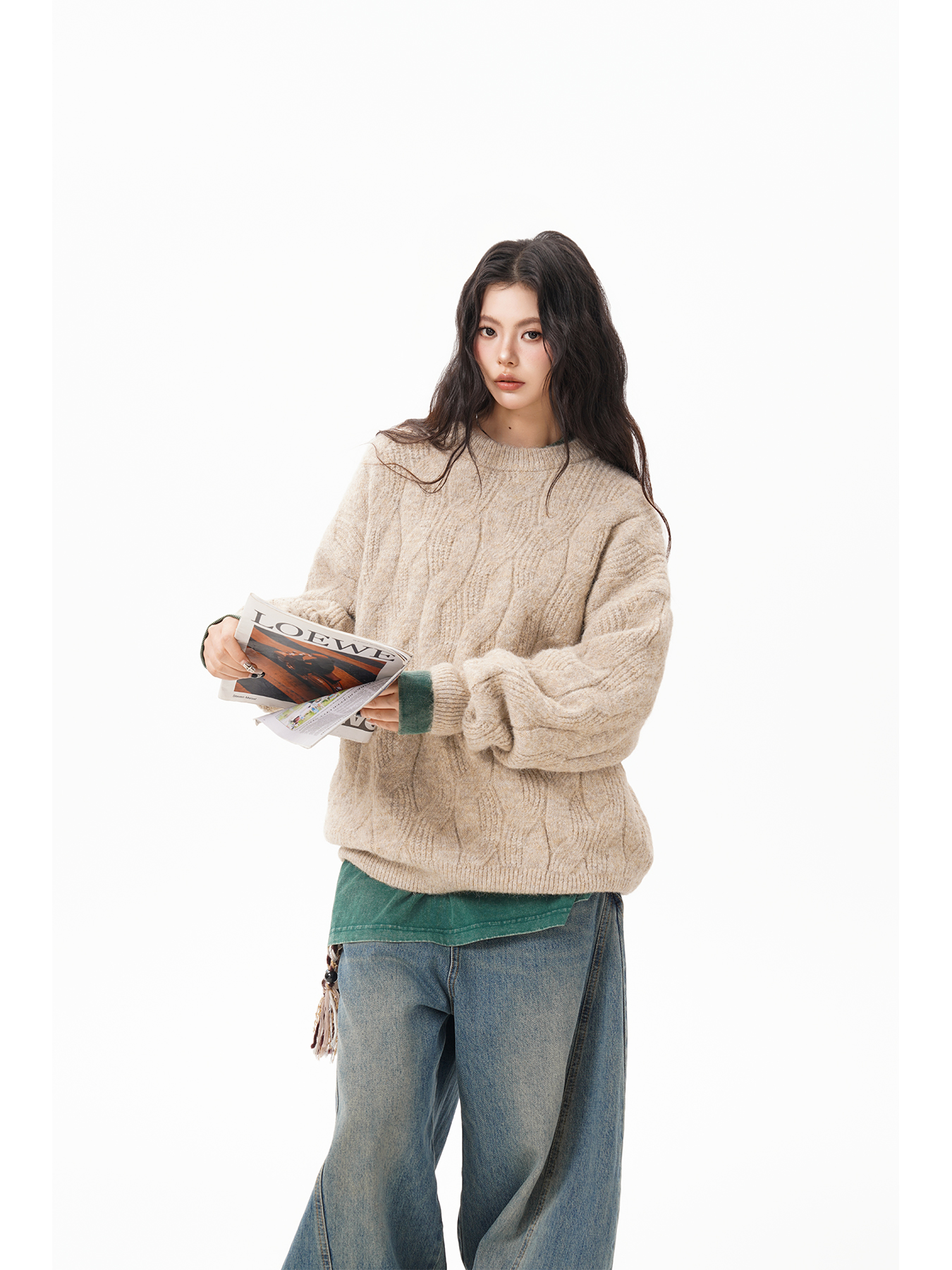 美式仙蹤綠麻花紋圓領毛衣女男秋季復古寬松休閒百搭針織上衣情侶