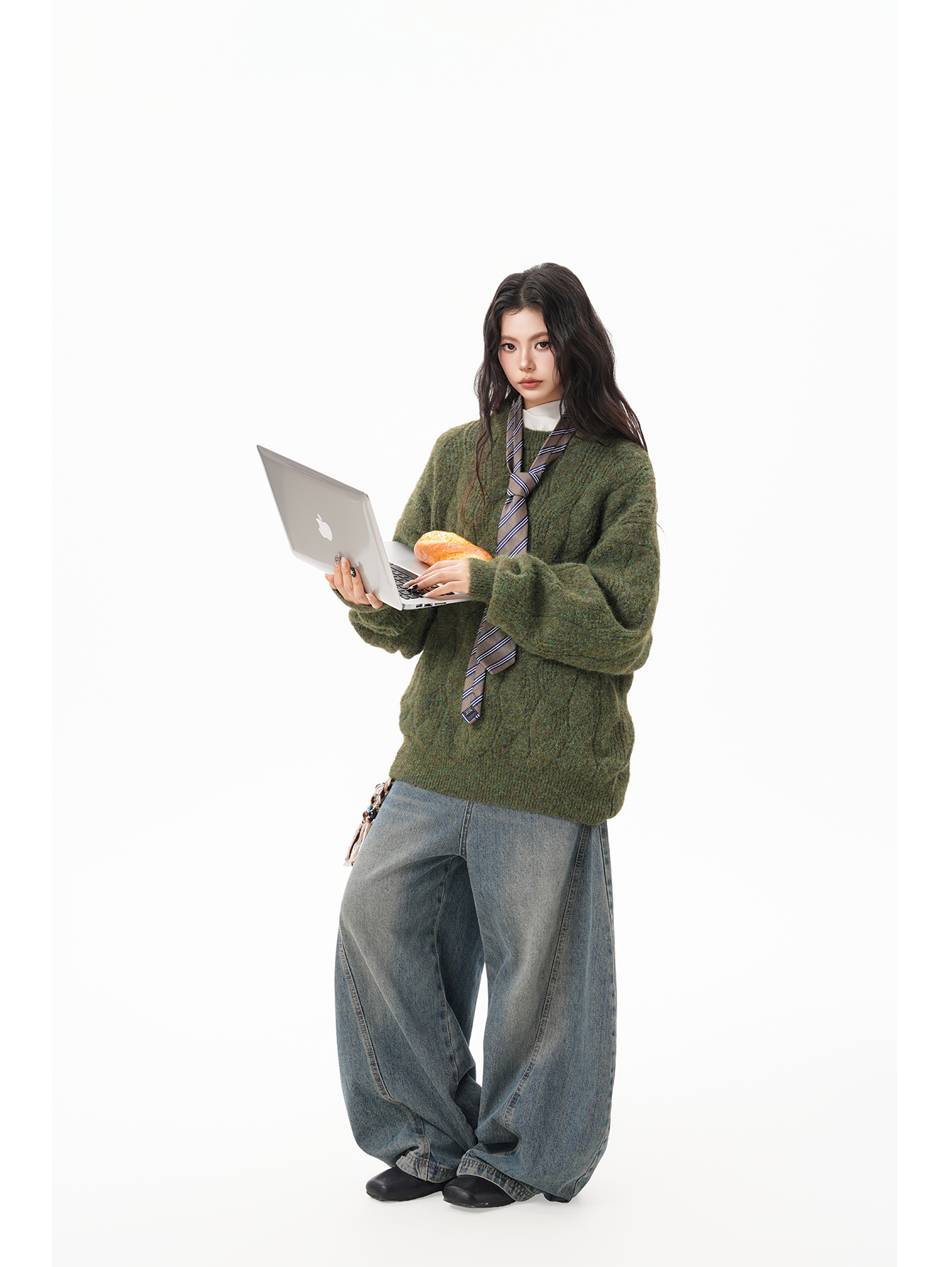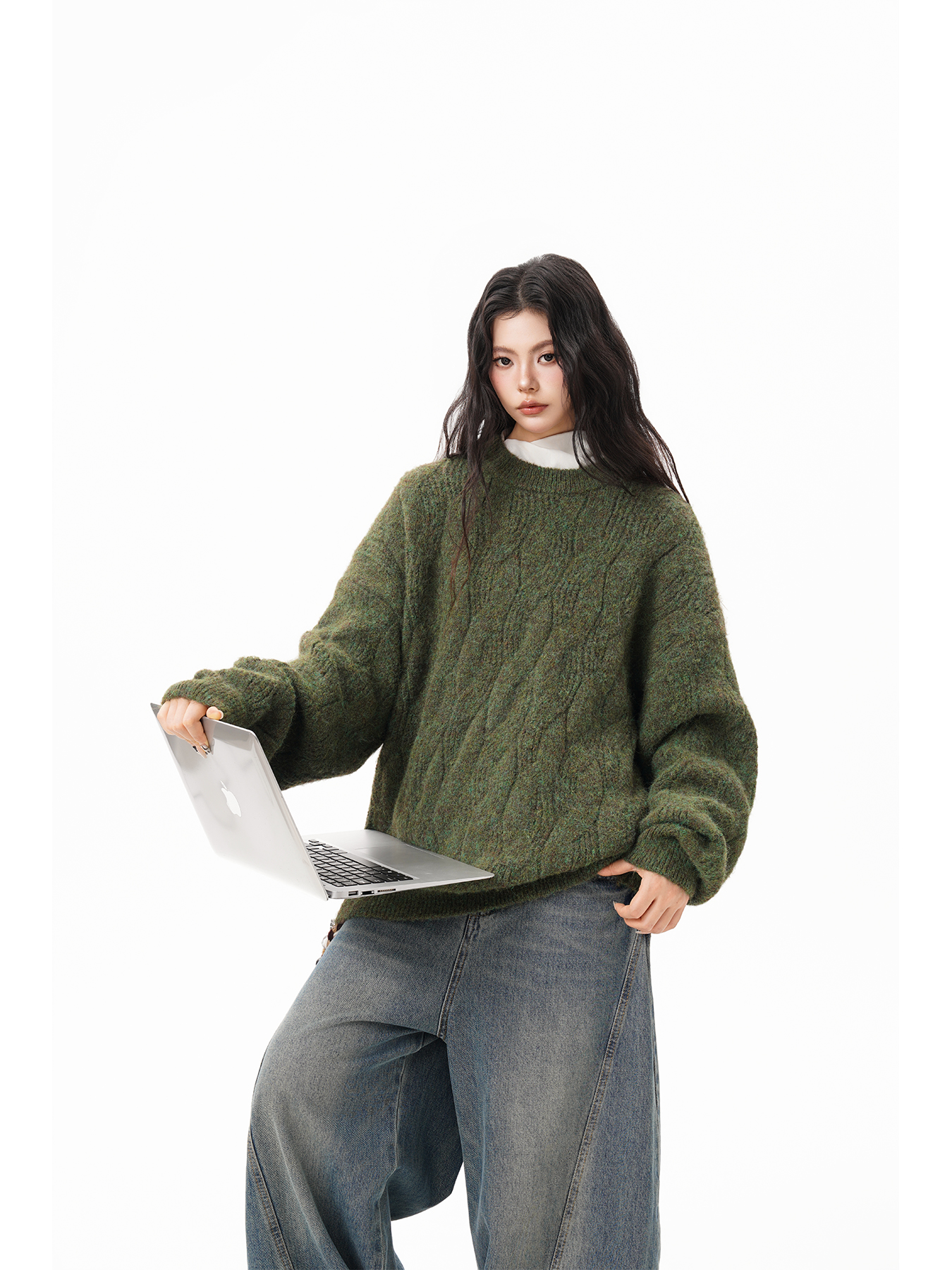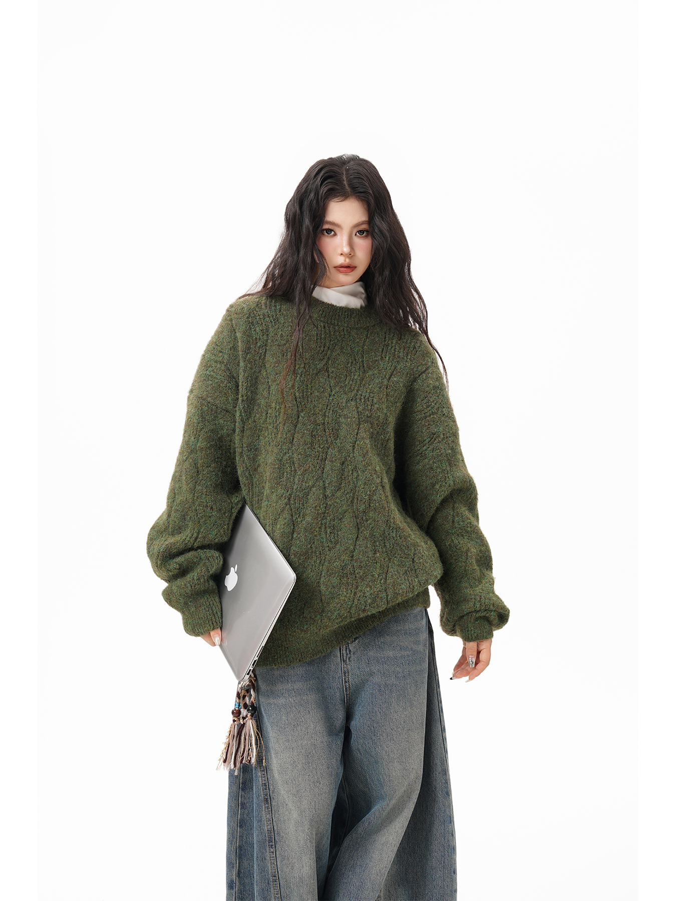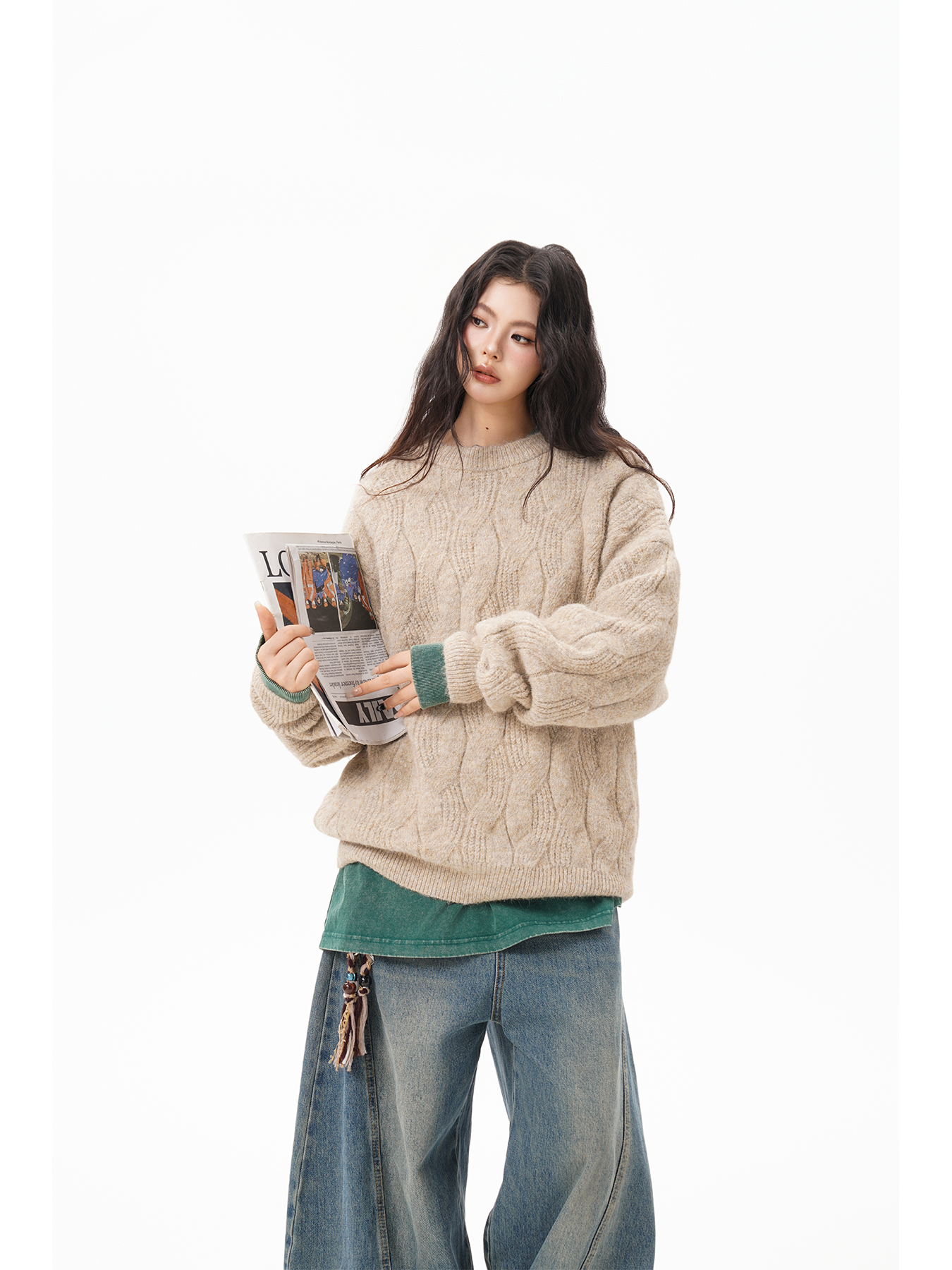 美式仙蹤綠麻花紋圓領毛衣女男秋季復古寬松休閒百搭針織上衣情侶