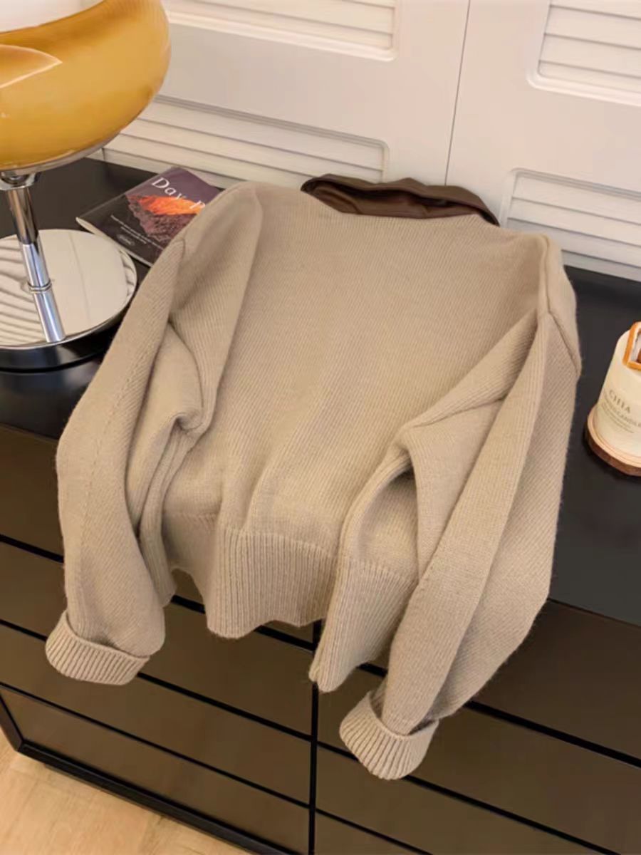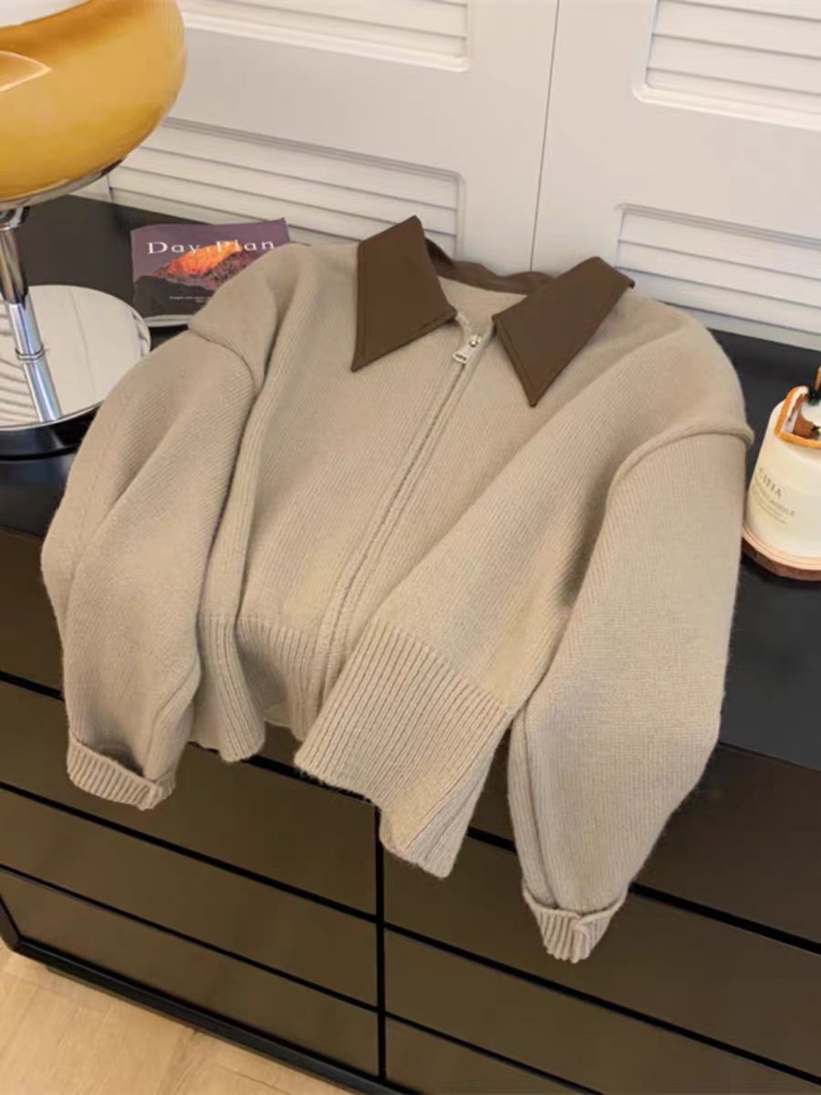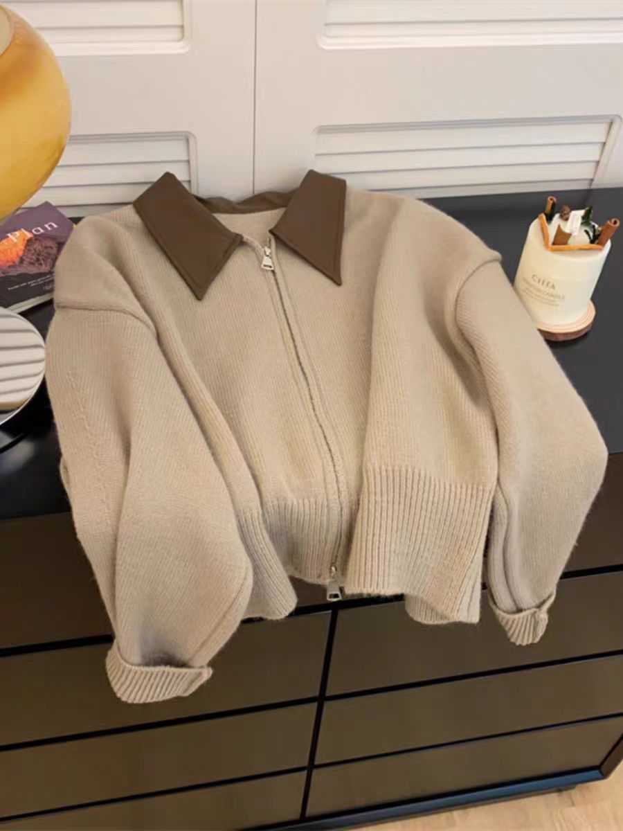 韓系氛圍穿搭!復古撞色翻領雙拉鍊毛衣外套女秋冬新款針織開衫潮