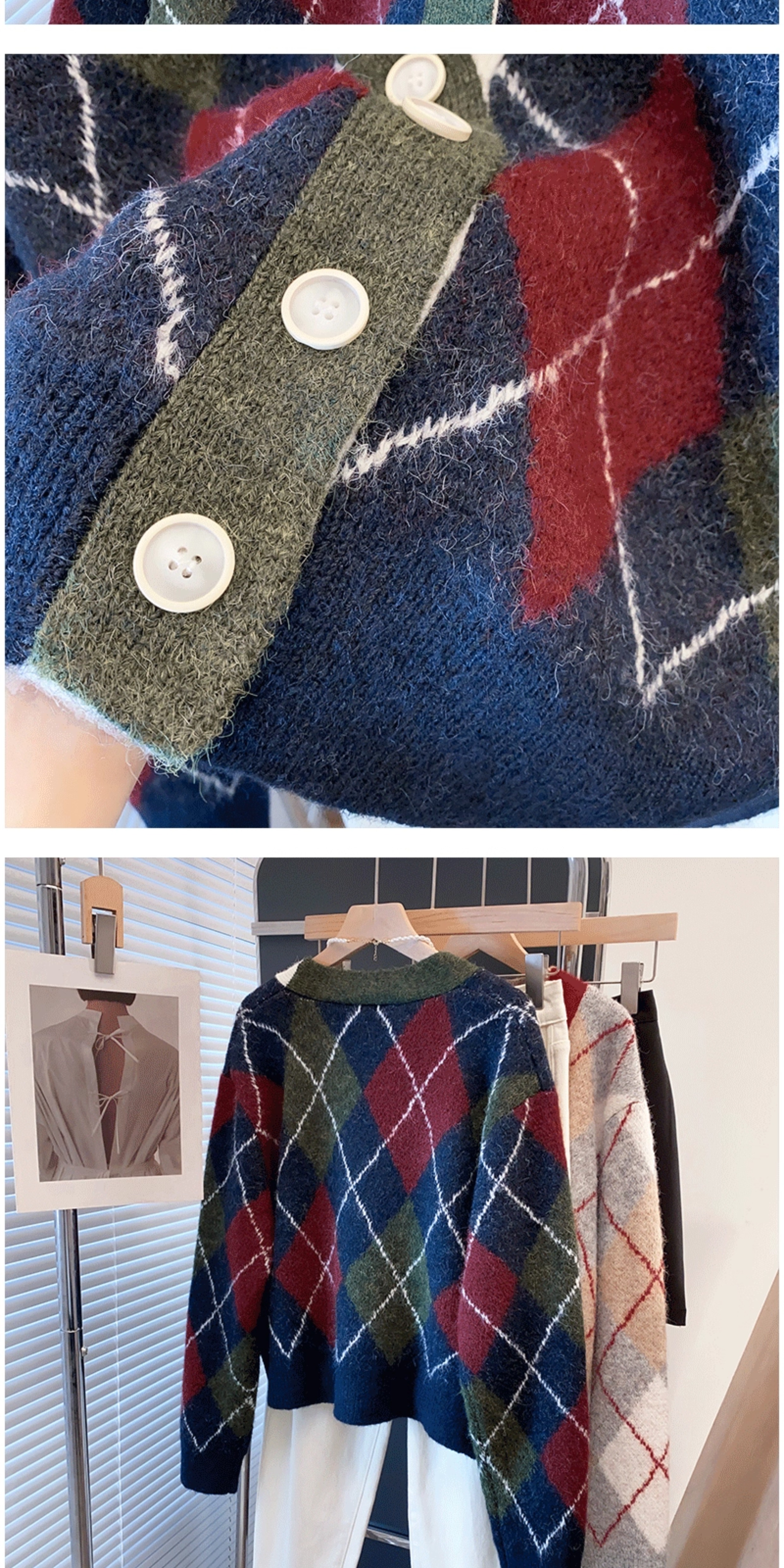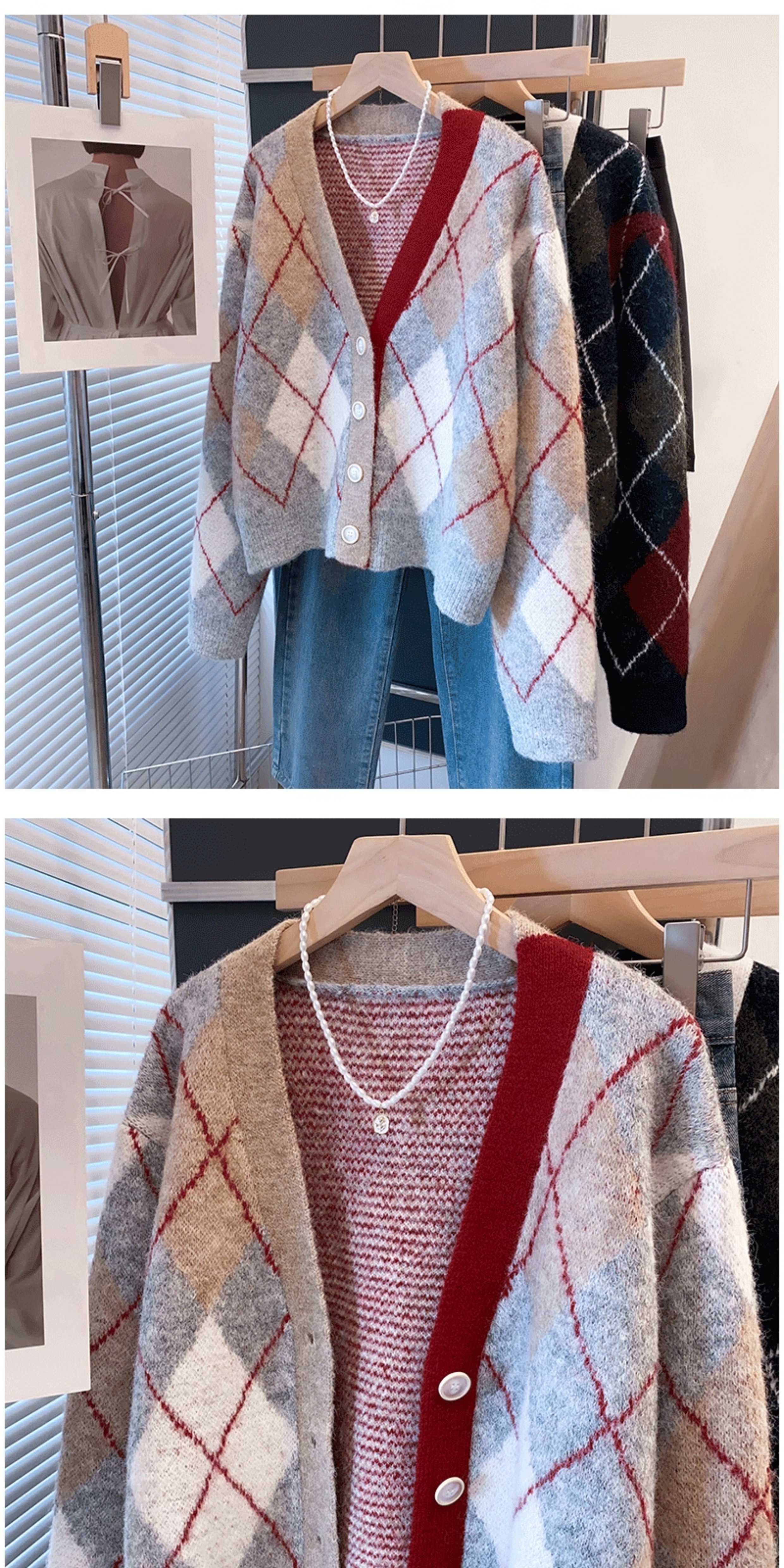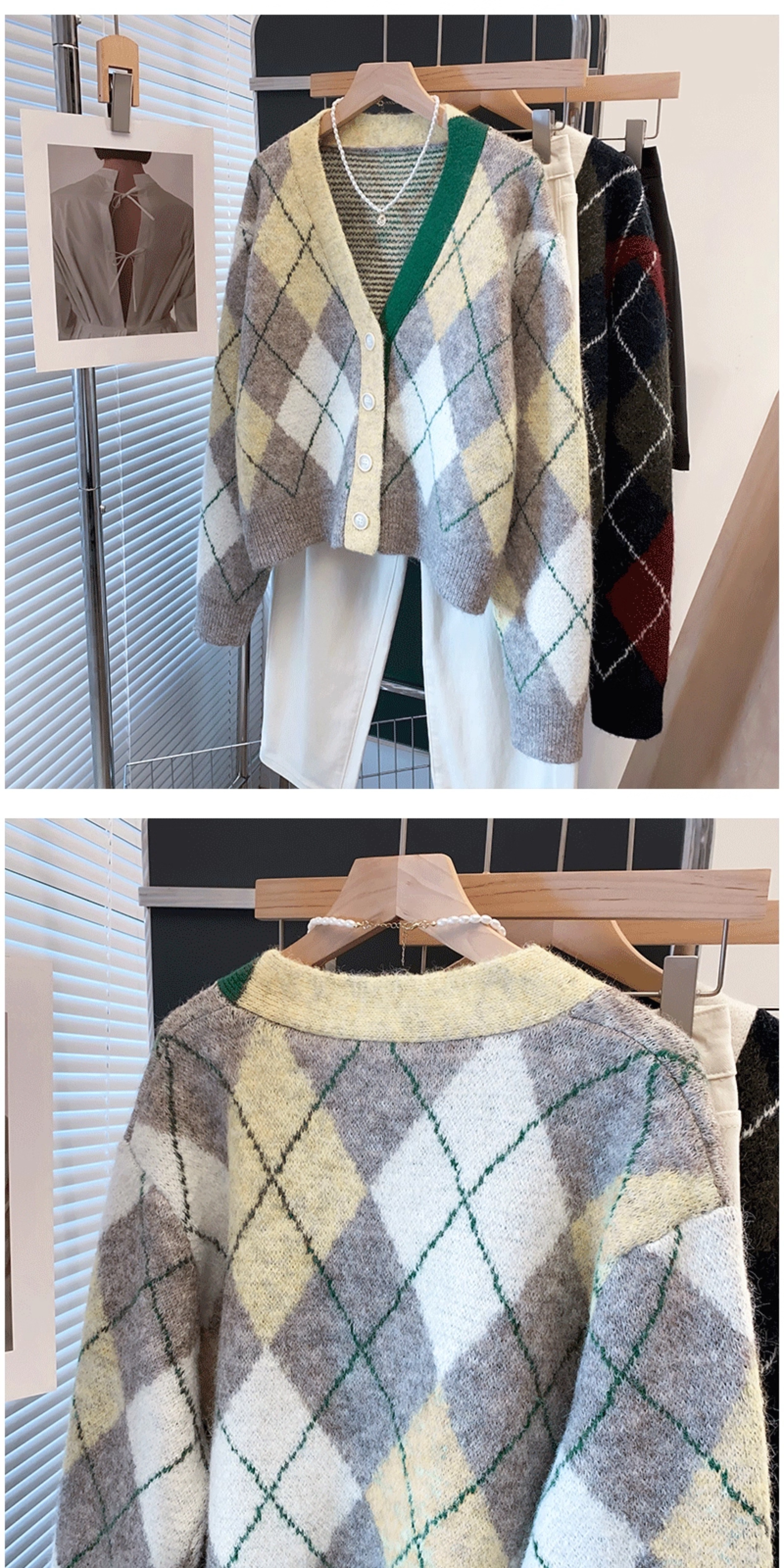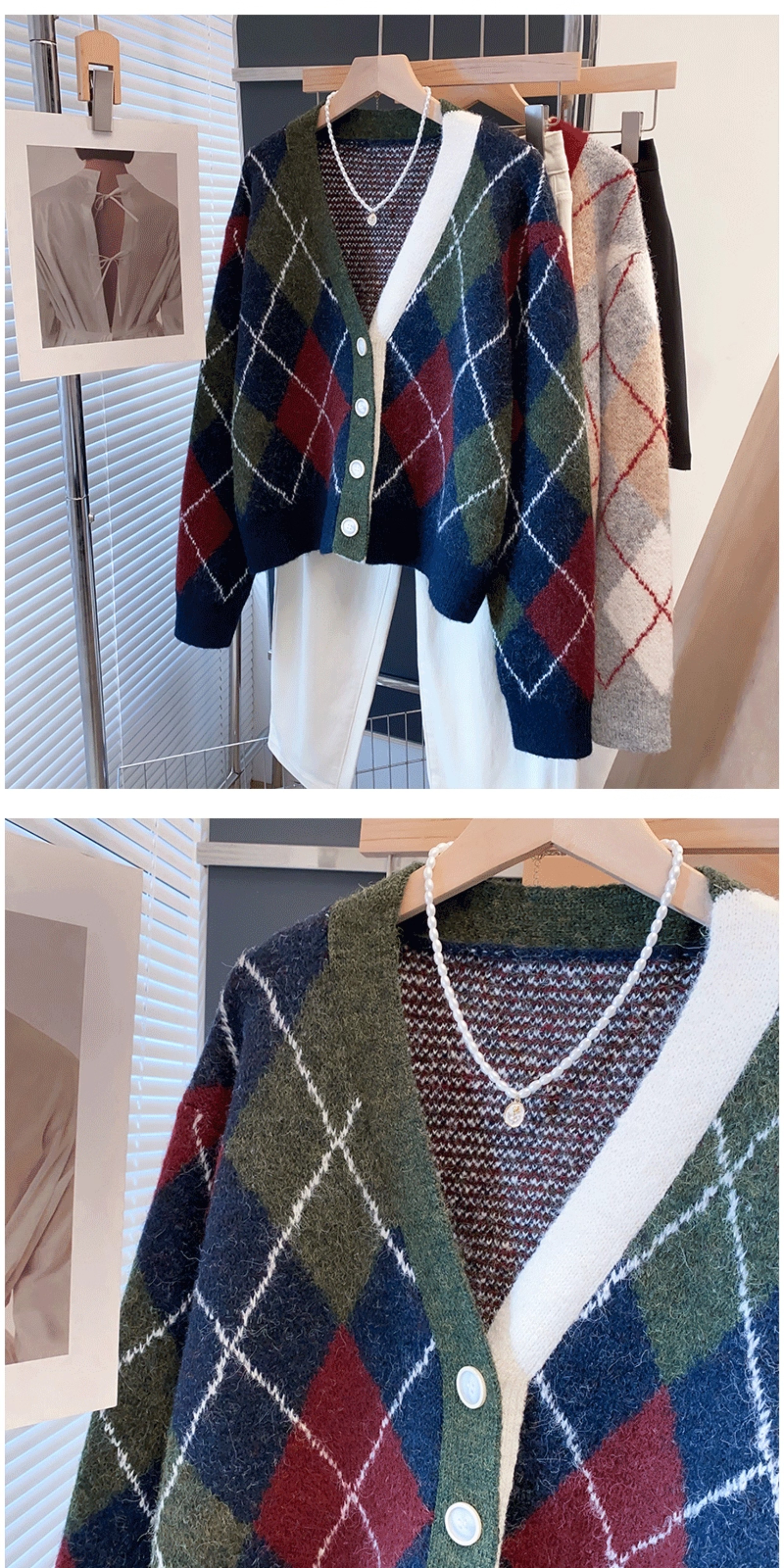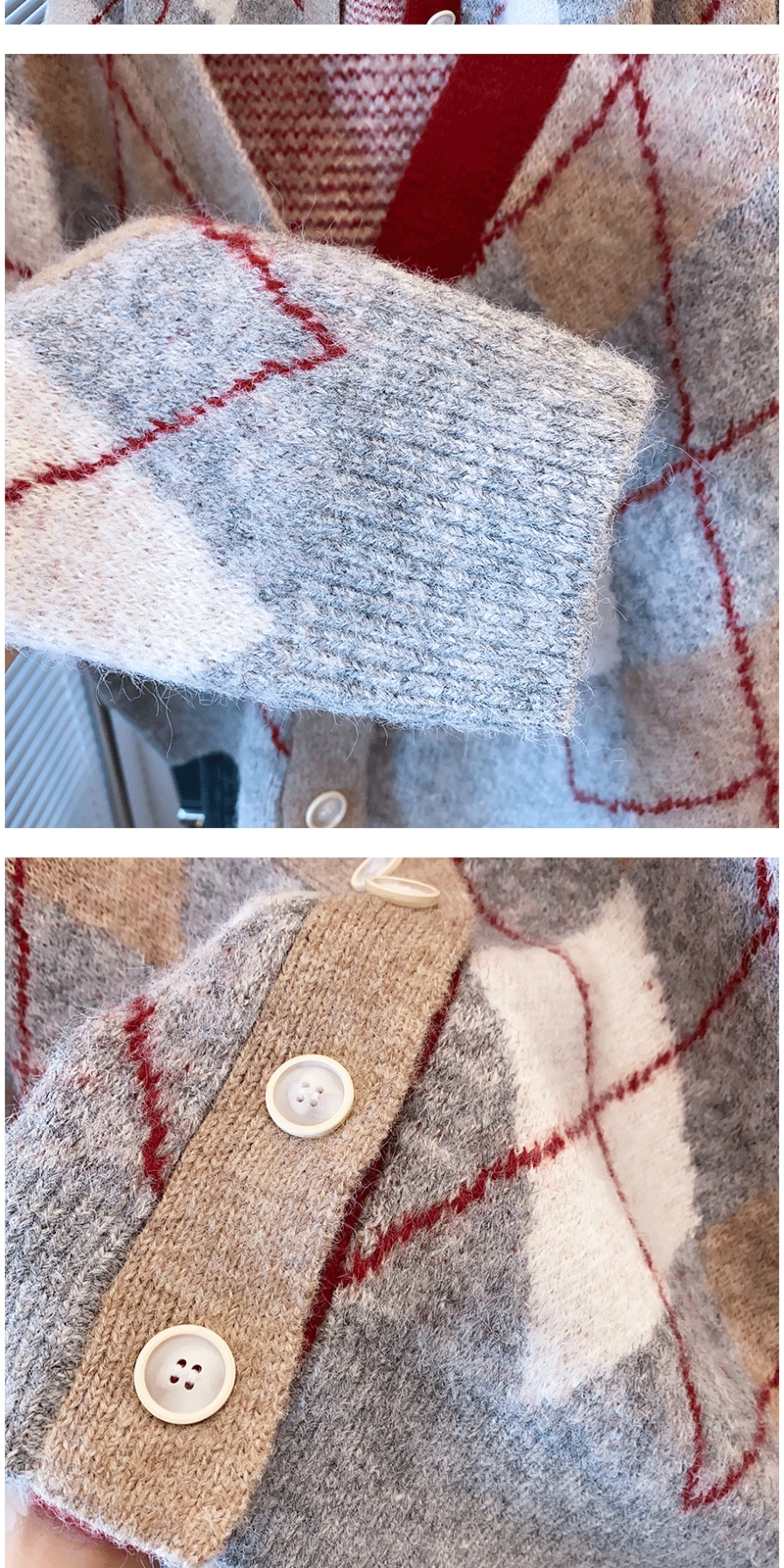 格紋v領毛衣外套女2025秋冬新款寬松慵懶風外穿上衣厚針織開衫潮