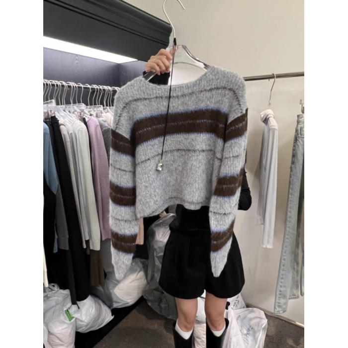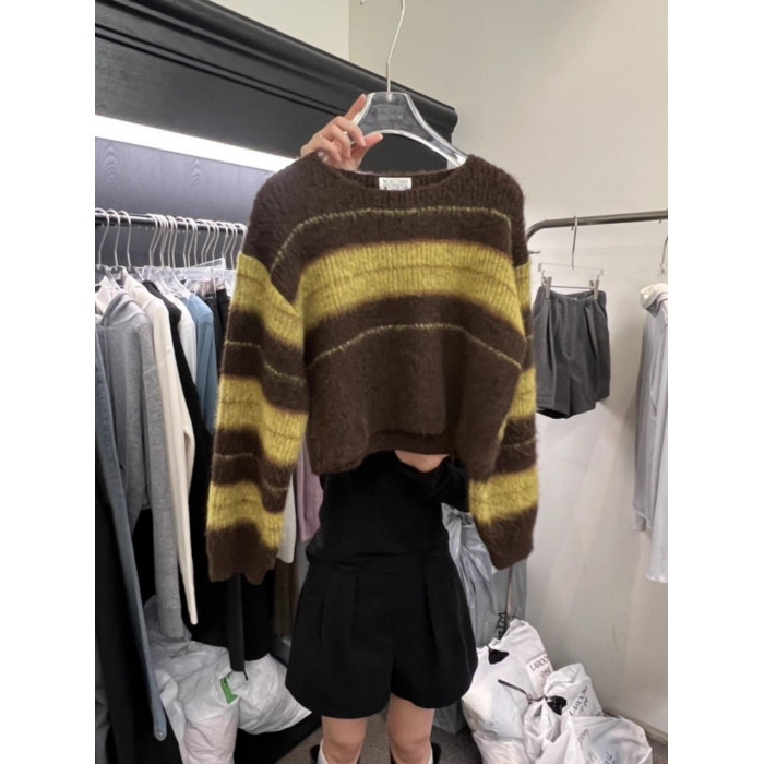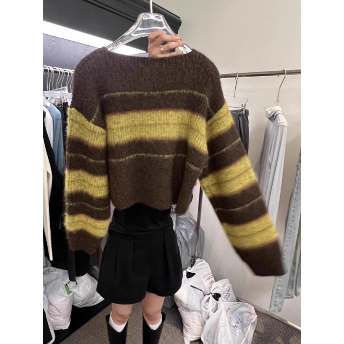 韓國東大門2025秋冬新款復古條紋拼色短款毛衣女套頭小個子針織衫