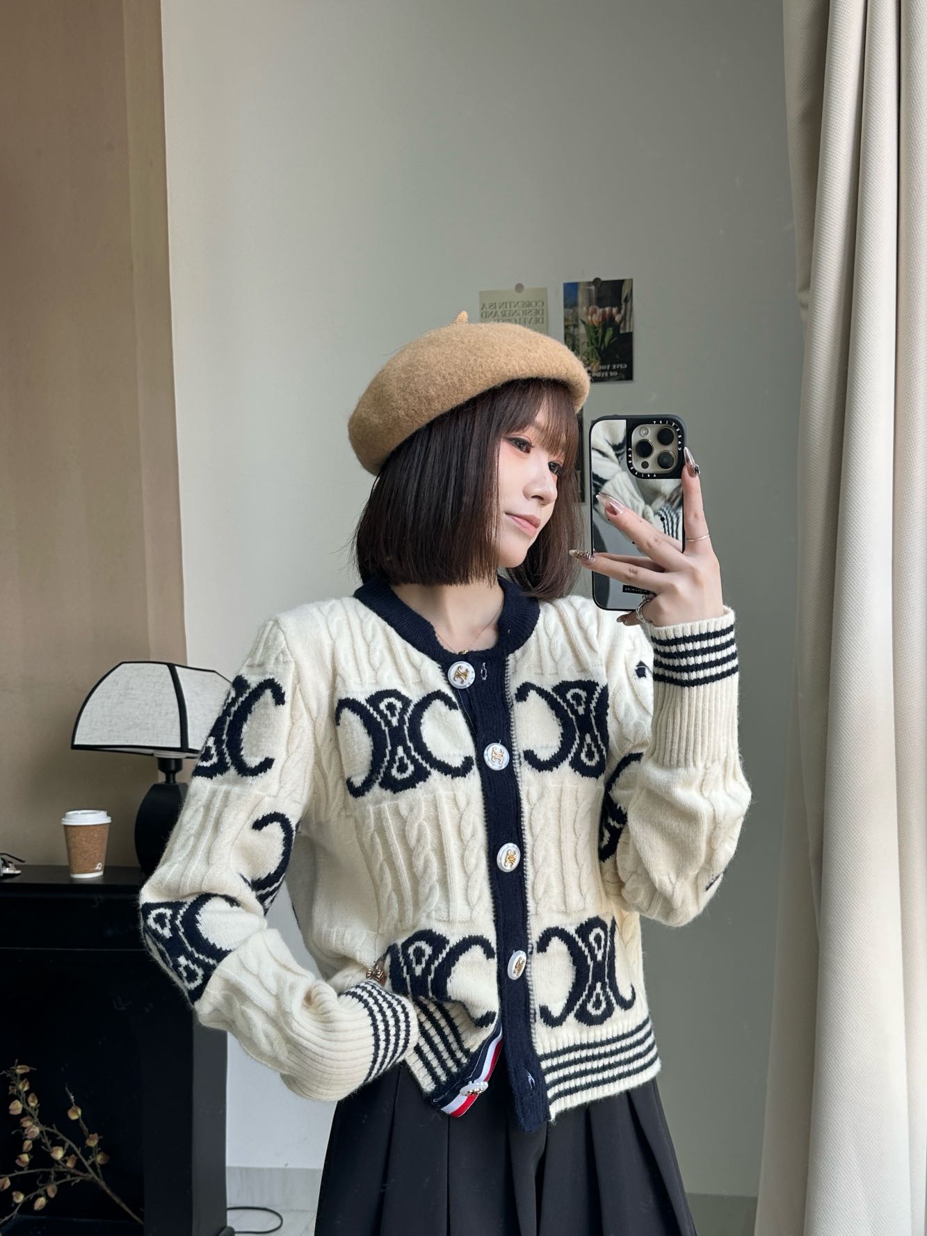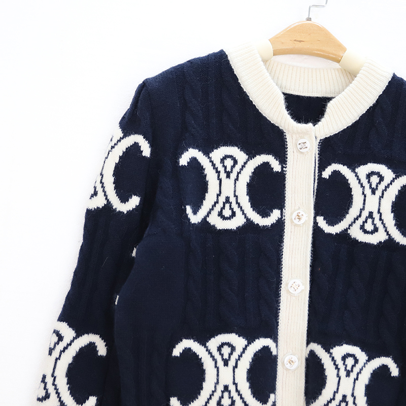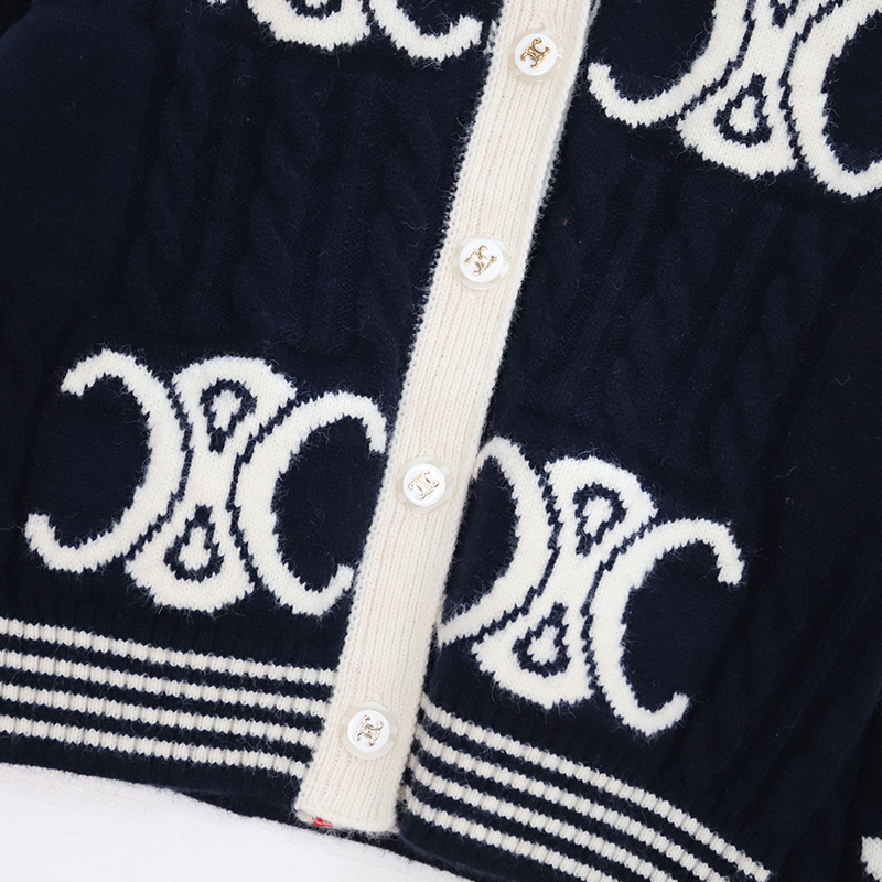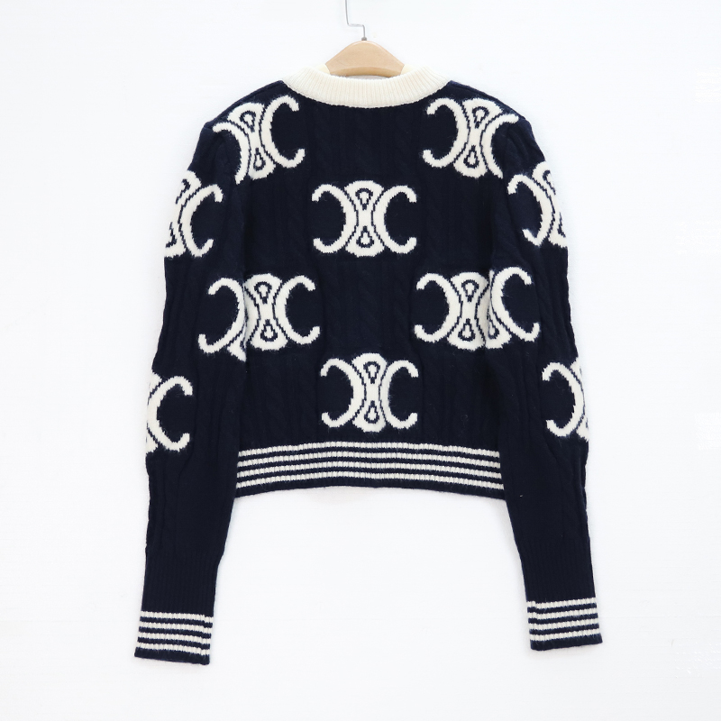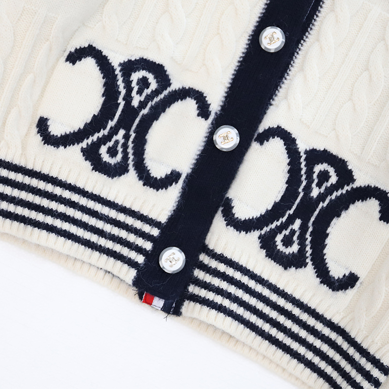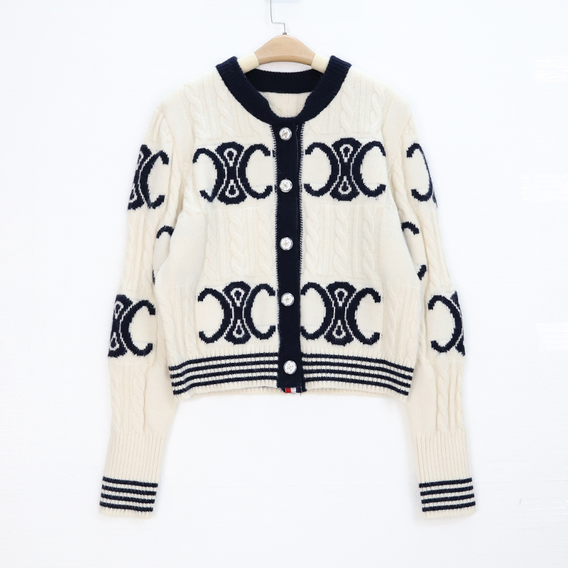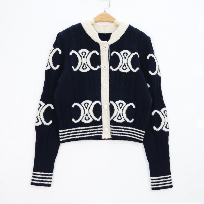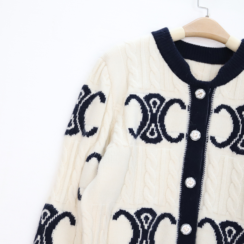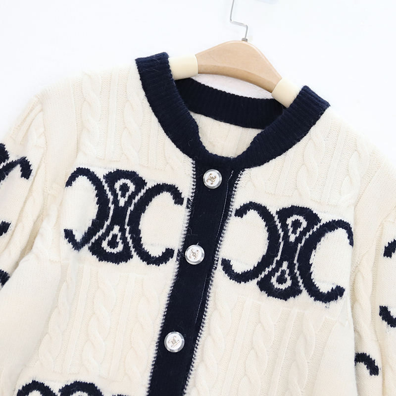 25秋冬新款小香風短款針織開衫ce字母提花撞色圓領長袖修身毛衣外