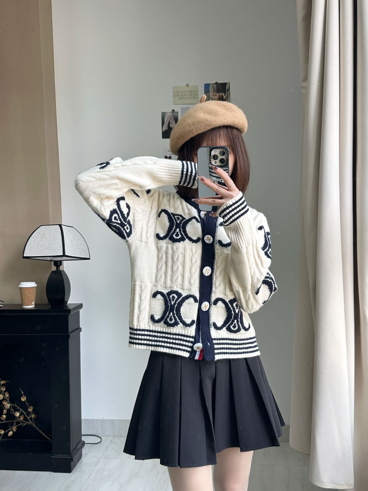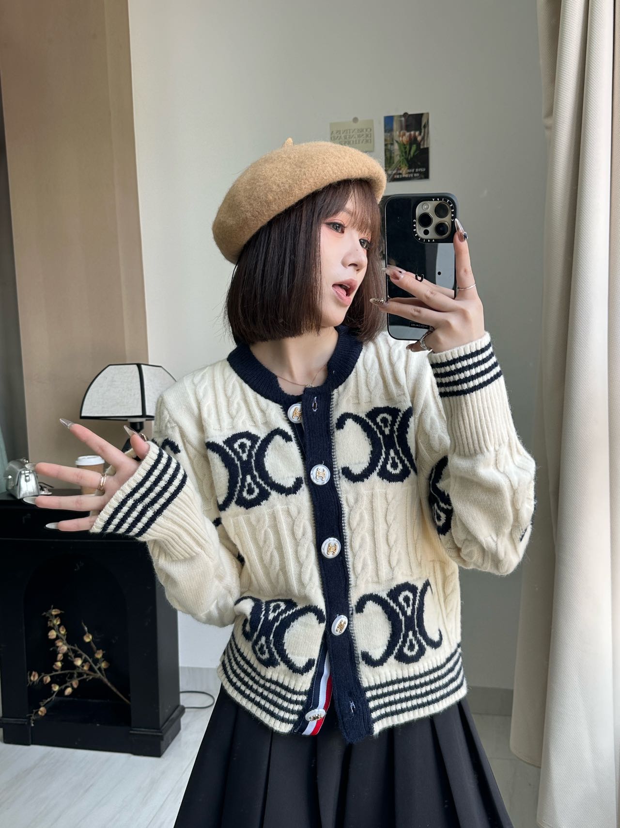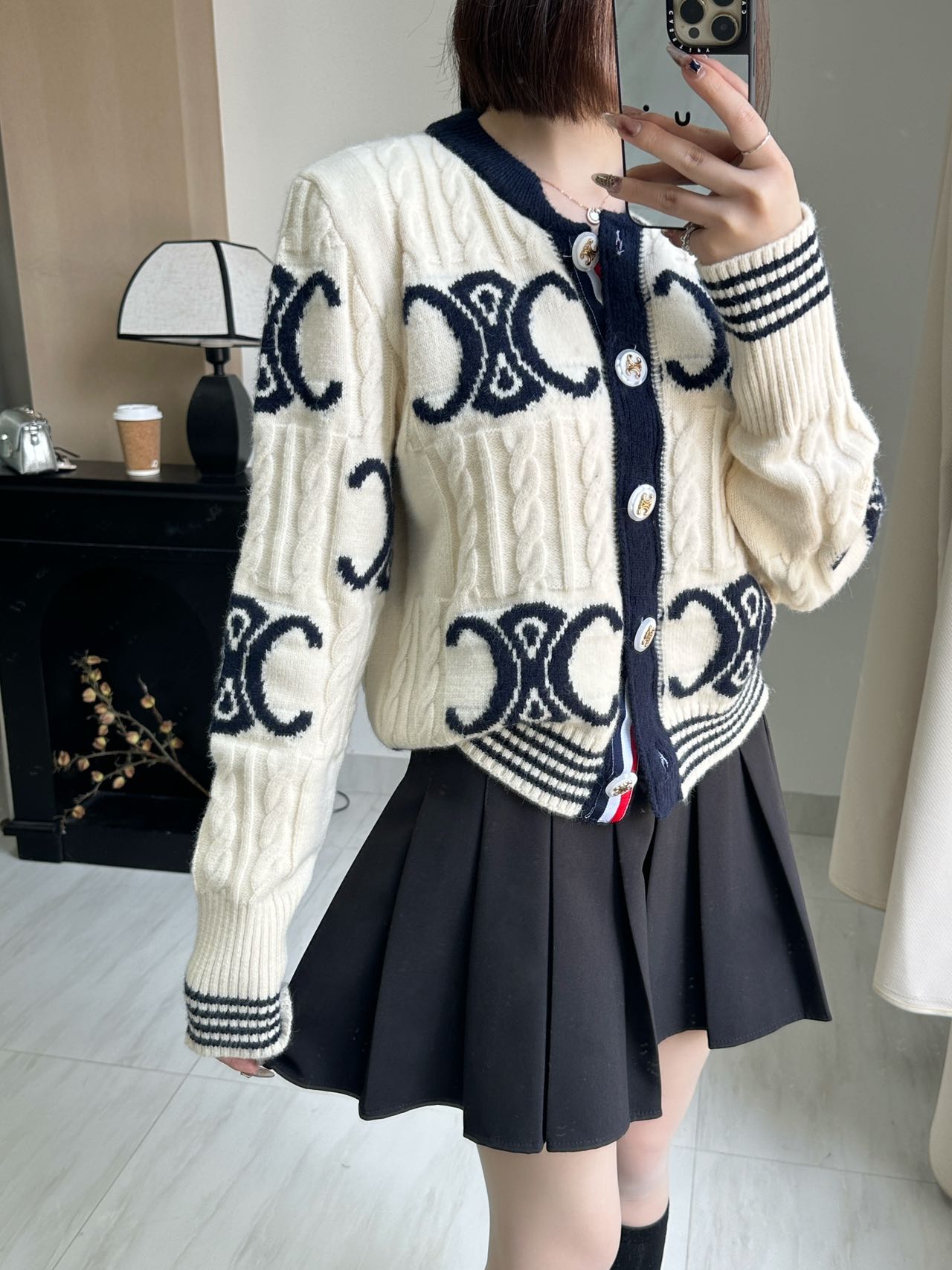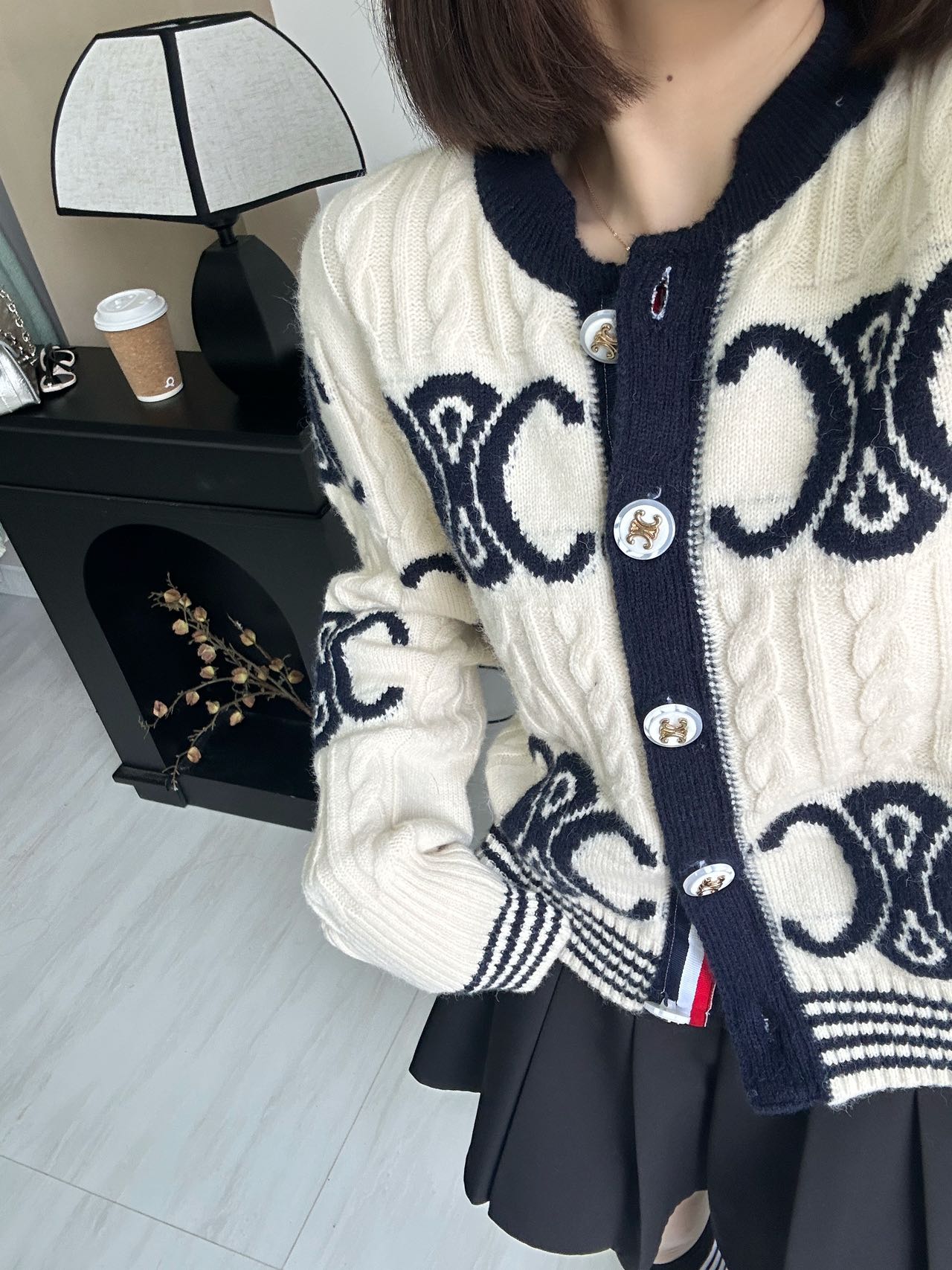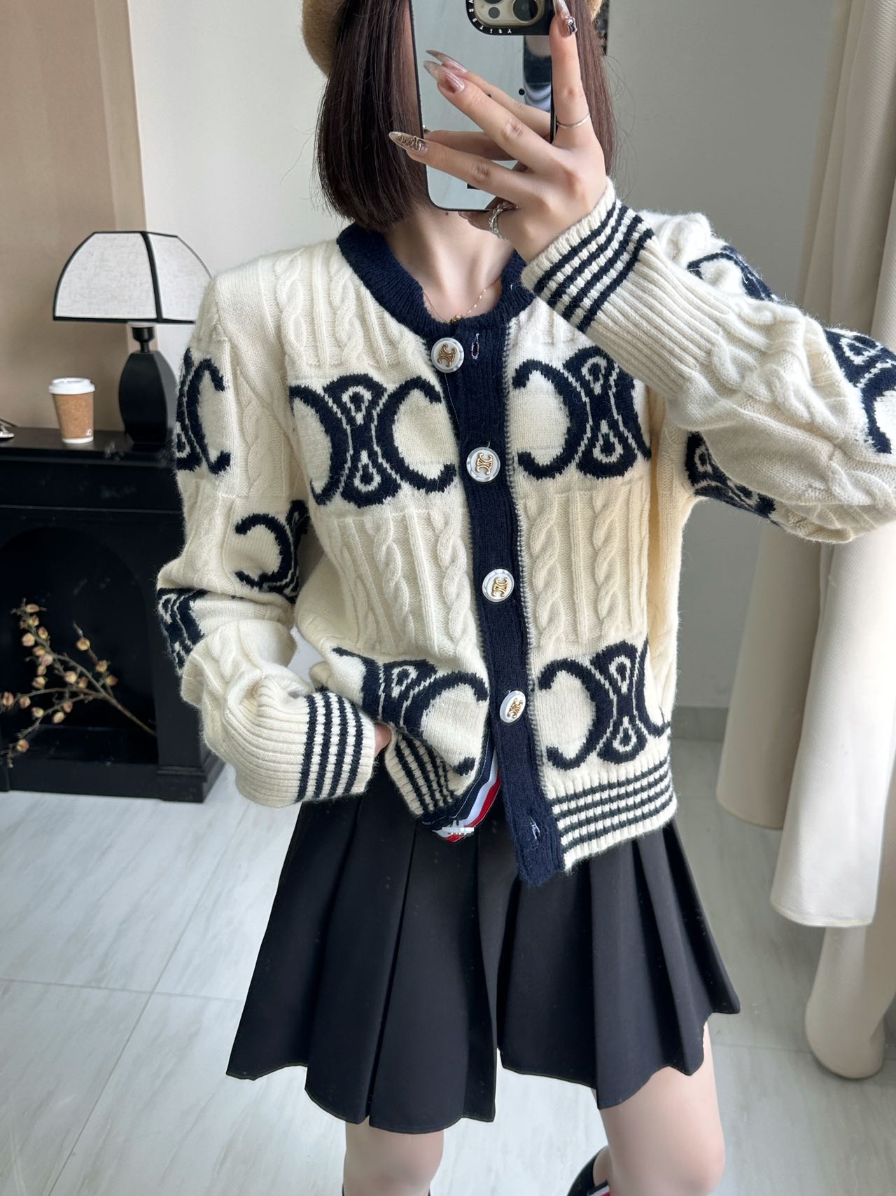 25秋冬新款小香風短款針織開衫ce字母提花撞色圓領長袖修身毛衣外